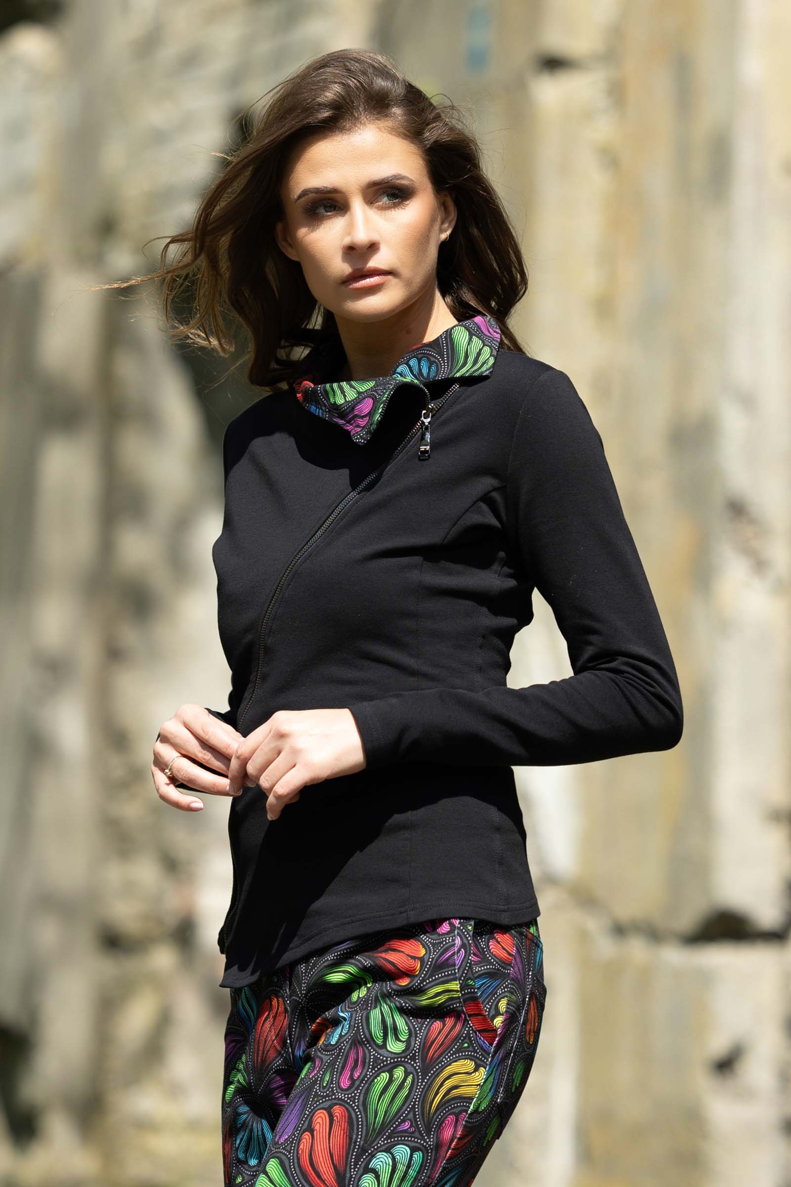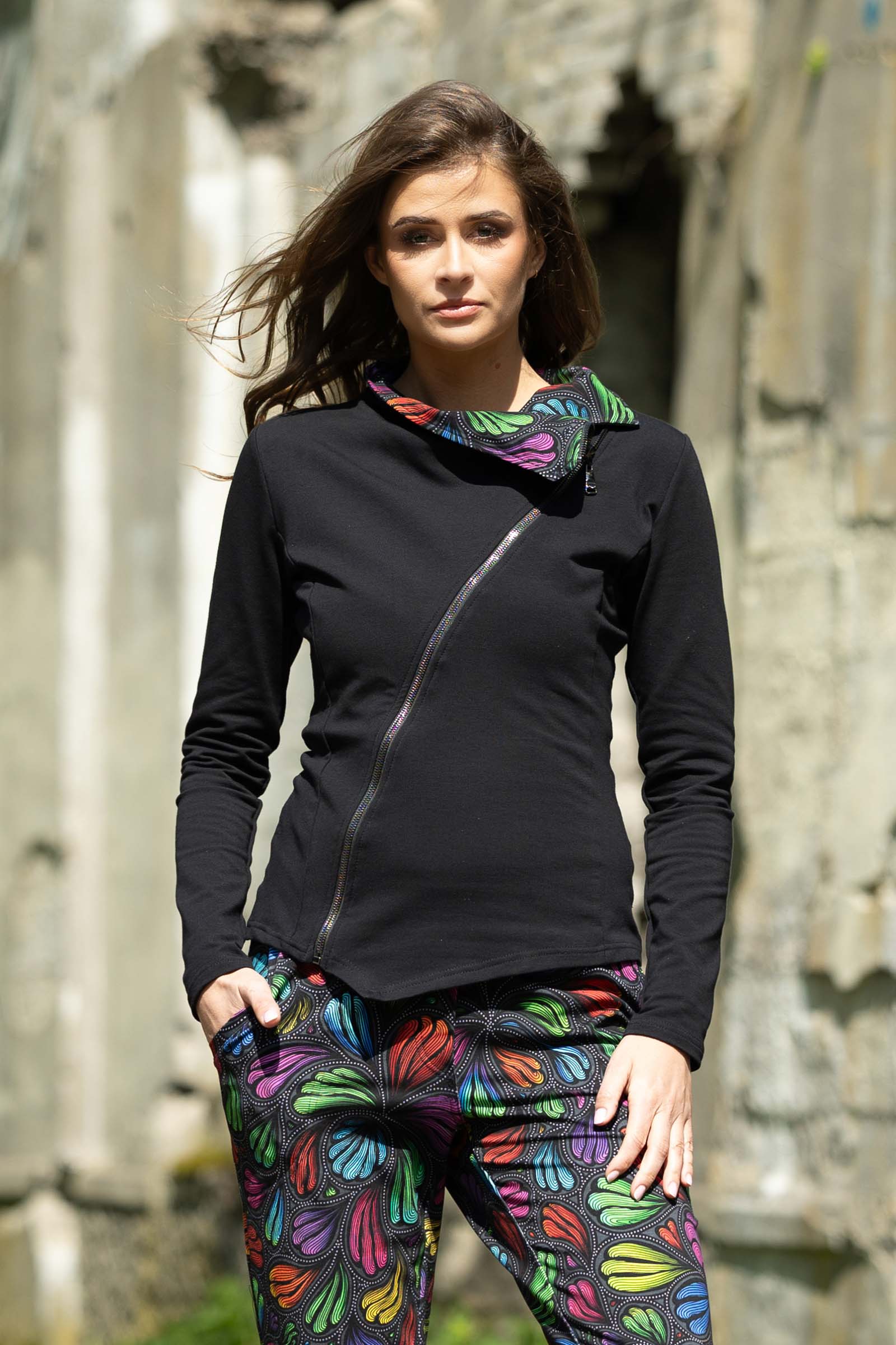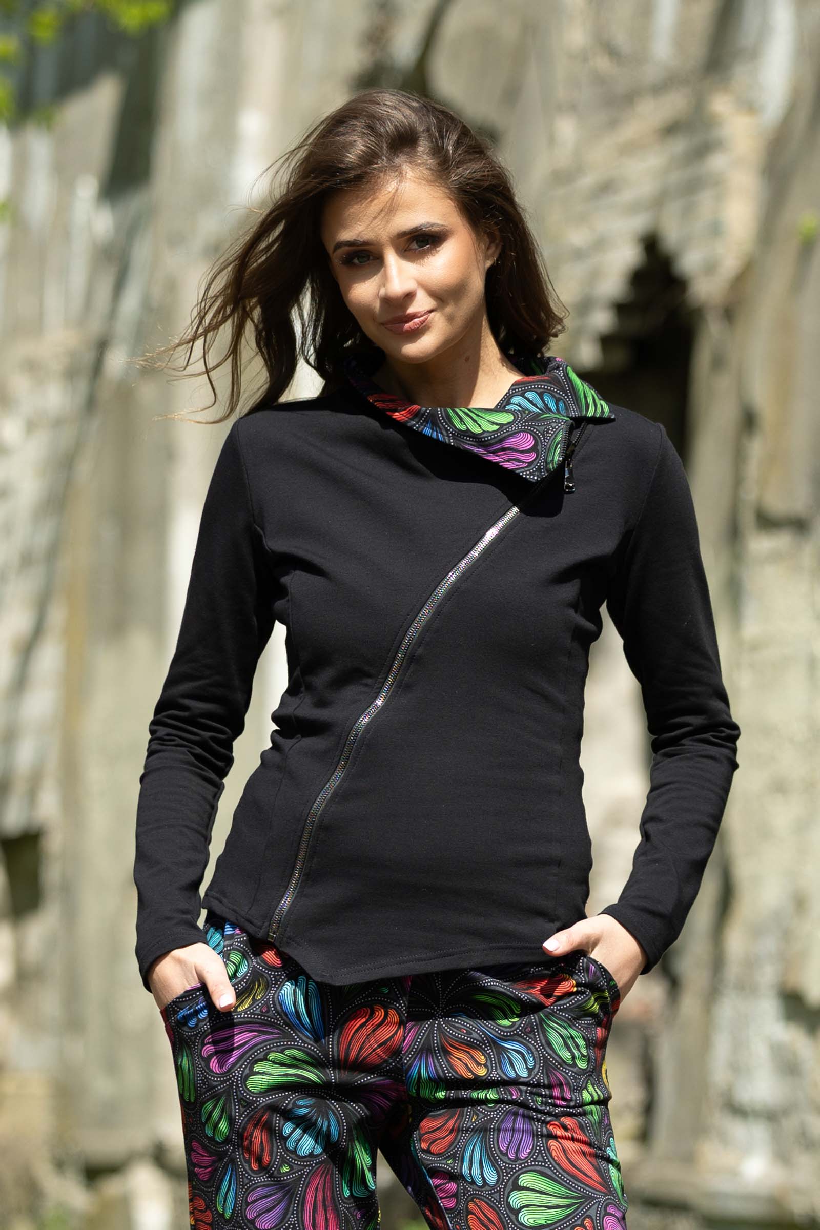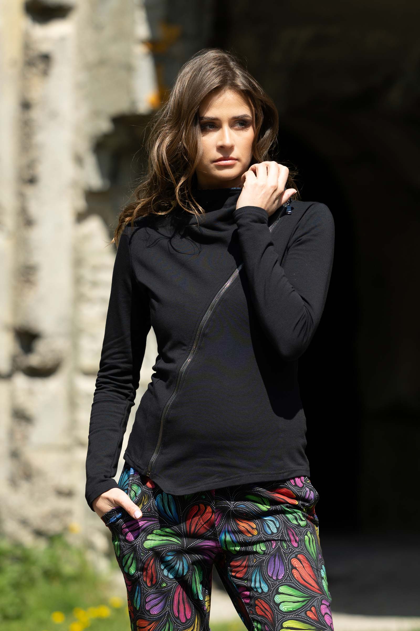 Asymetryczny fason ze stójką to doskonałe połączenie nowoczesnego designu z funkcjonalnością. Stójka dodaje bluzie elegancji i prezentuje się wyjątkowo efektownie, jednocześnie chroniąc szyję przed wiatrem i chłodem.