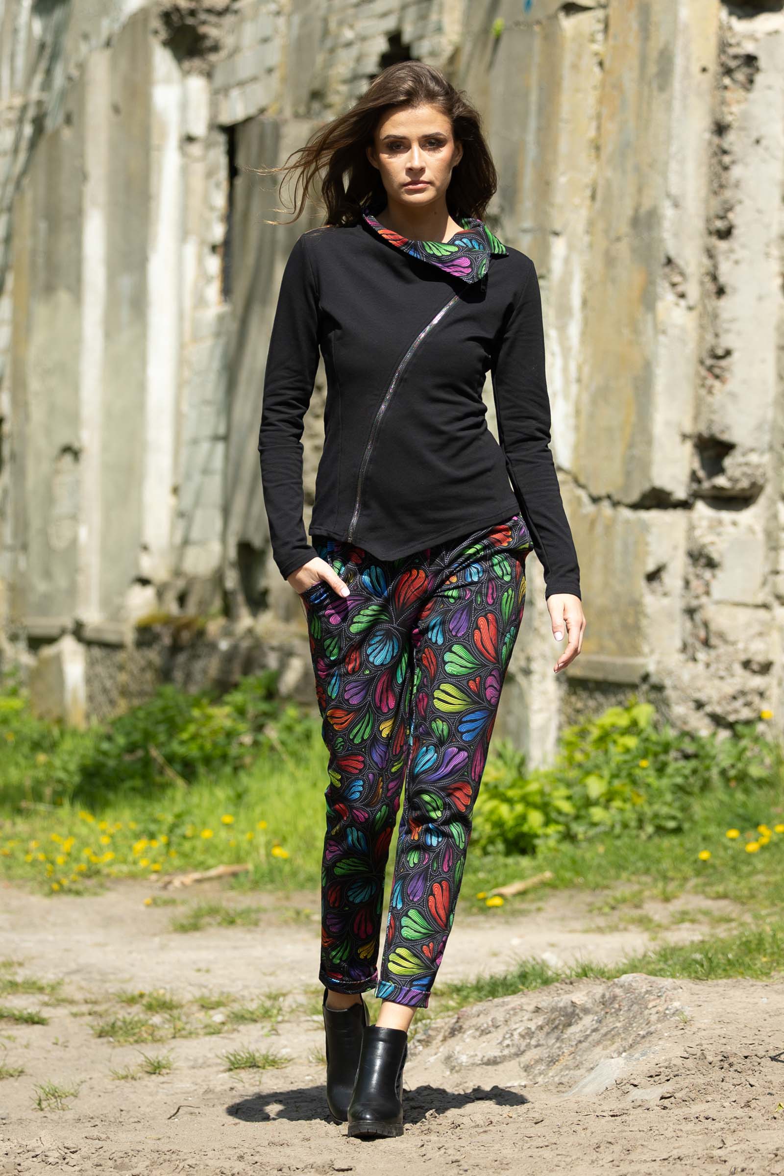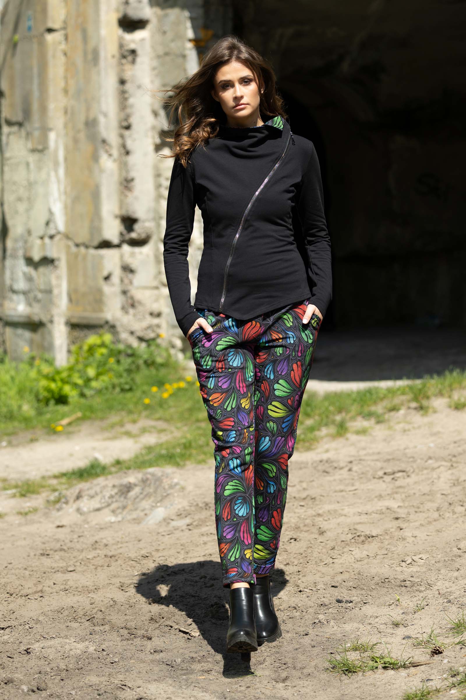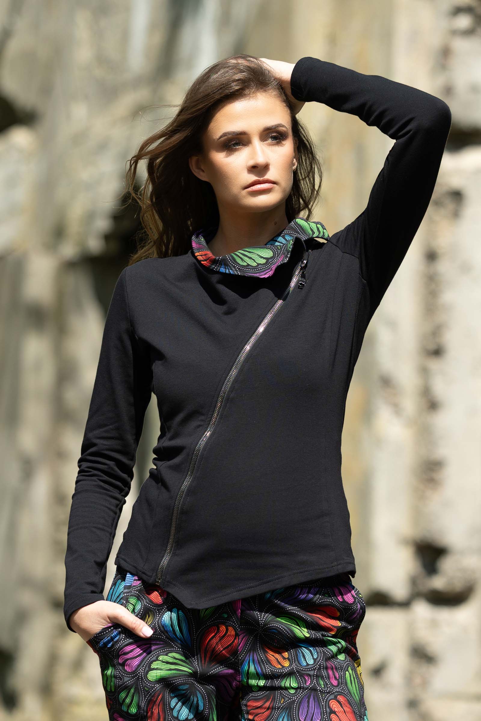 Asymetryczny fason ze stójką to doskonałe połączenie nowoczesnego designu z funkcjonalnością. Stójka dodaje bluzie elegancji i prezentuje się wyjątkowo efektownie, jednocześnie chroniąc szyję przed wiatrem i chłodem.