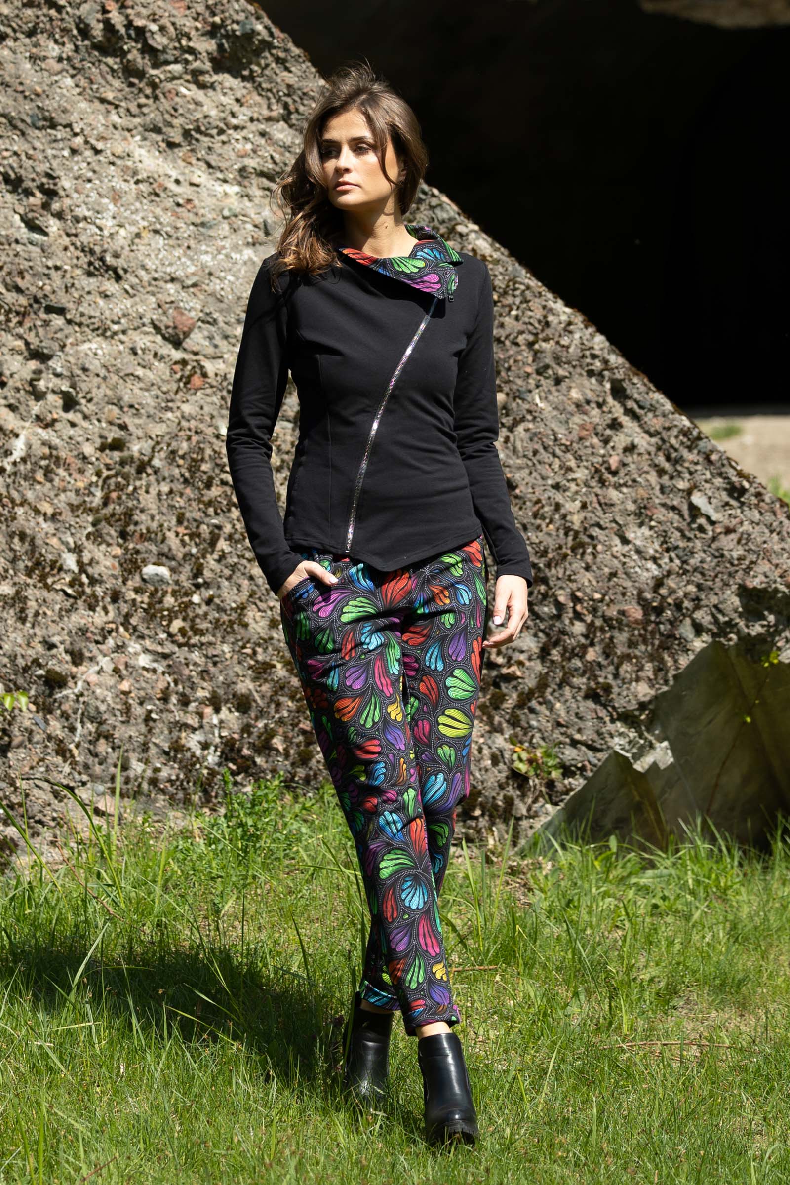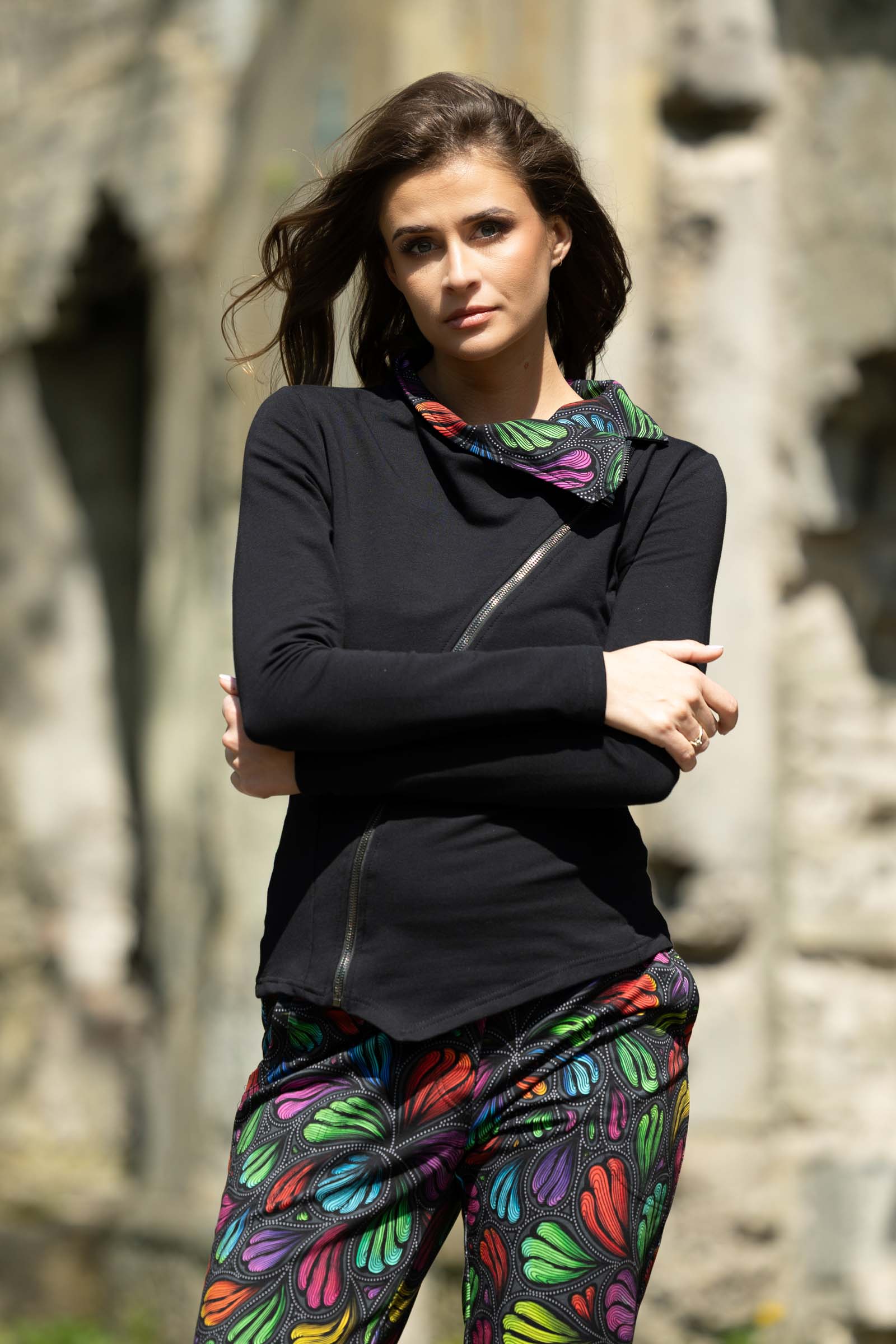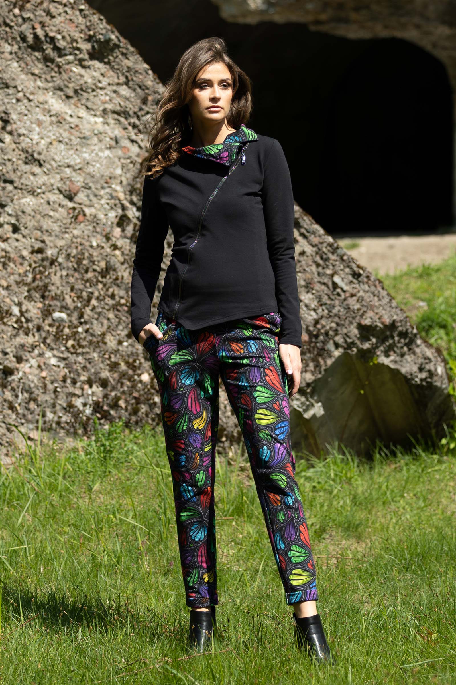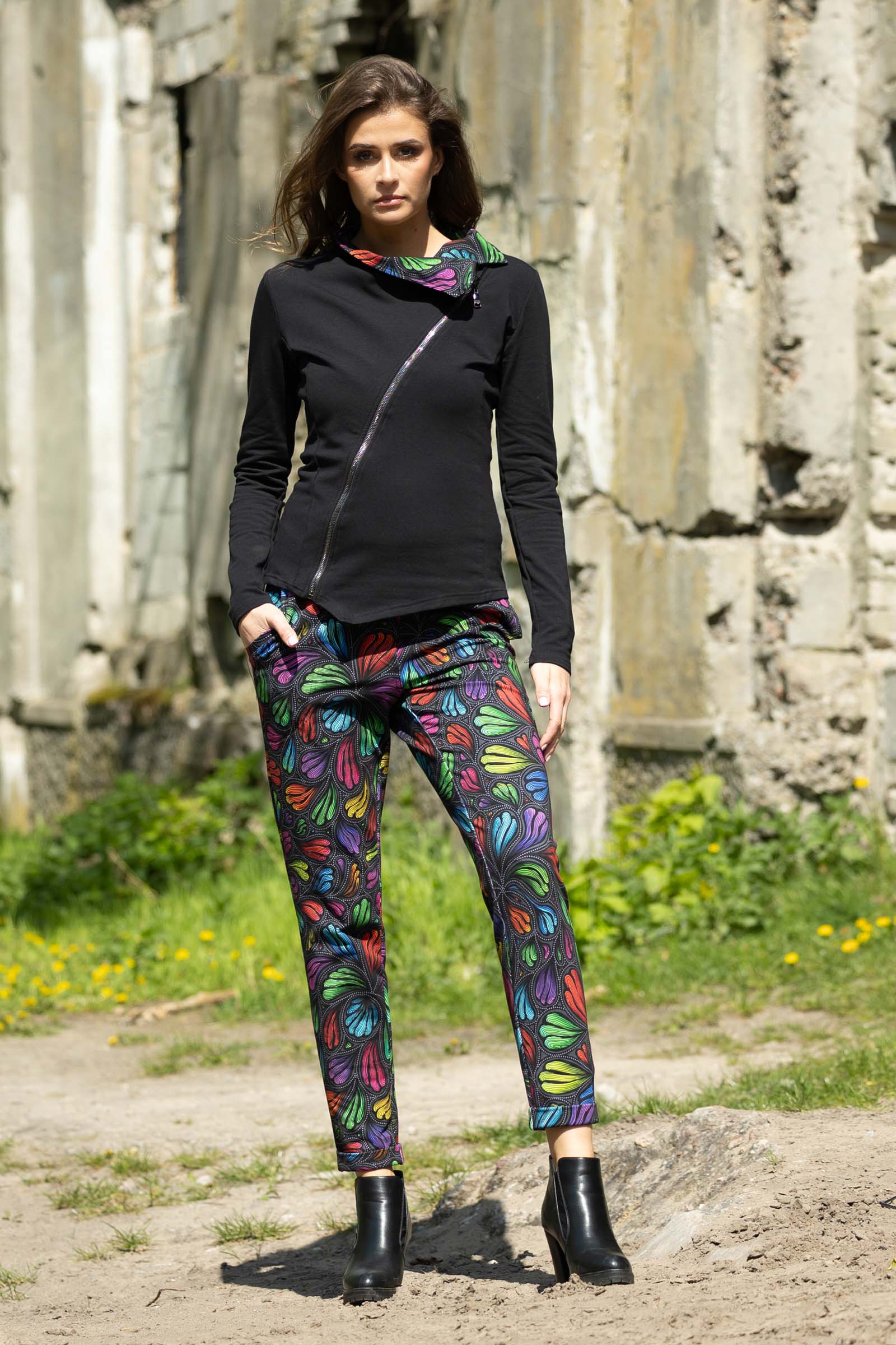 Asymetryczny fason ze stójką to doskonałe połączenie nowoczesnego designu z funkcjonalnością. Stójka dodaje bluzie elegancji i prezentuje się wyjątkowo efektownie, jednocześnie chroniąc szyję przed wiatrem i chłodem.