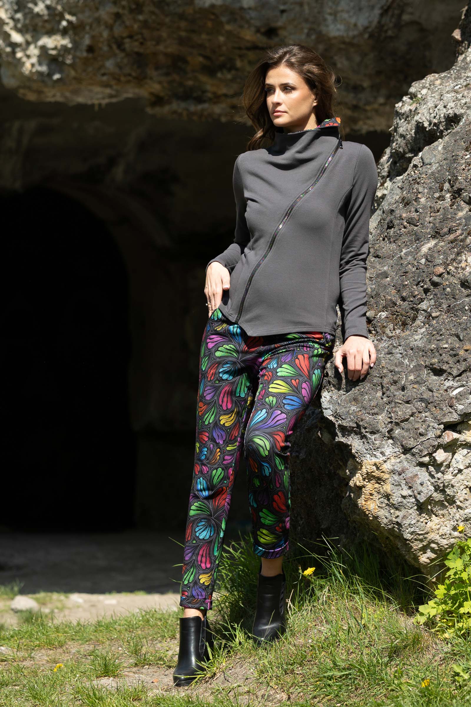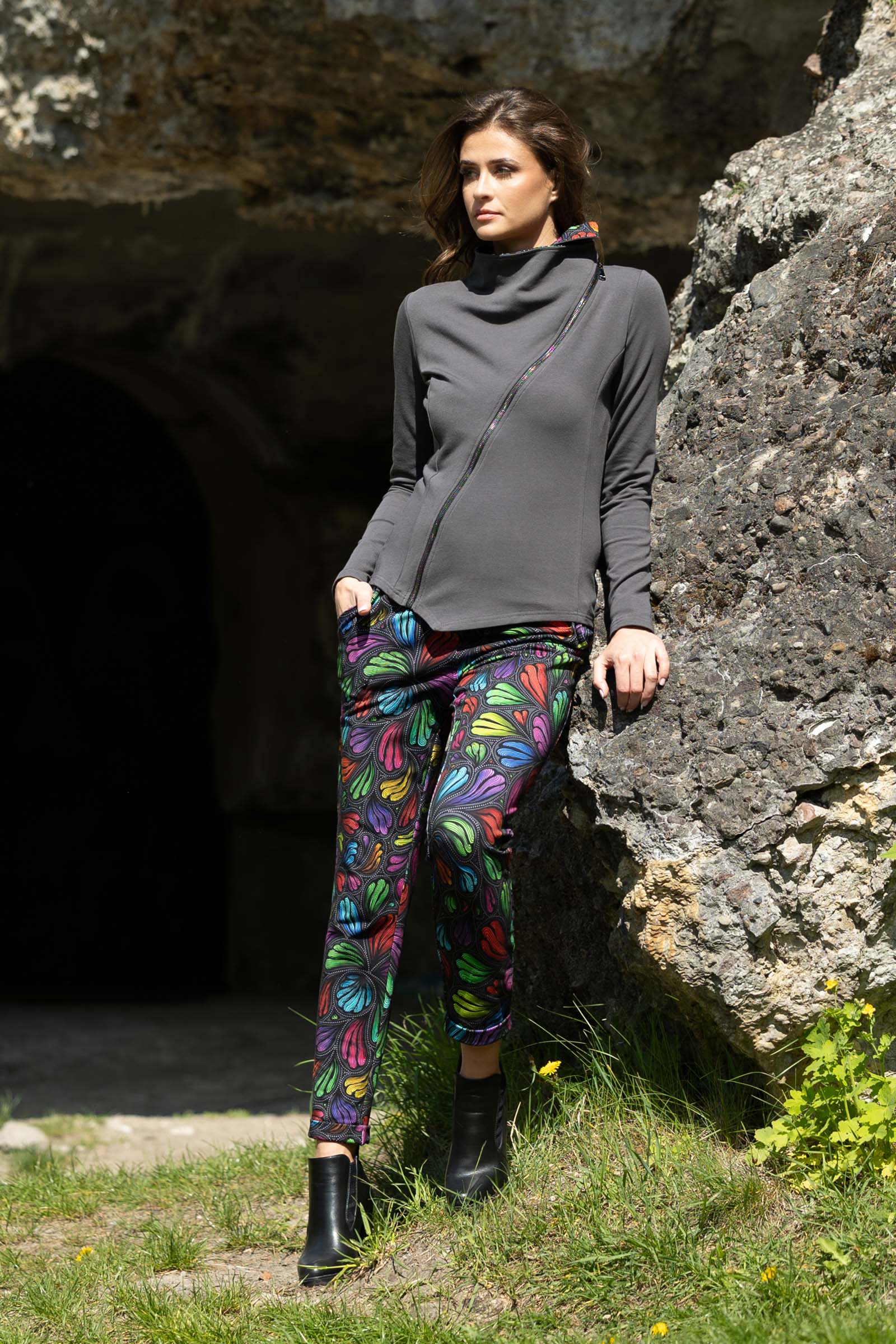 Asymetryczny fason ze stójką to doskonałe połączenie nowoczesnego designu z funkcjonalnością. Stójka dodaje bluzie elegancji i prezentuje się wyjątkowo efektownie, jednocześnie chroniąc szyję przed wiatrem i chłodem.
