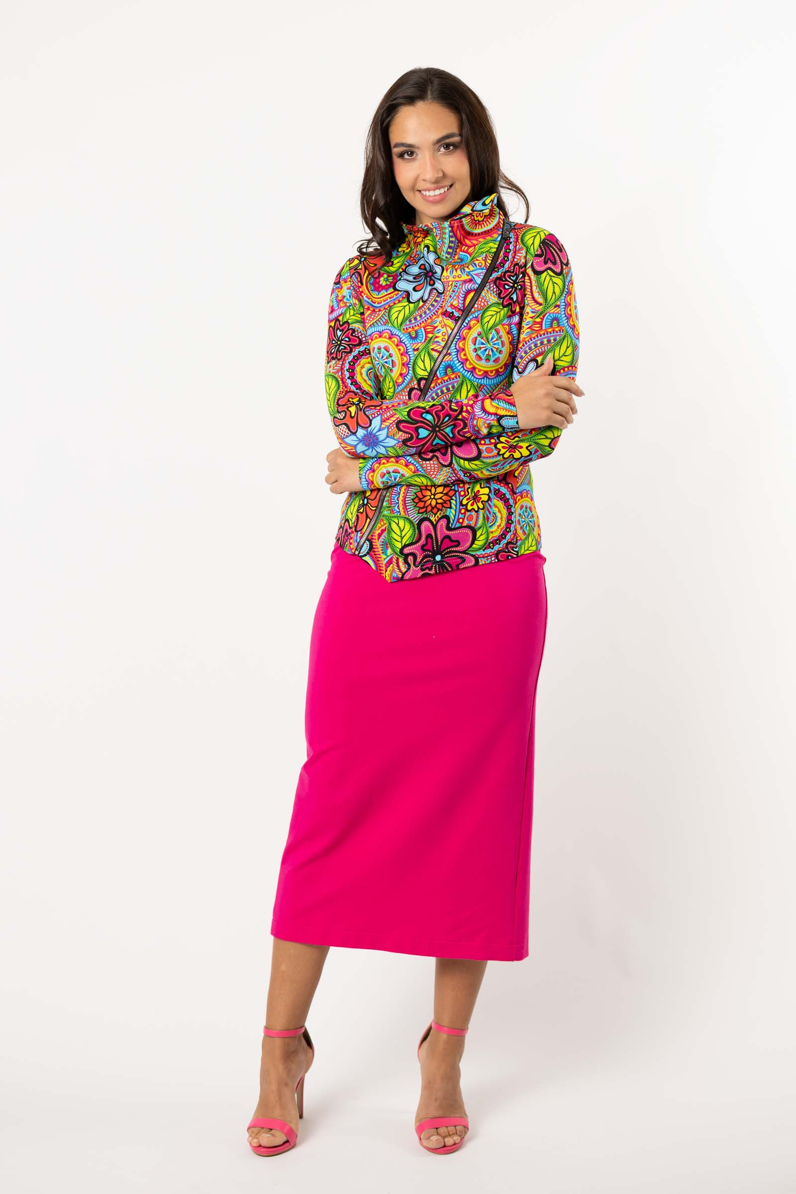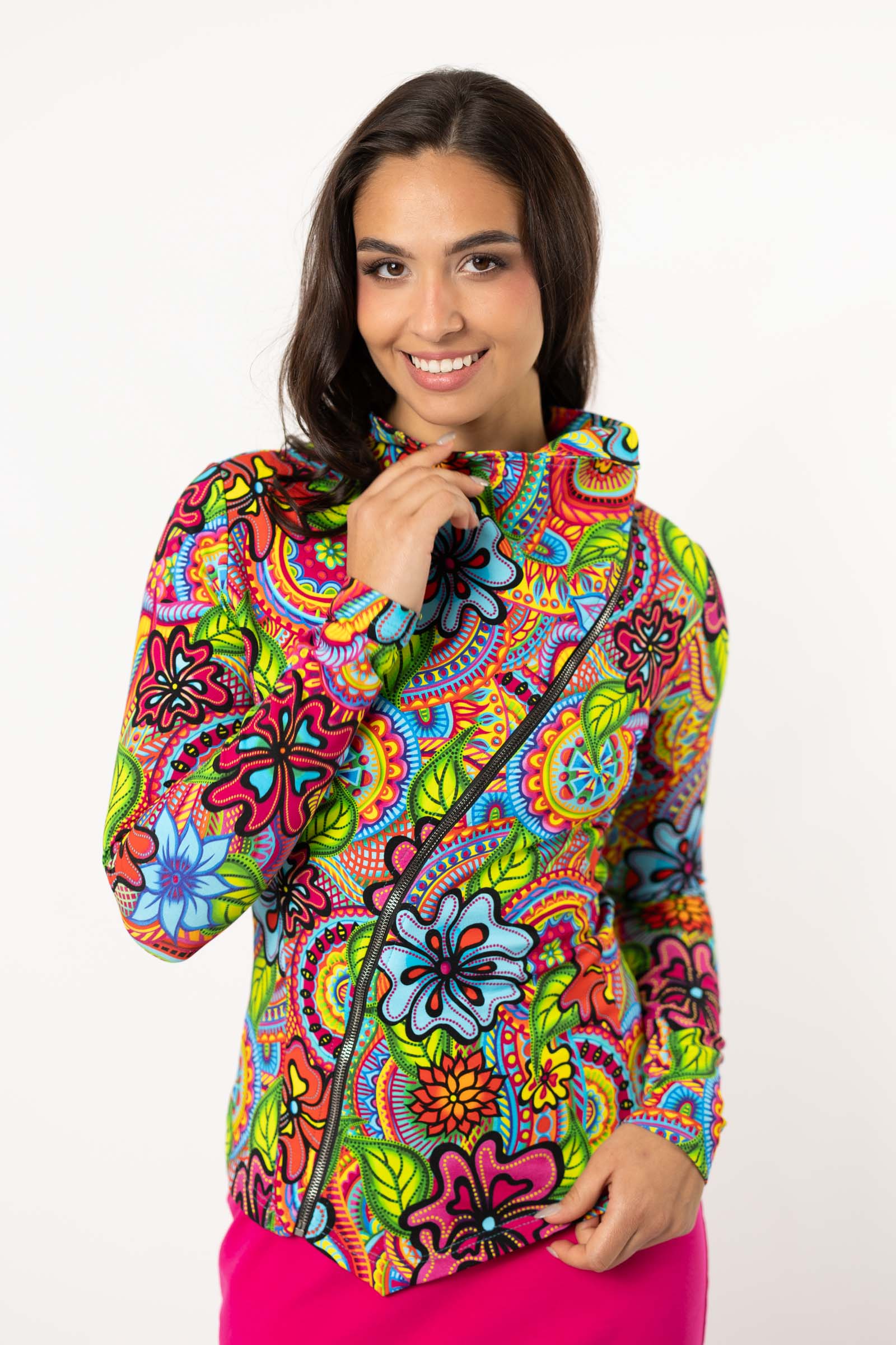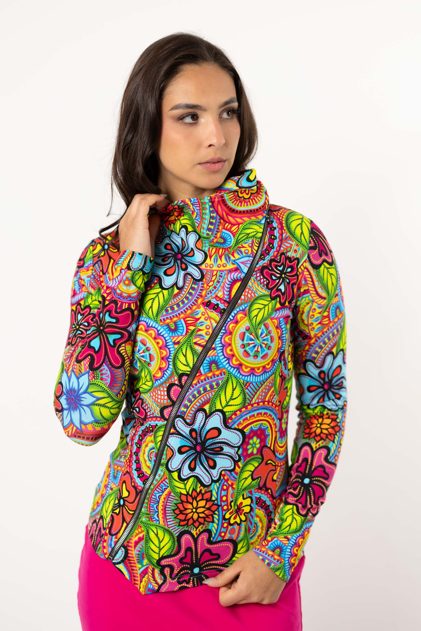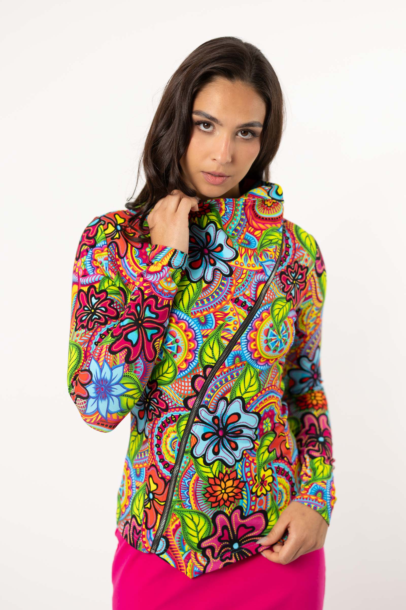 Asymetryczny fason ze stójką to doskonałe połączenie nowoczesnego designu z funkcjonalnością. Stójka dodaje bluzie elegancji i prezentuje się wyjątkowo efektownie, jednocześnie chroniąc szyję przed wiatrem i chłodem.