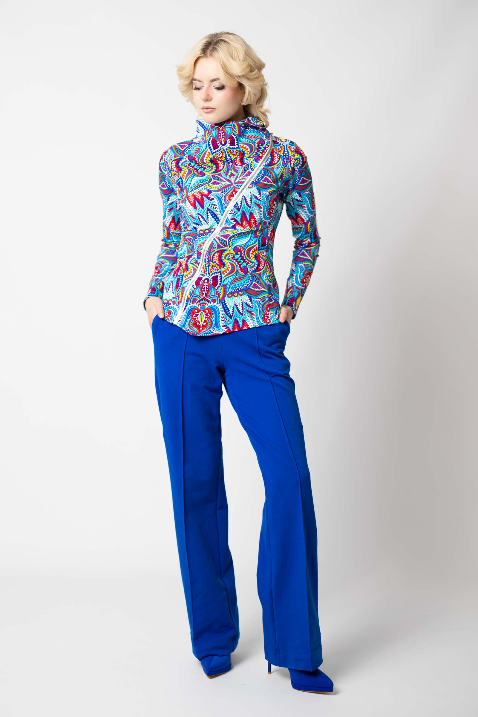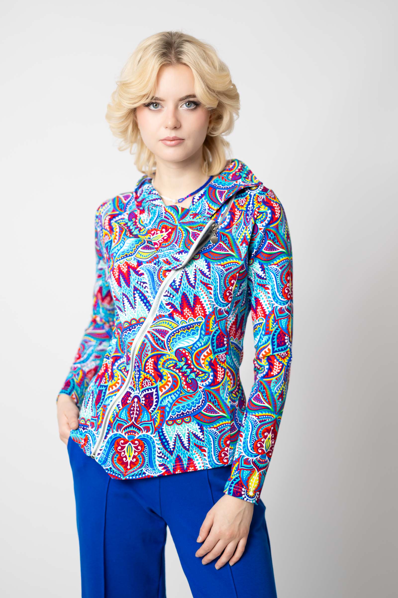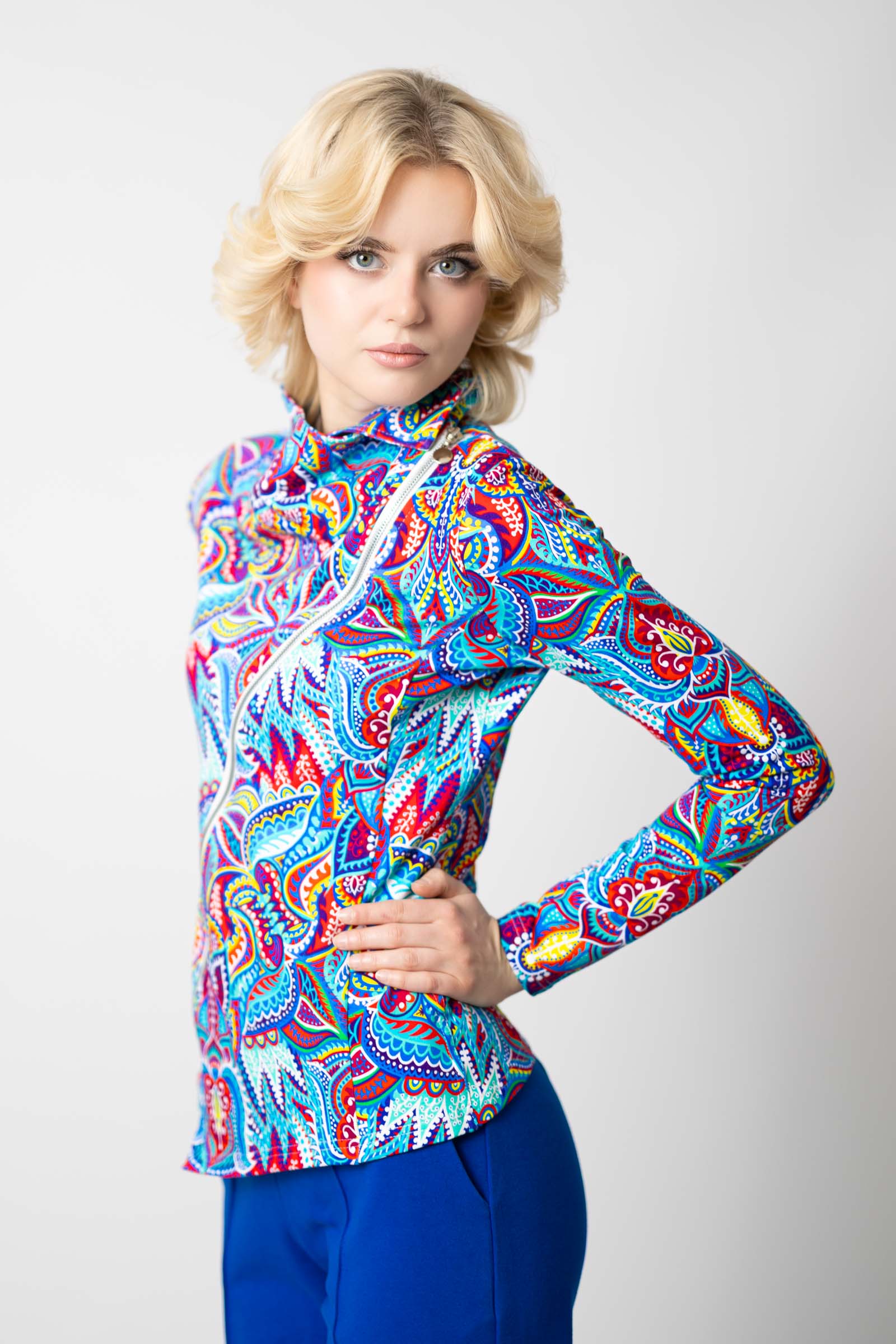Asymetryczny fason ze stójką to doskonałe połączenie nowoczesnego designu z funkcjonalnością. Stójka dodaje bluzie elegancji i prezentuje się wyjątkowo efektownie, jednocześnie chroniąc szyję przed wiatrem i chłodem.