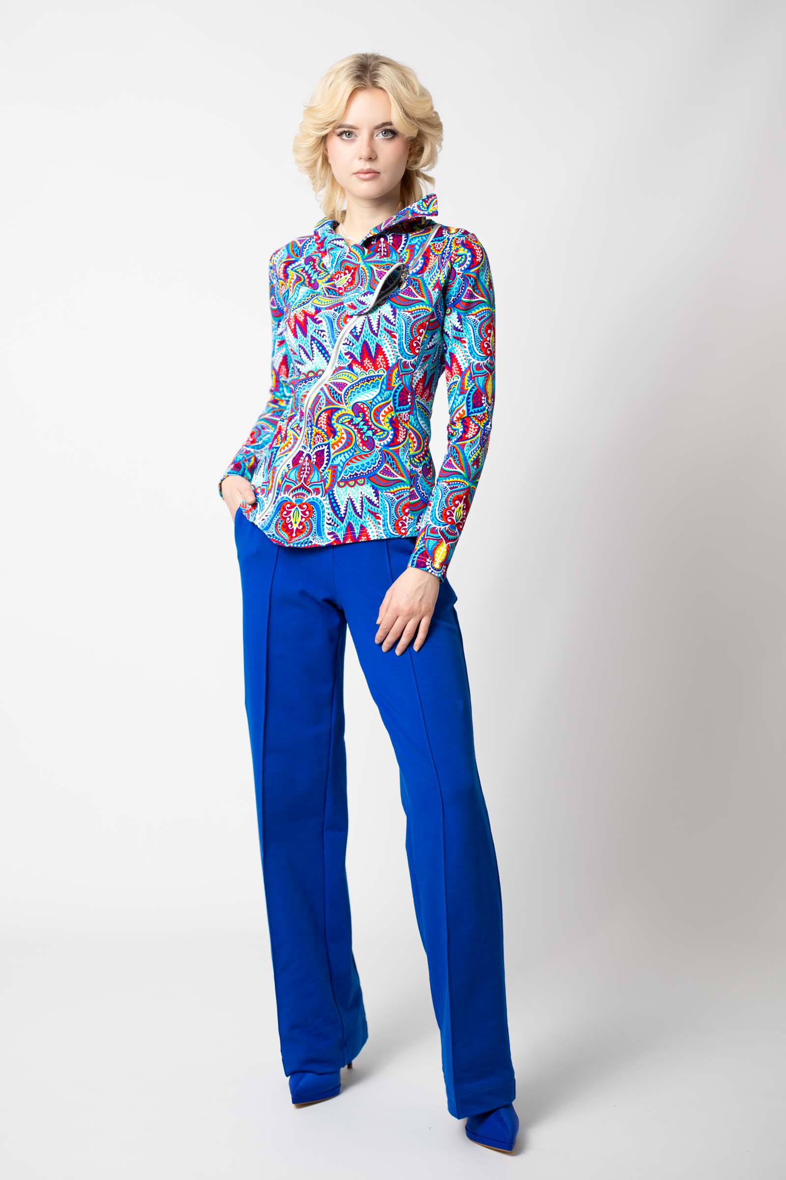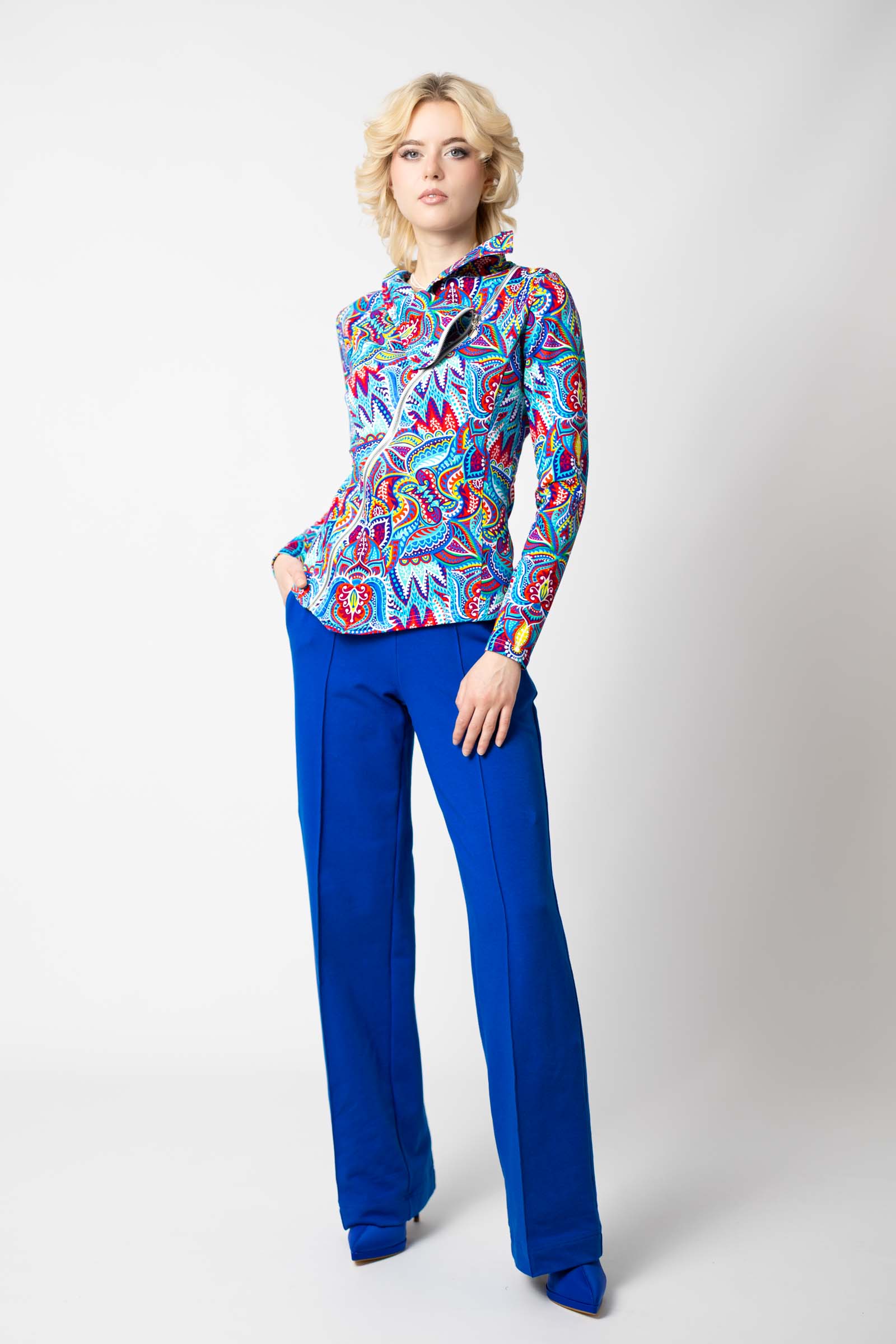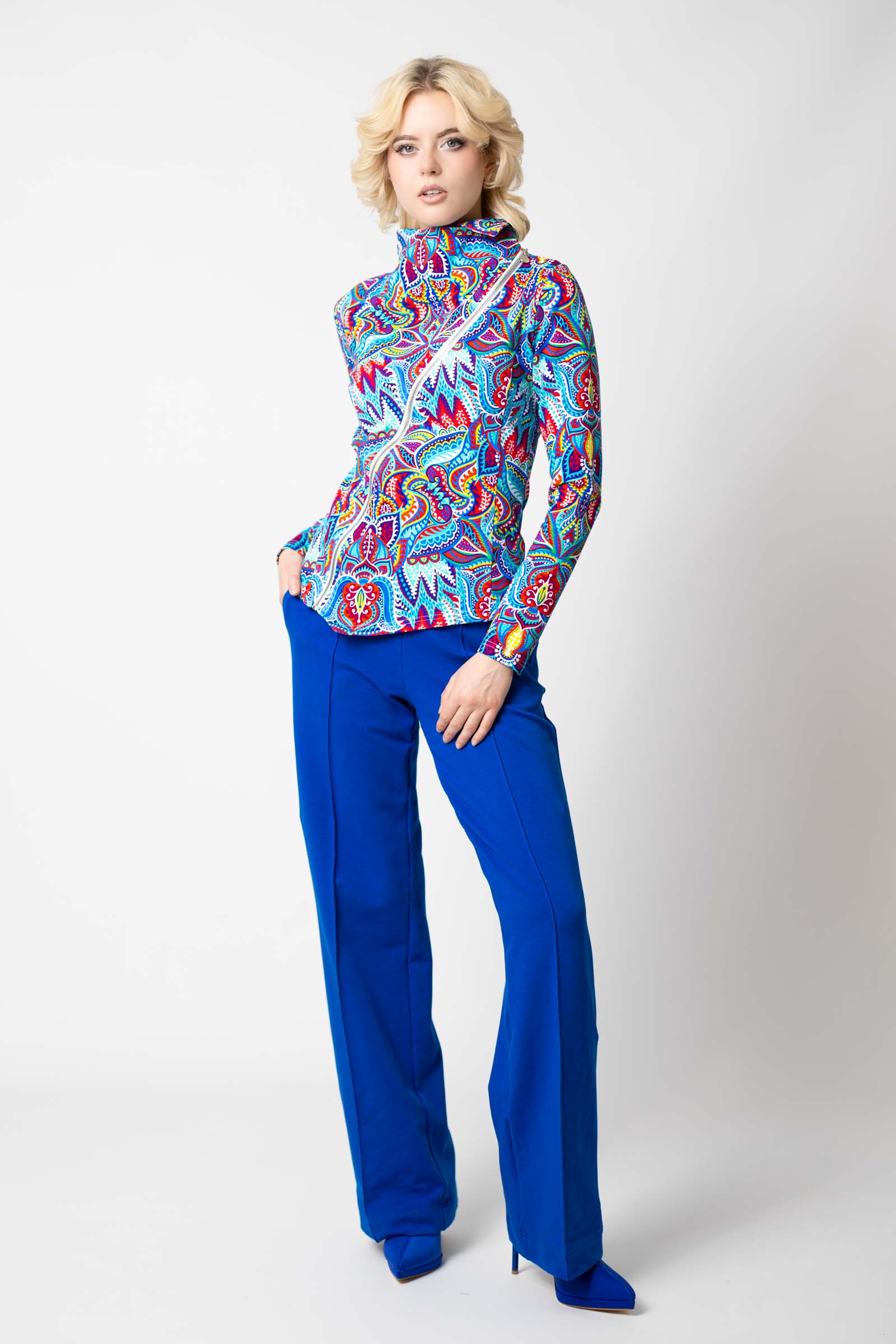 Asymetryczny fason ze stójką to doskonałe połączenie nowoczesnego designu z funkcjonalnością. Stójka dodaje bluzie elegancji i prezentuje się wyjątkowo efektownie, jednocześnie chroniąc szyję przed wiatrem i chłodem.