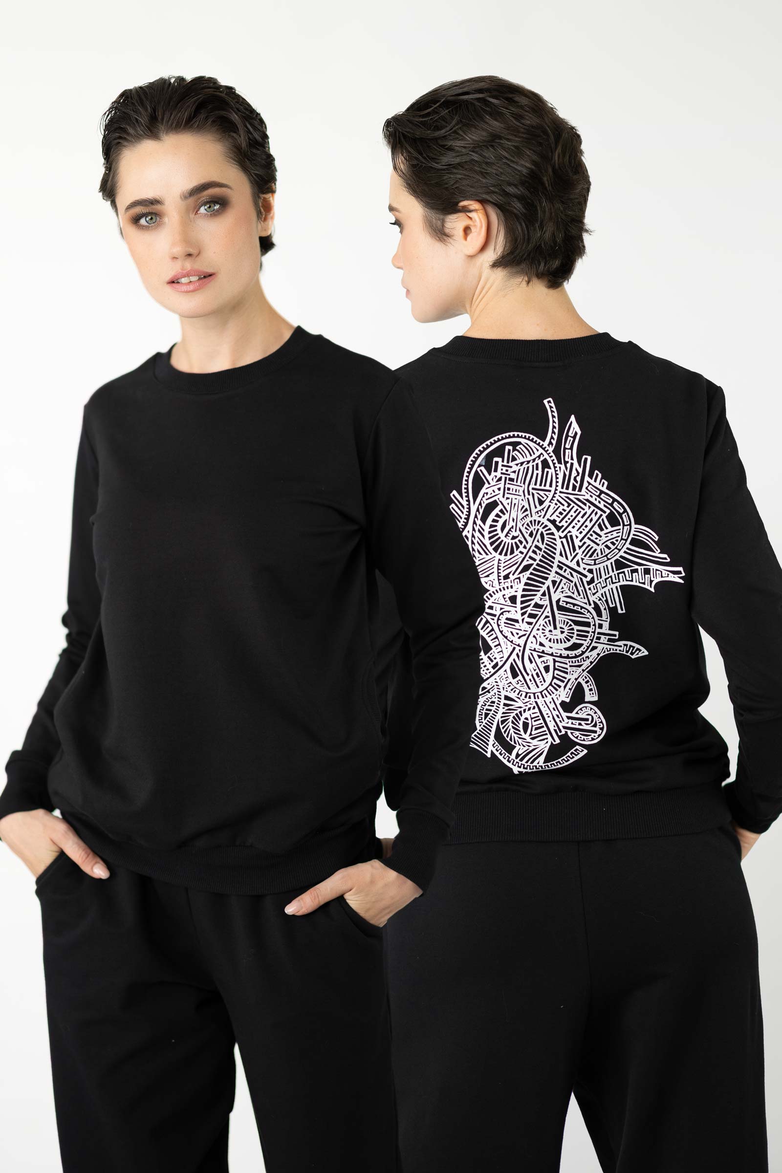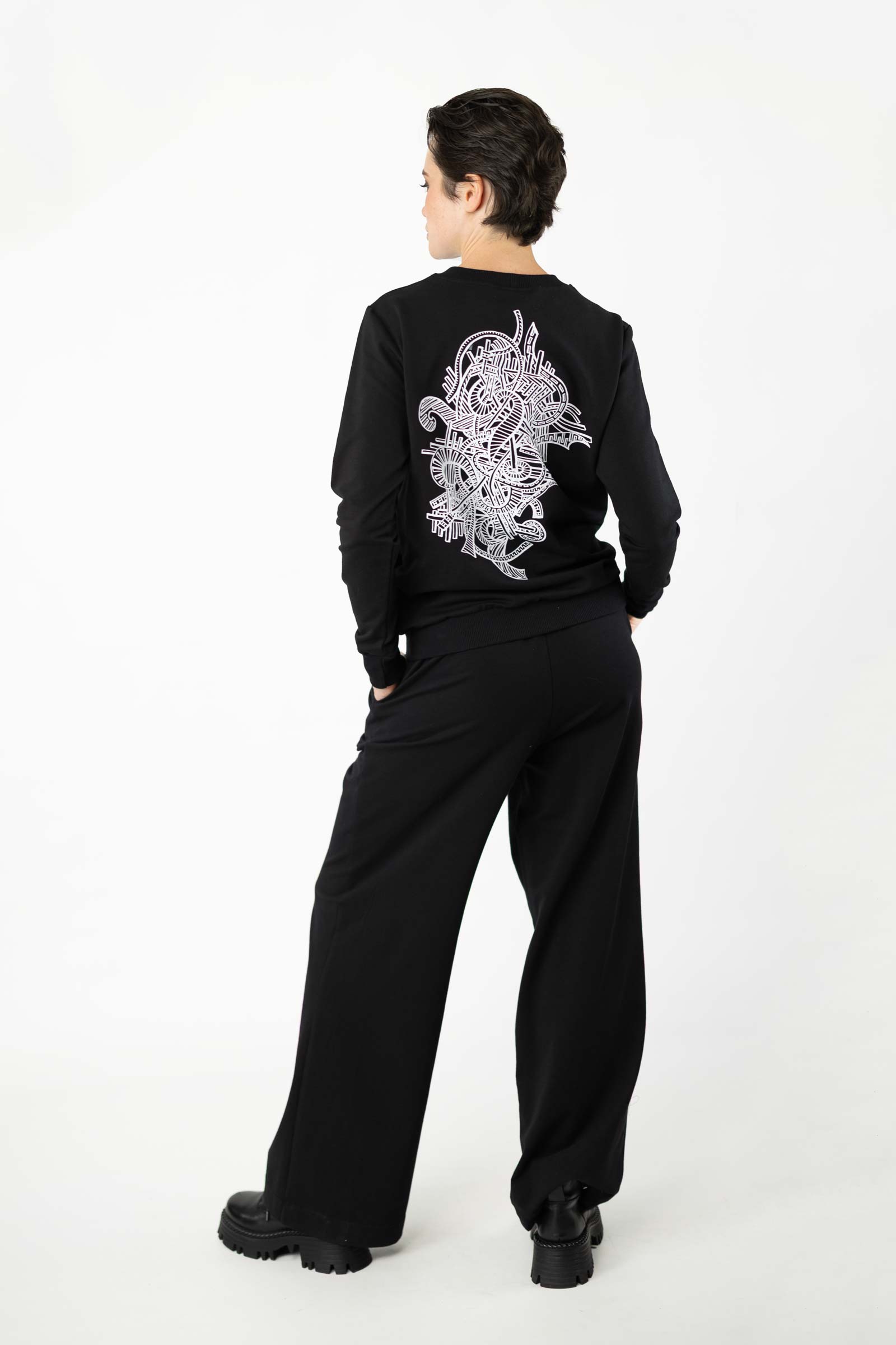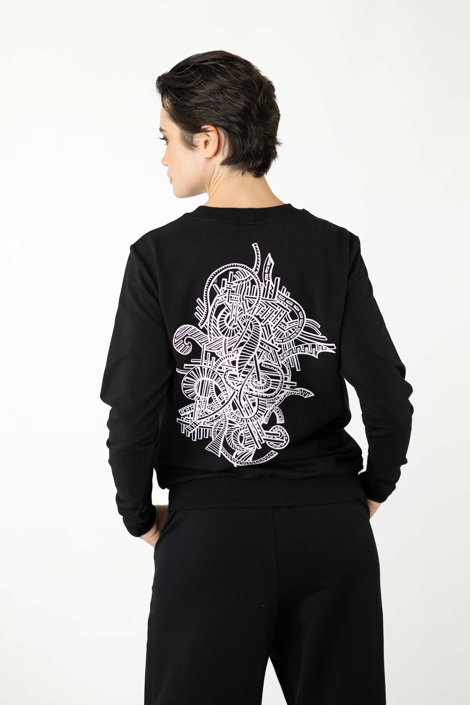 Nowoczesna, wyrazista i w 100% autorska – nasza czarna kolekcja z nadrukowanymi aplikacjami to połączenie minimalizmu z mocnym akcentem graficznym. Każda aplikacja powstała na bazie rysunków wykonanych ręcznie, a następnie przeniesionych na materiał w formie białego nadruku.
