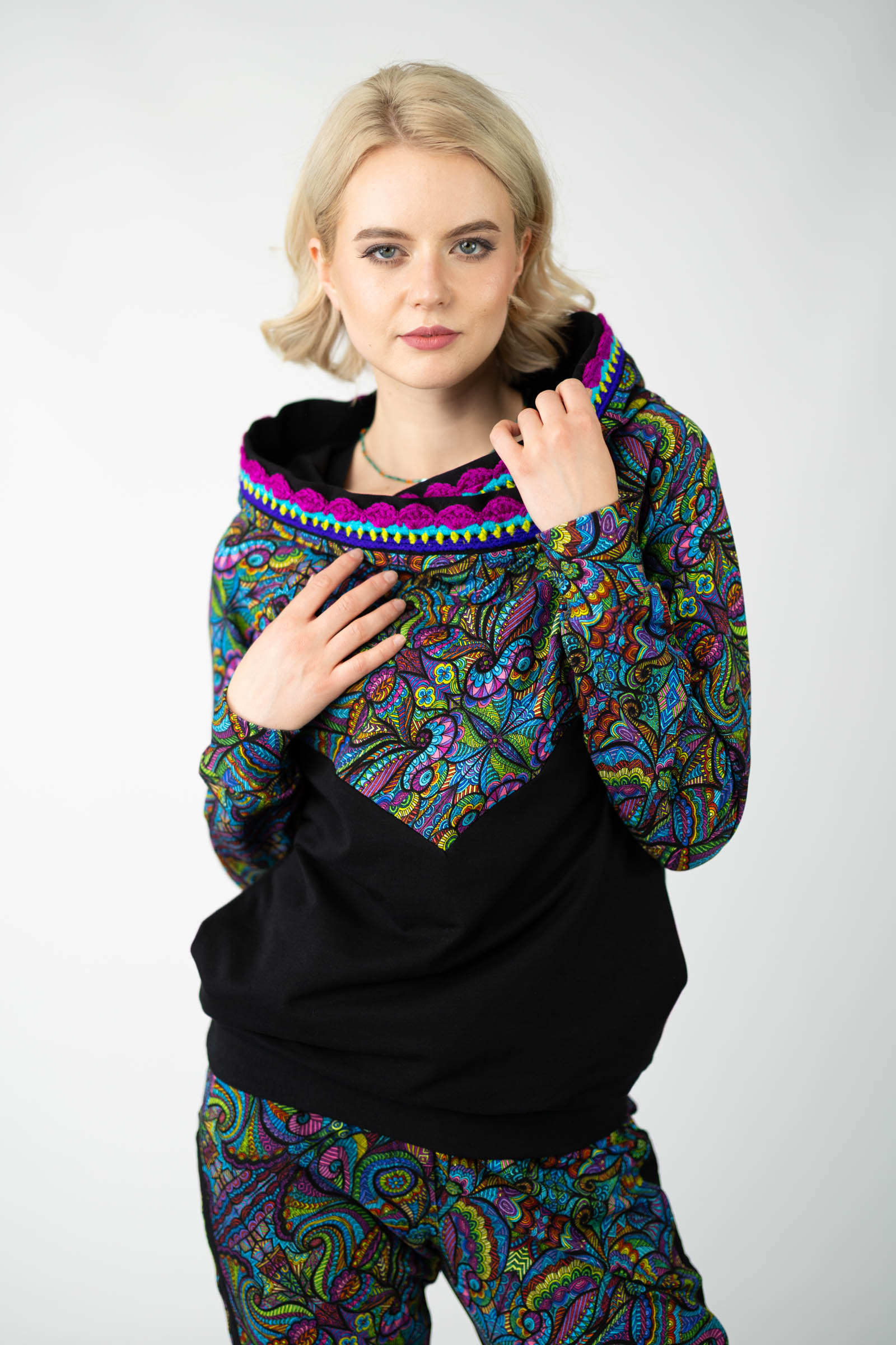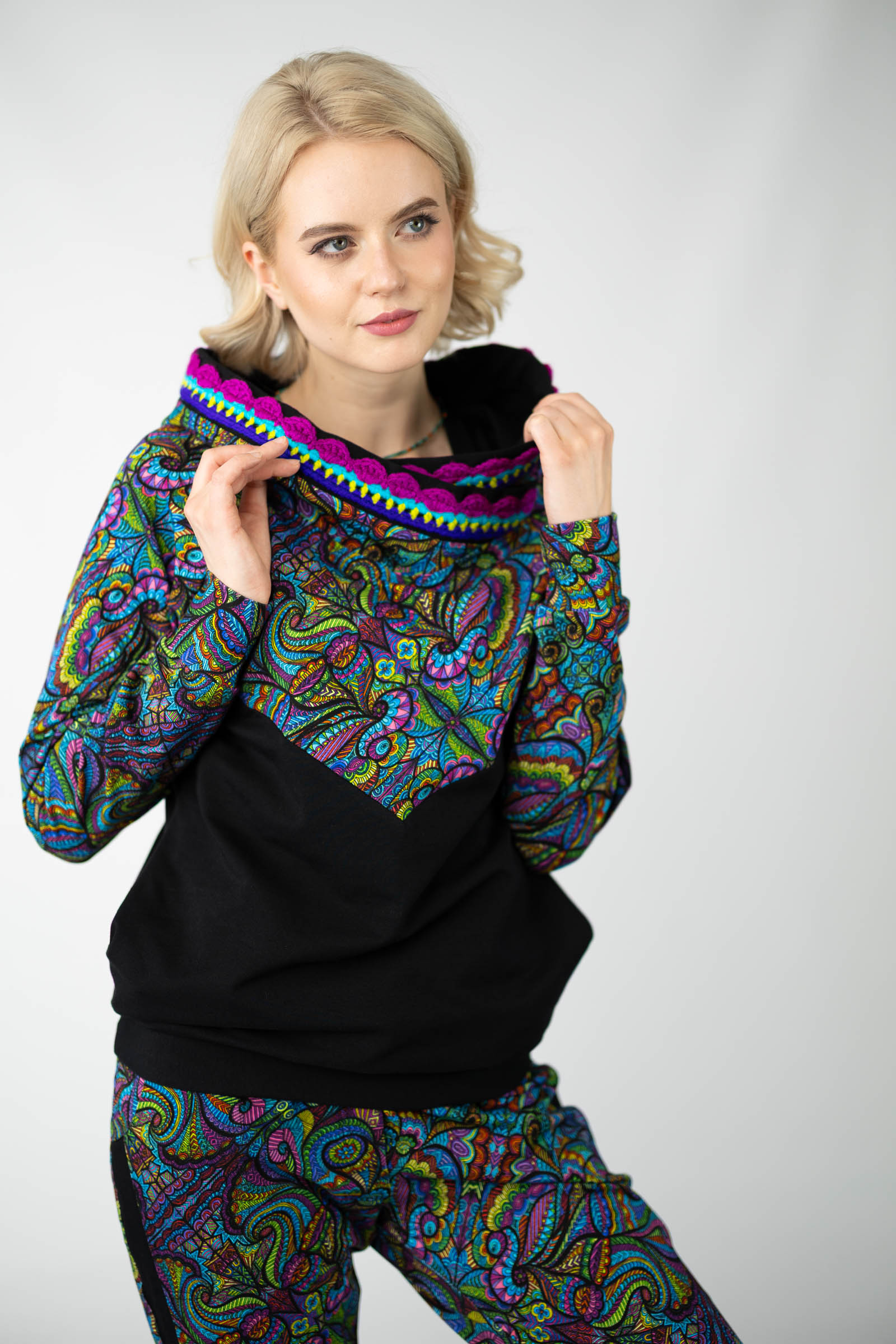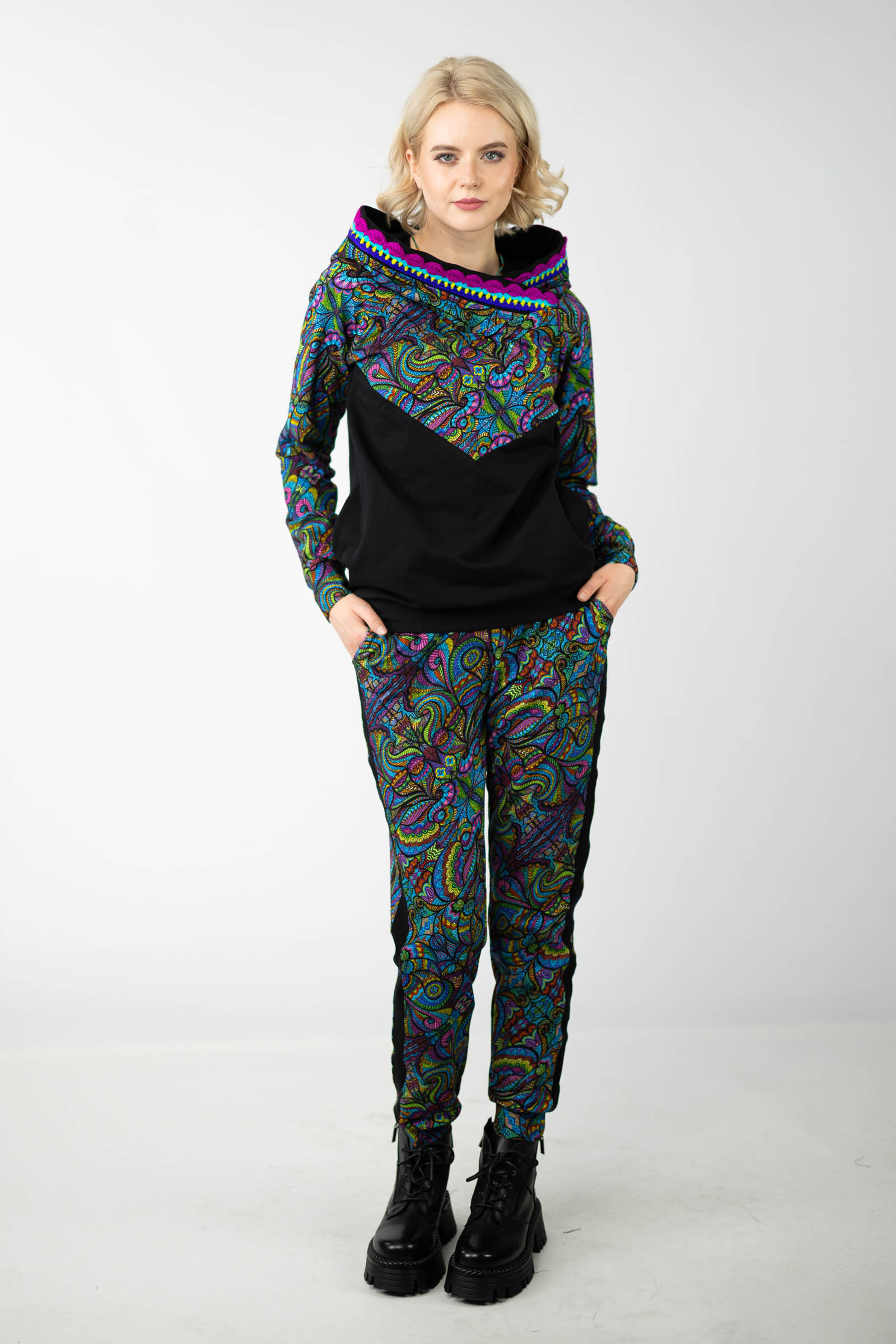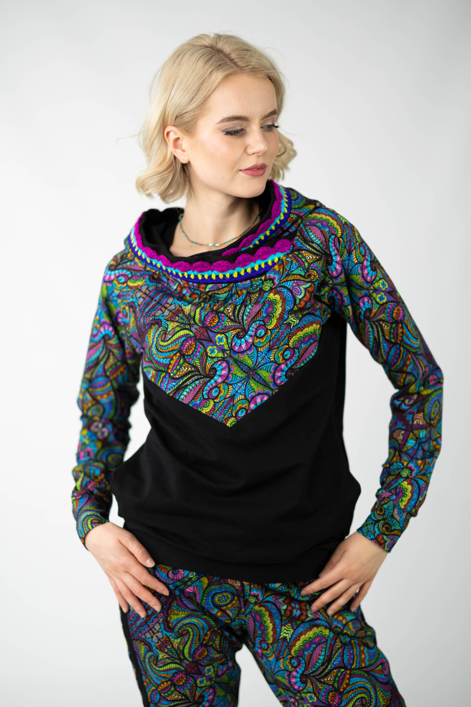 Warto podkreślić, że ta bluza została uszyta w naszej pracowni w Legionowie, co świadczy o polskiej jakości i dbałości o detale. Autorski wzór materiału został zaprojektowany przez właścicielkę i twórczynię marki Katarzynę Gałaj, co sprawia, że jest ona dostępna tylko u nas.