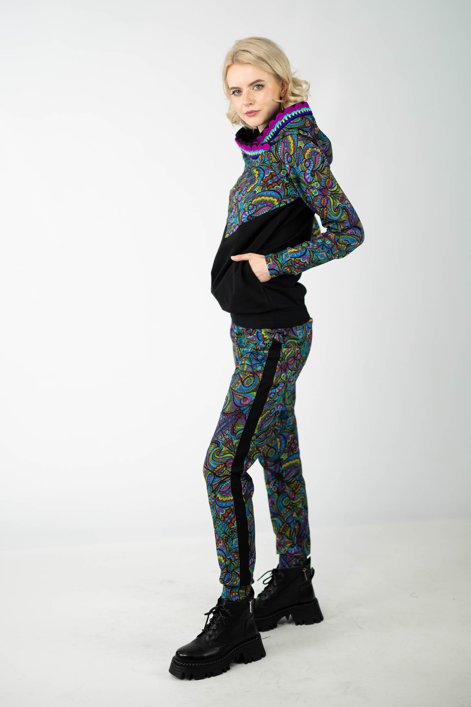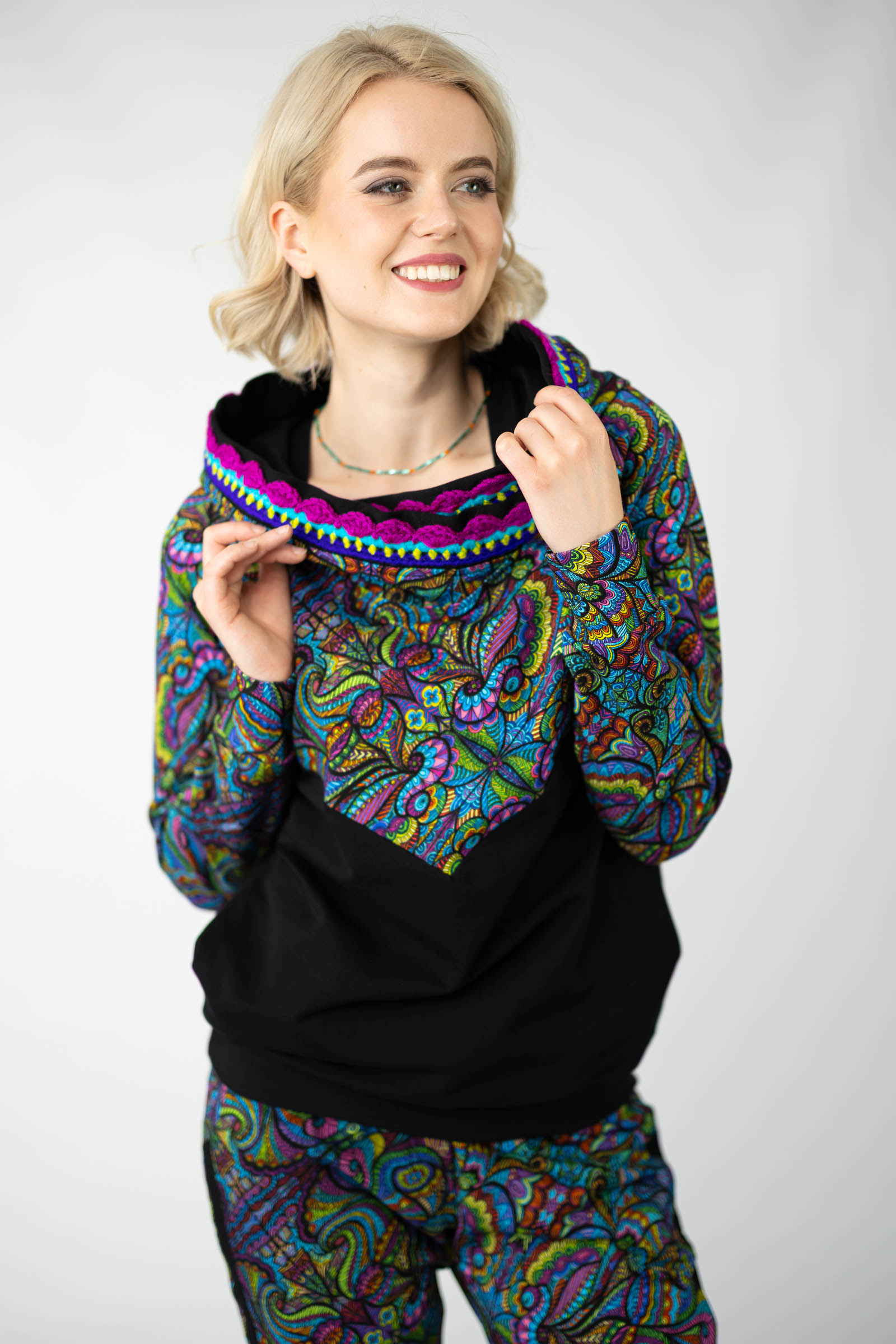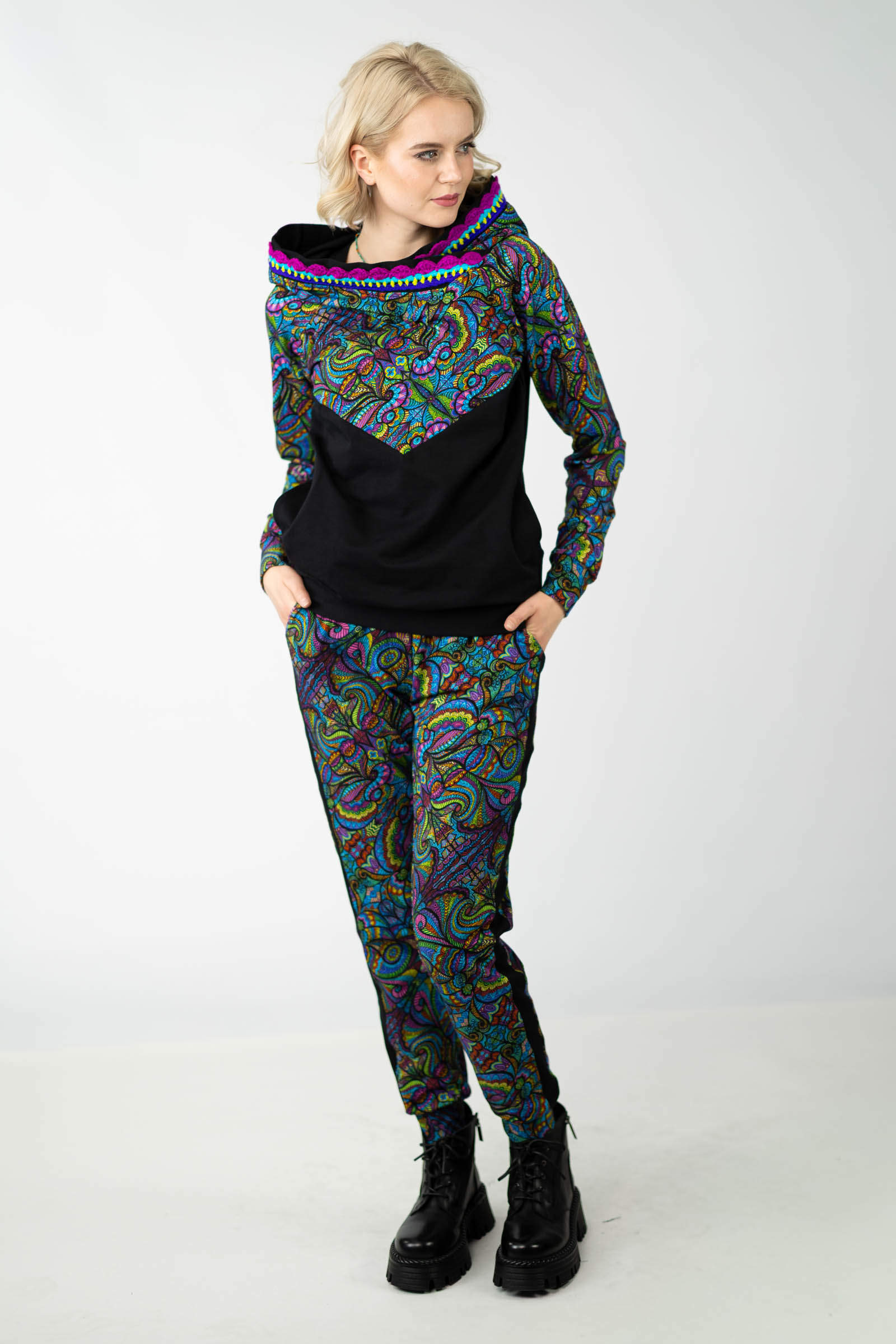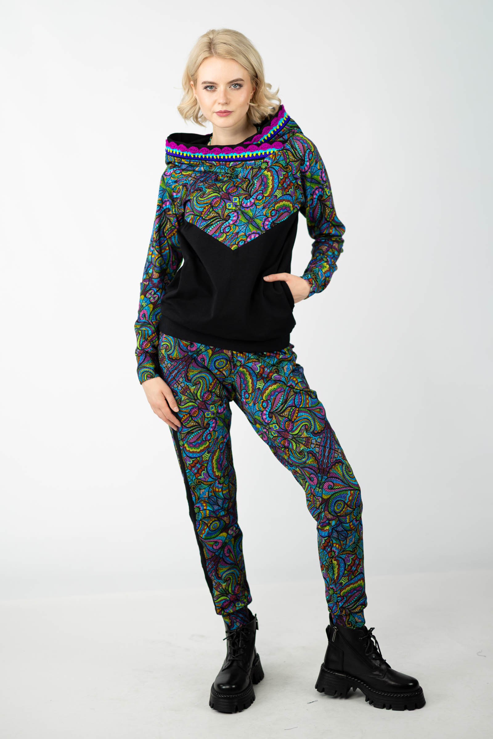Warto podkreślić, że ta bluza została uszyta w naszej pracowni w Legionowie, co świadczy o polskiej jakości i dbałości o detale. Autorski wzór materiału został zaprojektowany przez właścicielkę i twórczynię marki Katarzynę Gałaj, co sprawia, że jest ona dostępna tylko u nas.