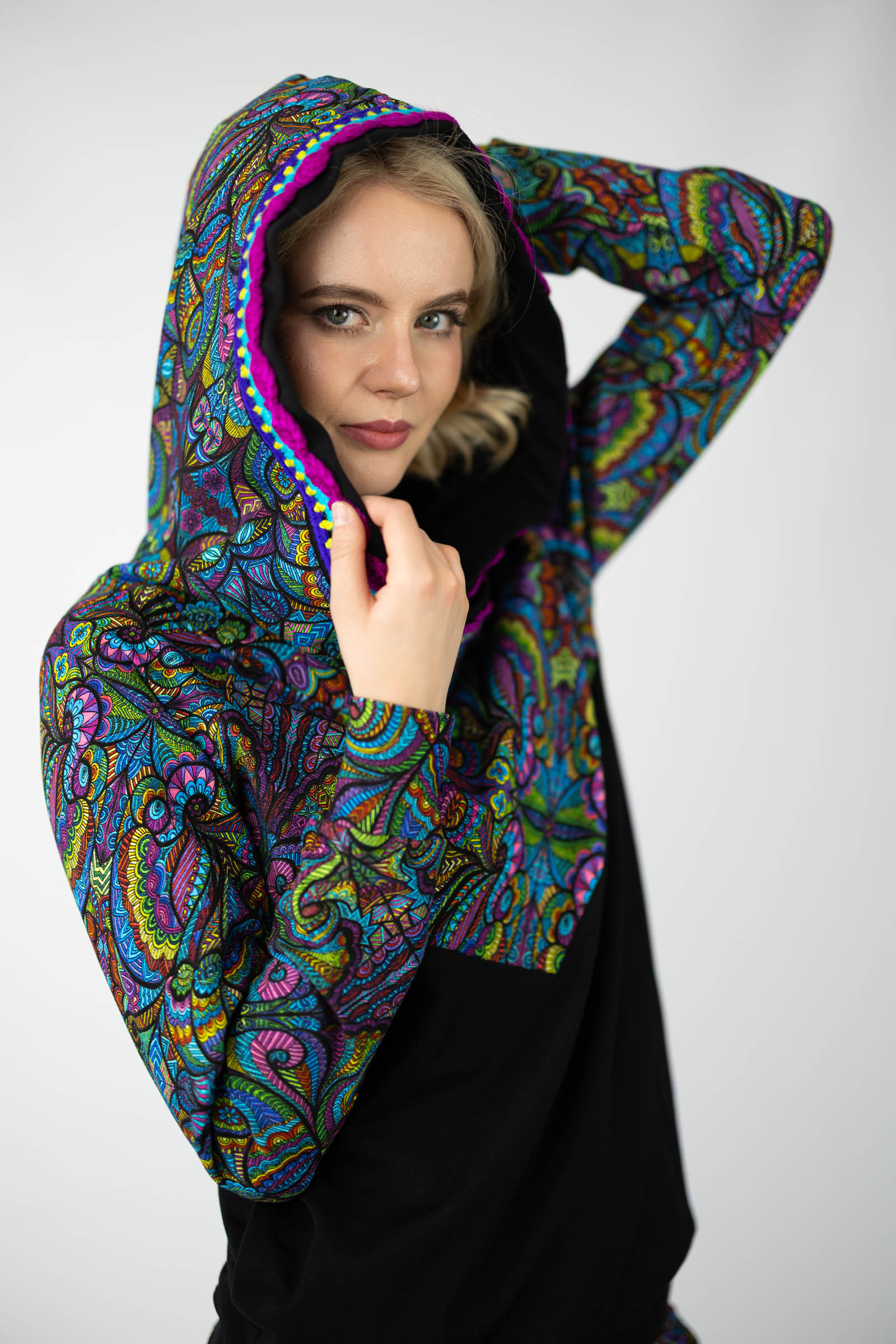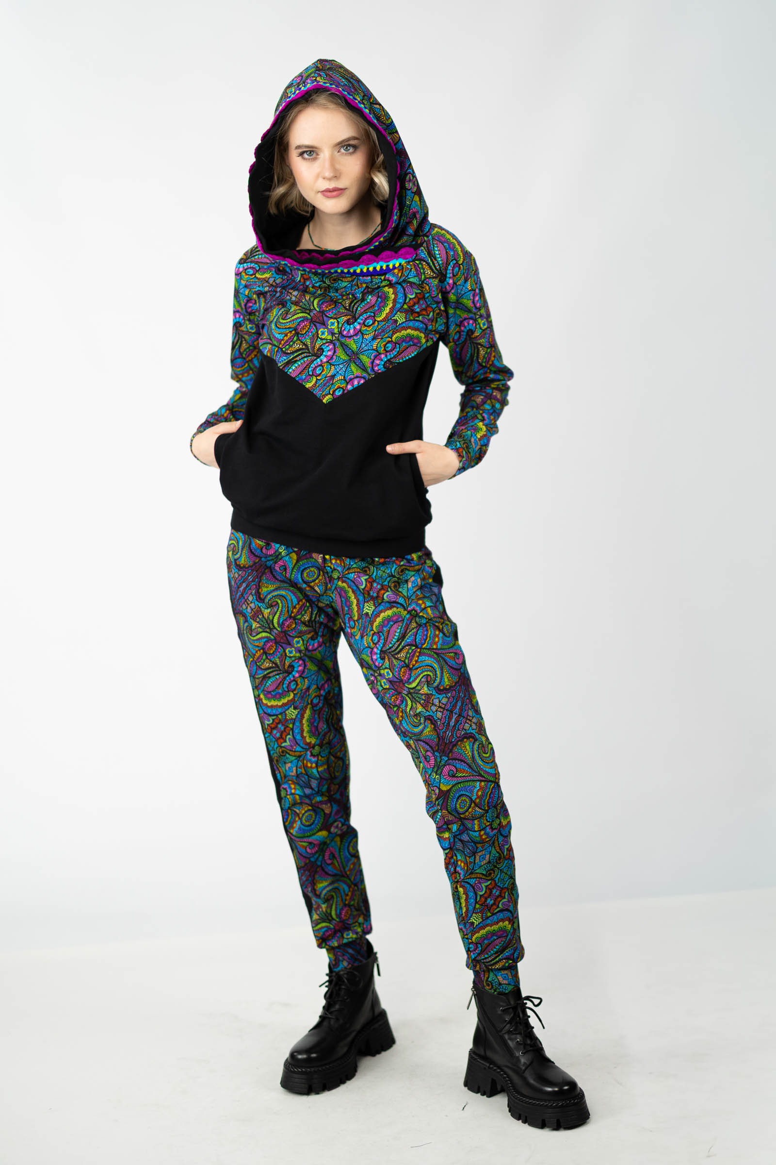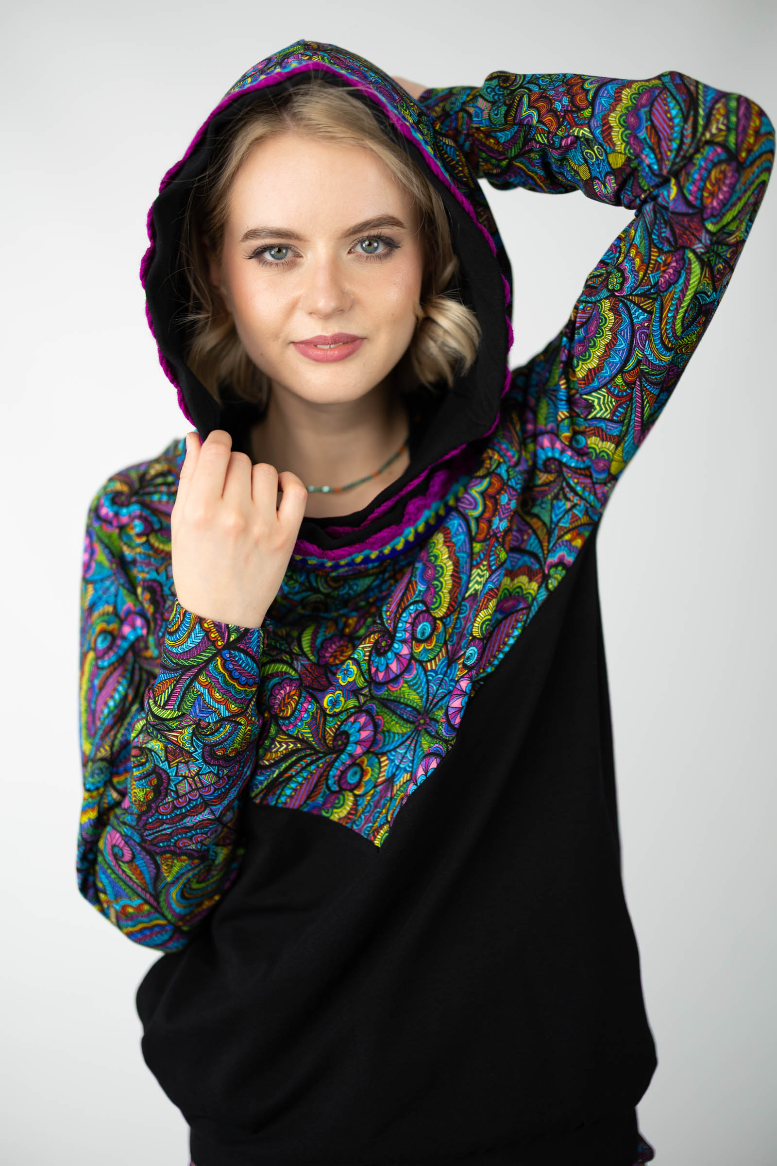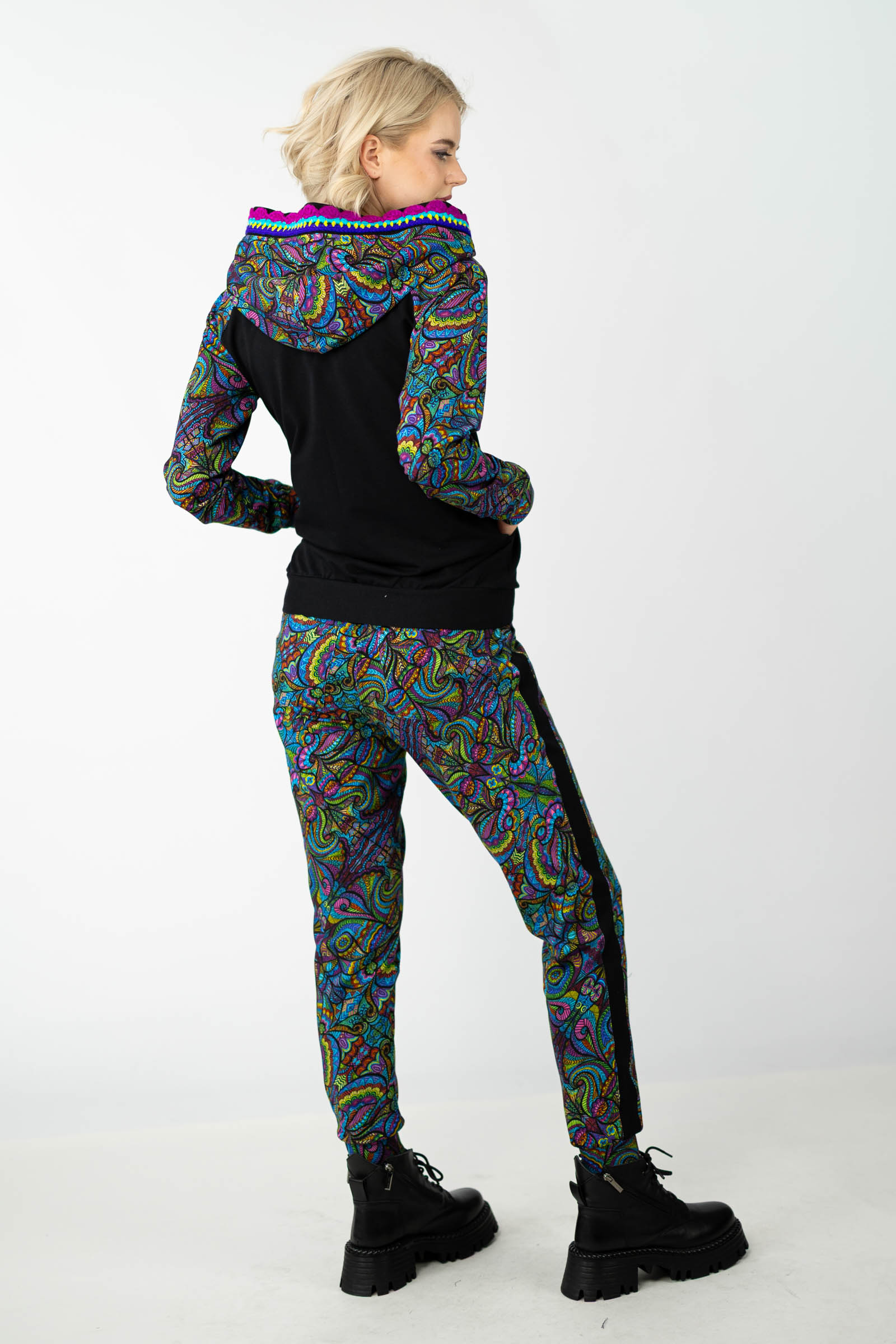 Warto podkreślić, że ta bluza została uszyta w naszej pracowni w Legionowie, co świadczy o polskiej jakości i dbałości o detale. Autorski wzór materiału został zaprojektowany przez właścicielkę i twórczynię marki Katarzynę Gałaj, co sprawia, że jest ona dostępna tylko u nas.