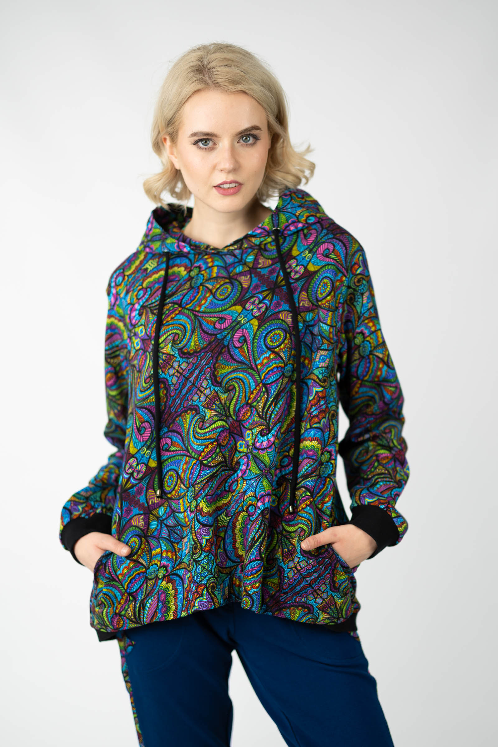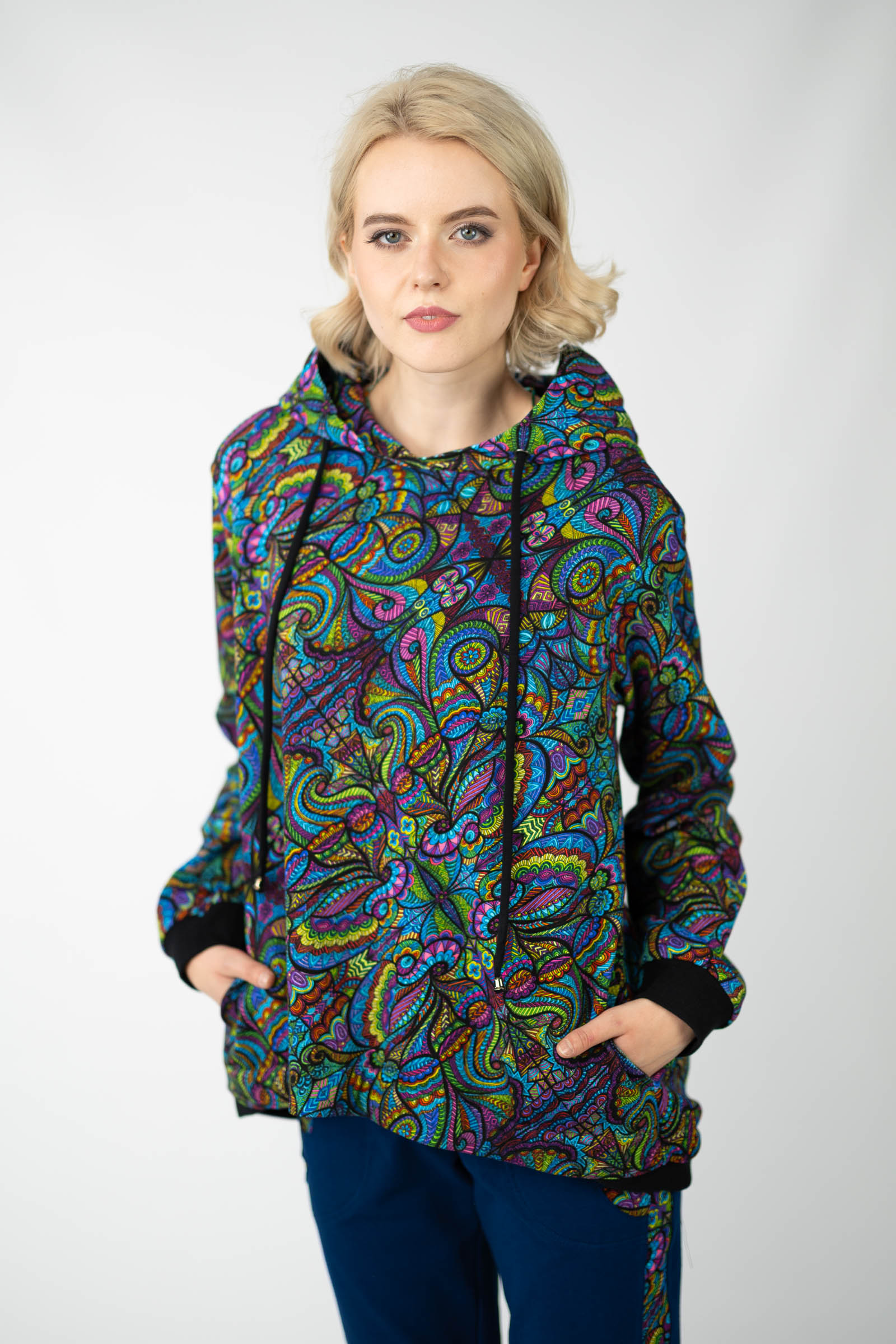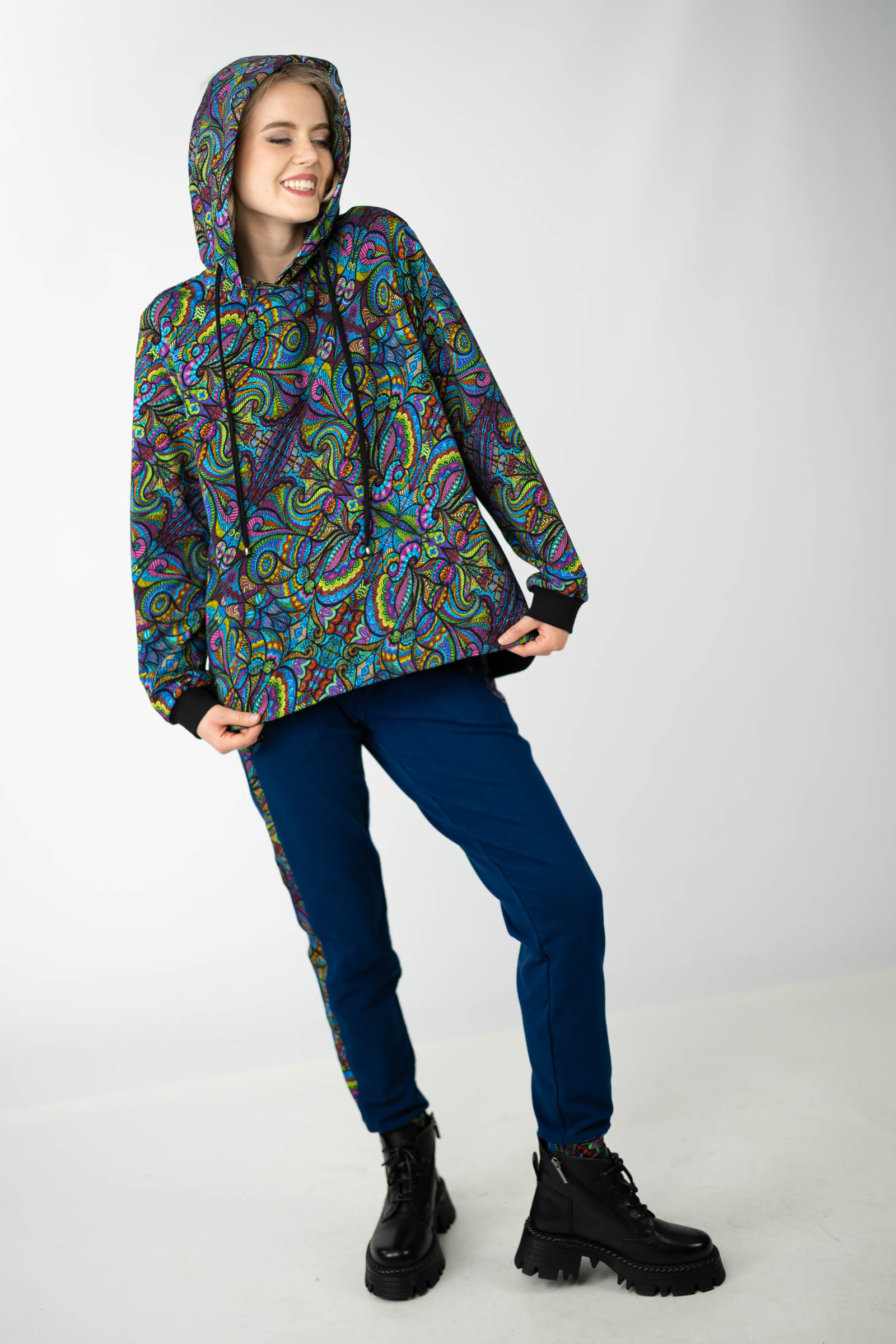 Autorski wzór nadruku nadaje bluzie niepowtarzalny wygląd, podkreślając Twoją indywidualność i wyjątkowy styl. Uszyta w naszej polskiej pracowni, każda bluza odznacza się wysoką jakością wykonania i dbałością o detale.