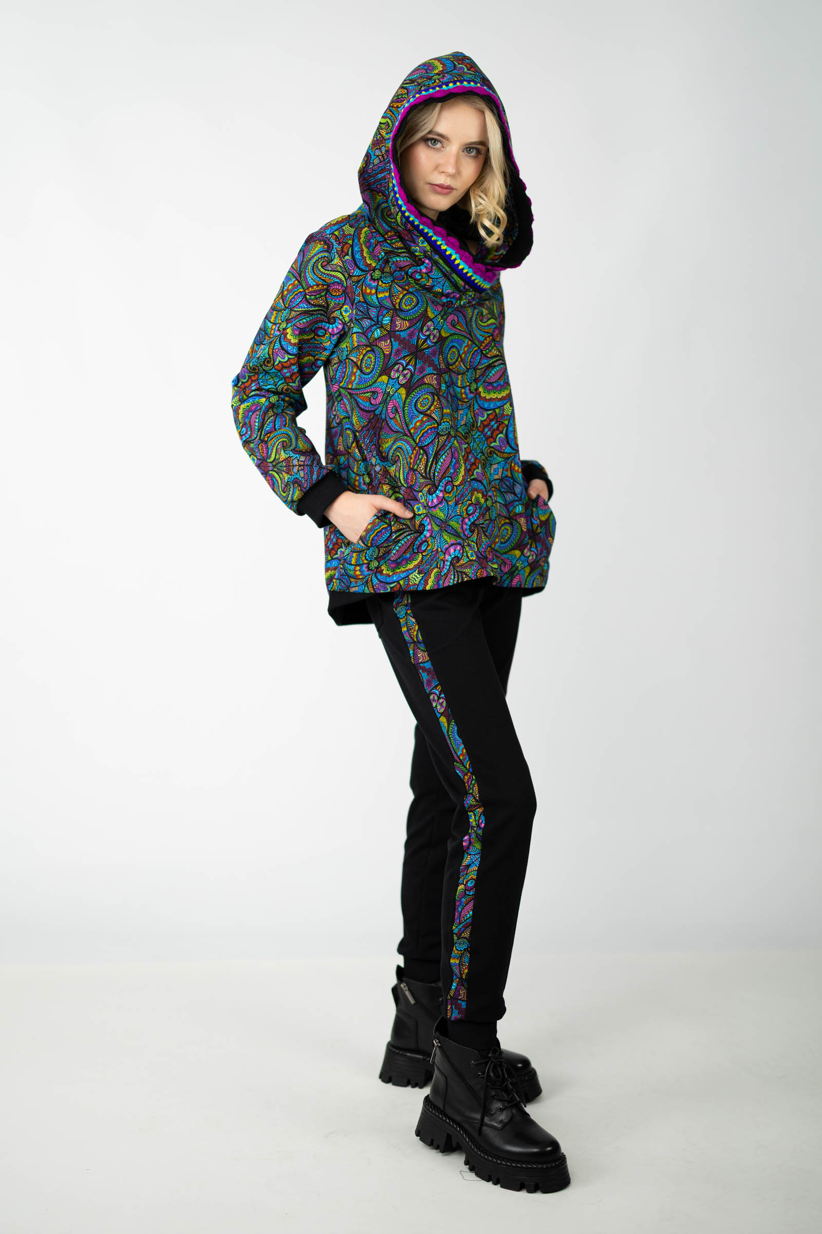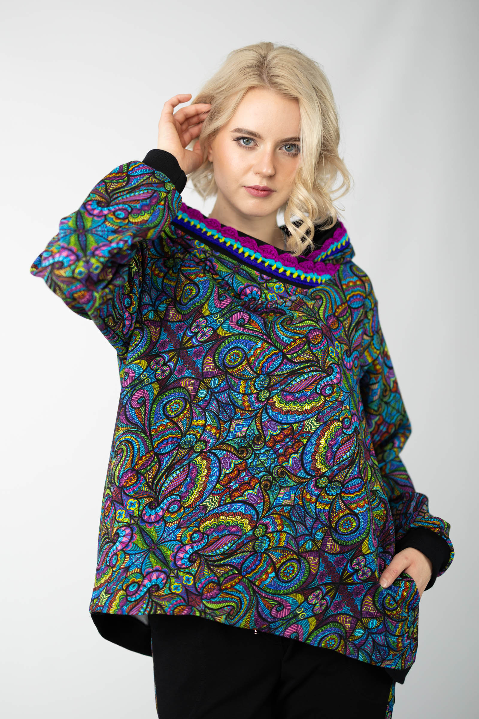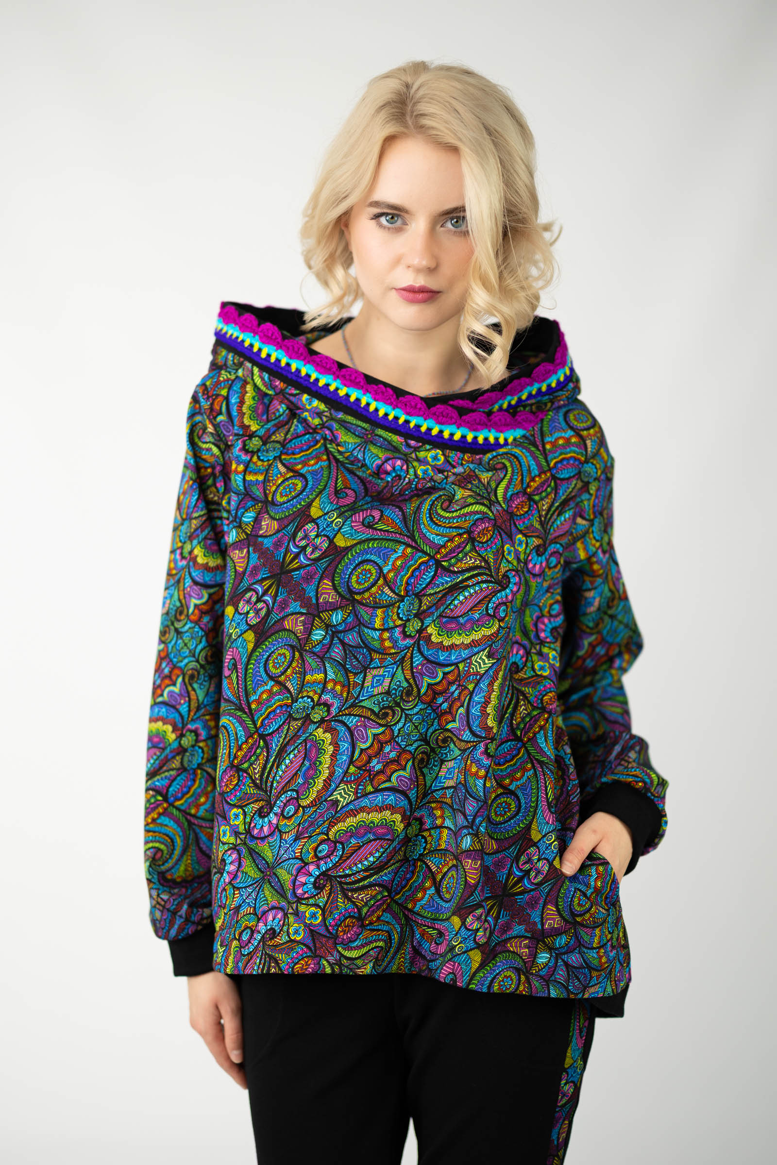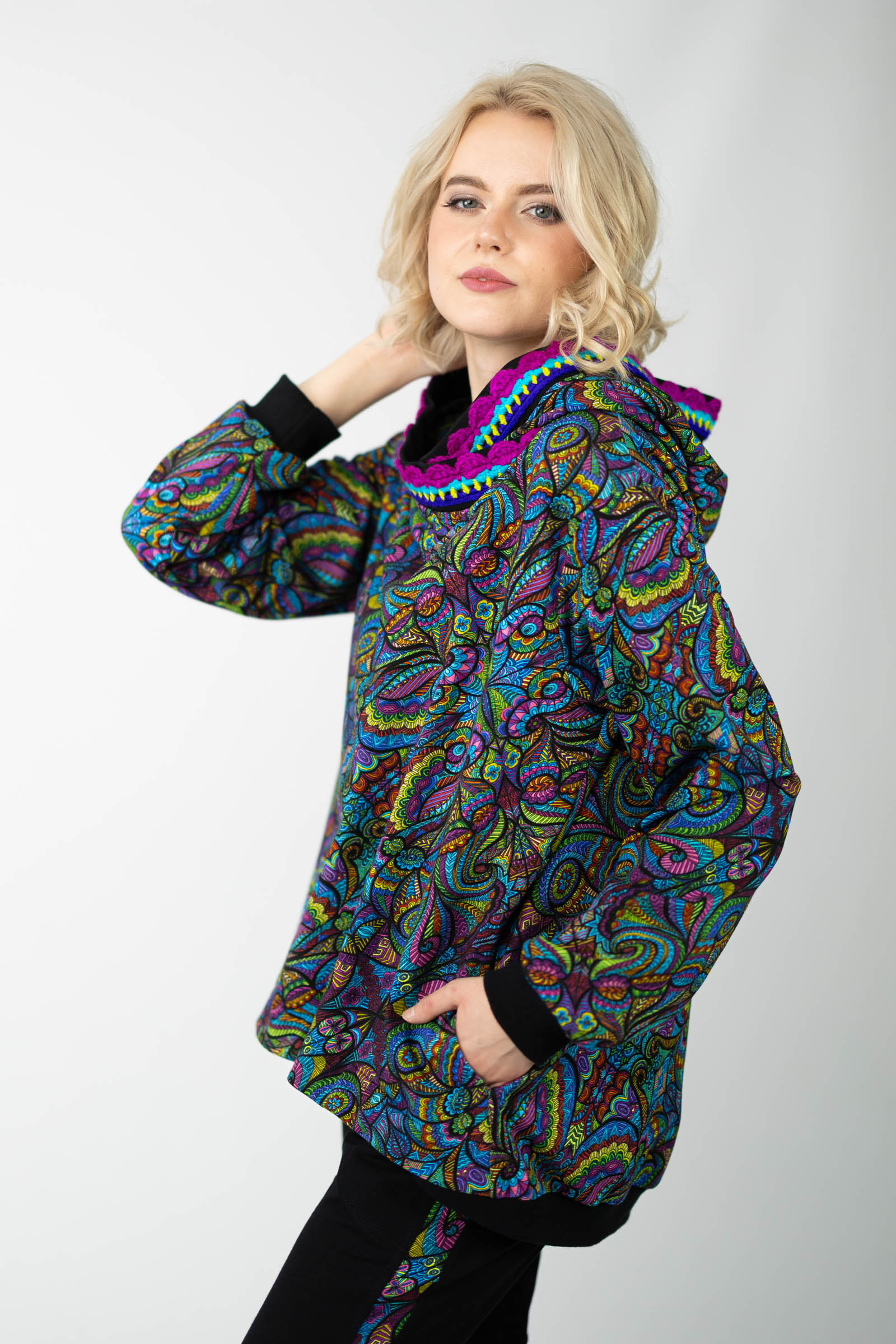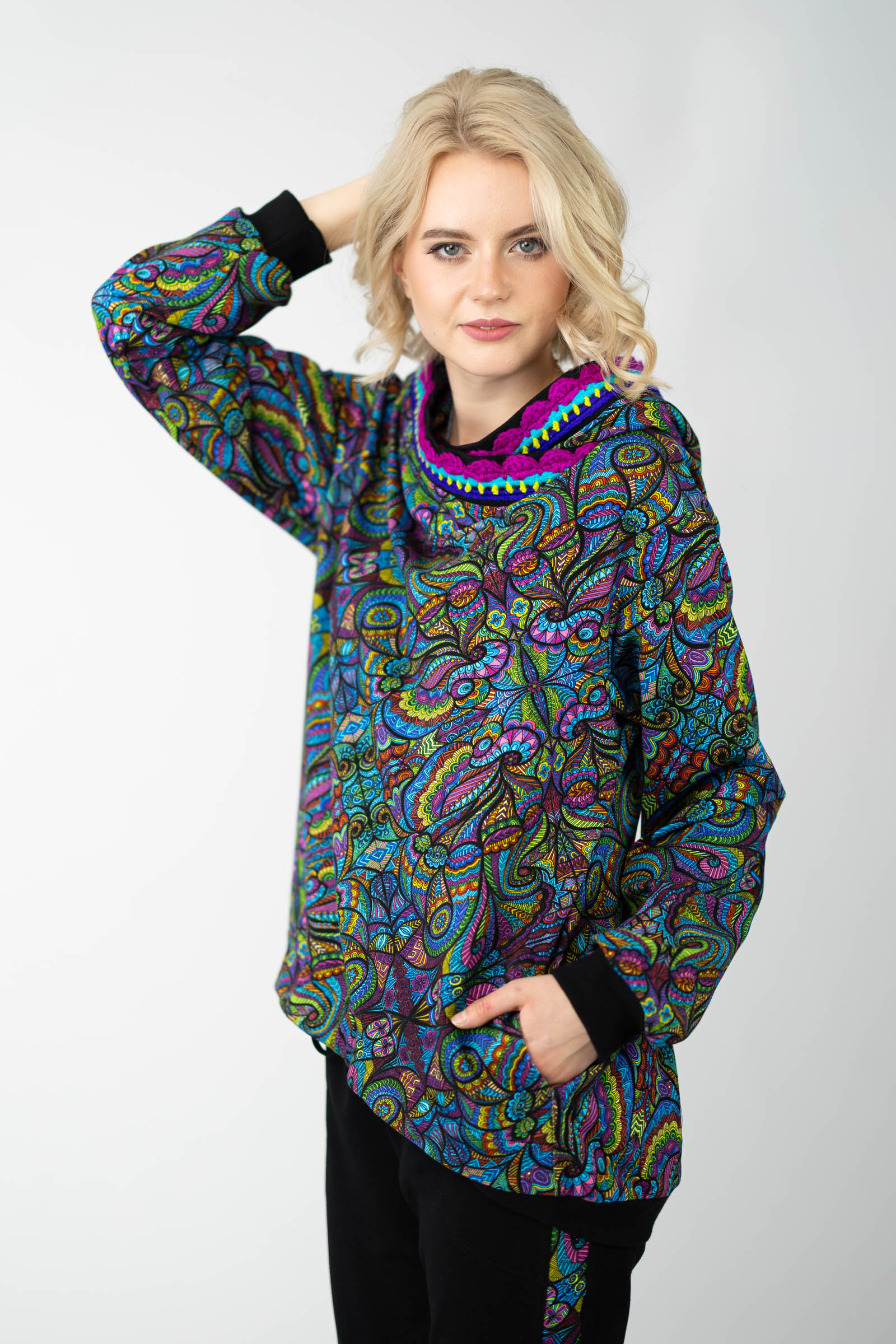 Autorski wzór nadruku i ręcznie szydełkowana koronka nadają bluzie niepowtarzalny wygląd, podkreślając Twoją indywidualność i wyjątkowy styl. Uszyta w naszej polskiej pracowni, każda bluza odznacza się wysoką jakością wykonania i dbałością o detale.