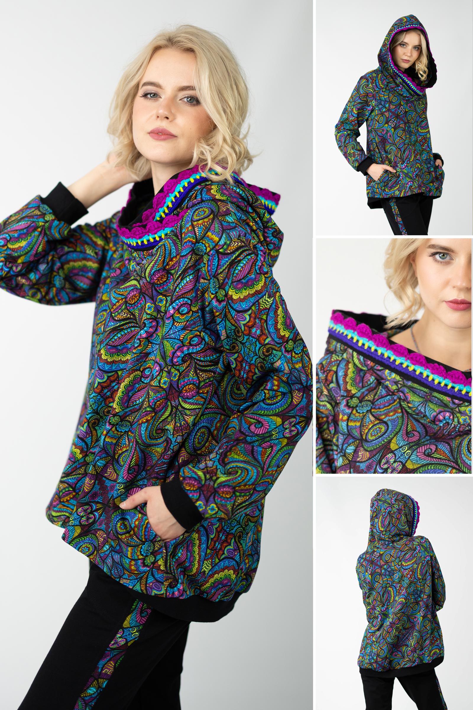 Jej największym atutem jest ręcznie dziergana szydełkowa koronka, naszyta na plisie kaptura – unikalny, misterny detal, który dodaje całości wyjątkowego charakteru i subtelnej elegancji. To niebanalna bluza dla kobiet, które cenią komfort i artystyczne akcenty w codziennym ubiorze.