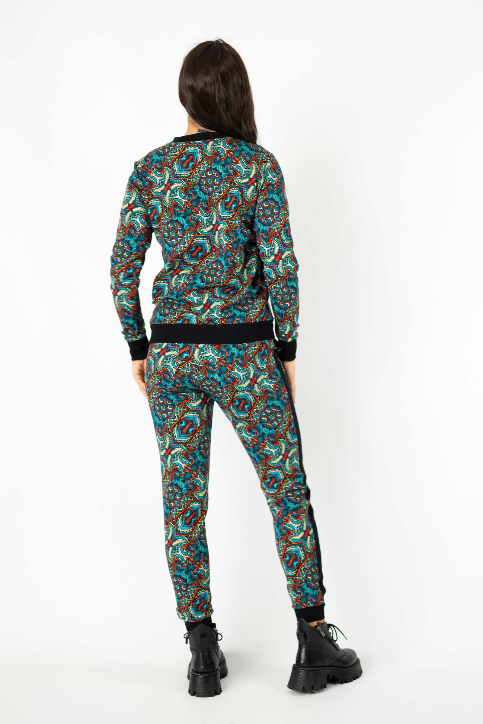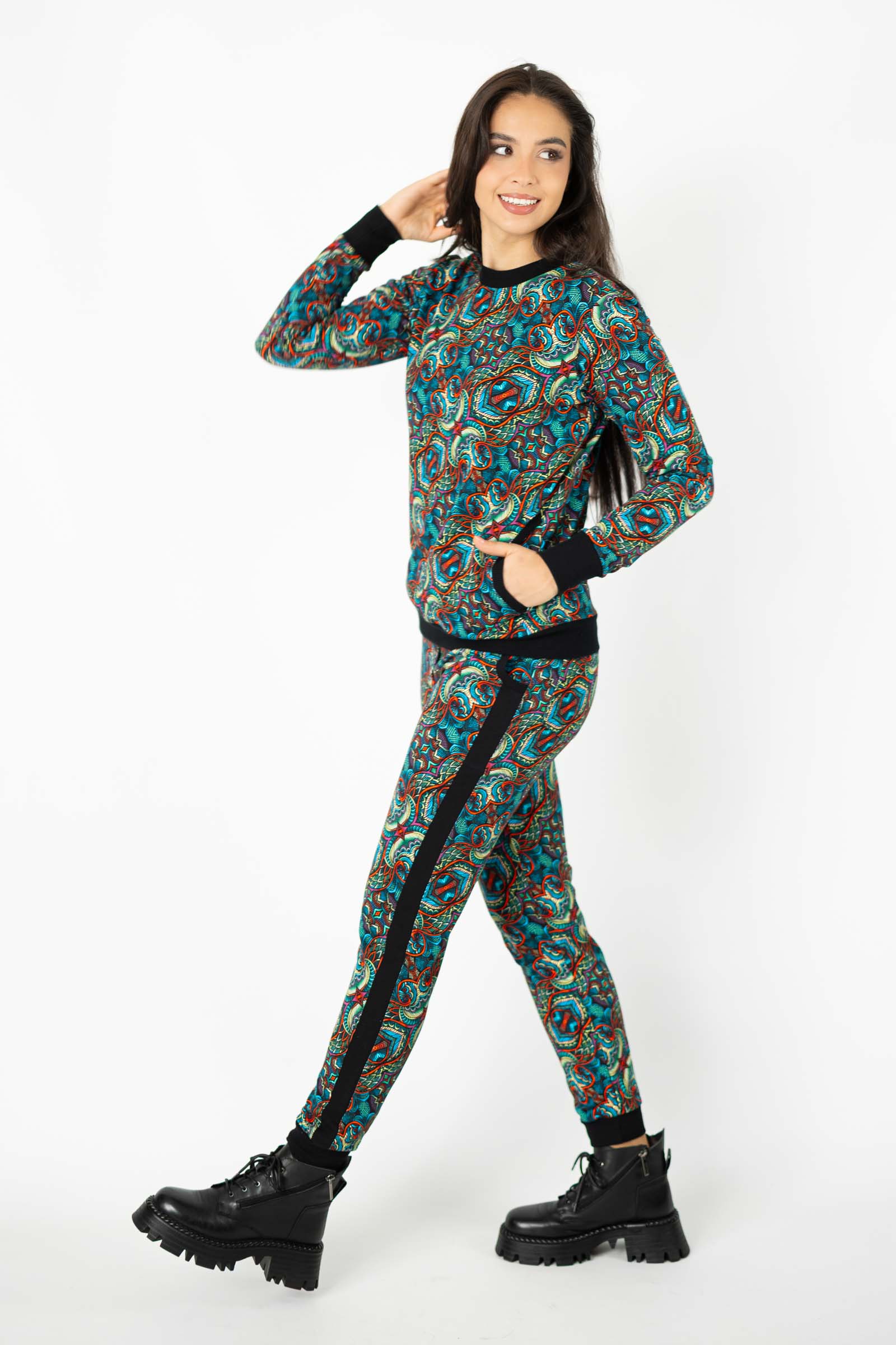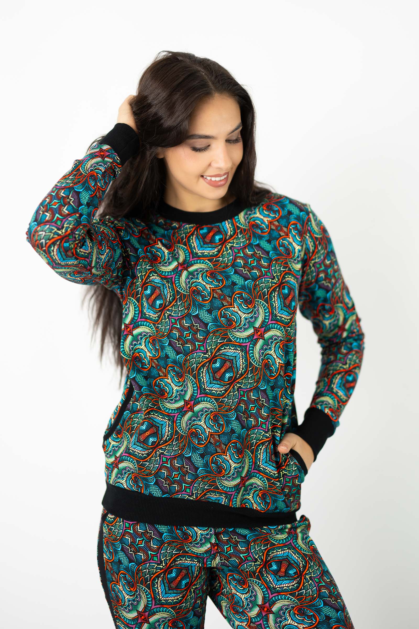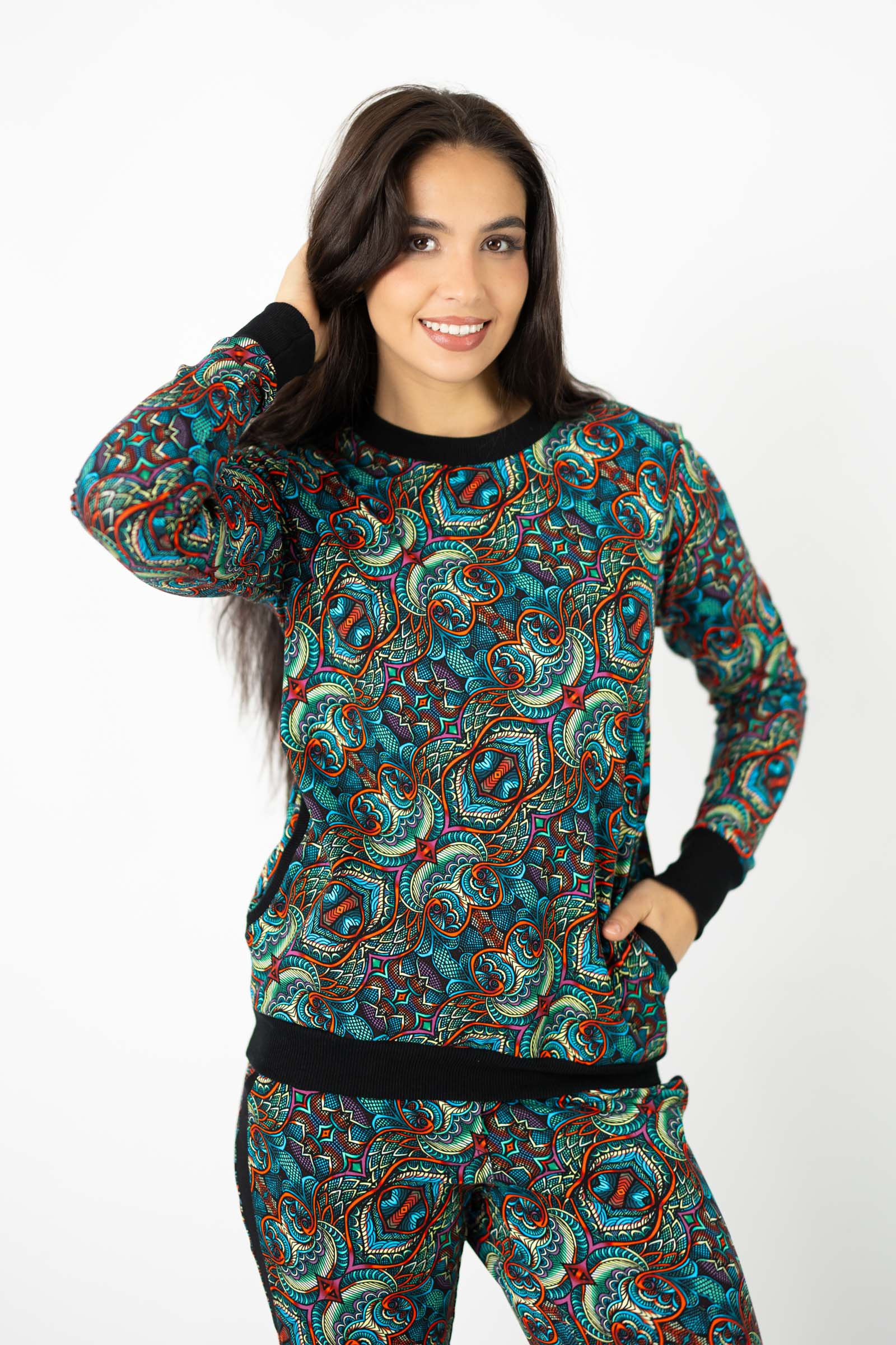 Ściągacze na rękawach, na dole oraz przy dekolcie doskonale komponują się z kolorowym autorskim wzorem, który zdobi tę bluzę. Ten wyjątkowy wzór został stworzony przez Katarzynę Gałaj, właścicielkę i twórczynię marki, co czyni tę bluzę jeszcze bardziej unikalną.
