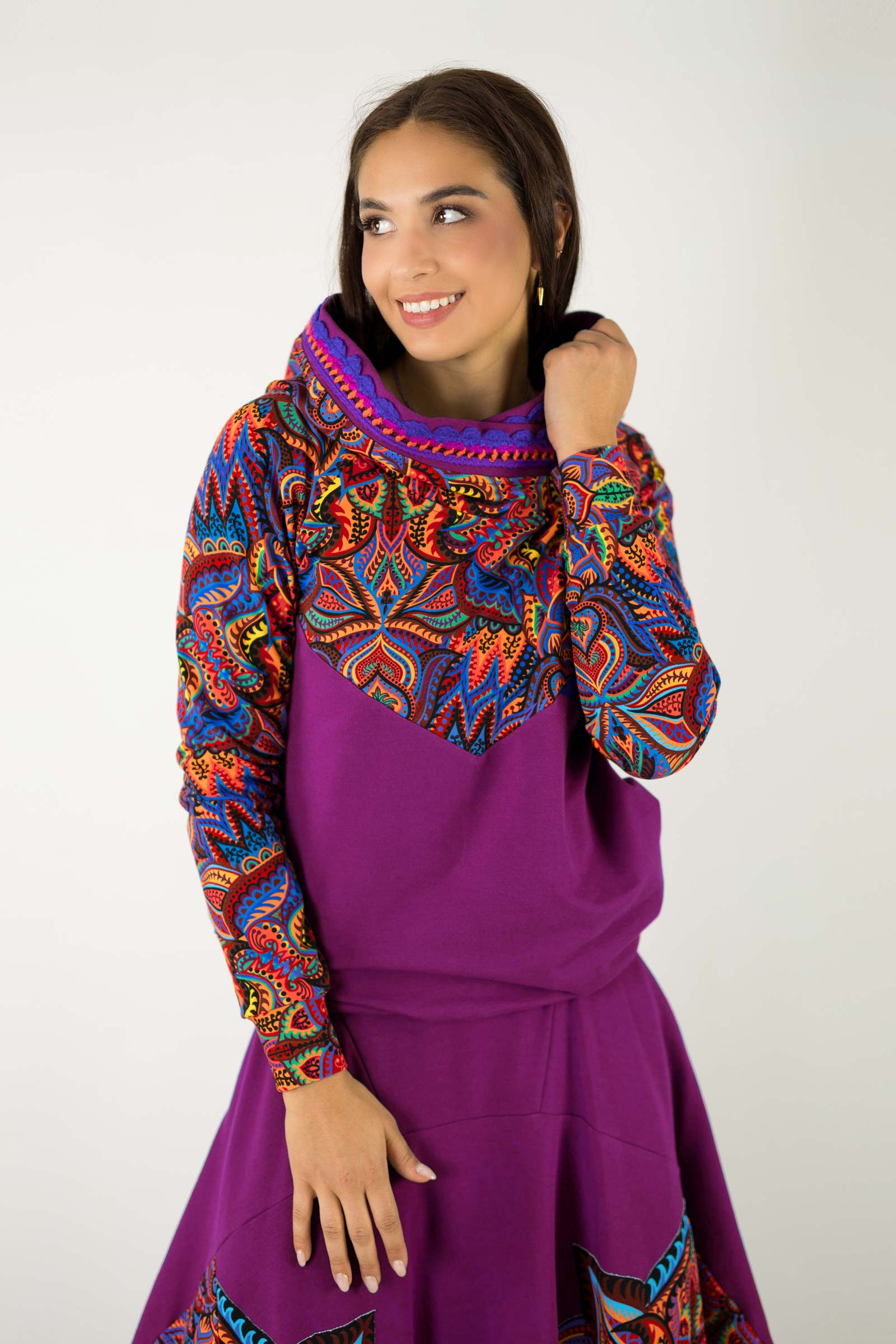 Warto podkreślić, że ta bluza została uszyta w naszej pracowni w Legionowie, co świadczy o polskiej jakości i dbałości o detale. Autorski wzór materiału został zaprojektowany przez właścicielkę i twórczynię marki Katarzynę Gałaj, co sprawia, że jest ona dostępna tylko u nas.
