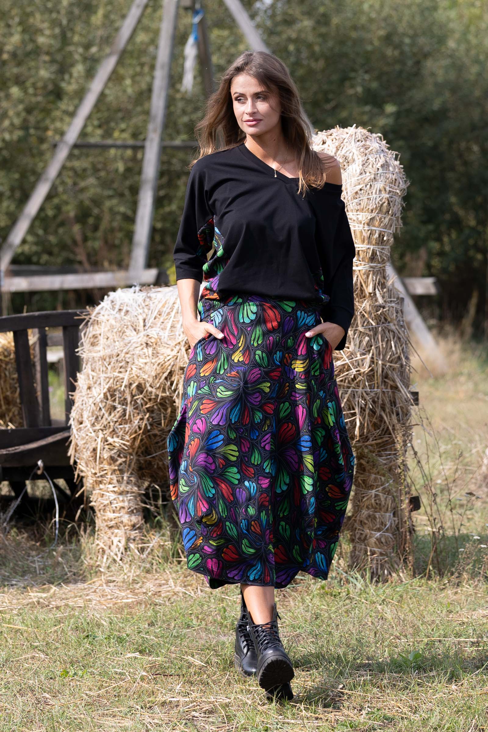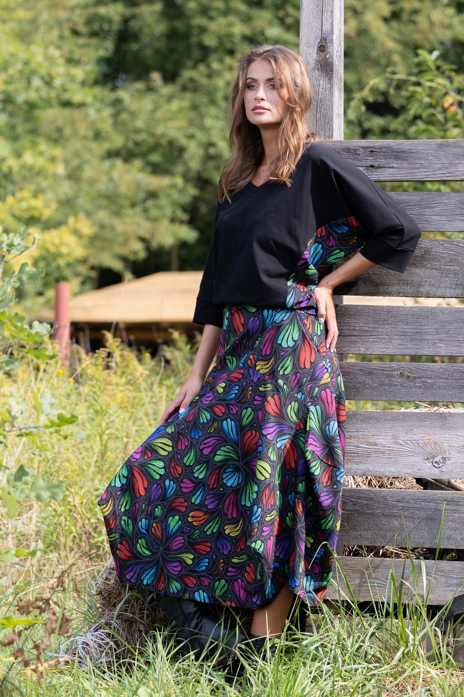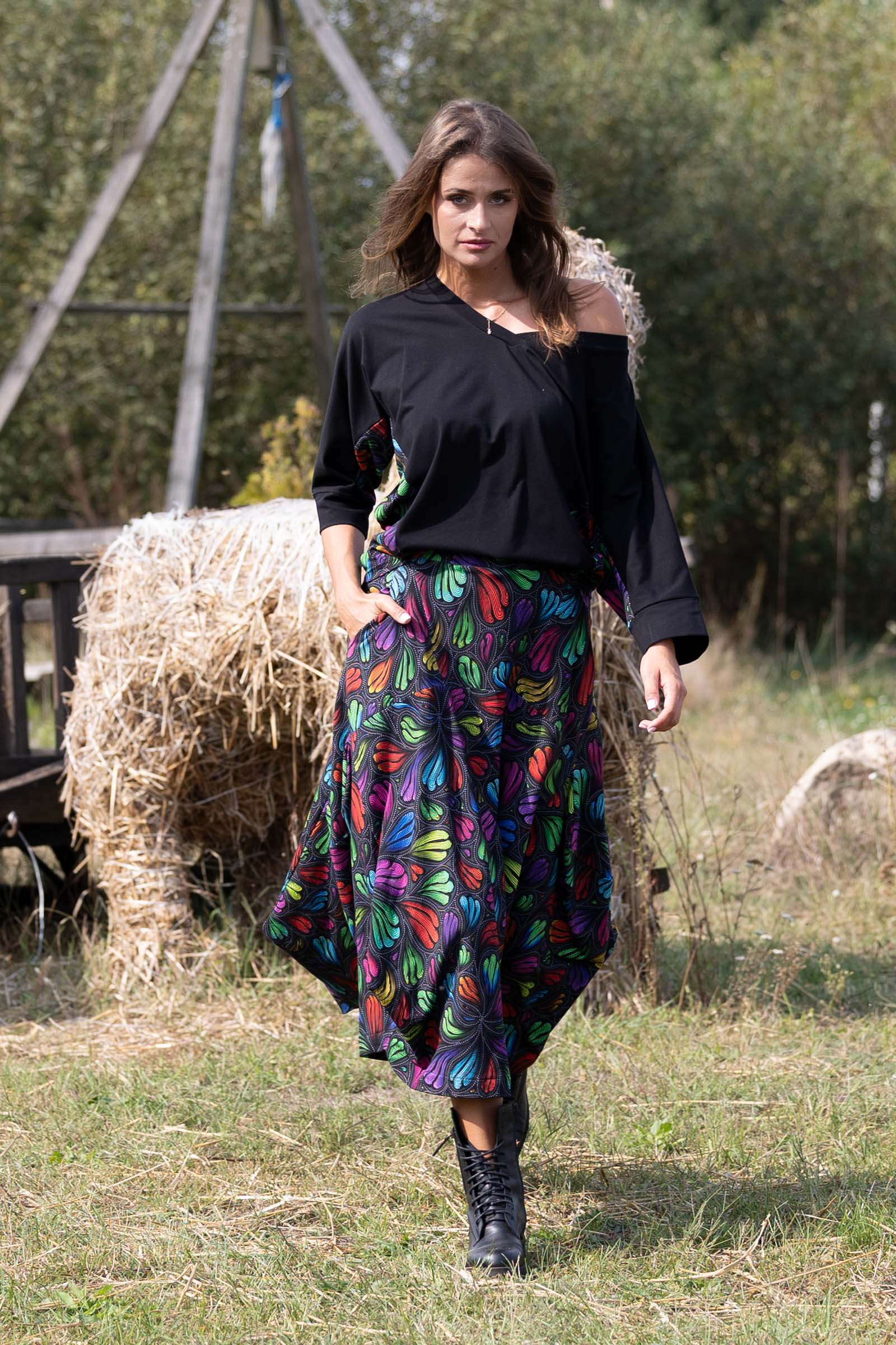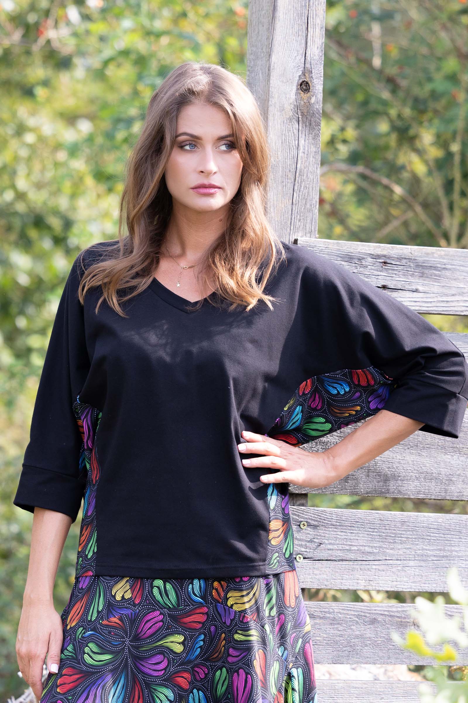 Oversizowa bluzka z kimonowymi rękawami to wyjątkowa propozycja dla osób ceniących styl i komfort. Luźny krój zapewnia swobodę noszenia, a rękawy zakończone mankietami dodają elegancji. Bluzka posiada dekolt w kształcie litery V. Unikalnym elementem są kolorowe wstawki po bokach, w autorskim wzorze zaprojektowanym przez Katarzynę Gałaj, właścicielkę i twórczynię marki. Uszyta z bawełnianej dzianiny. To idealne połączenie oryginalności i funkcjonalności, które doskonale sprawdzi się w codziennych stylizacjach.