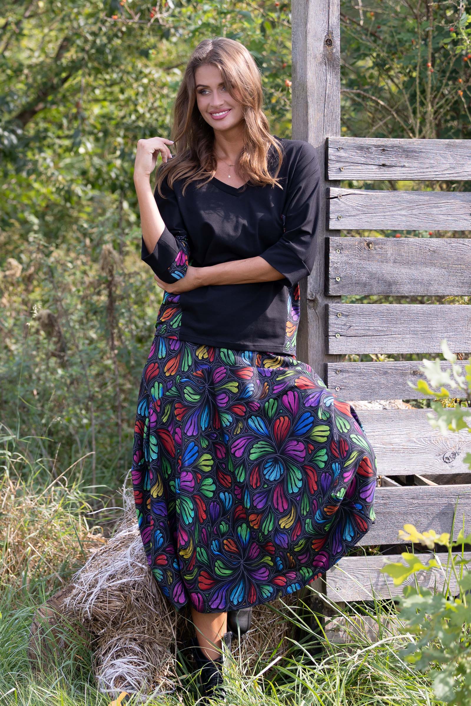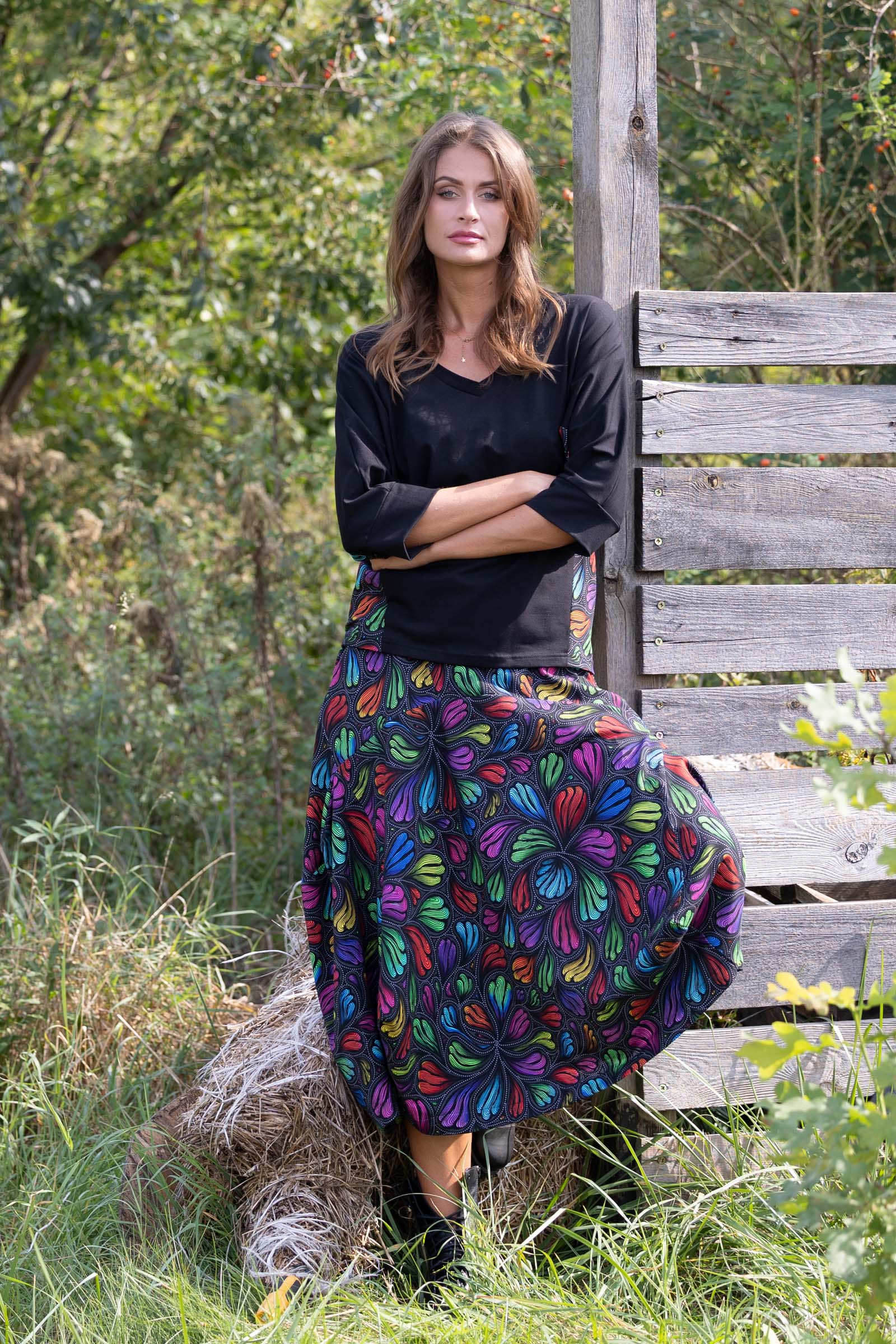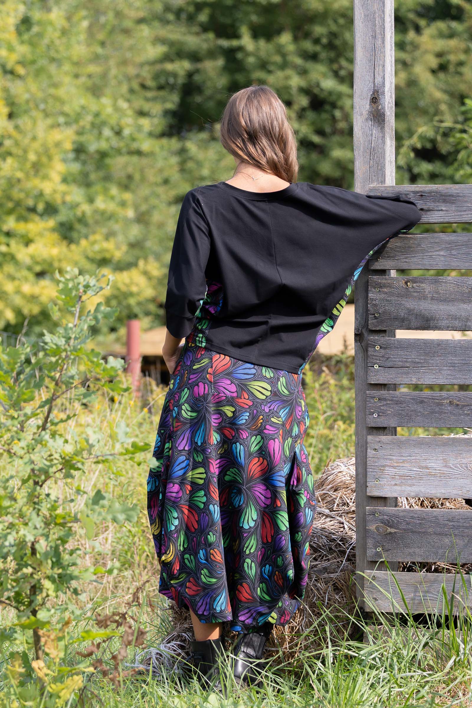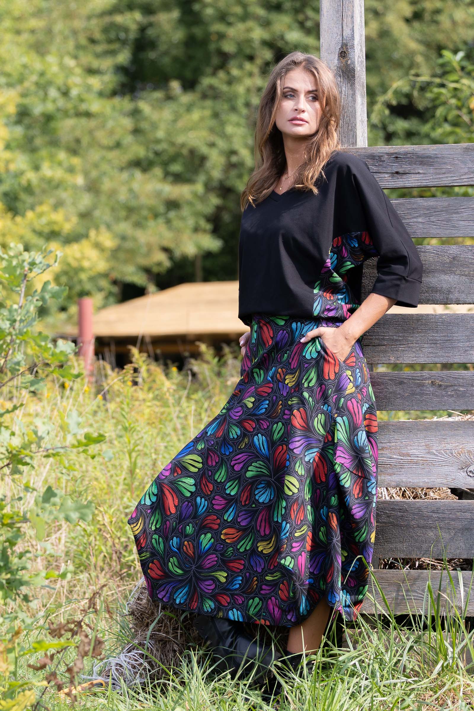 Oversizowa bluzka z kimonowymi rękawami to wyjątkowa propozycja dla osób ceniących styl i komfort. Luźny krój zapewnia swobodę noszenia, a rękawy zakończone mankietami dodają elegancji. Bluzka posiada dekolt w kształcie litery V. Unikalnym elementem są kolorowe wstawki po bokach, w autorskim wzorze zaprojektowanym przez Katarzynę Gałaj, właścicielkę i twórczynię marki. Uszyta z bawełnianej dzianiny. To idealne połączenie oryginalności i funkcjonalności, które doskonale sprawdzi się w codziennych stylizacjach.