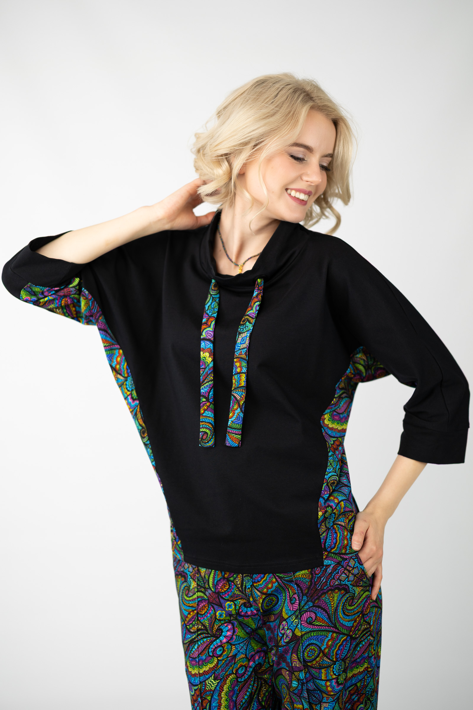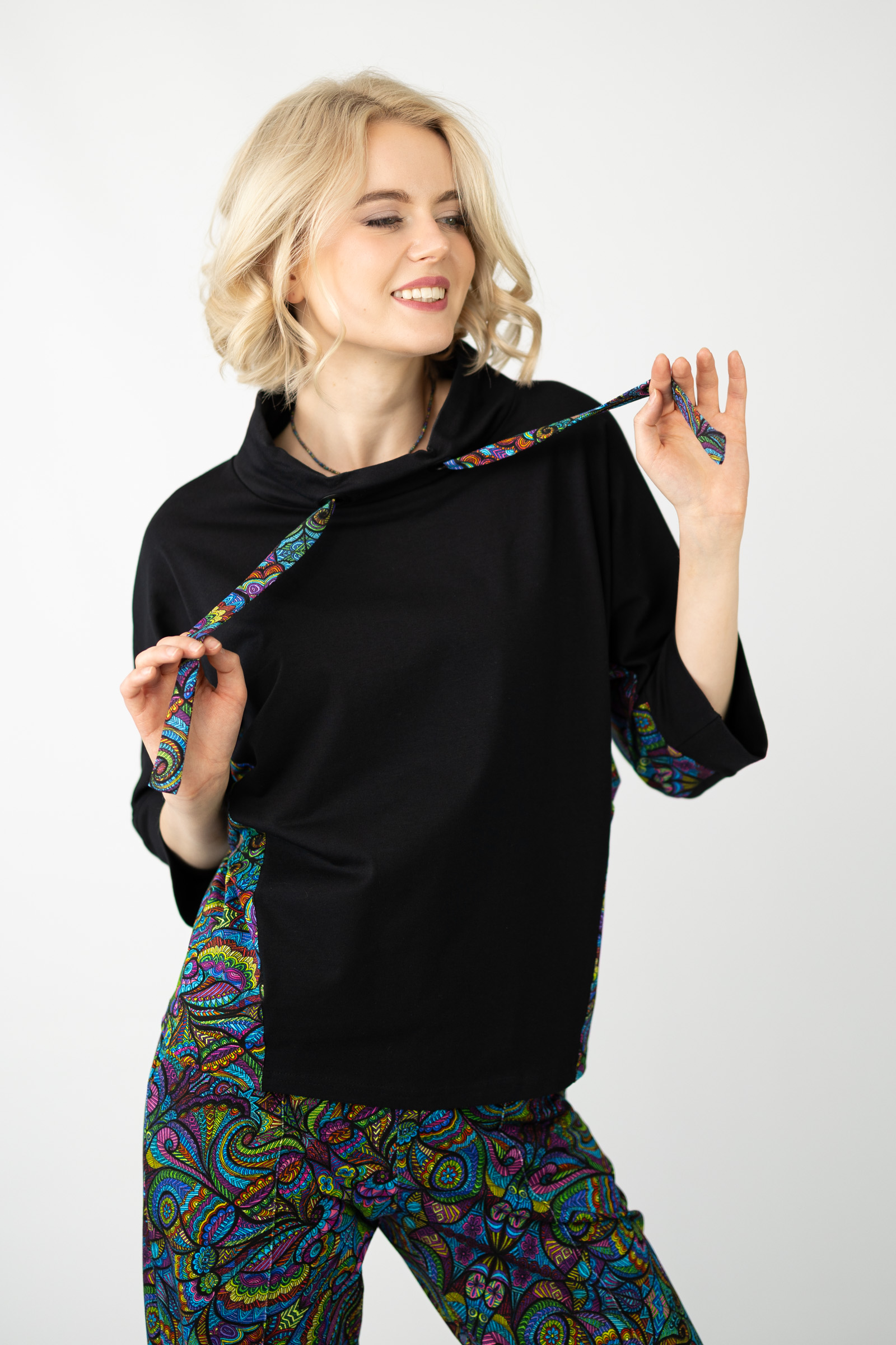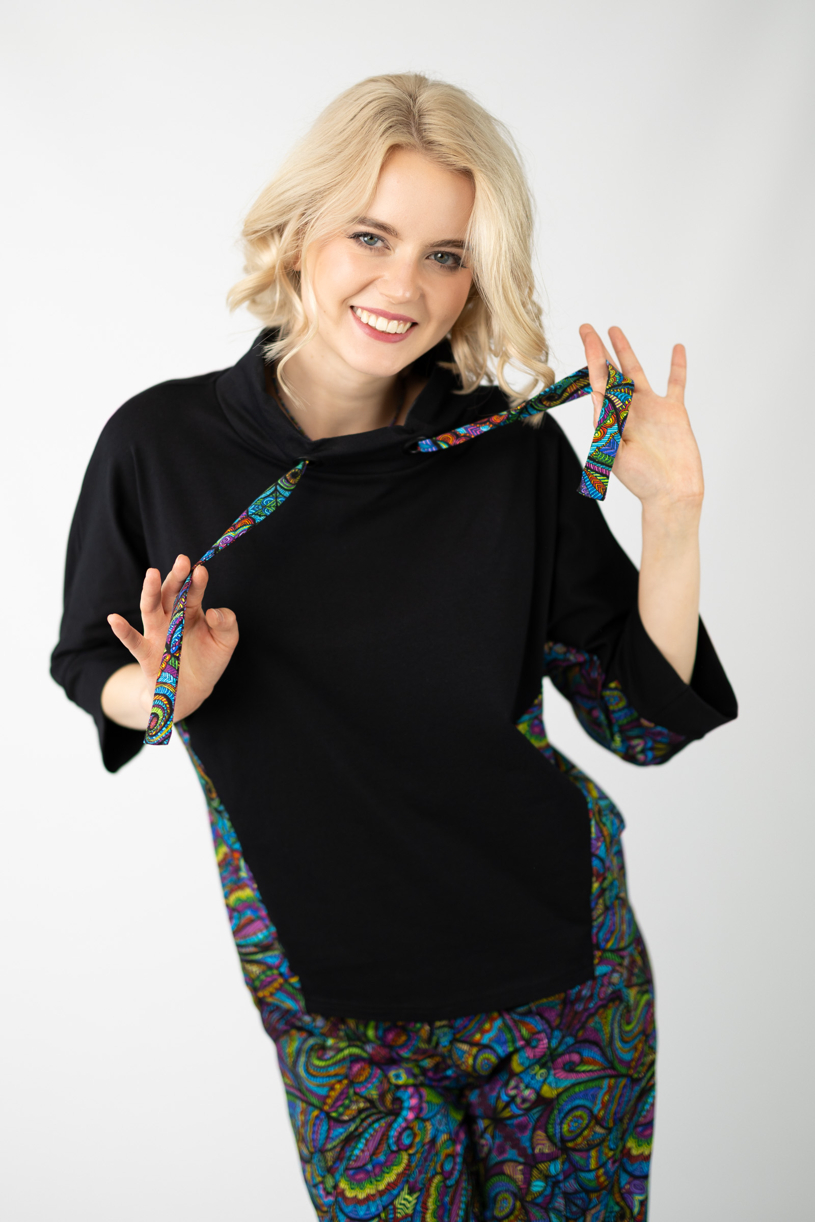 Wykonana z wysokiej jakości bawełnianej dzianiny, zapewnia komfort noszenia na co dzień. Rękawy zakończone mankietami oraz stójka z troczkami nadają jej sportowego charakteru, jednocześnie dbając o stylowy wygląd. Po bokach znajdują się kolorowe wstawki w autorskim wzorze, zaprojektowanym przez Katarzynę Gałaj, właścicielkę i twórczynię marki.