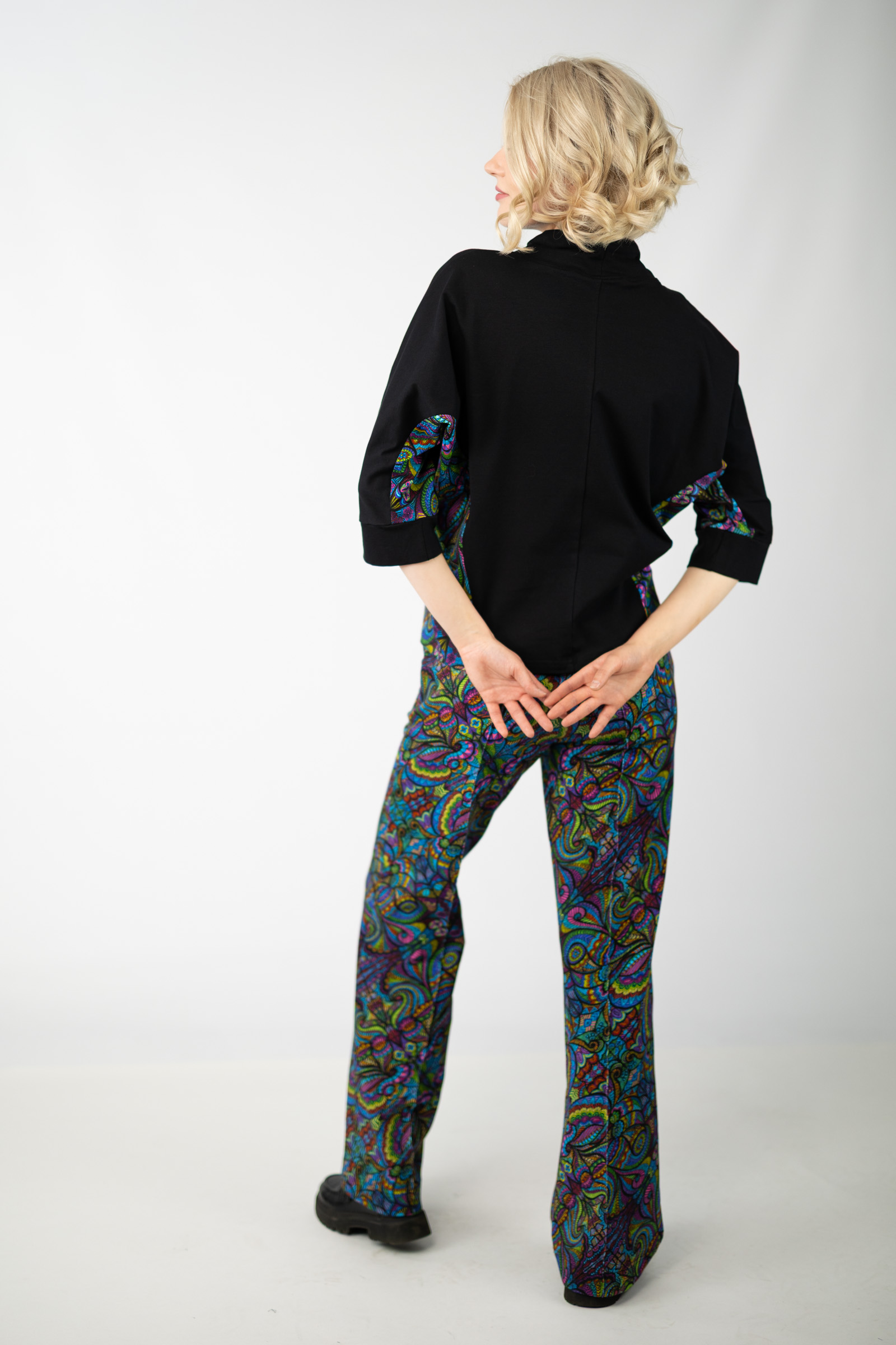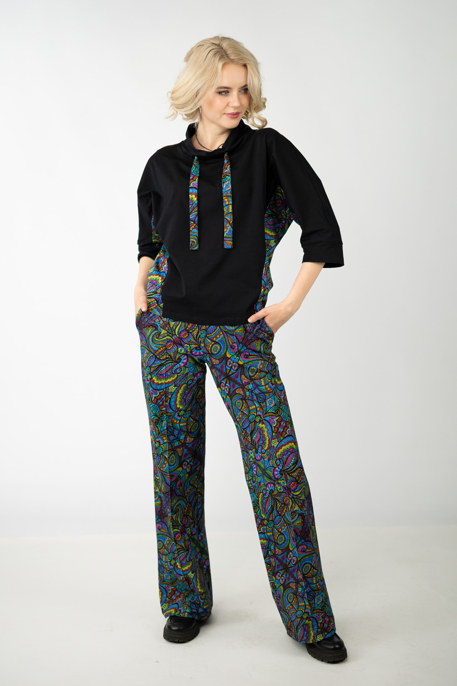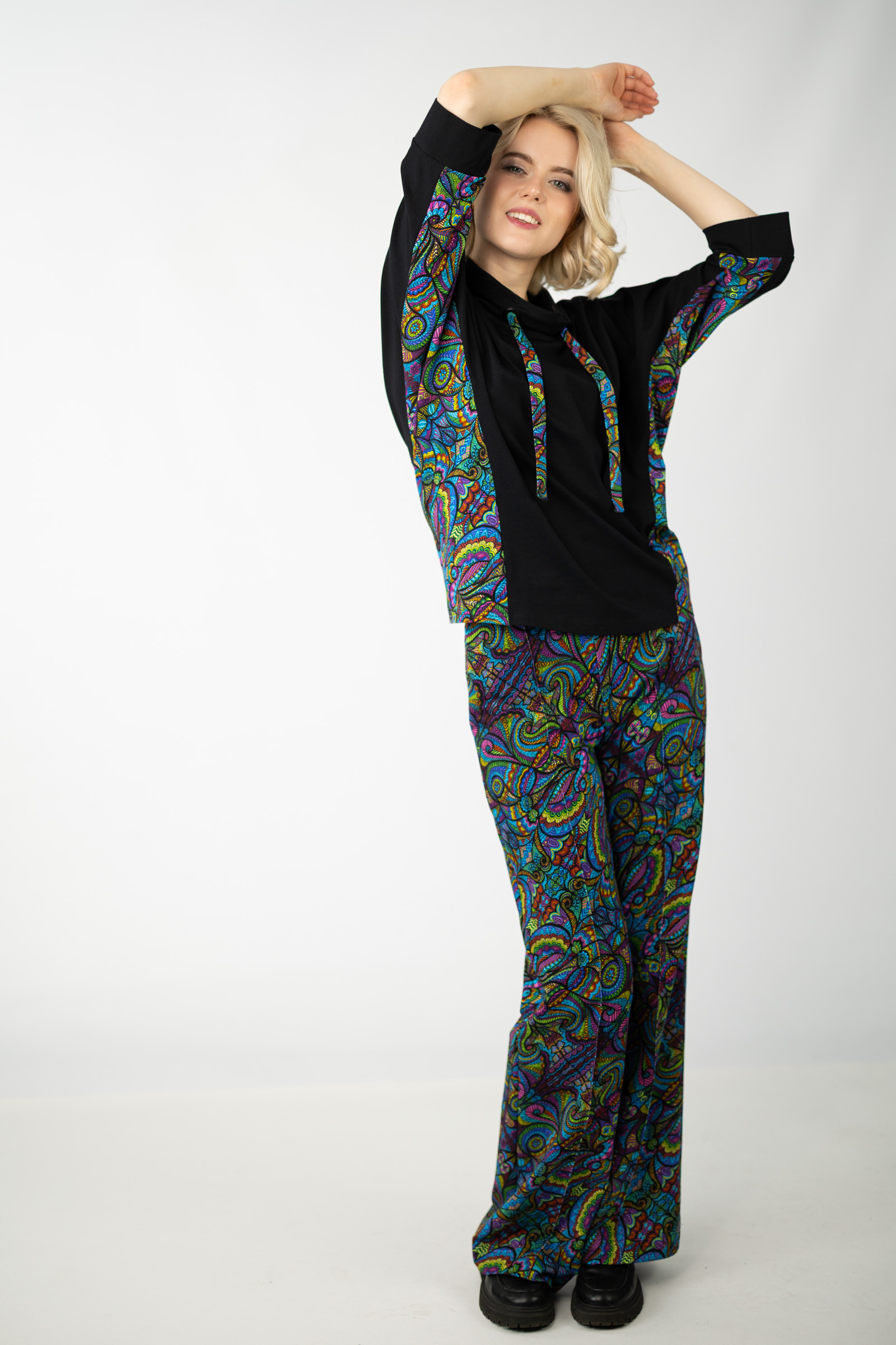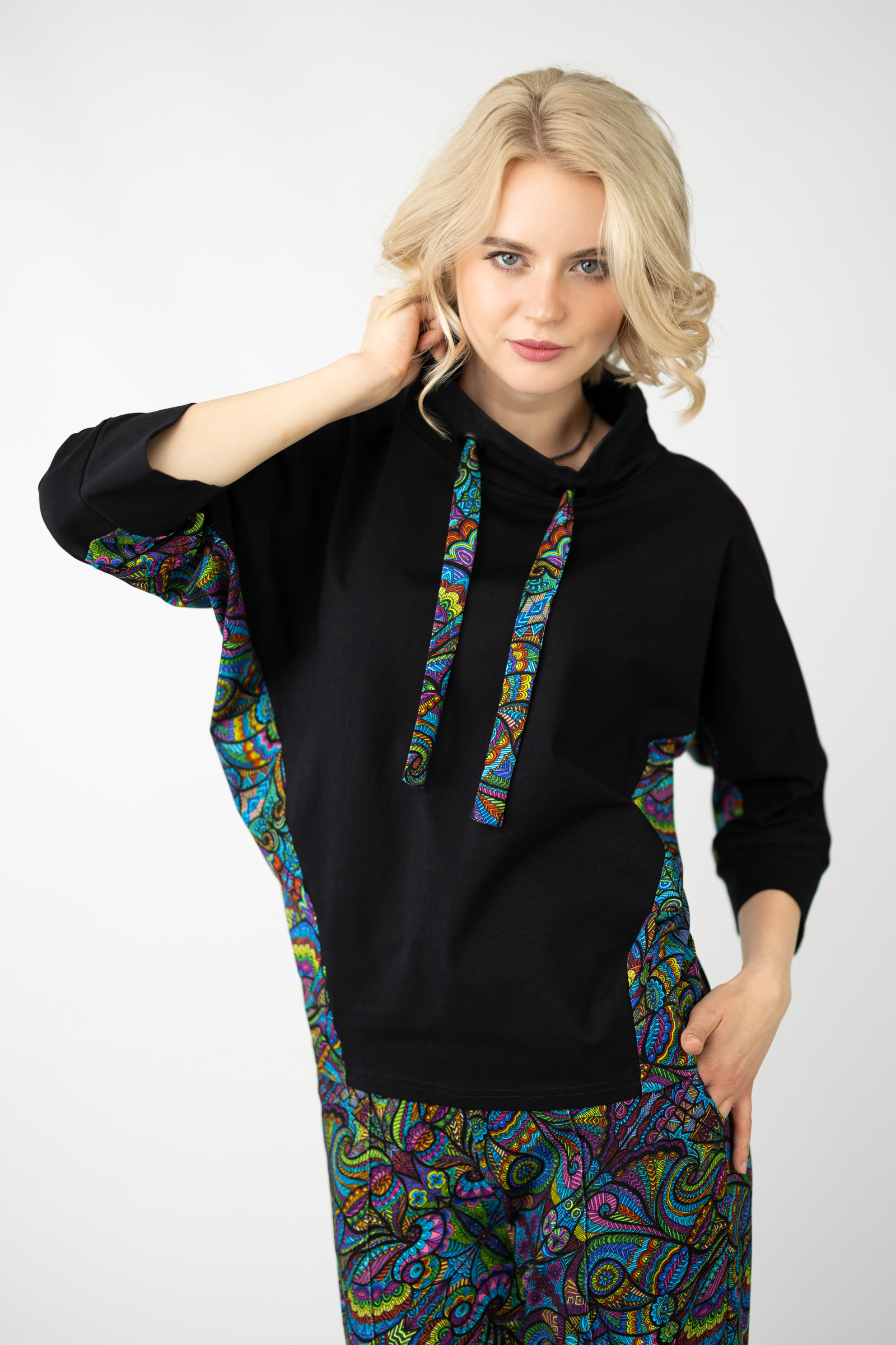 Wykonana z wysokiej jakości bawełnianej dzianiny, zapewnia komfort noszenia na co dzień. Rękawy zakończone mankietami oraz stójka z troczkami nadają jej sportowego charakteru, jednocześnie dbając o stylowy wygląd. Po bokach znajdują się kolorowe wstawki w autorskim wzorze, zaprojektowanym przez Katarzynę Gałaj, właścicielkę i twórczynię marki.