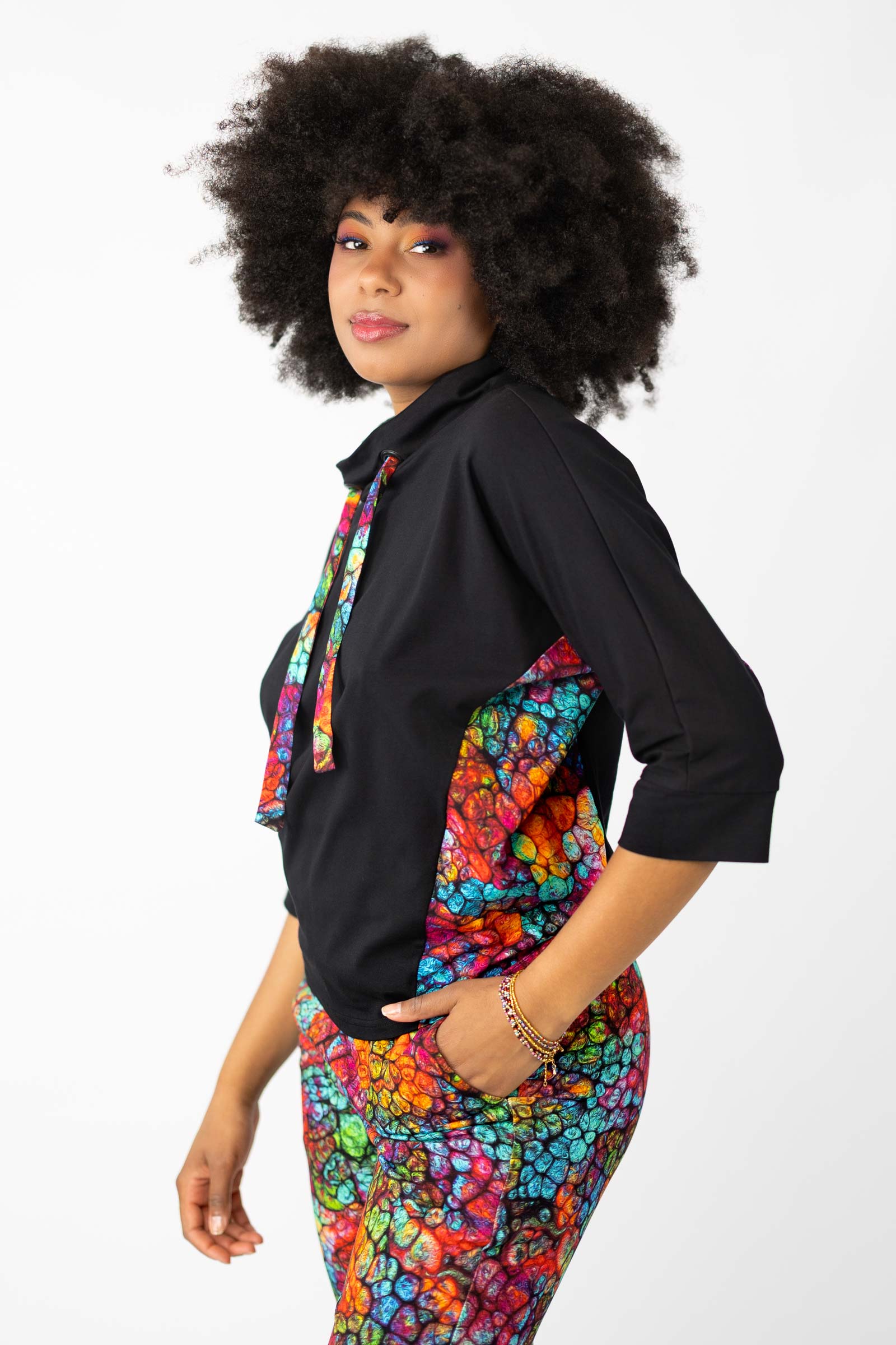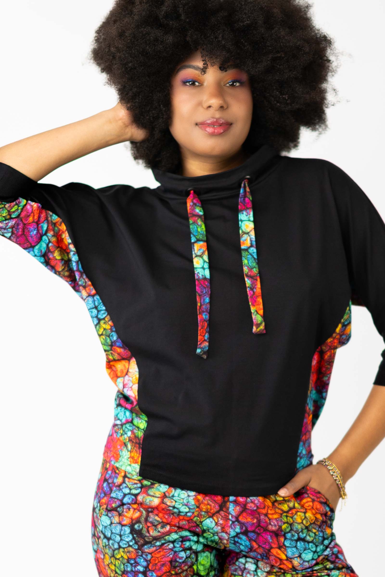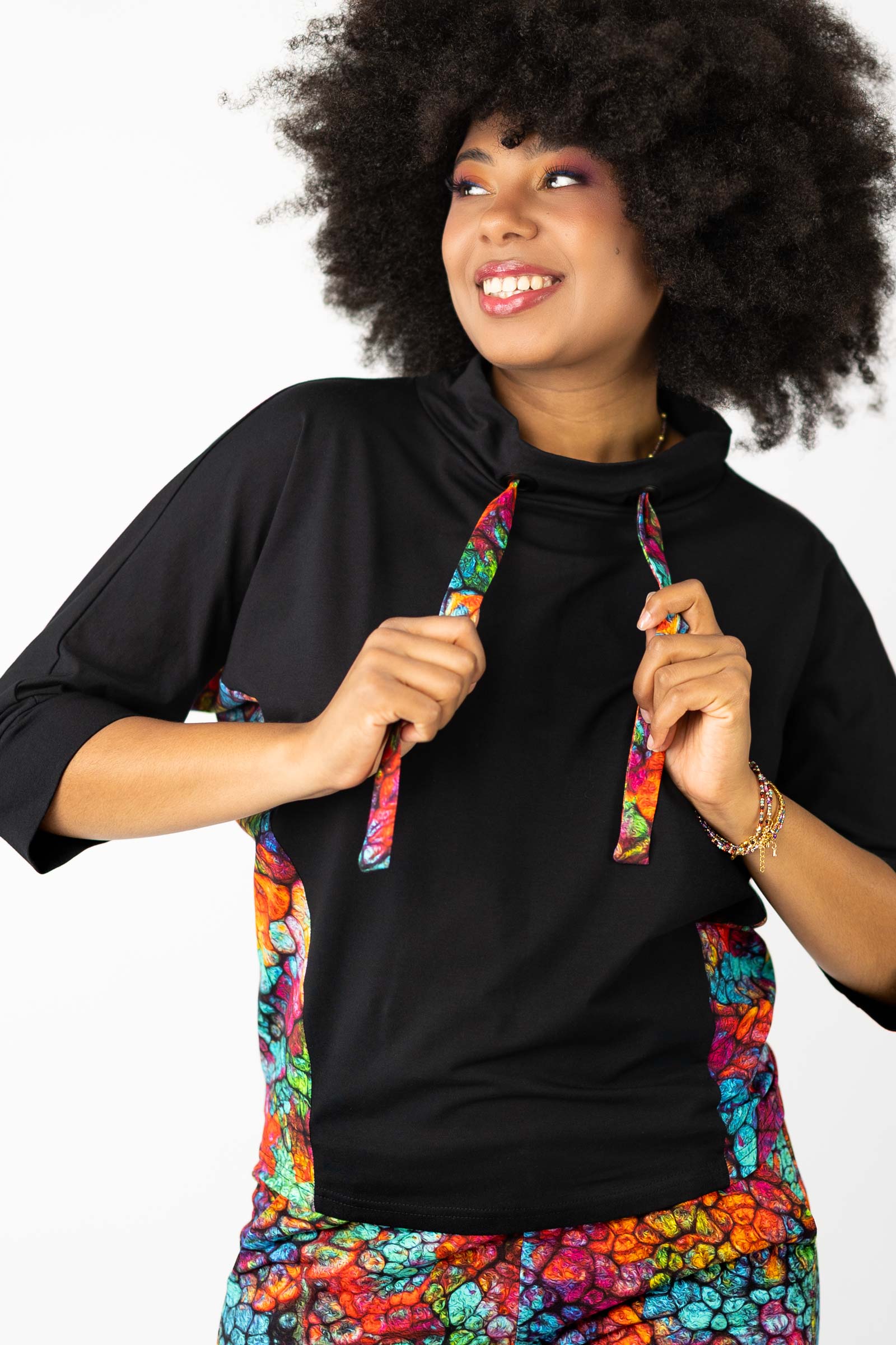 Wykonana z wysokiej jakości bawełnianej dzianiny, zapewnia komfort noszenia na co dzień. Rękawy zakończone mankietami oraz stójka z troczkami nadają jej sportowego charakteru, jednocześnie dbając o stylowy wygląd. Po bokach znajdują się kolorowe wstawki w autorskim wzorze, zaprojektowanym przez Katarzynę Gałaj, właścicielkę i twórczynię marki.