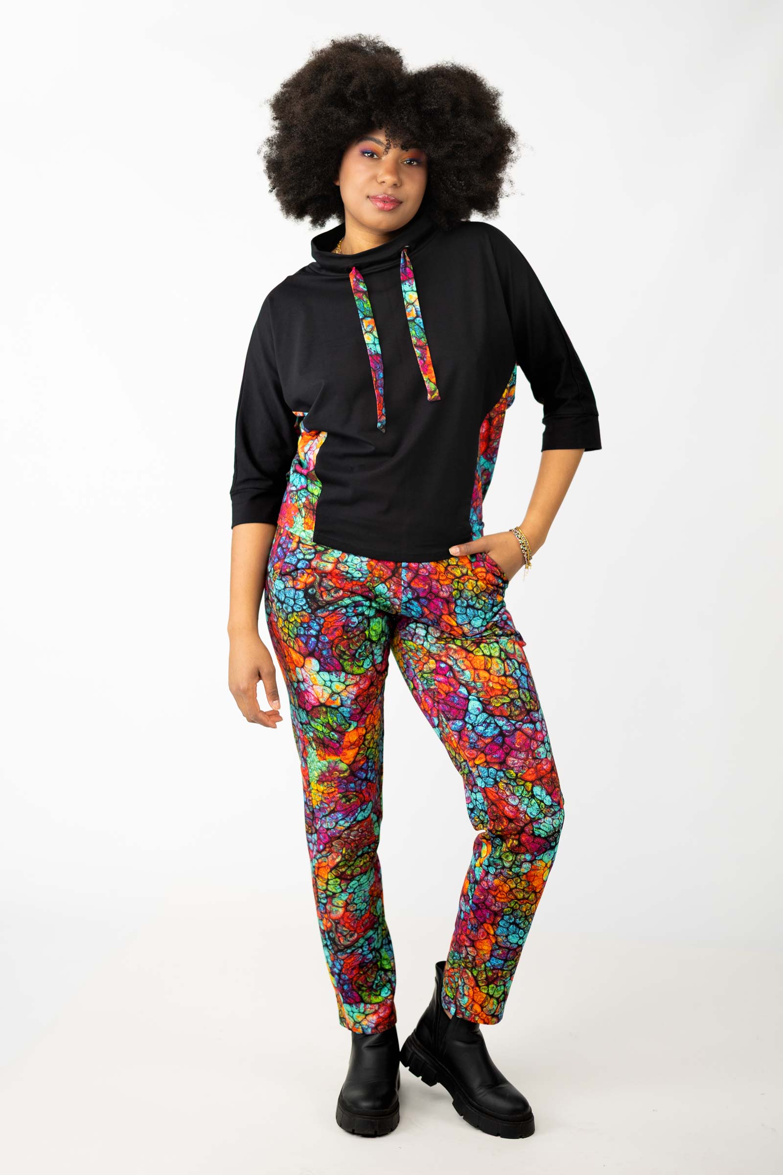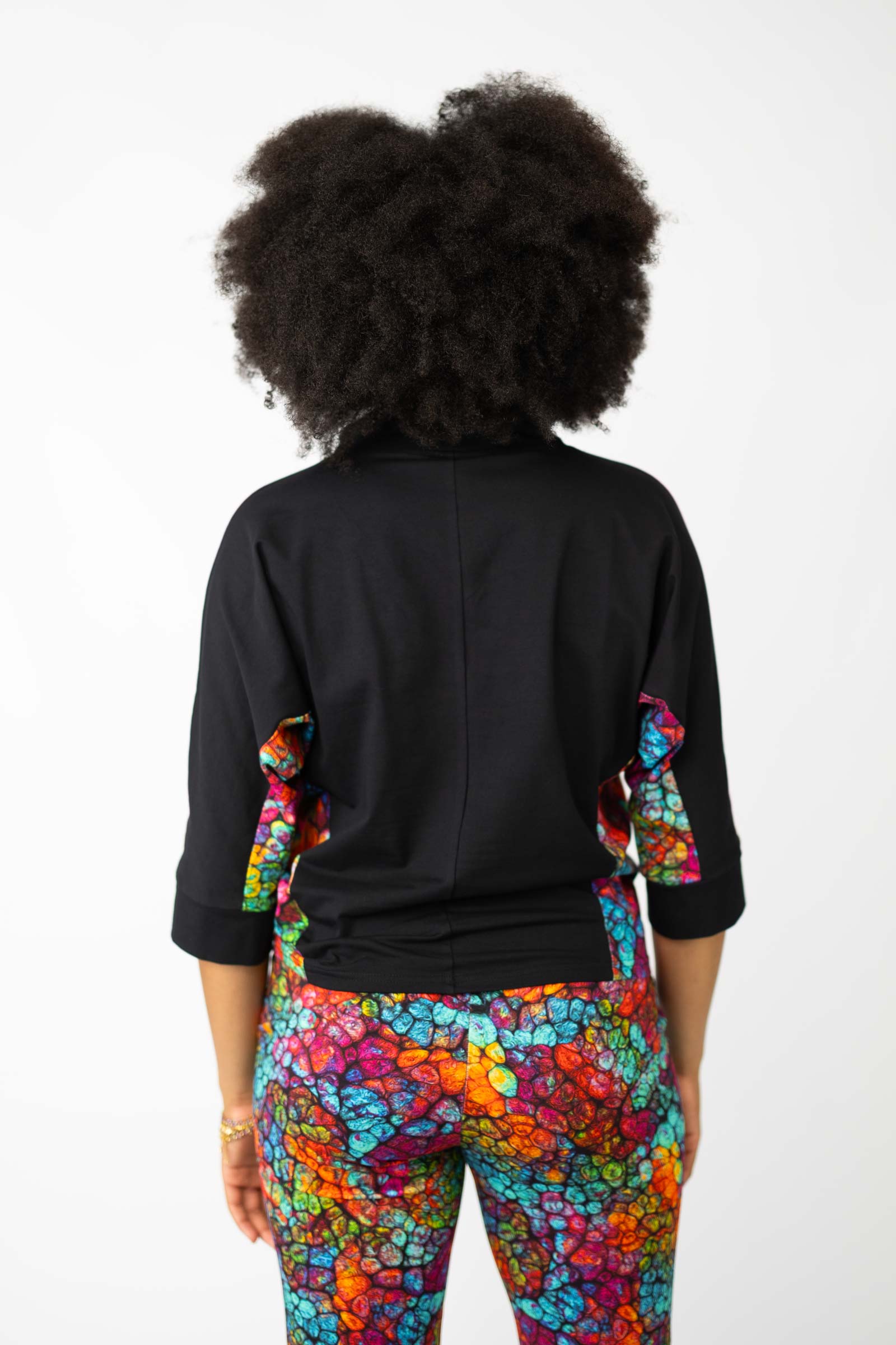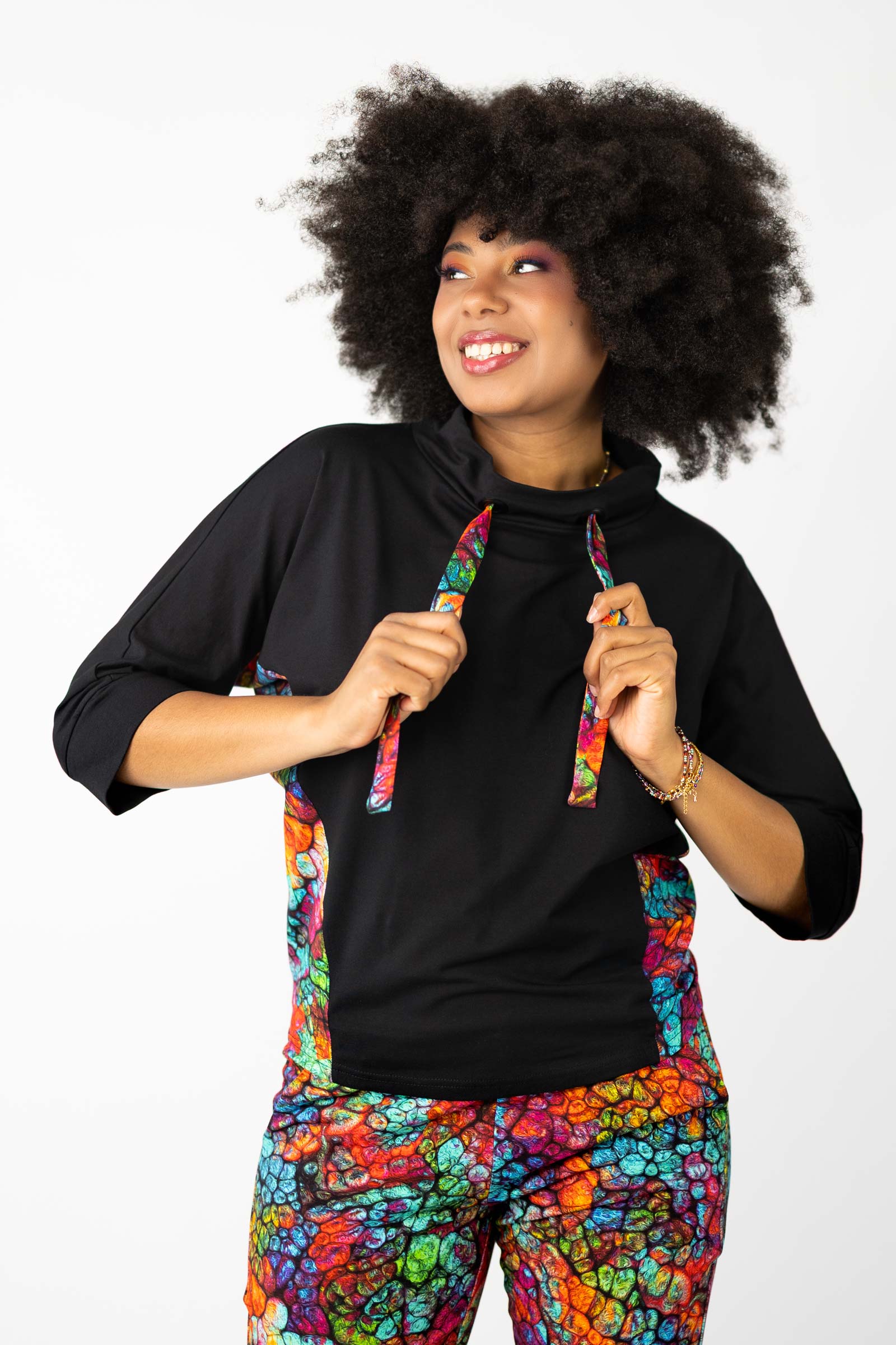 Wykonana z wysokiej jakości bawełnianej dzianiny, zapewnia komfort noszenia na co dzień. Rękawy zakończone mankietami oraz stójka z troczkami nadają jej sportowego charakteru, jednocześnie dbając o stylowy wygląd. Po bokach znajdują się kolorowe wstawki w autorskim wzorze, zaprojektowanym przez Katarzynę Gałaj, właścicielkę i twórczynię marki.