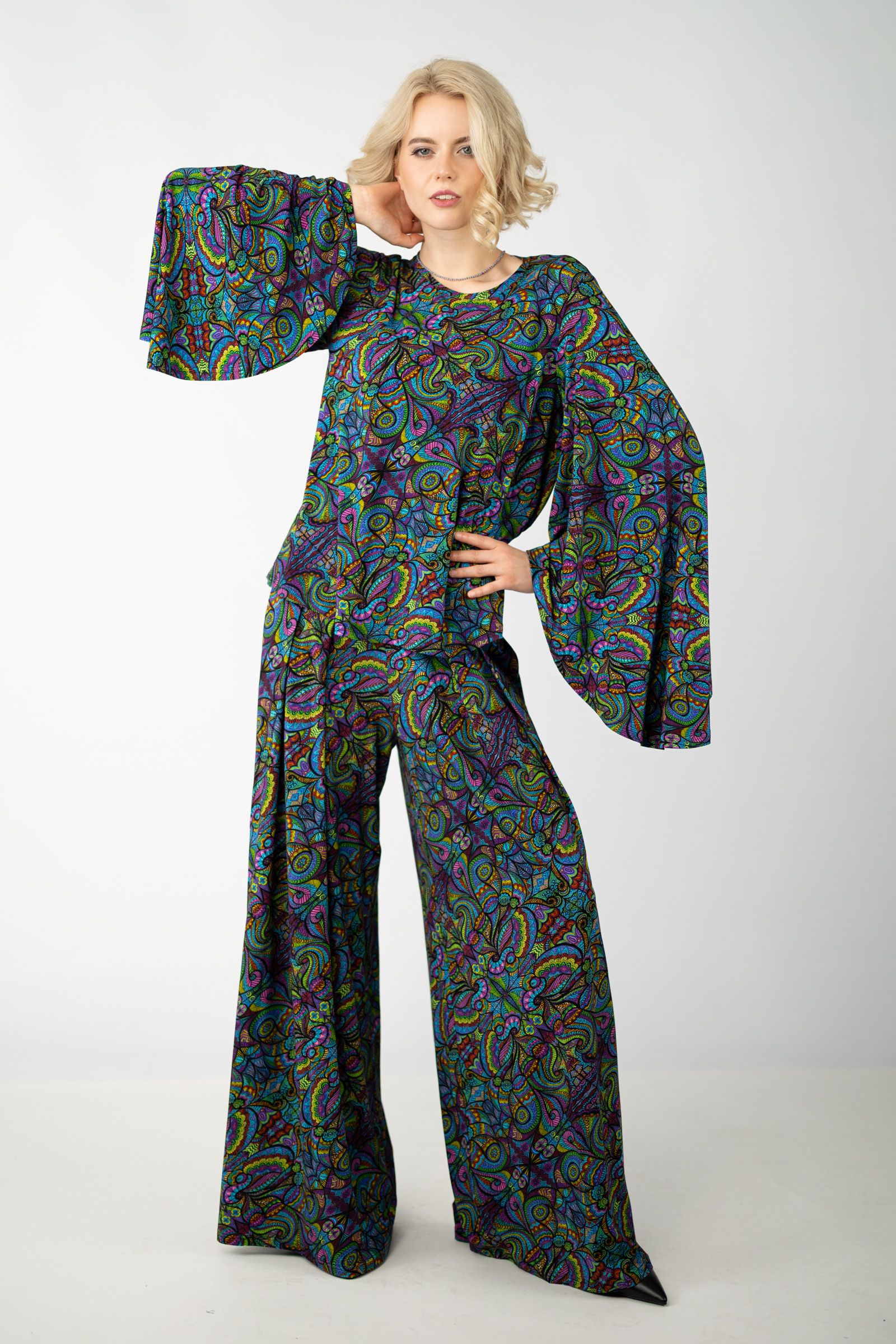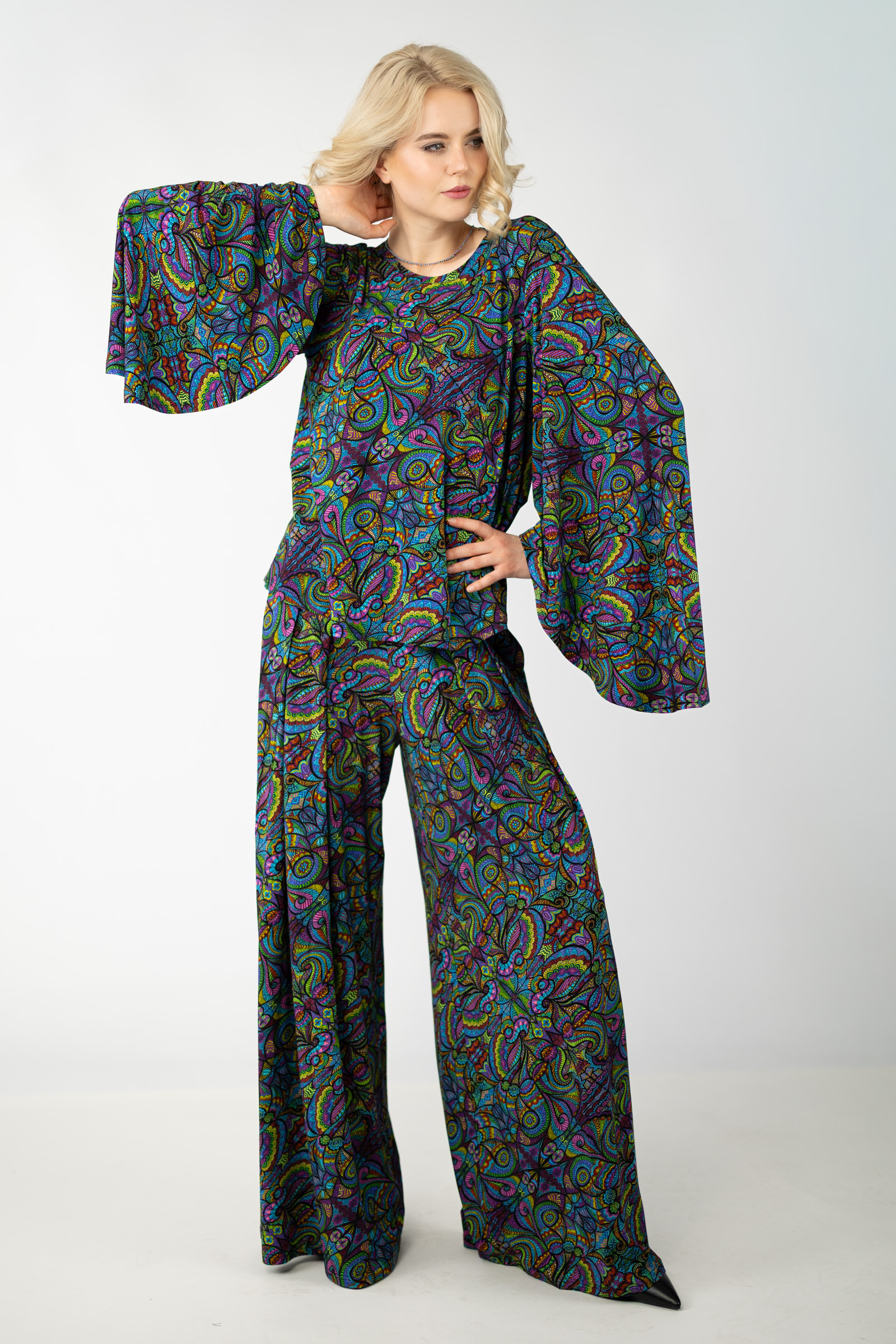 Szerokie, rozkloszowane rękawy tworzą spektakularną linię i dodają całości artystycznego charakteru. Autorski, nasycony wzór w intensywnych kolorach przyciąga wzrok i sprawia, że każda stylizacja staje się niepowtarzalna.