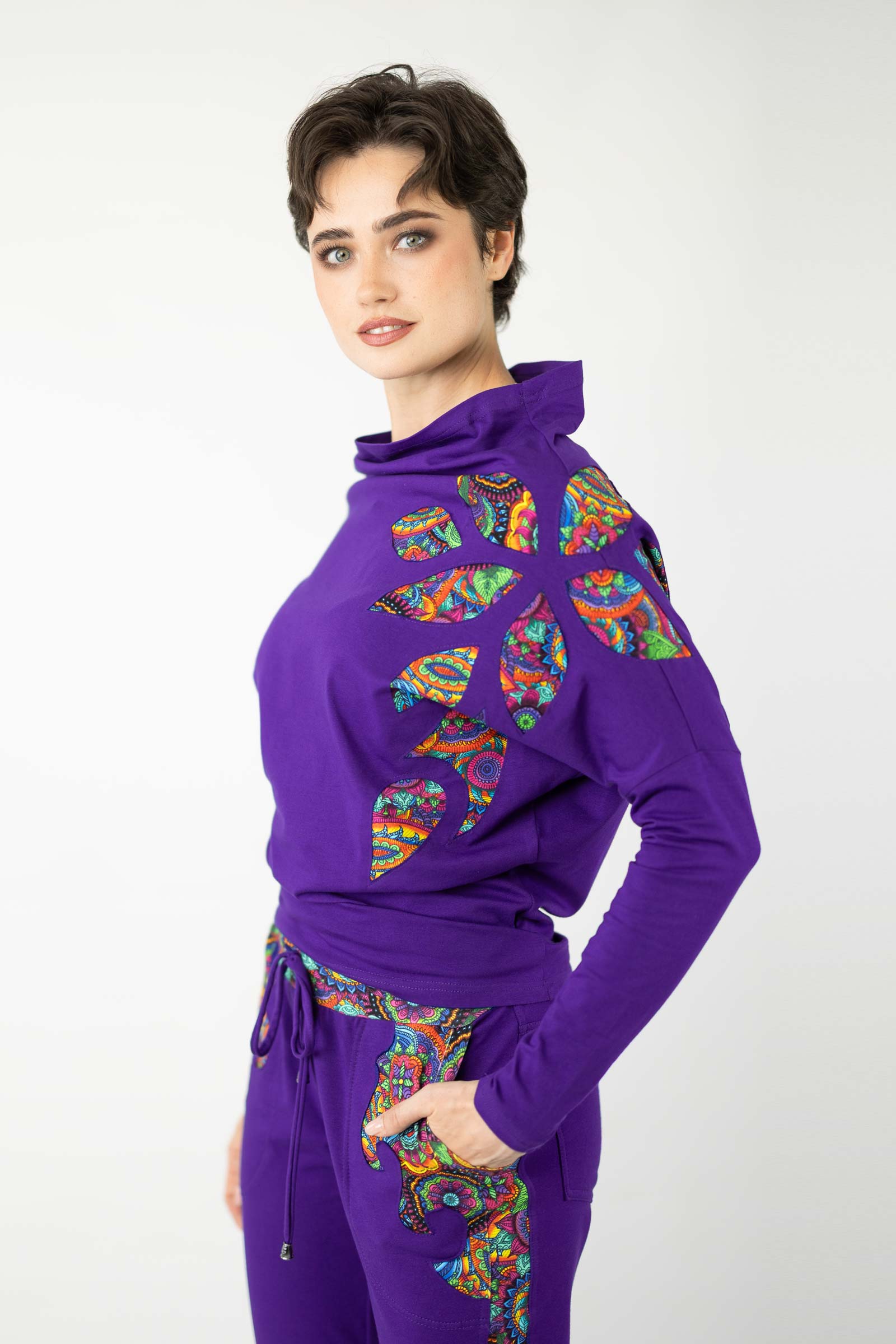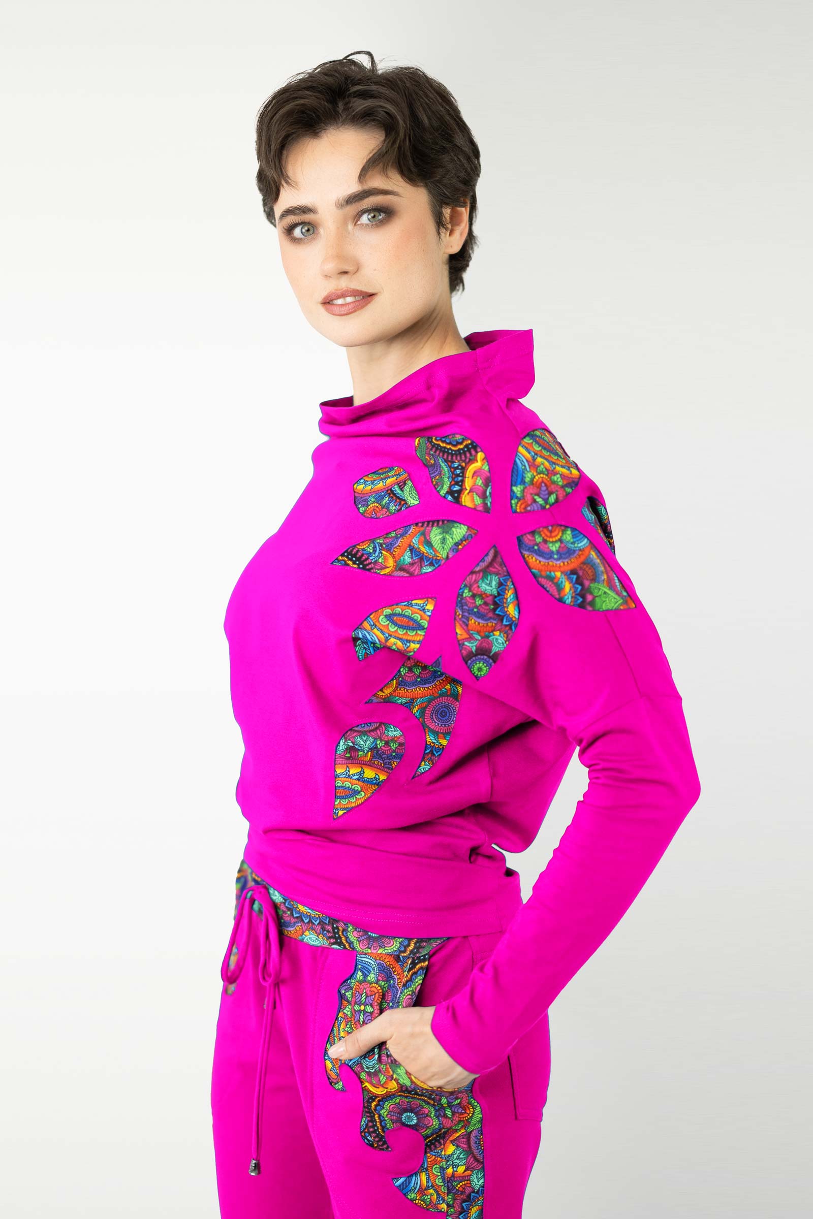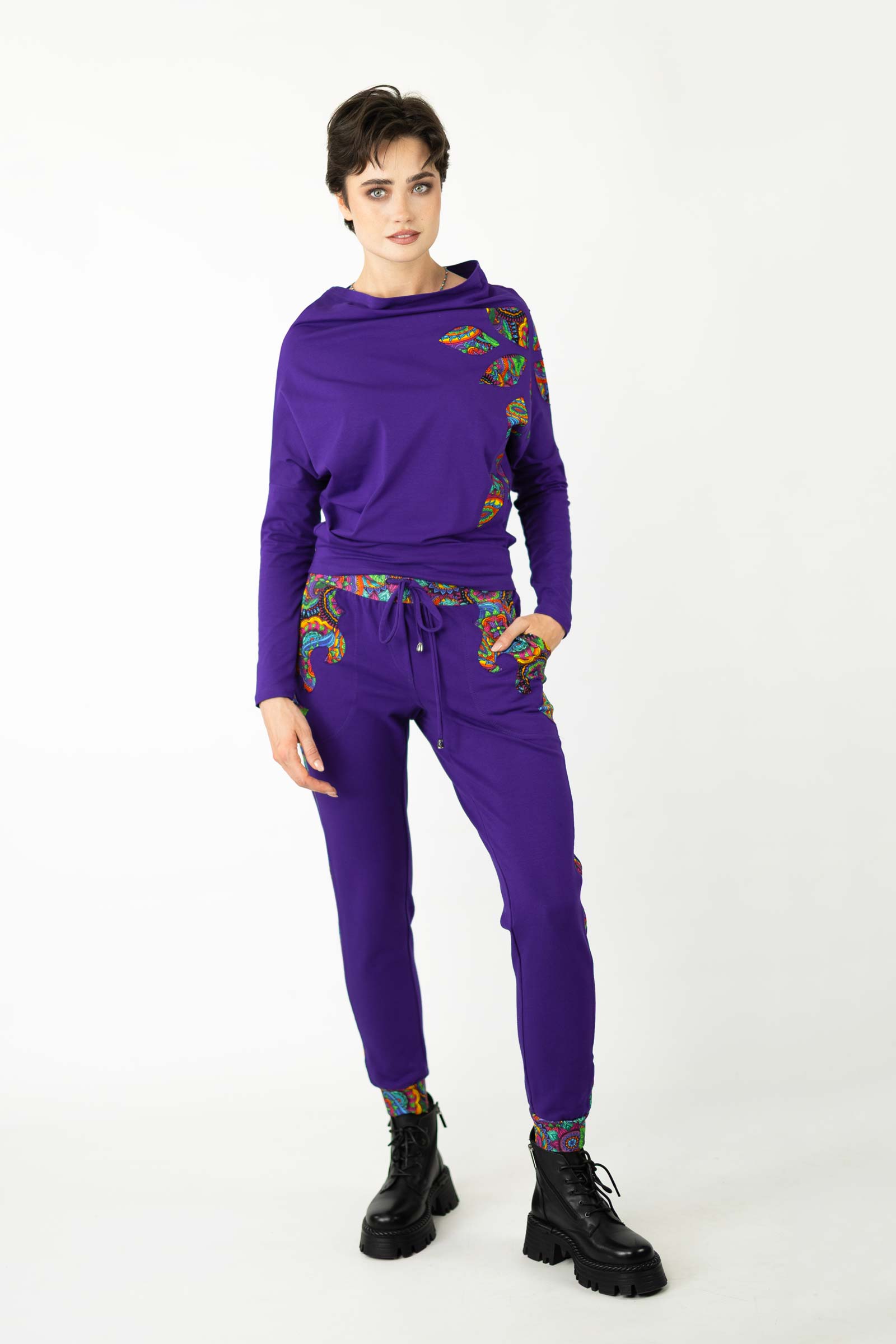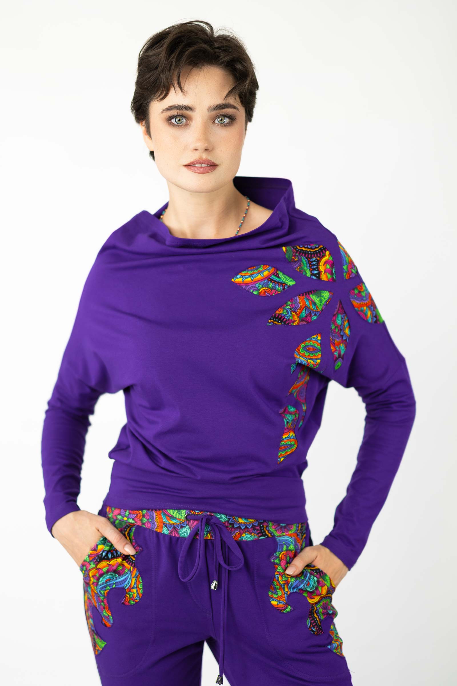Bluzka została uszyta w naszej pracowni w Legionowie z miękkiej, elastycznej dzianiny bawełnianej – oddychającej, komfortowej i przyjemnej w dotyku. To propozycja dla kobiet, które cenią kreatywne podejście do mody, wygodę i wyjątkowe, ręcznie wykonane detale.
