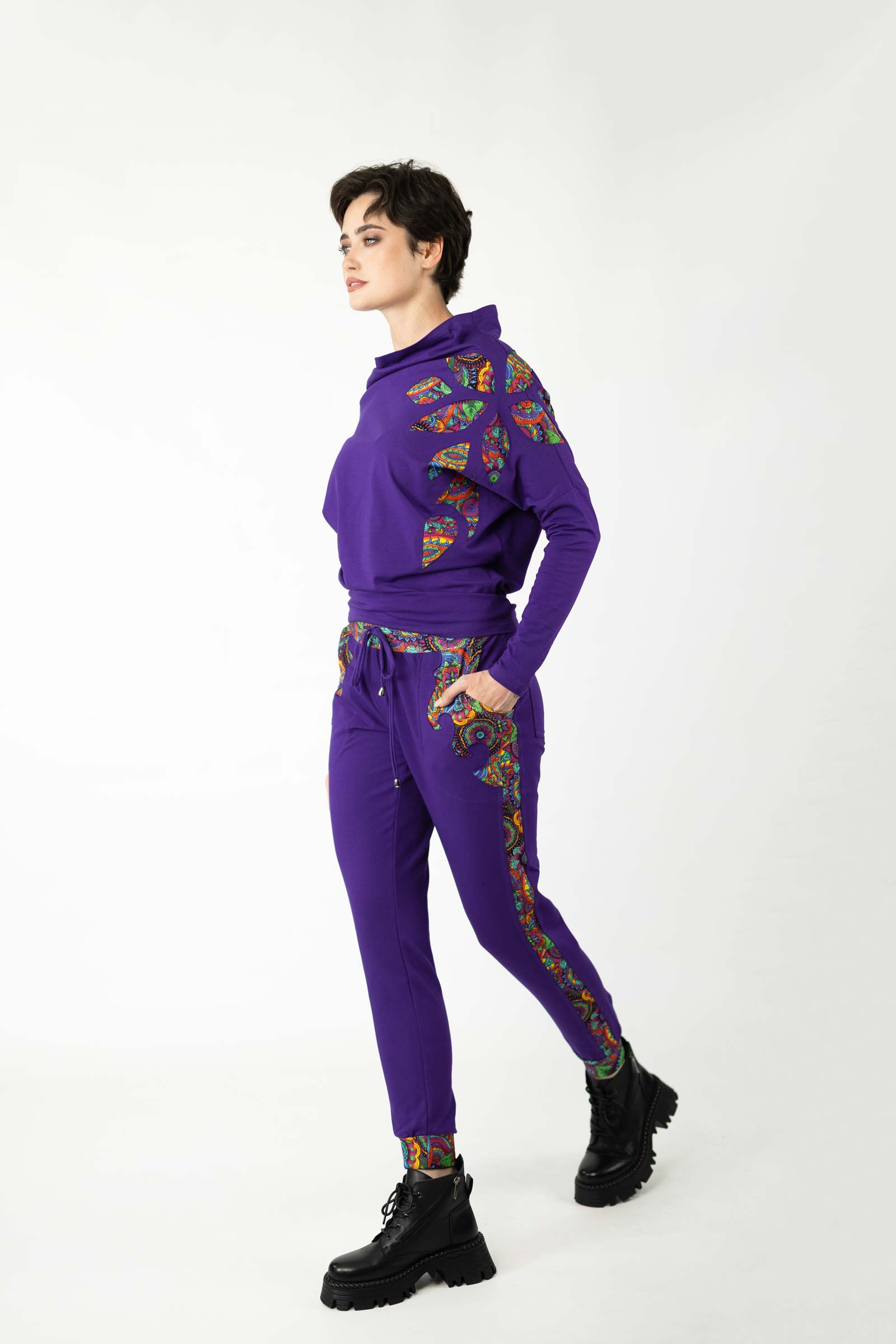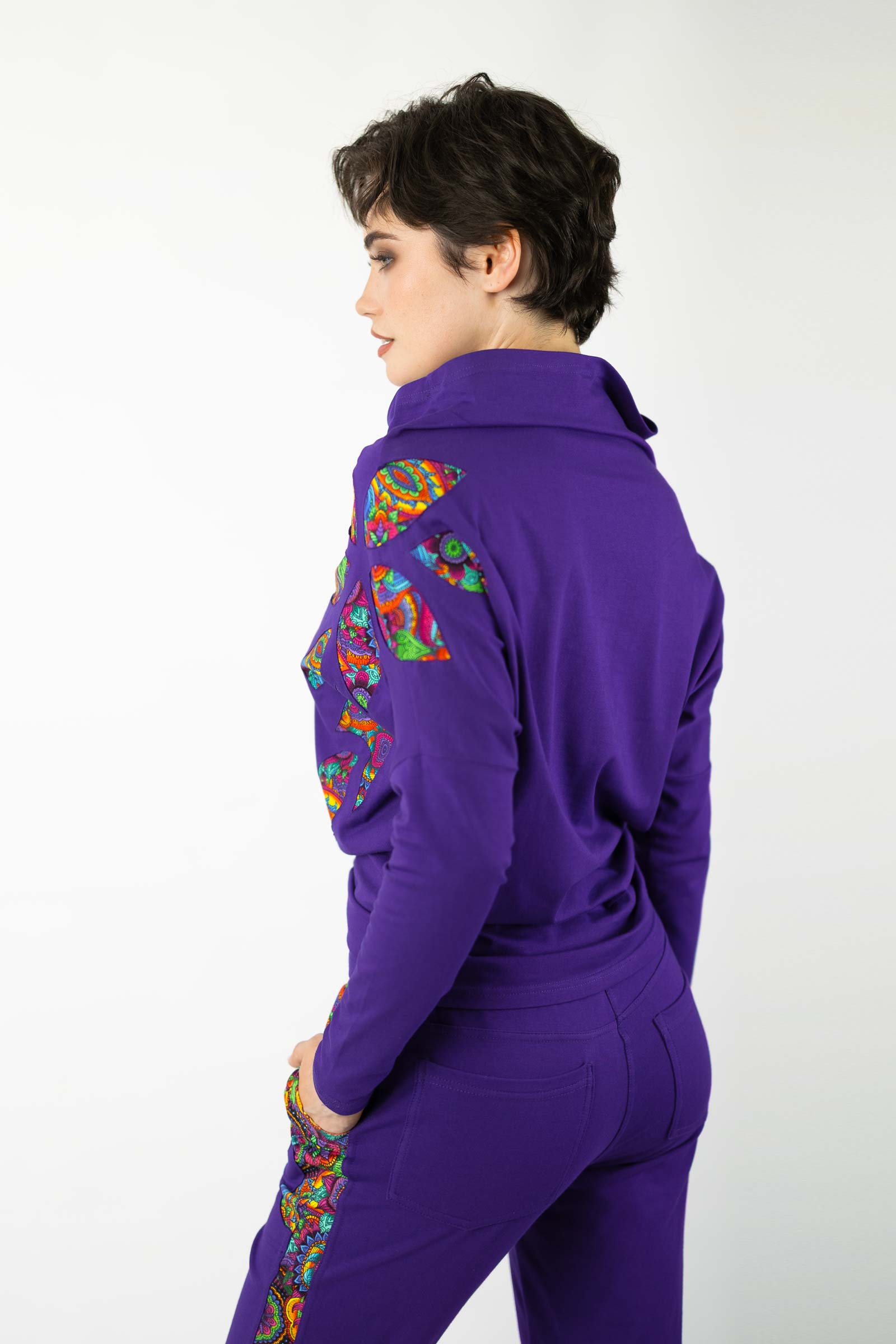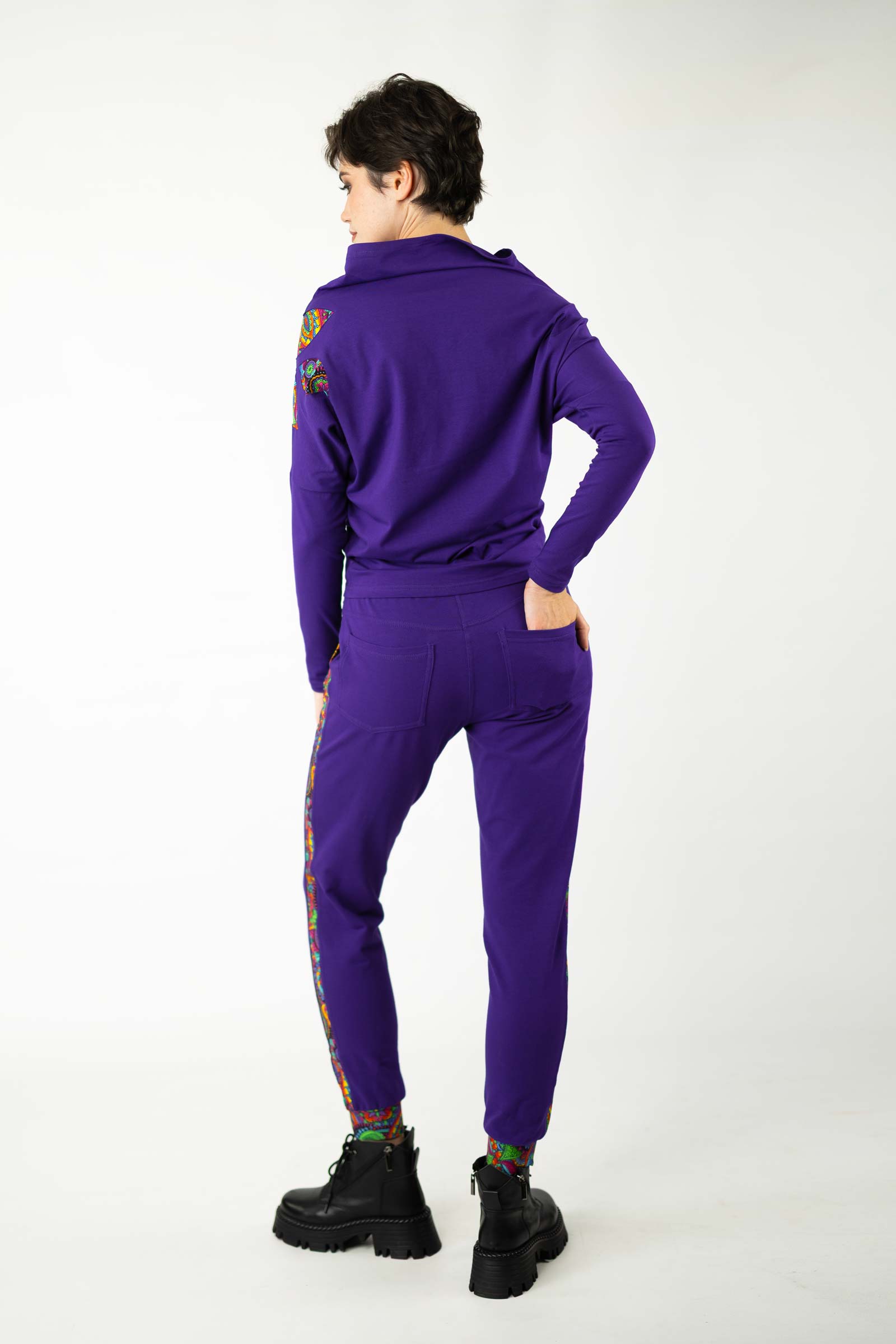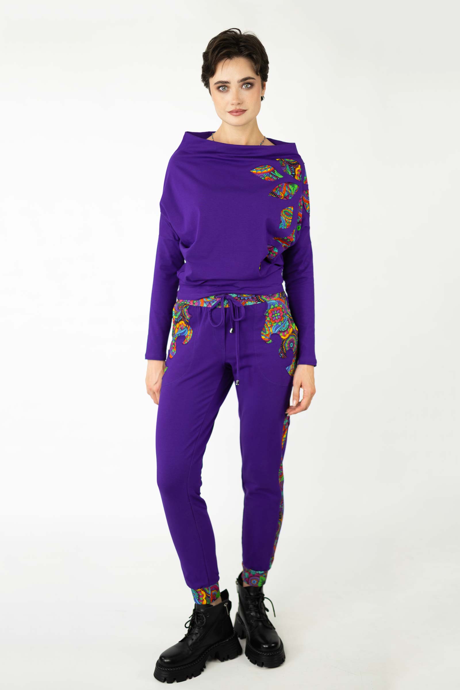Bluzka została uszyta w naszej pracowni w Legionowie z miękkiej, elastycznej dzianiny bawełnianej – oddychającej, komfortowej i przyjemnej w dotyku. To propozycja dla kobiet, które cenią kreatywne podejście do mody, wygodę i wyjątkowe, ręcznie wykonane detale.