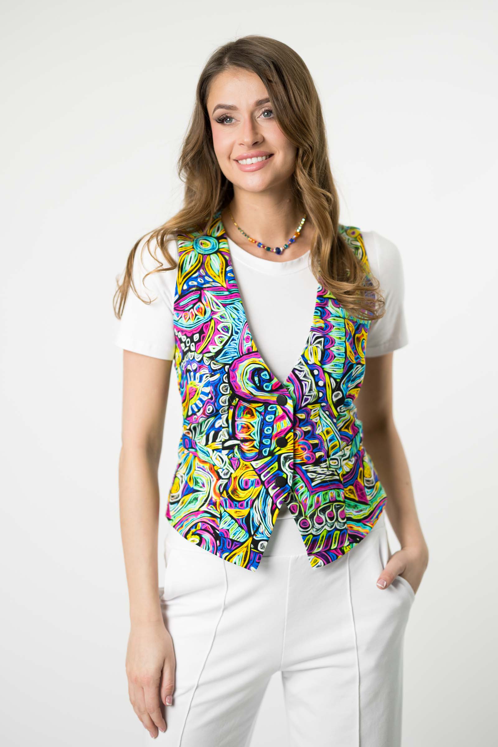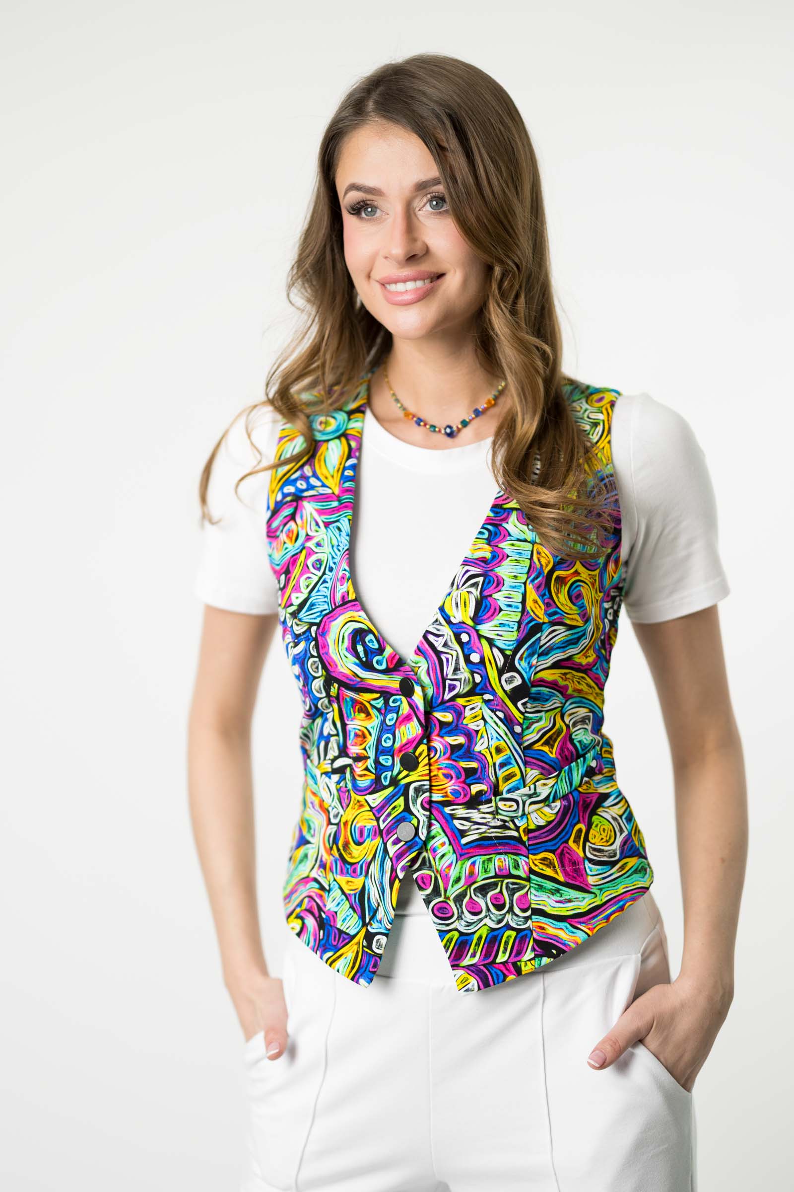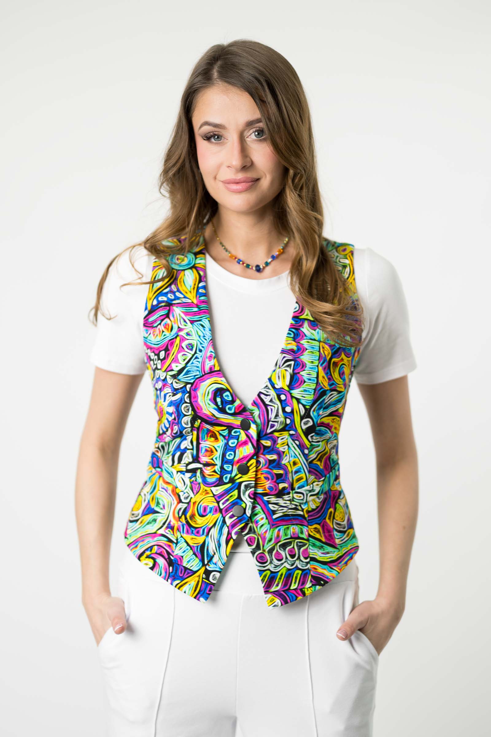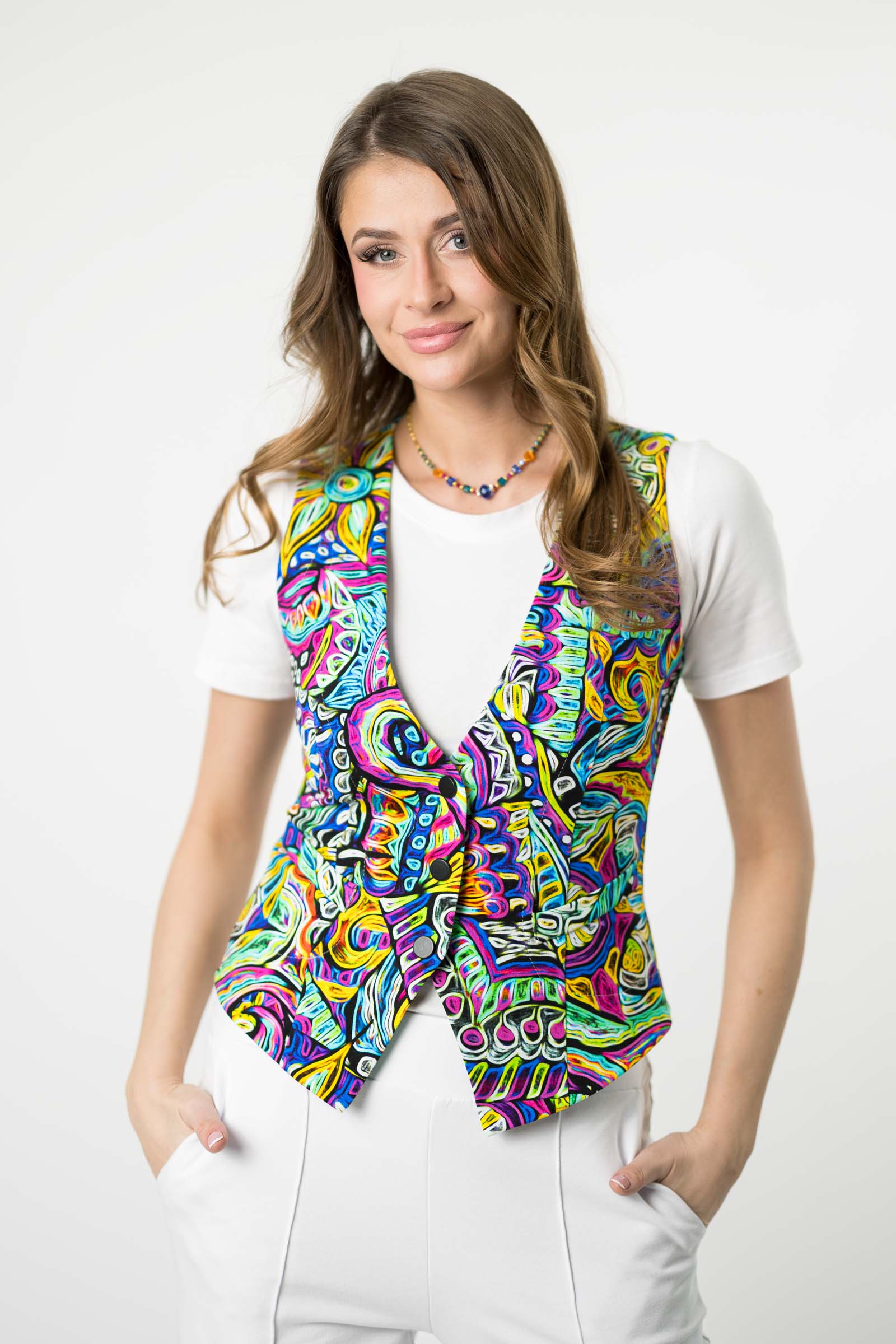 Najbardziej charakterystycznym elementem tej kamizelki jest jej kolorowy autorski wzór, który został zaprojektowany przez Katarzynę Gałaj, właścicielkę i twórczynię marki. Ten unikalny wzór sprawia, że kamizelka jest bardzo oryginalna. To doskonały wybór dla kobiet, które lubią się wyróżniać i eksperymentować z modą.