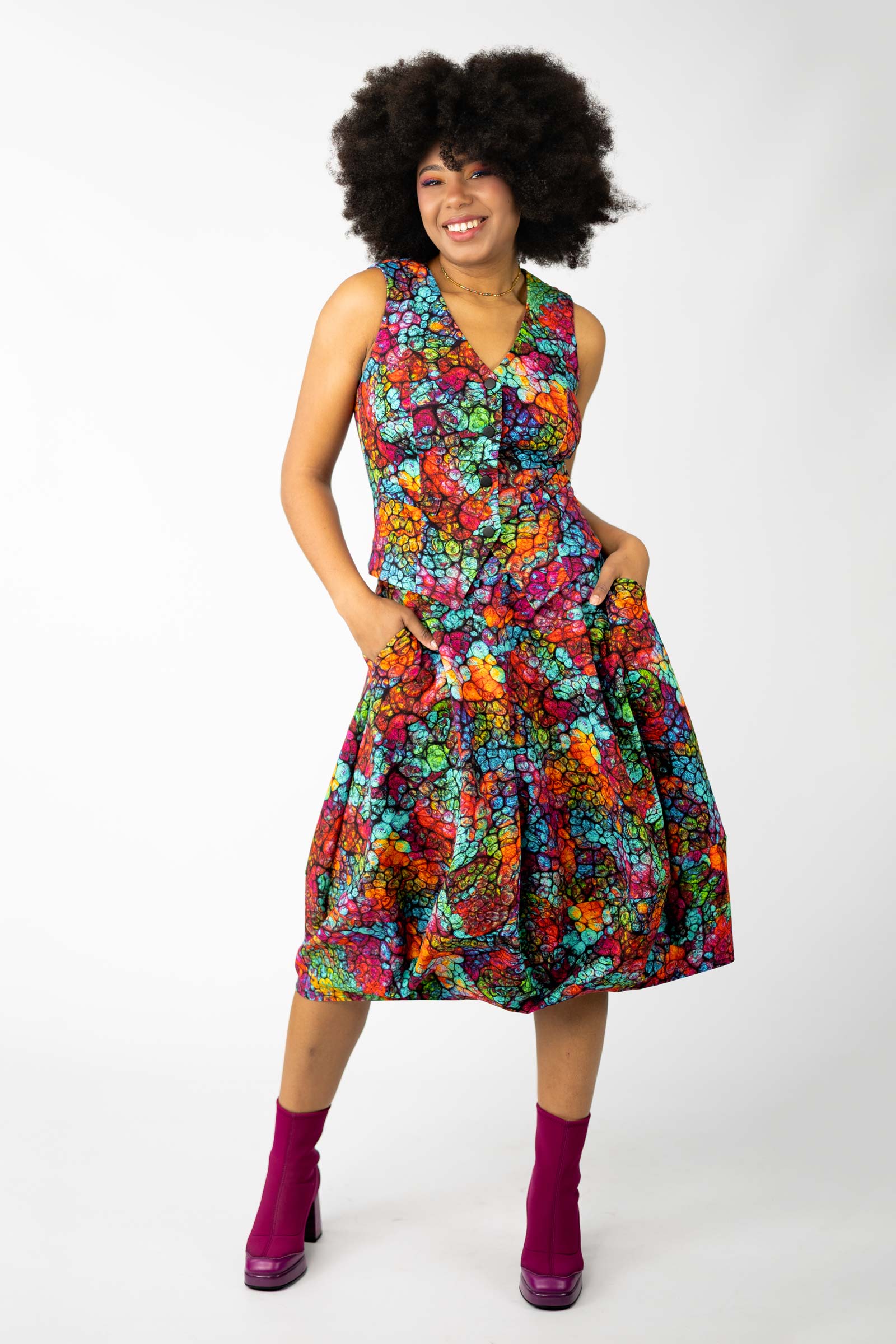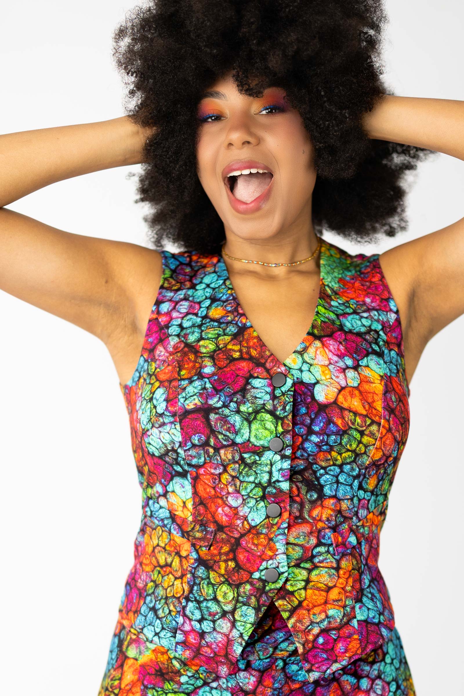 Kamizelka ma imitację kieszeni, co nadaje jej eleganckiego wyglądu. Z przodu cztery zatrzaski, które umożliwiają łatwe i szybkie zapięcie, co sprawia, że jest to praktyczna opcja na różne okazje. Wysoki dekolt dodaje elegancji i pozwala na noszenie kamizelki jako bluzki, co daje Ci możliwość eksperymentowania z różnymi stylizacjami.