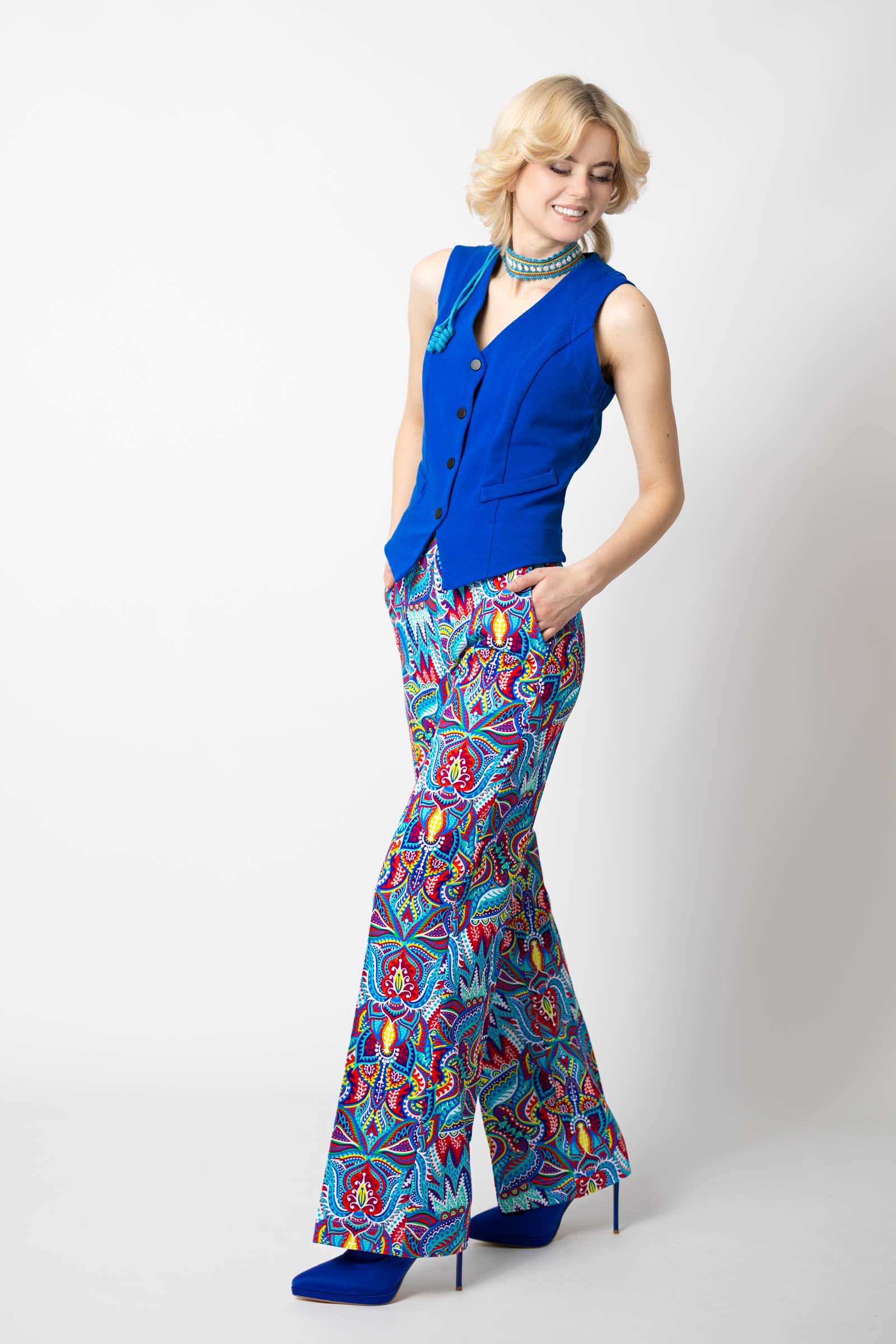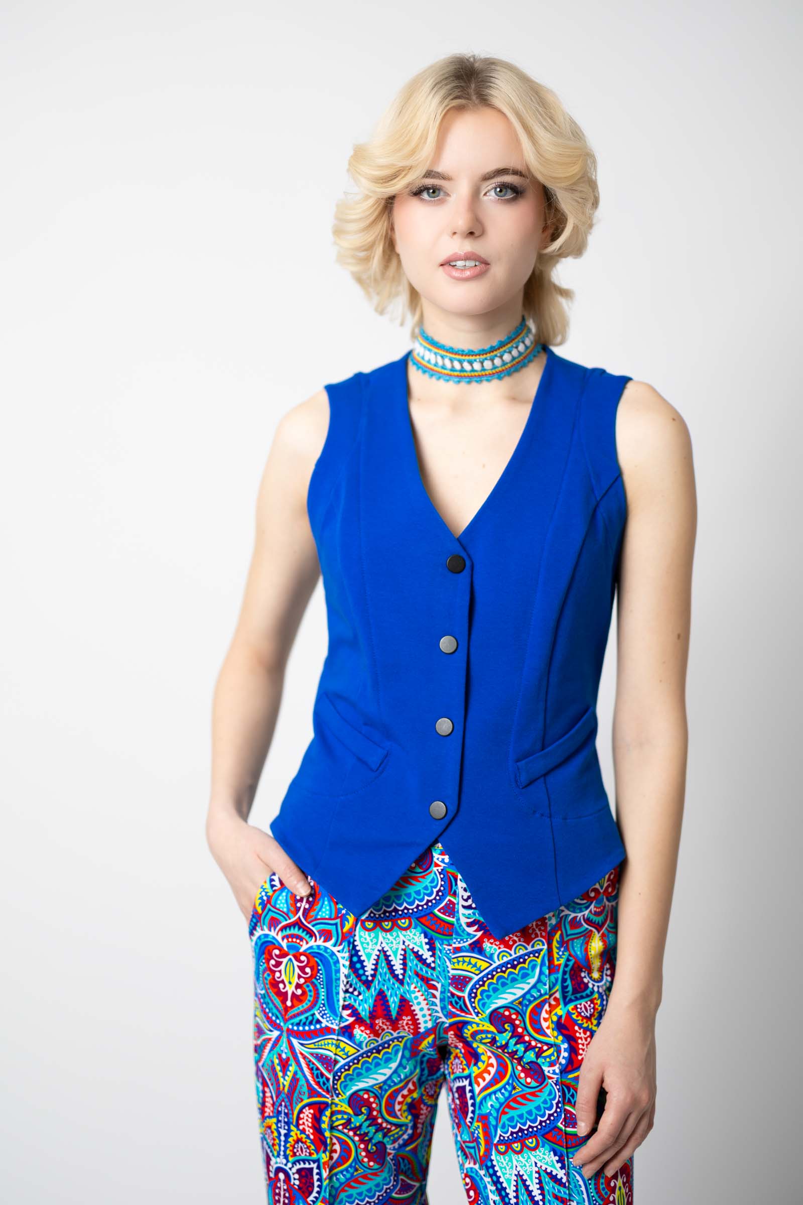 Kamizelka ma imitację kieszeni, co nadaje jej eleganckiego wyglądu. Z przodu cztery zatrzaski, które umożliwiają łatwe i szybkie zapięcie, co sprawia, że jest to praktyczna opcja na różne okazje. Wysoki dekolt dodaje elegancji i pozwala na noszenie kamizelki jako bluzki, co daje Ci możliwość eksperymentowania z różnymi stylizacjami.