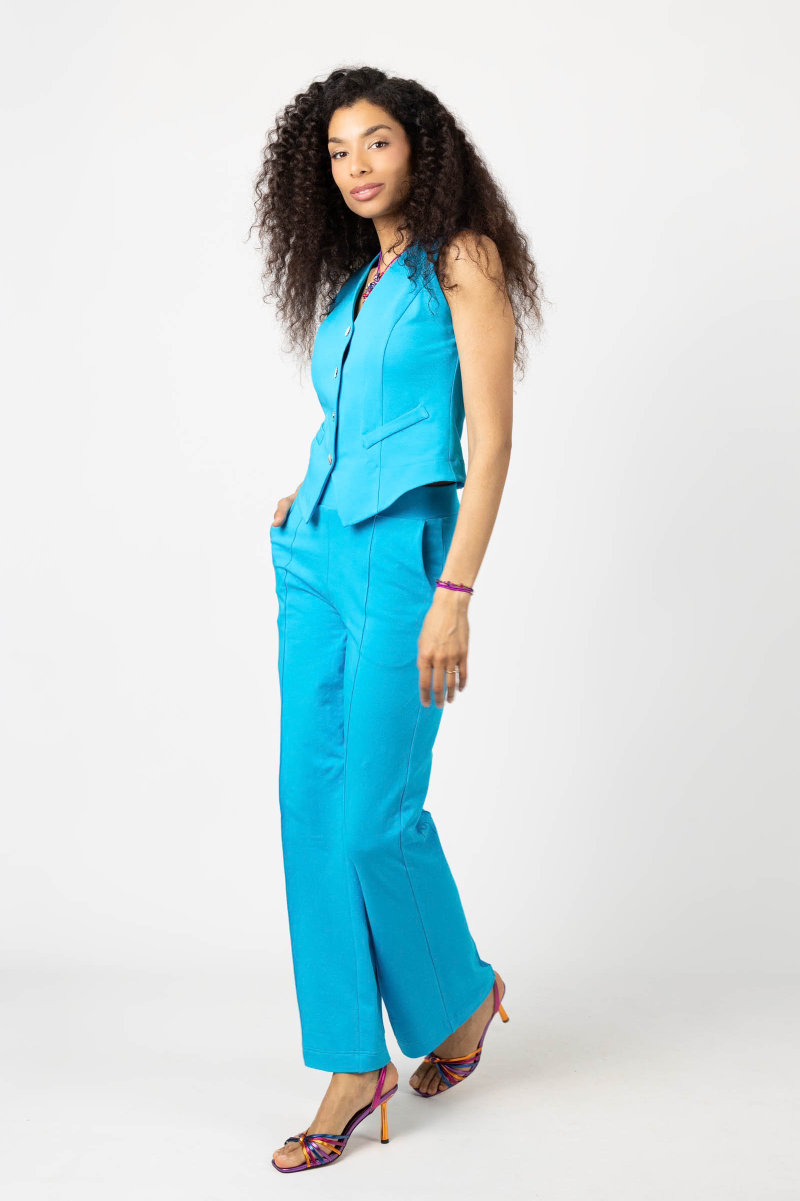 Kamizelka ma imitację kieszeni, co nadaje jej eleganckiego wyglądu. Z przodu cztery zatrzaski, które umożliwiają łatwe i szybkie zapięcie, co sprawia, że jest to praktyczna opcja na różne okazje. Wysoki dekolt dodaje elegancji i pozwala na noszenie kamizelki jako bluzki, co daje Ci możliwość eksperymentowania z różnymi stylizacjami.