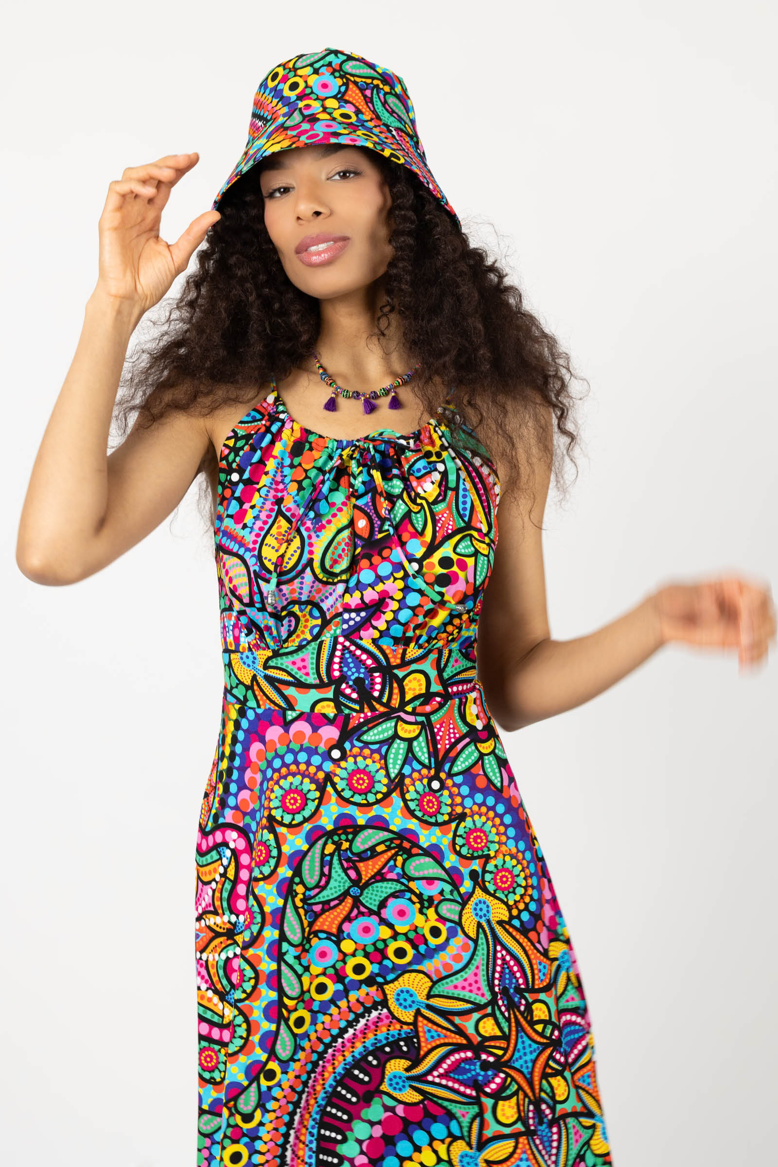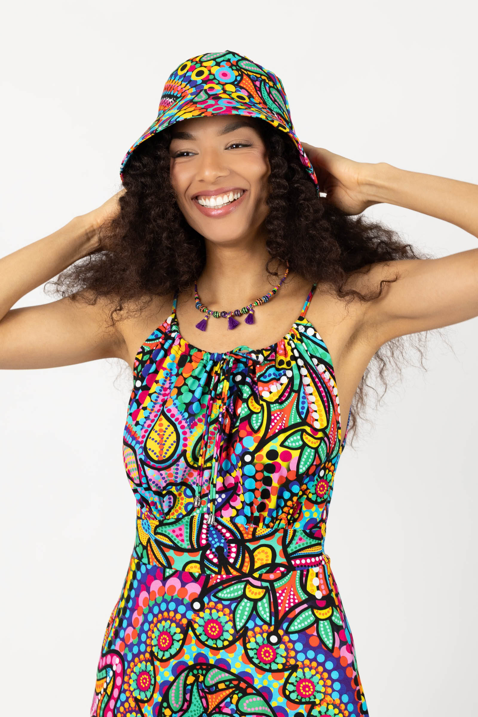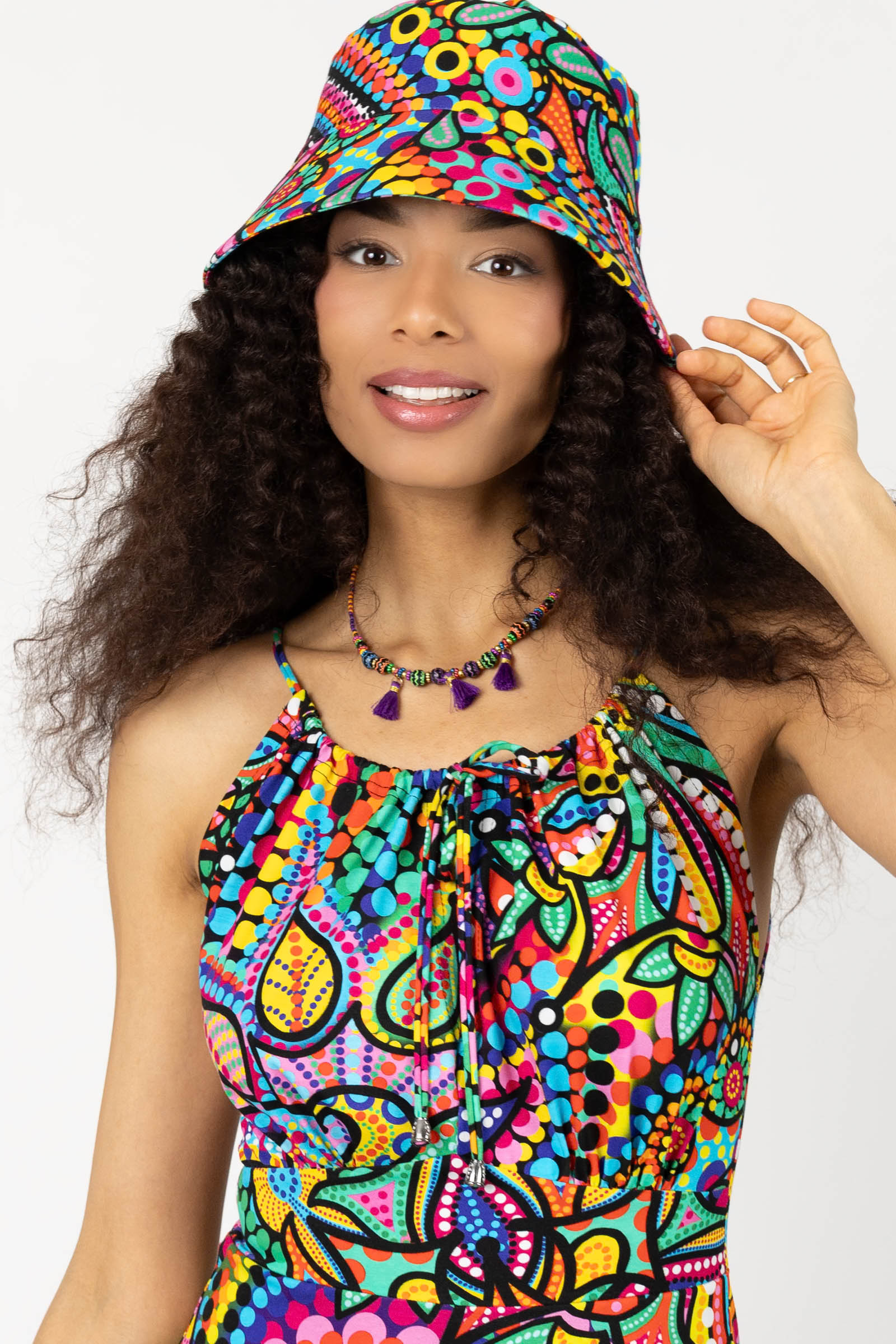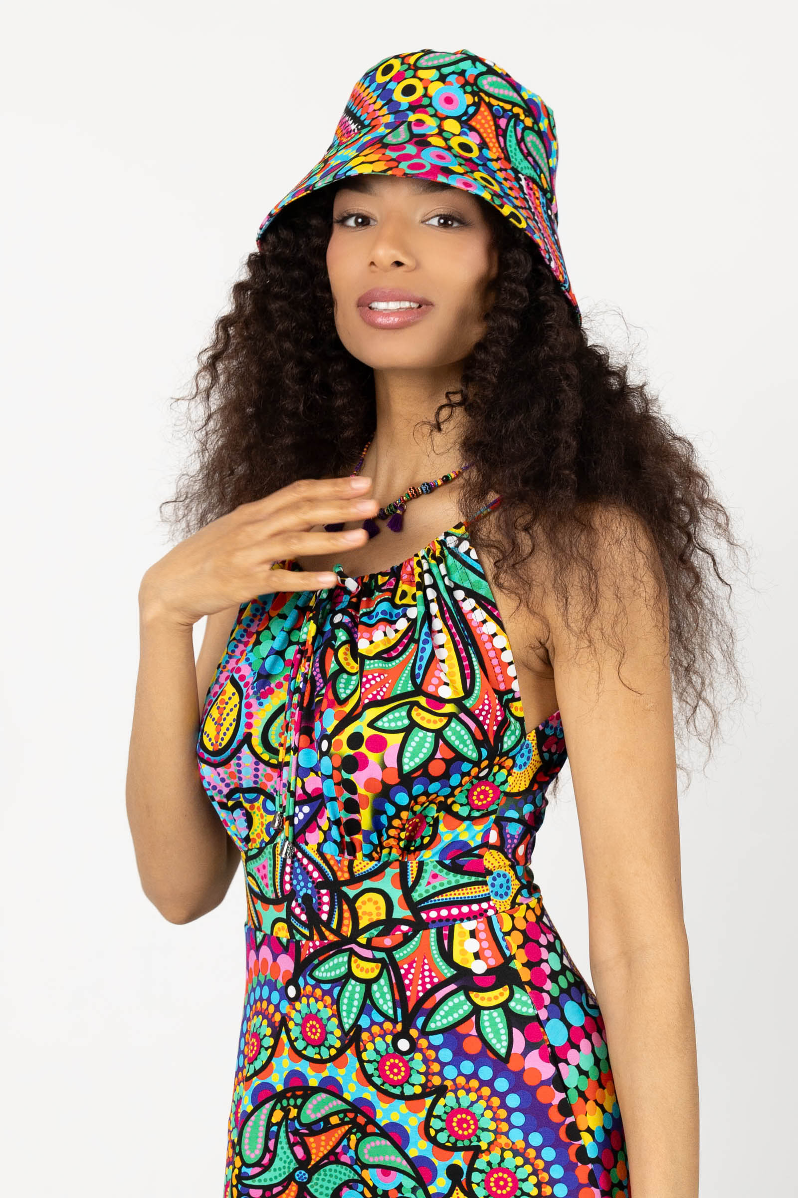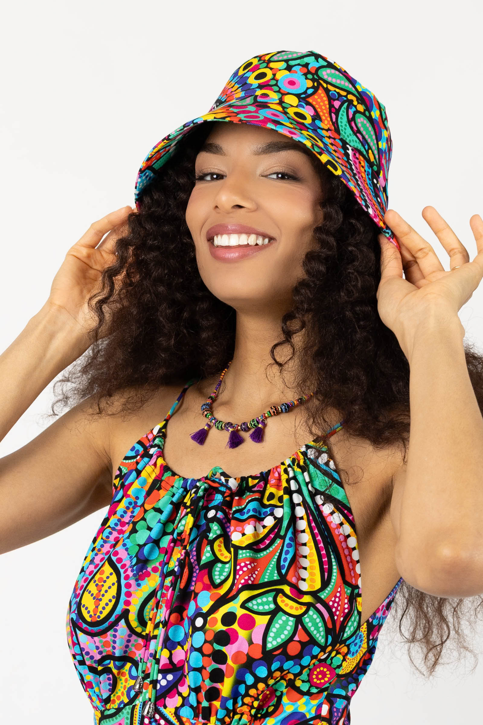 Wyrazisty kapelusz z szerokim rondem, uszyty z miękkiej dzianiny bawełnianej – lekki, przewiewny i komfortowy w noszeniu. Ozdobiony autorskim wzorem, stanowi połączenie funkcjonalności i oryginalnego designu.