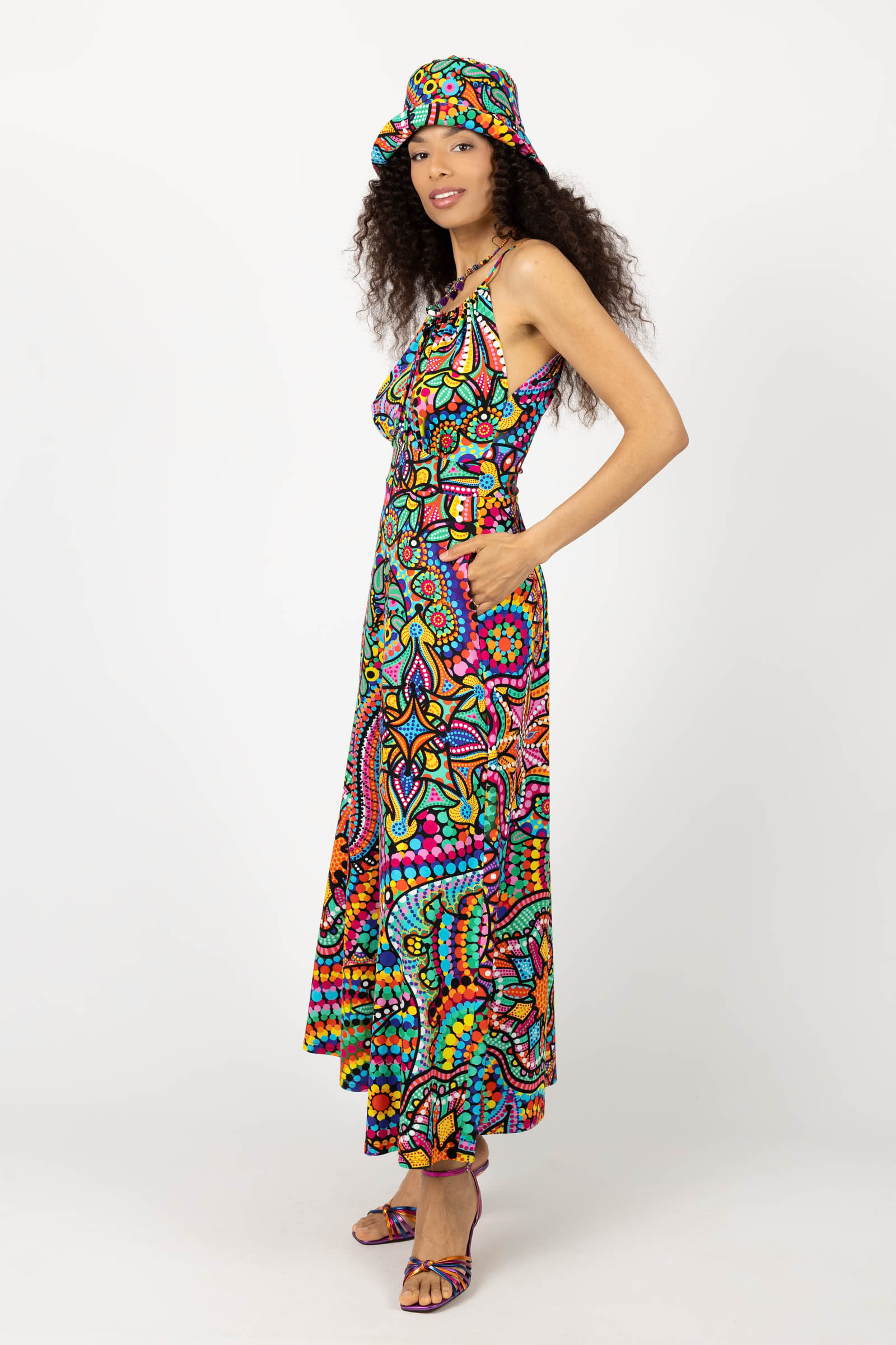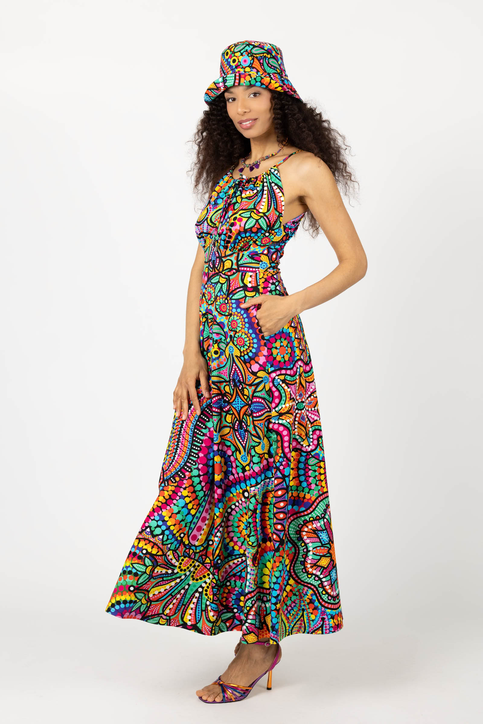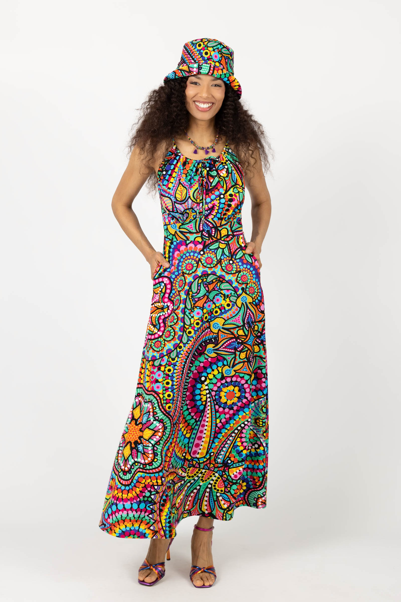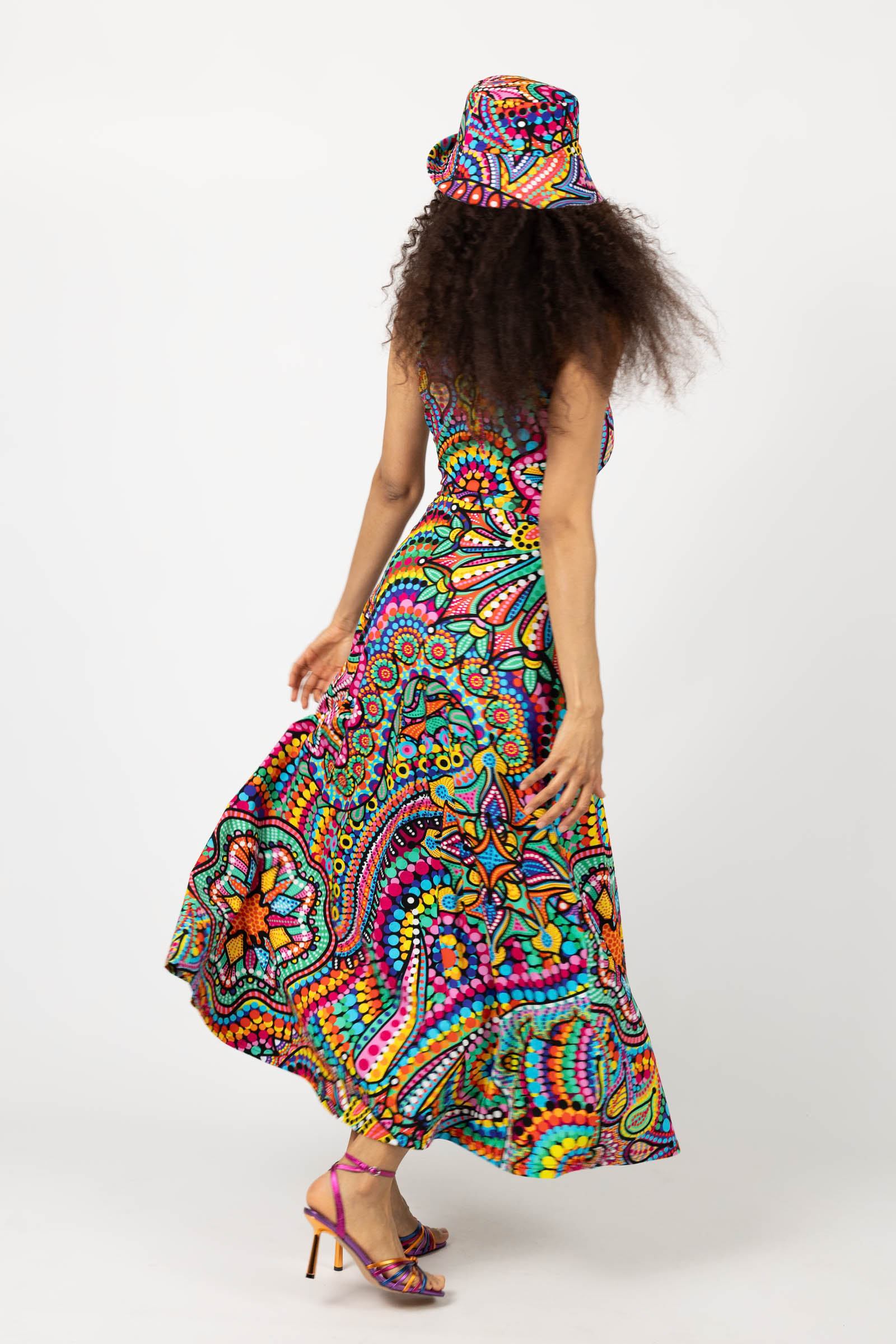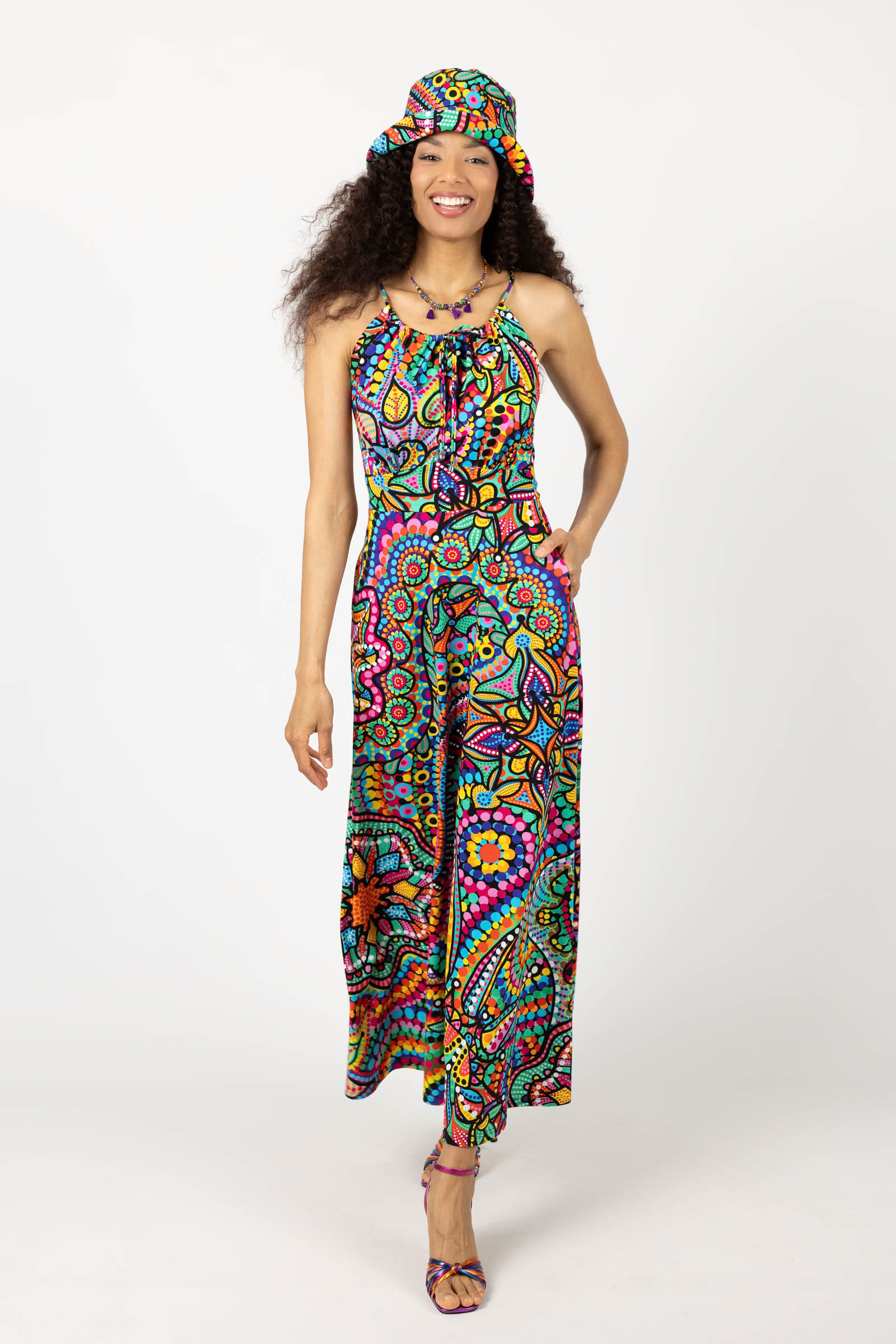 Wyrazisty kapelusz z szerokim rondem, uszyty z miękkiej dzianiny bawełnianej – lekki, przewiewny i komfortowy w noszeniu. Ozdobiony autorskim wzorem, stanowi połączenie funkcjonalności i oryginalnego designu.
