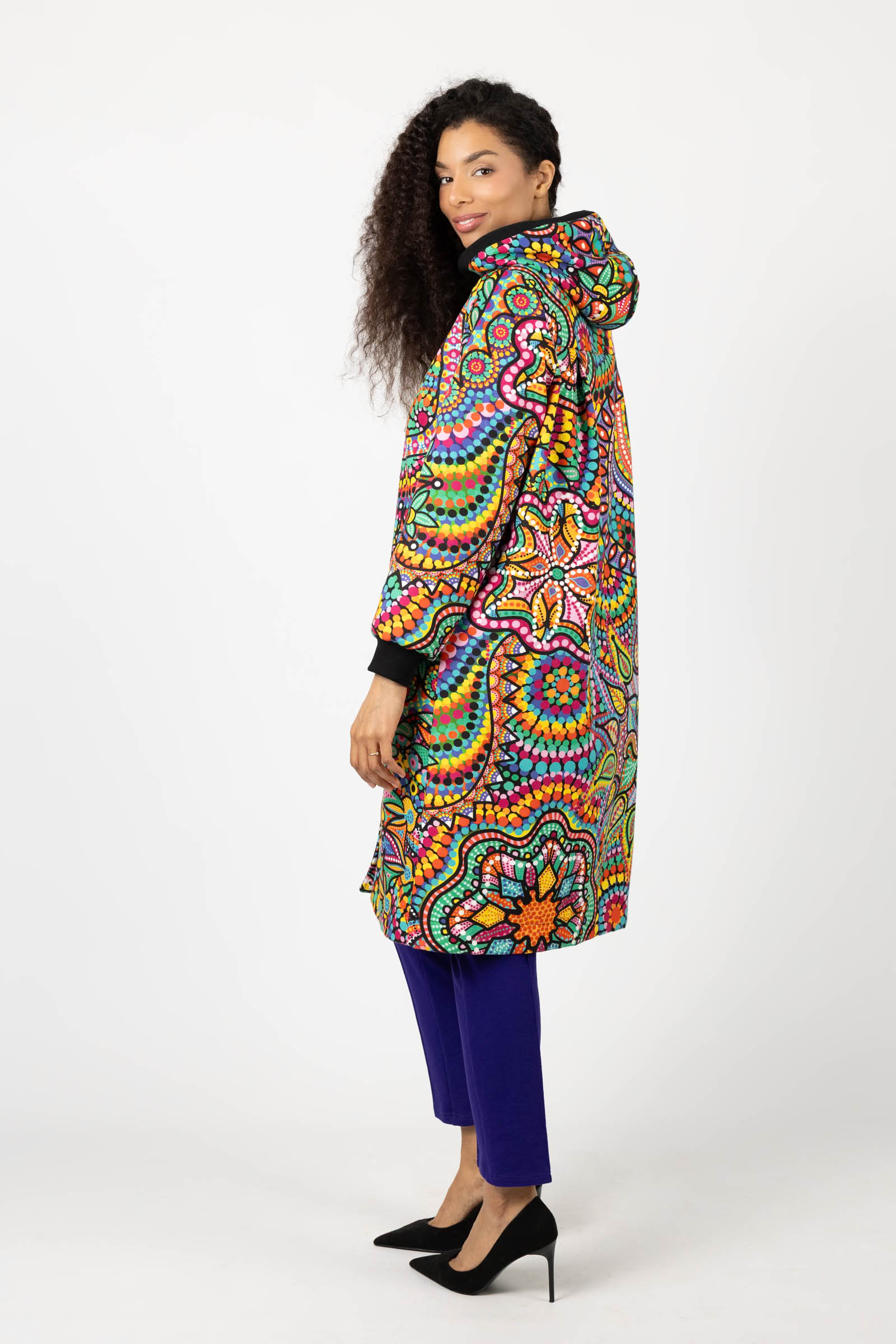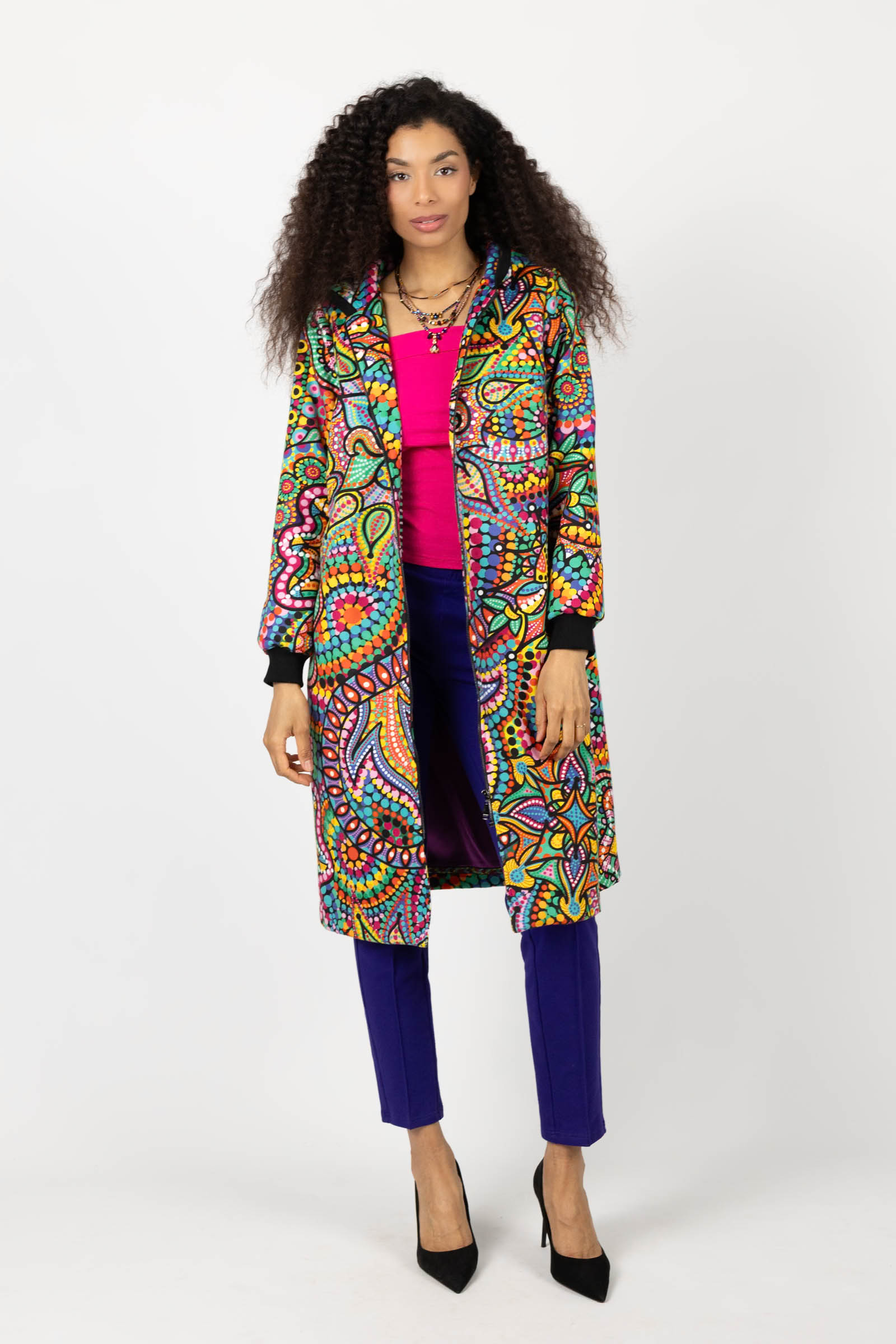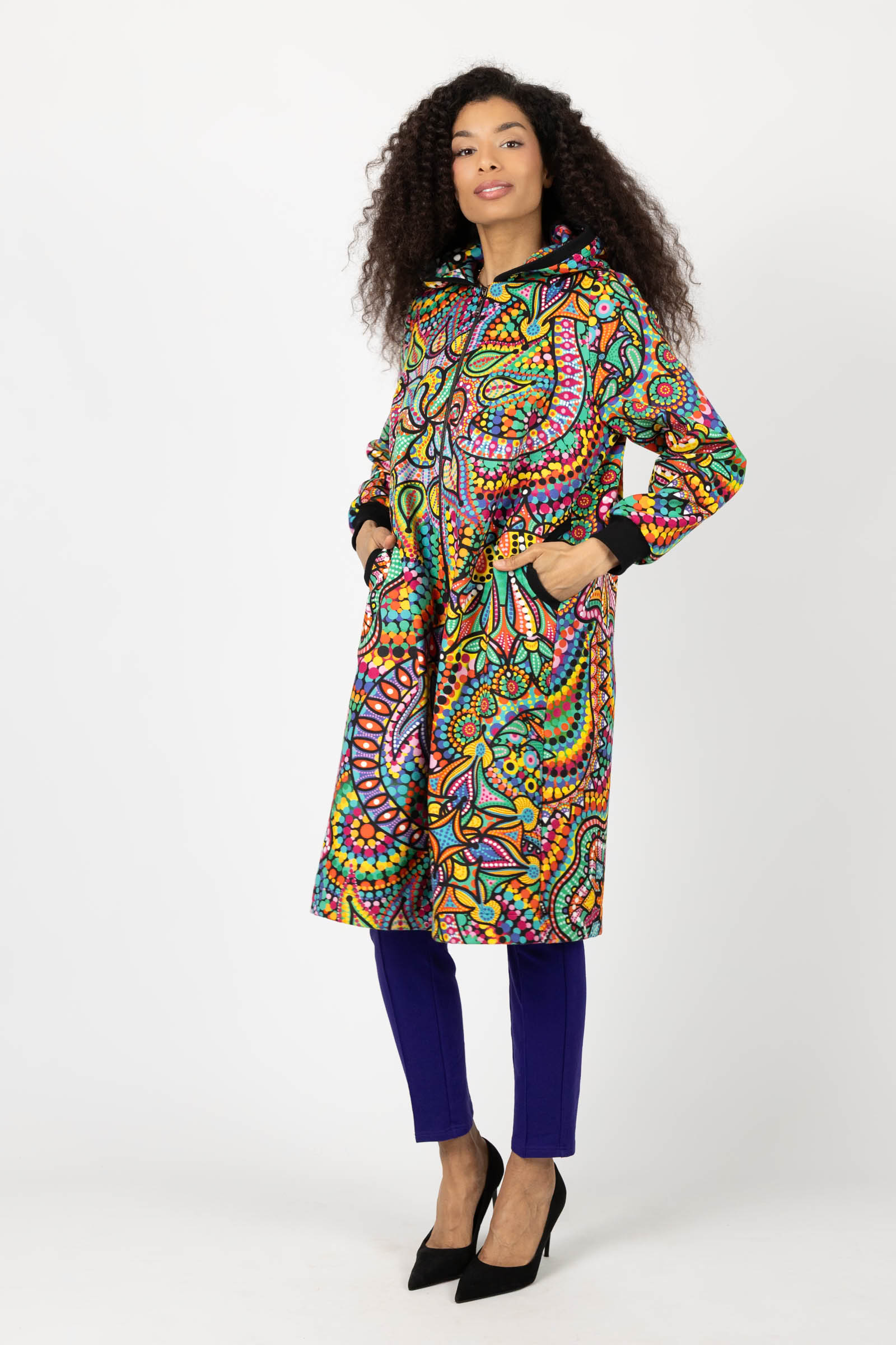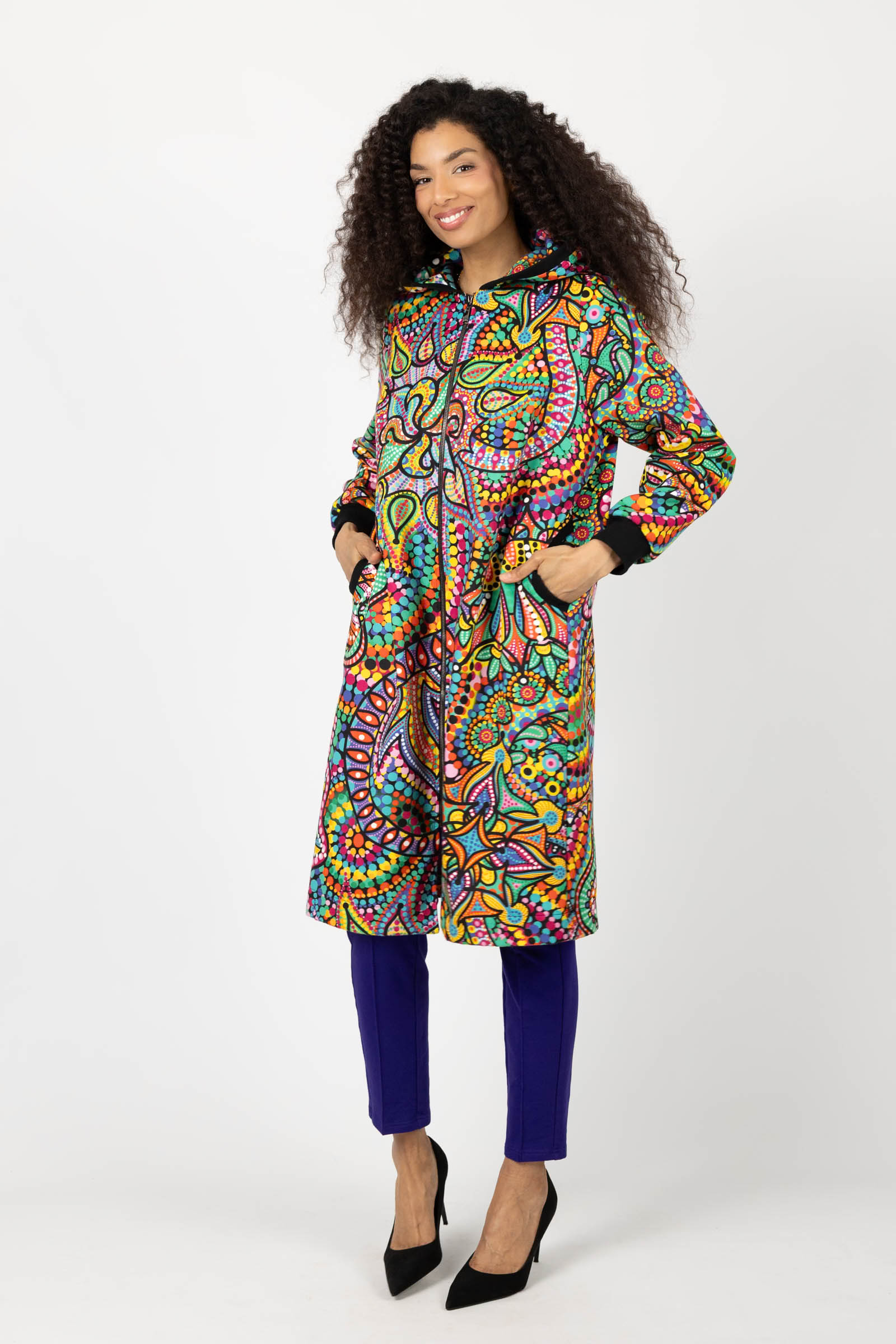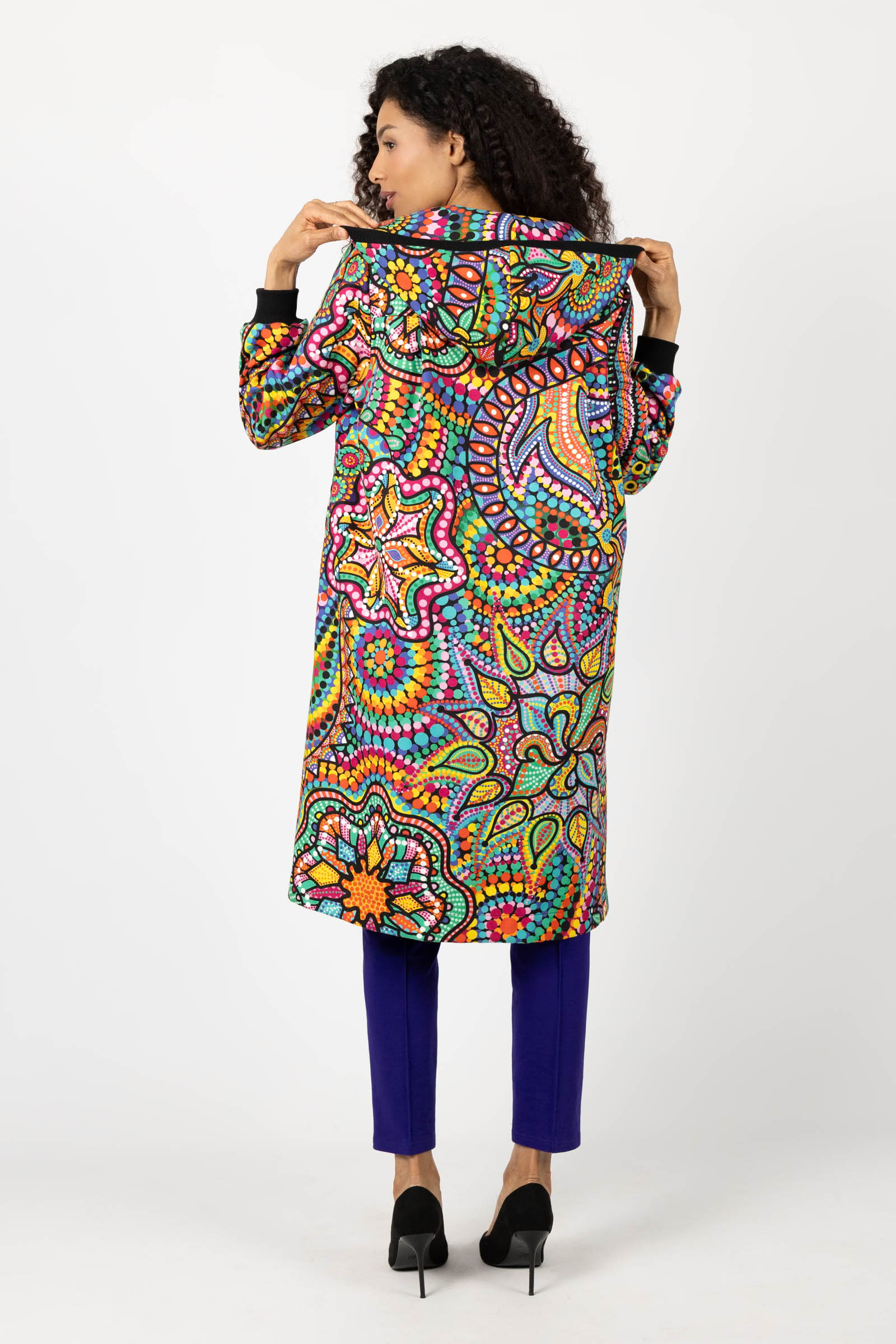 Uszyty z flauszu, daje miękkość i komfort noszenia. Całość dopełnia autorski wzór dostępny tylko w naszym sklepie, który nadaje płaszczowi wyrazisty, charakterystyczny styl.
