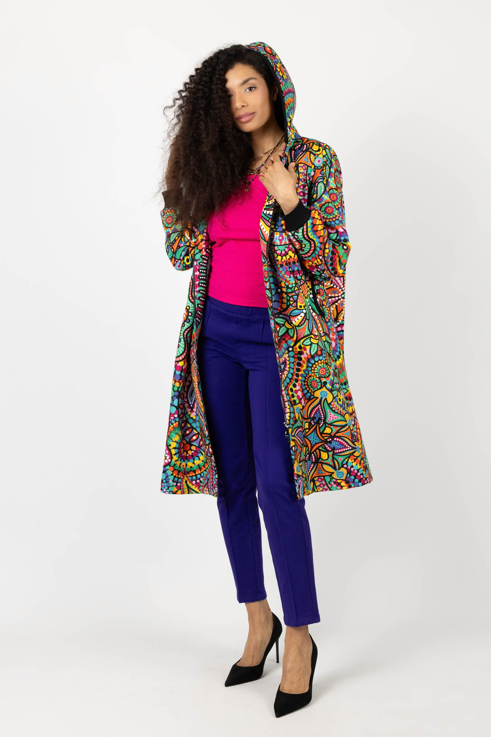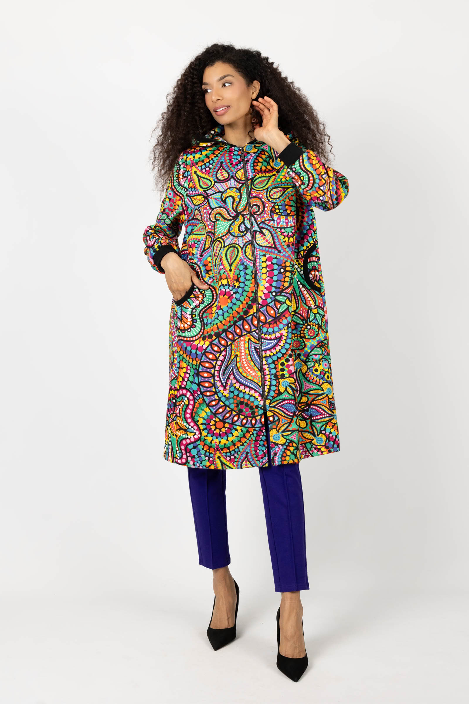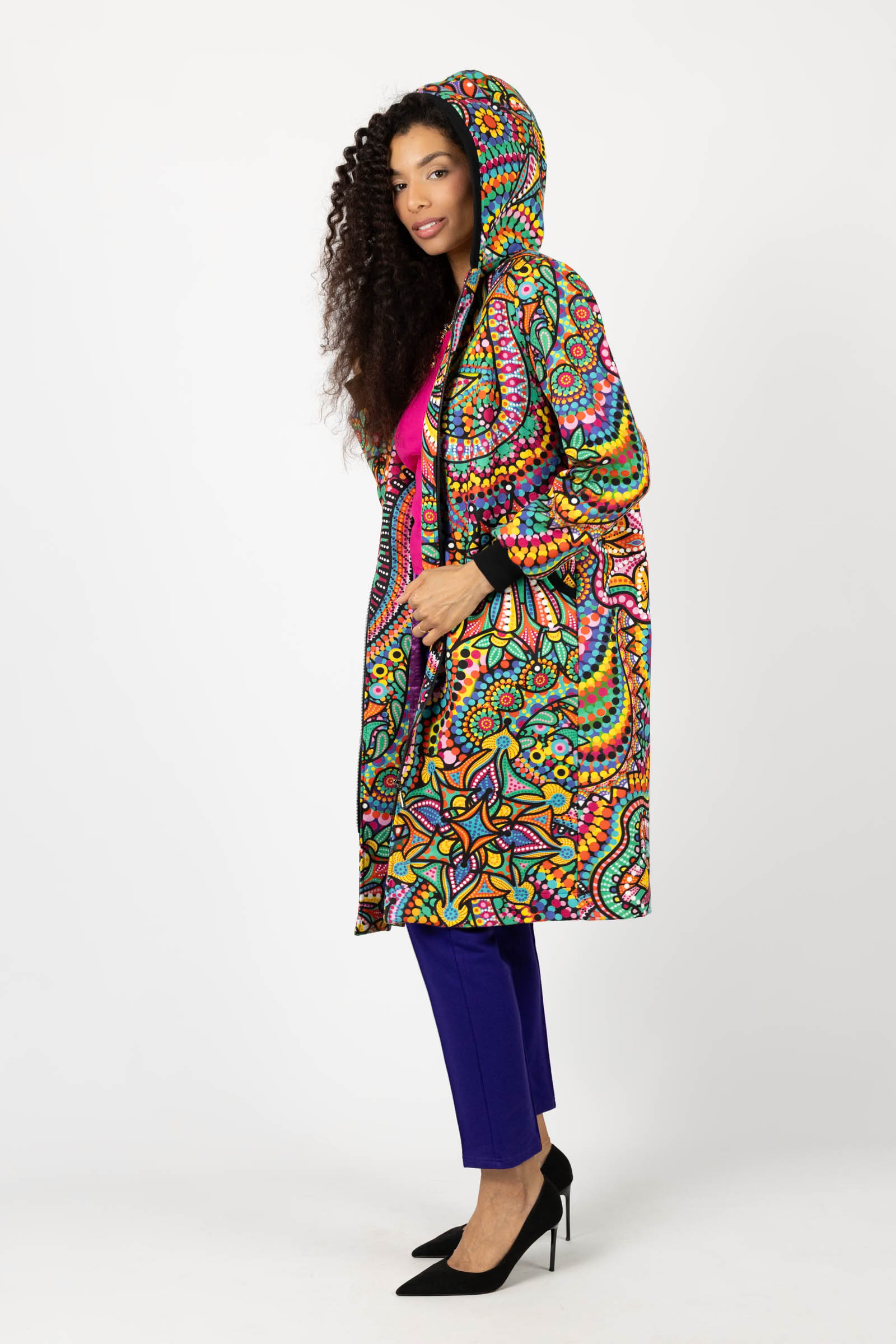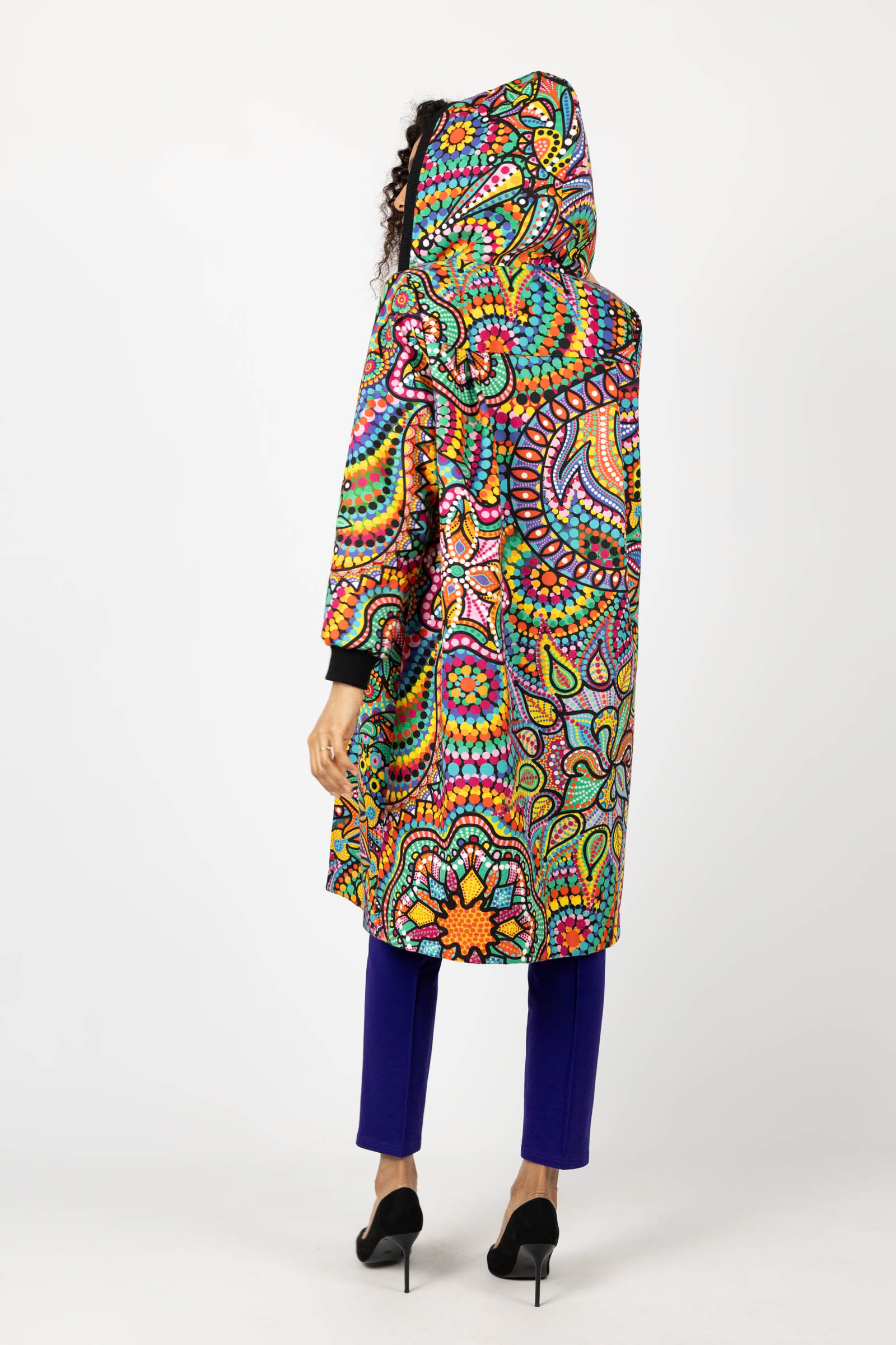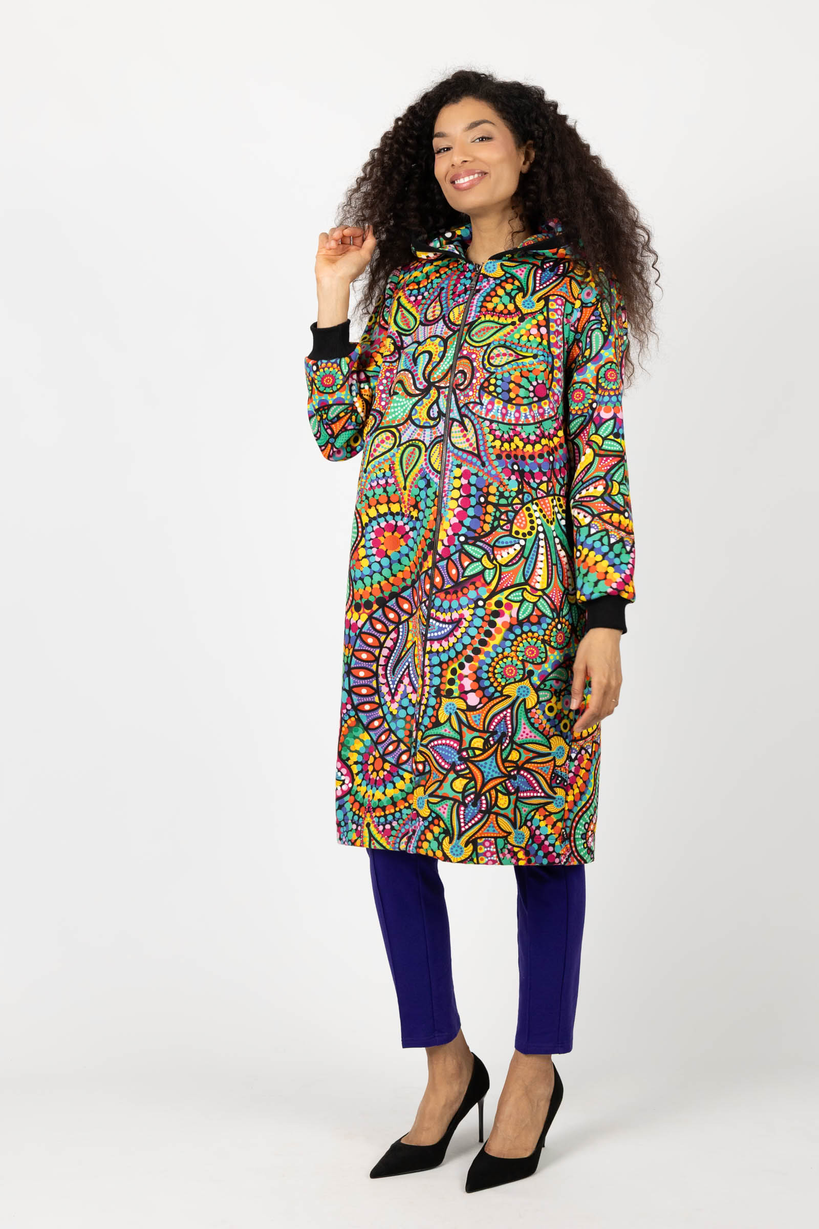 Uszyty z flauszu, daje miękkość i komfort noszenia. Całość dopełnia autorski wzór dostępny tylko w naszym sklepie, który nadaje płaszczowi wyrazisty, charakterystyczny styl.