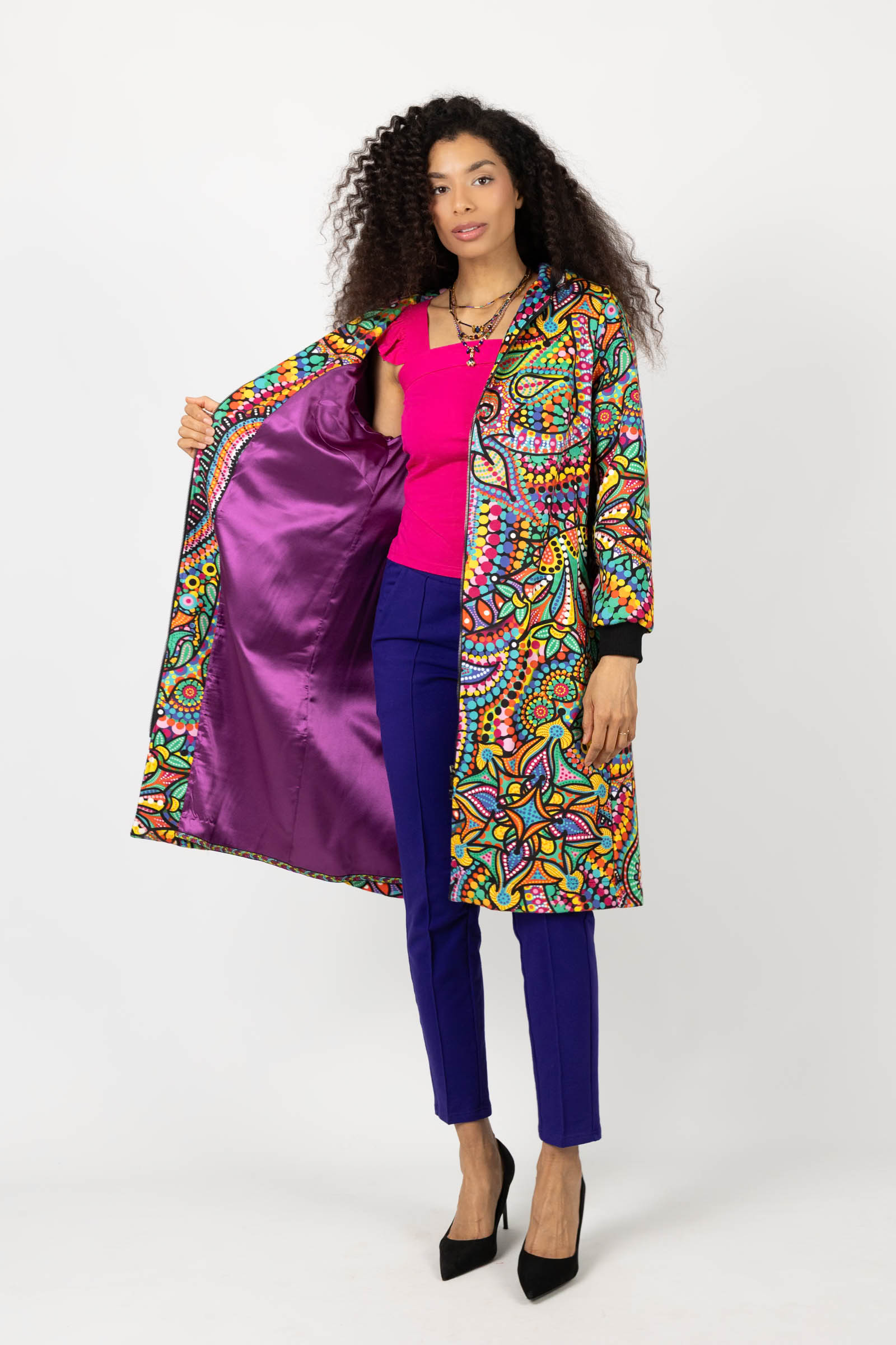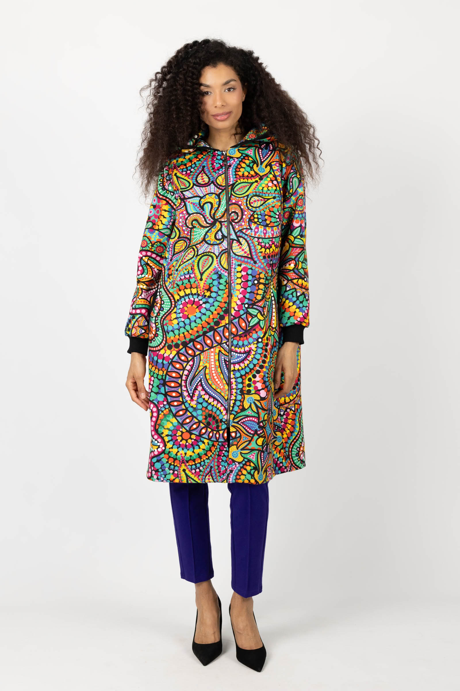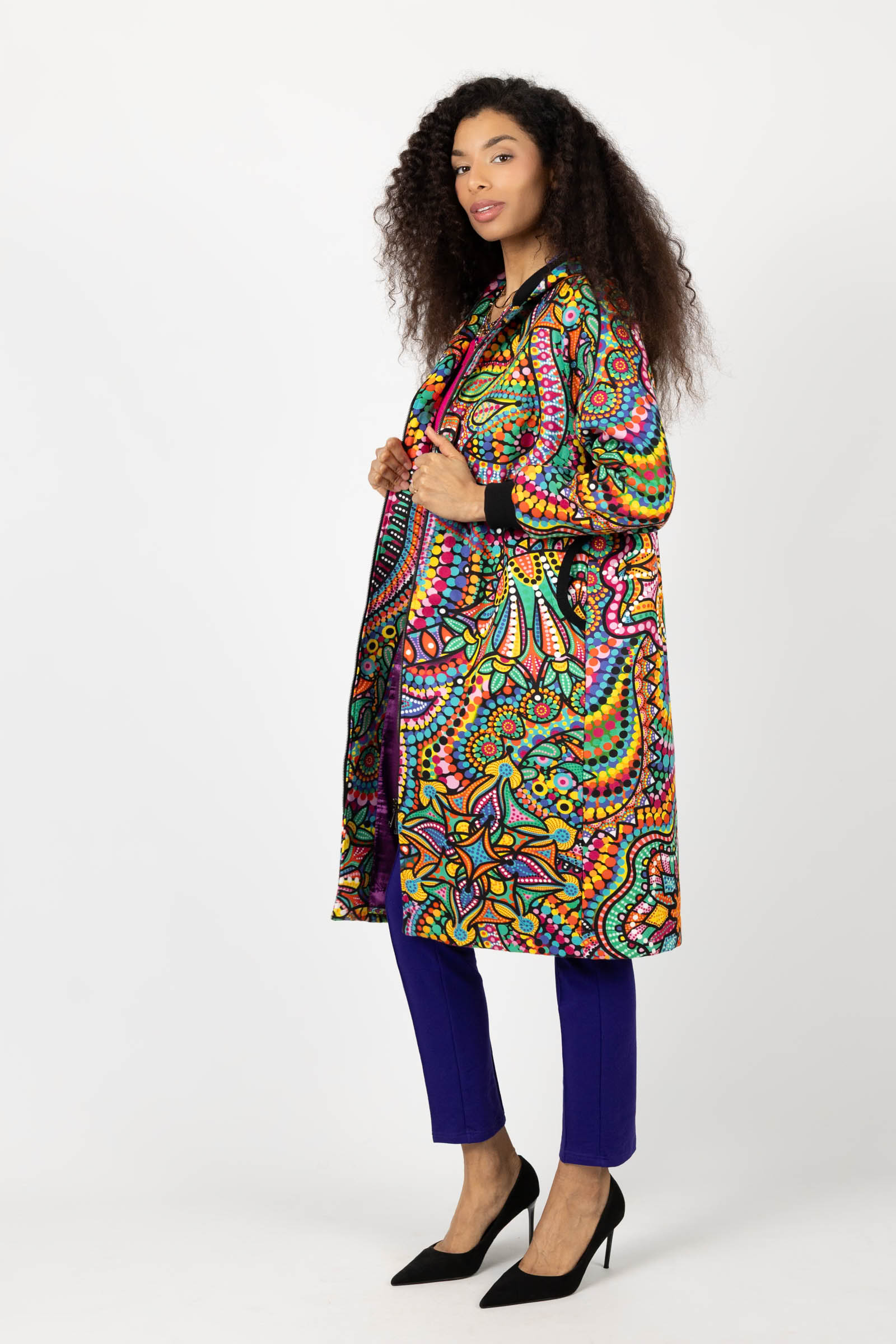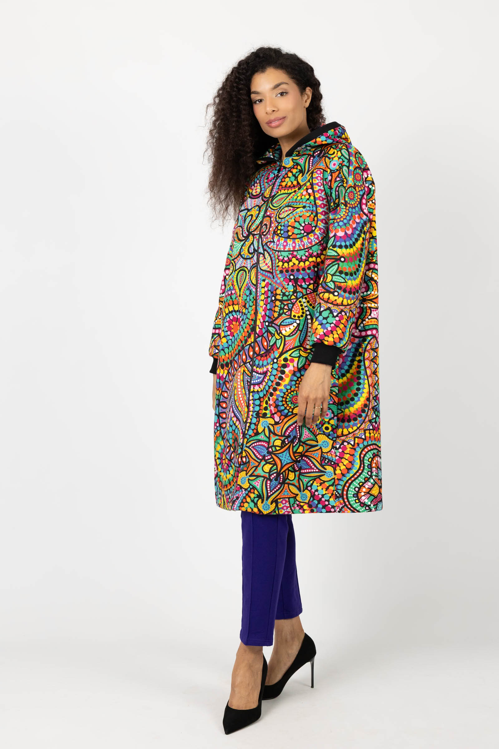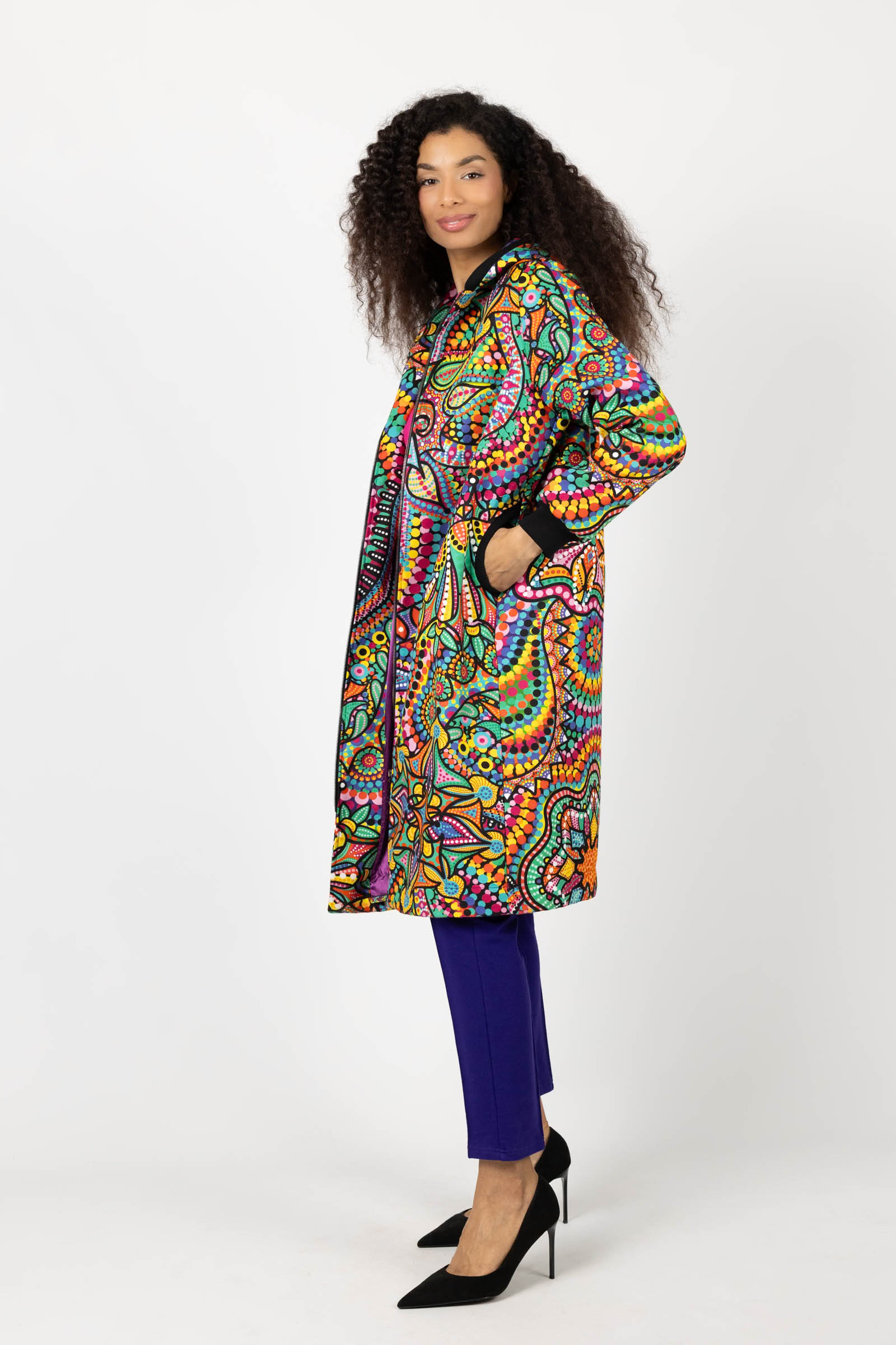 Uszyty z flauszu, daje miękkość i komfort noszenia. Całość dopełnia autorski wzór dostępny tylko w naszym sklepie, który nadaje płaszczowi wyrazisty, charakterystyczny styl.