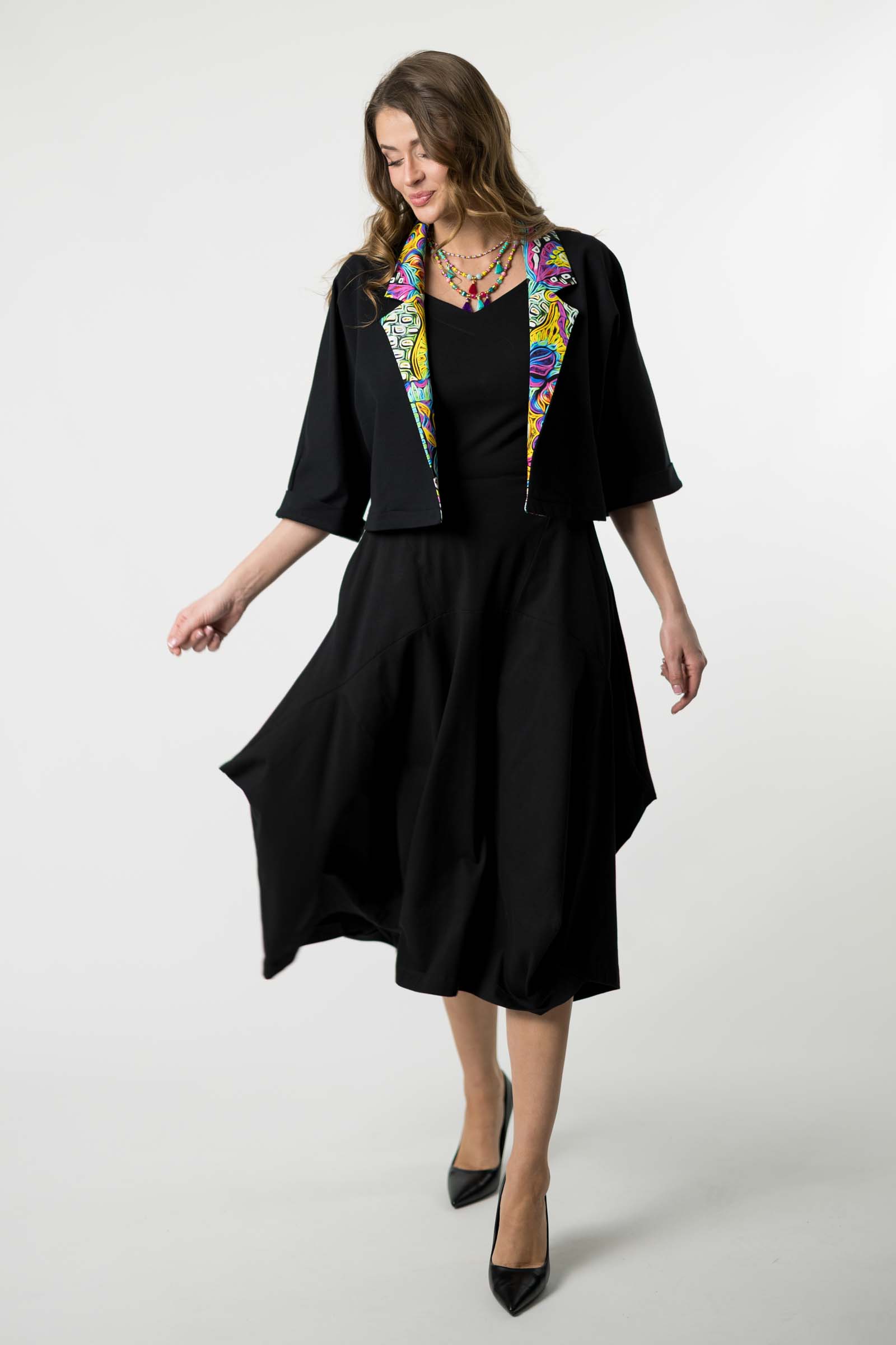Ta spódnica to odważne połączenie oryginalnego designu i funkcjonalności. Jej awangardowy krój inspirowany sztuką origami przyciąga uwagę geometrycznymi załamaniami i nieregularnym dołem, który nadaje sylwetce dynamiki i lekkości. To propozycja dla kobiet, które lubią wychodzić poza schematy i eksperymentować z modą.
