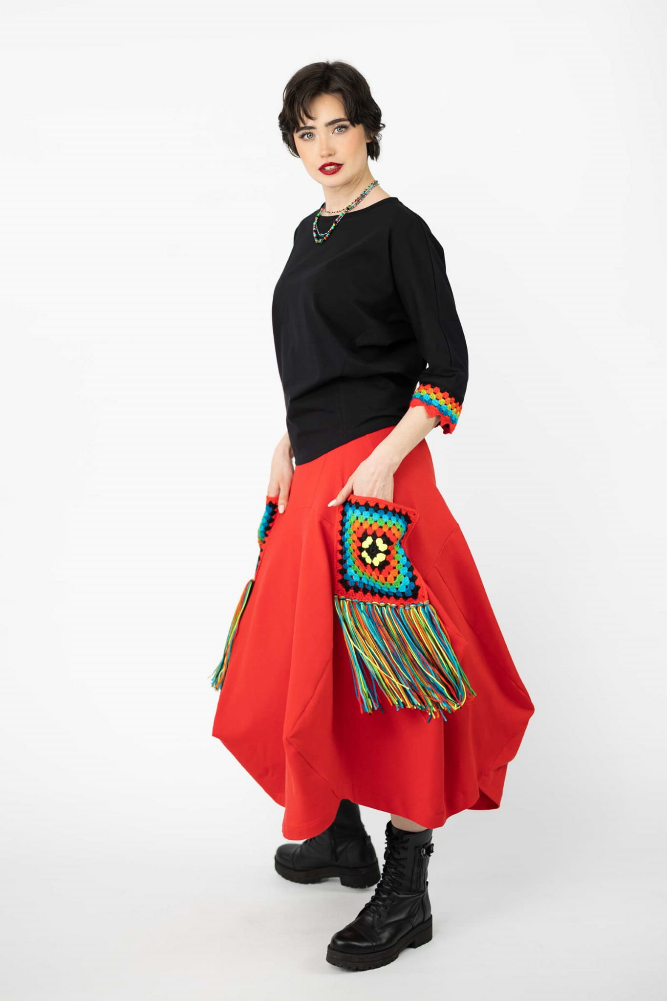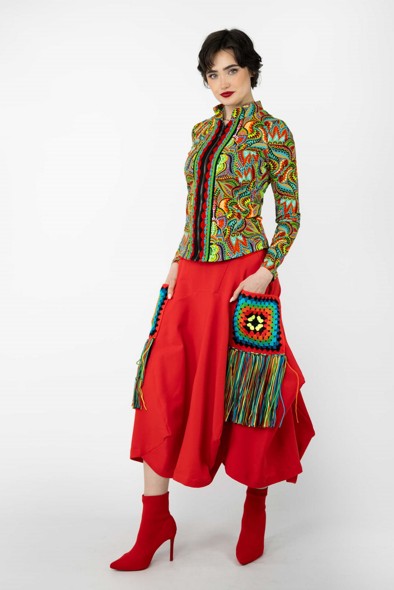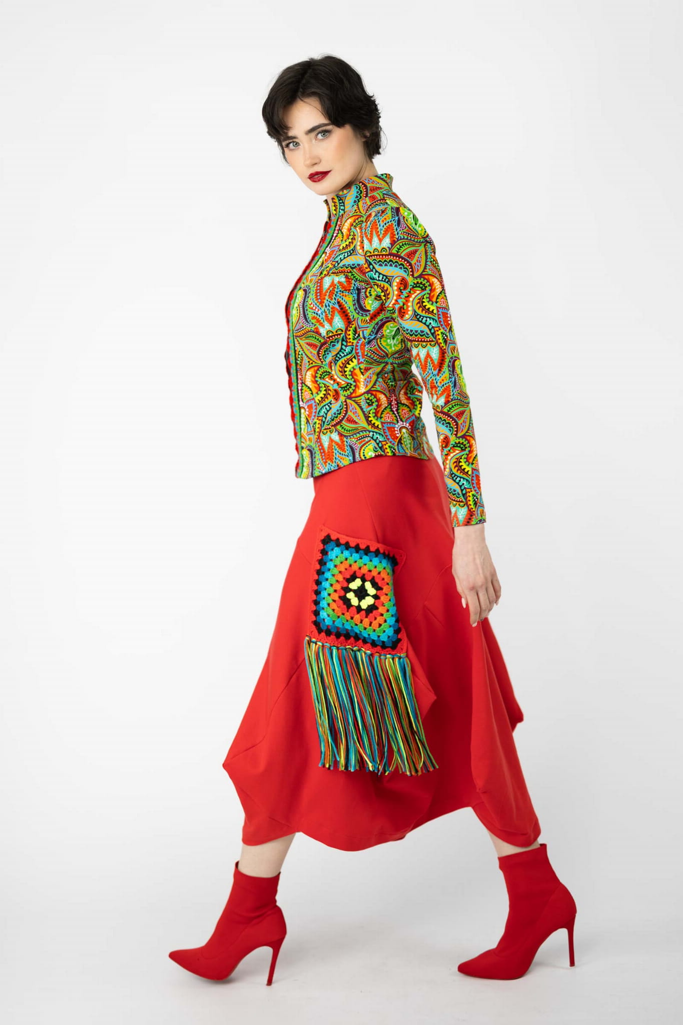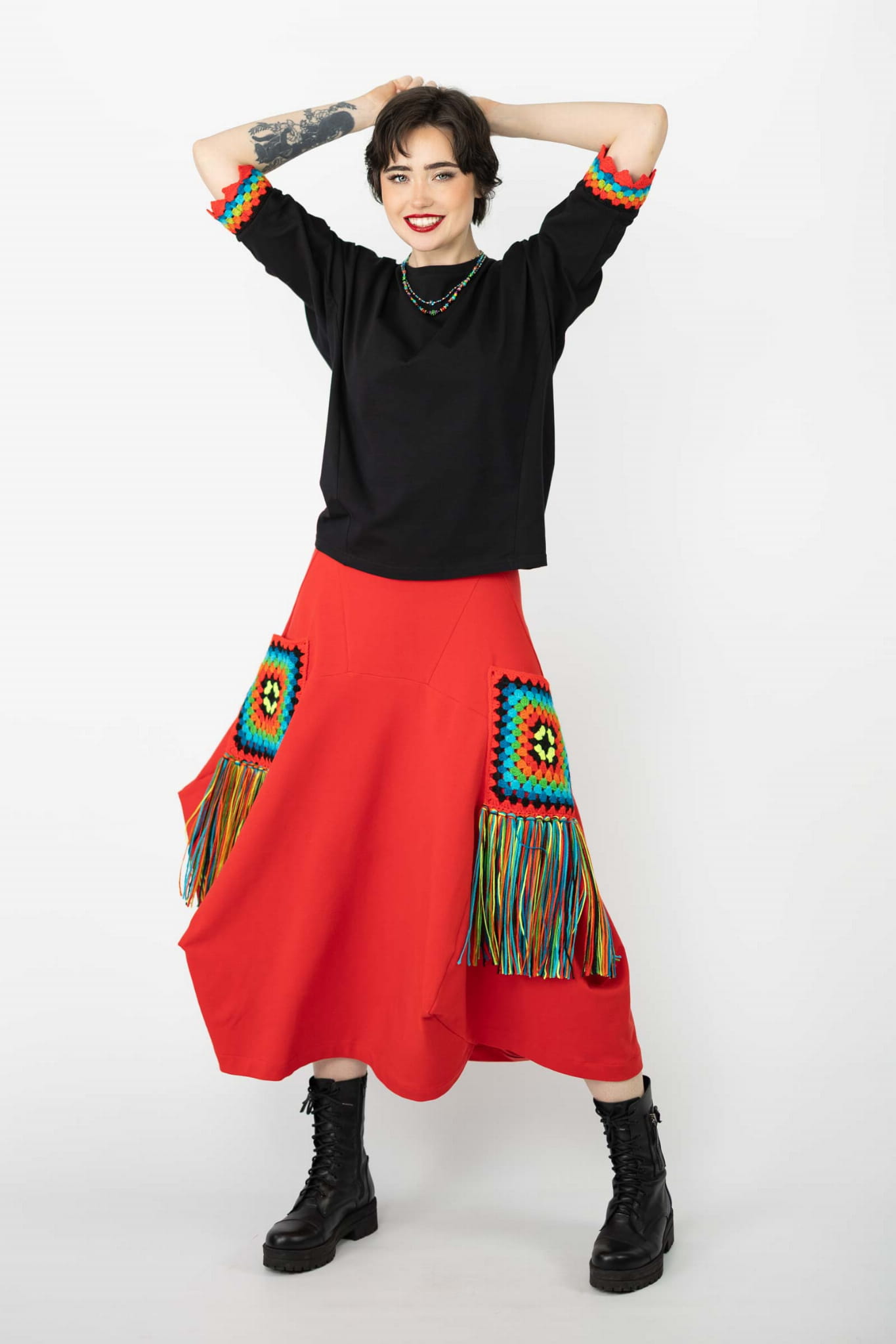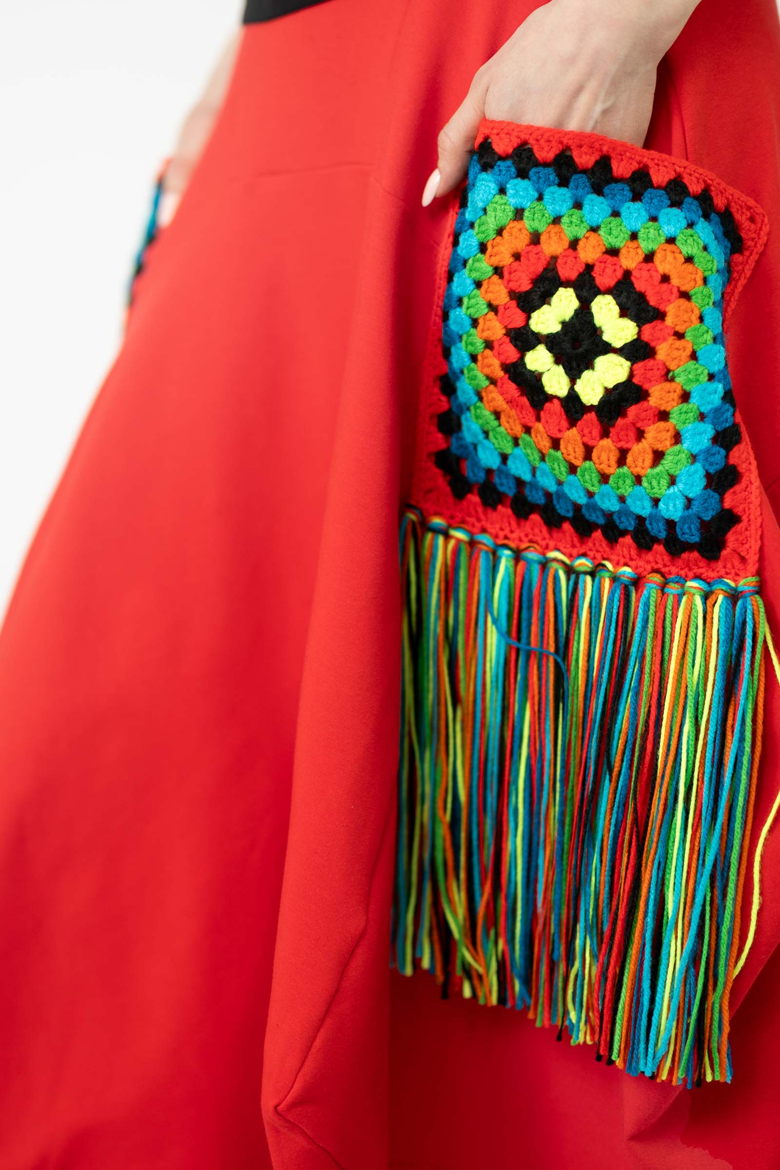 Spódnica czerwona, origami z szydełkowymi kieszeniami i frędzlami "KGart"