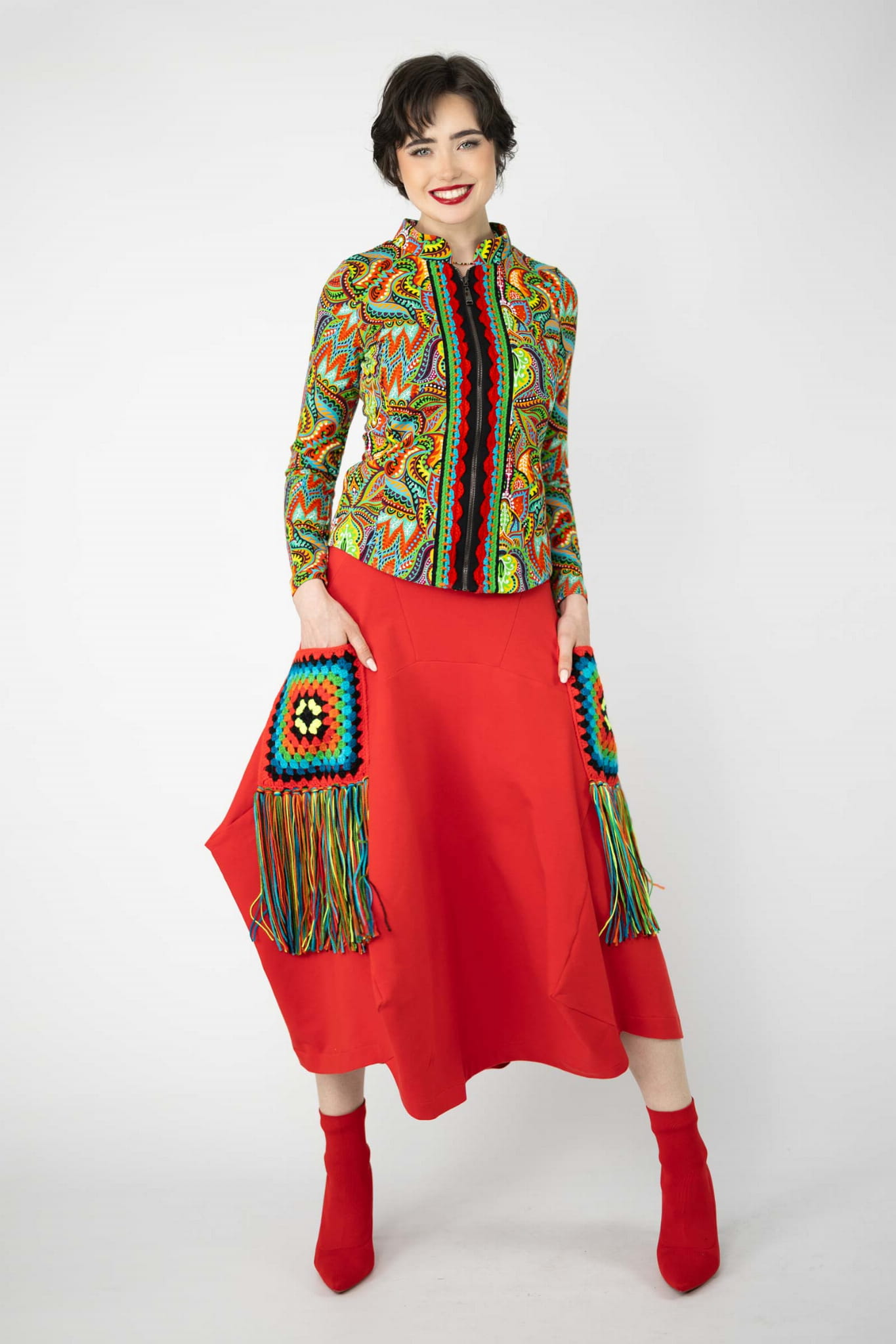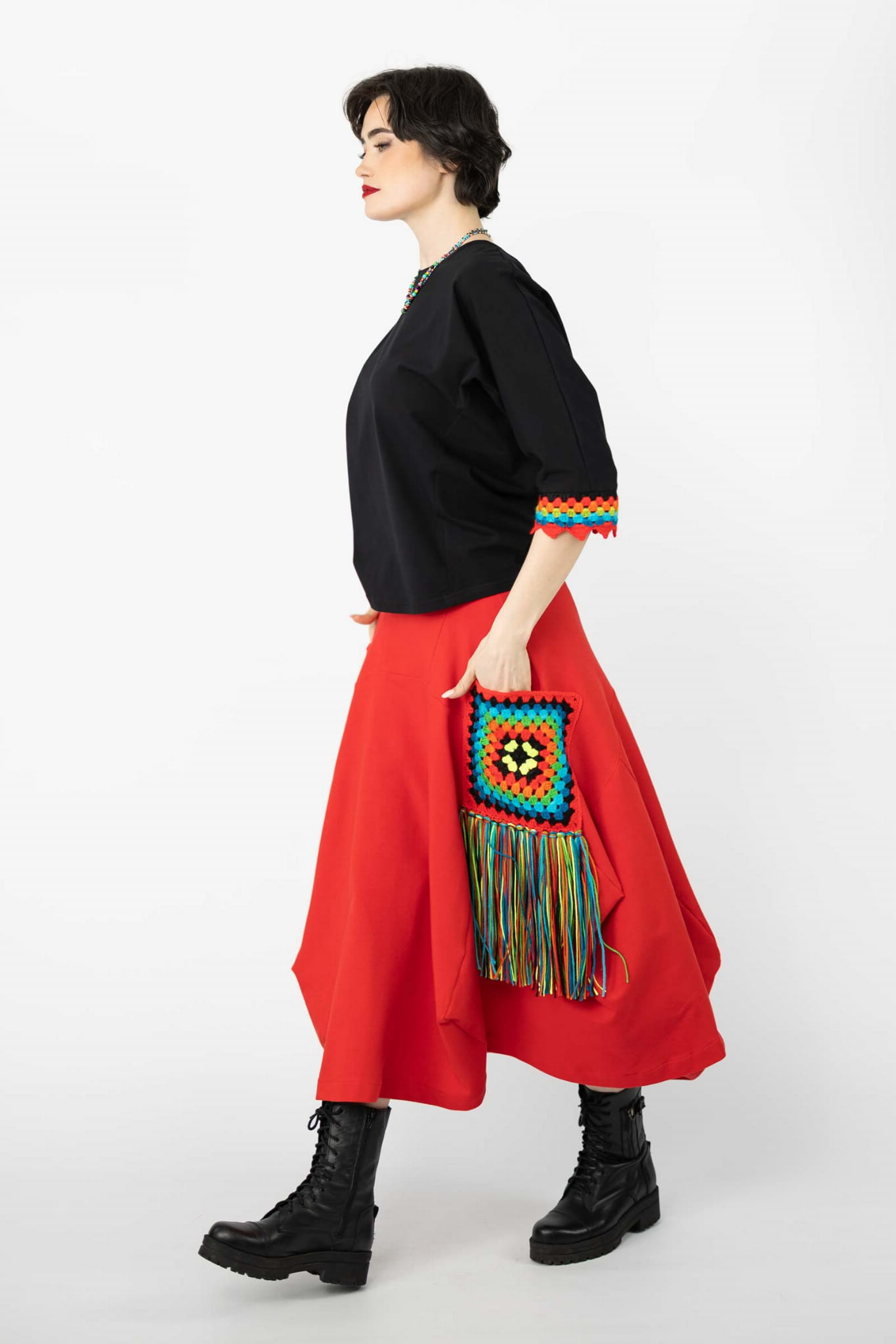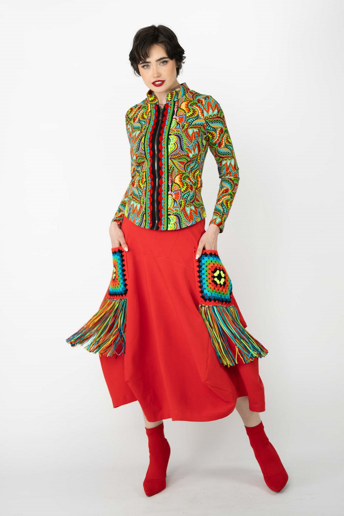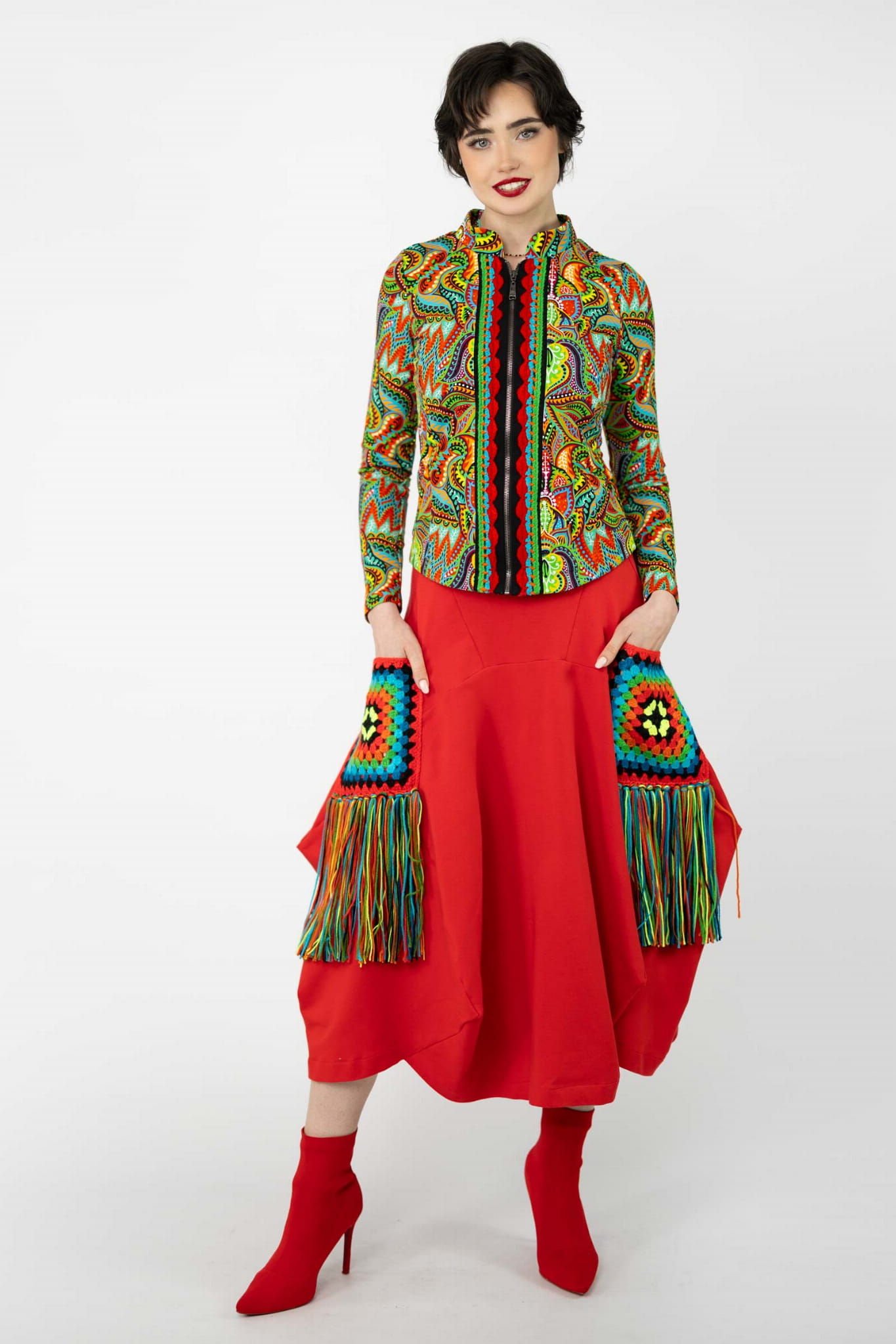 Spódnica czerwona, origami z szydełkowymi kieszeniami i frędzlami "KGart"
