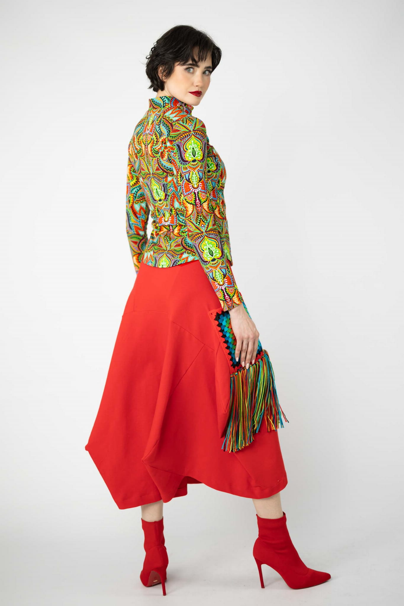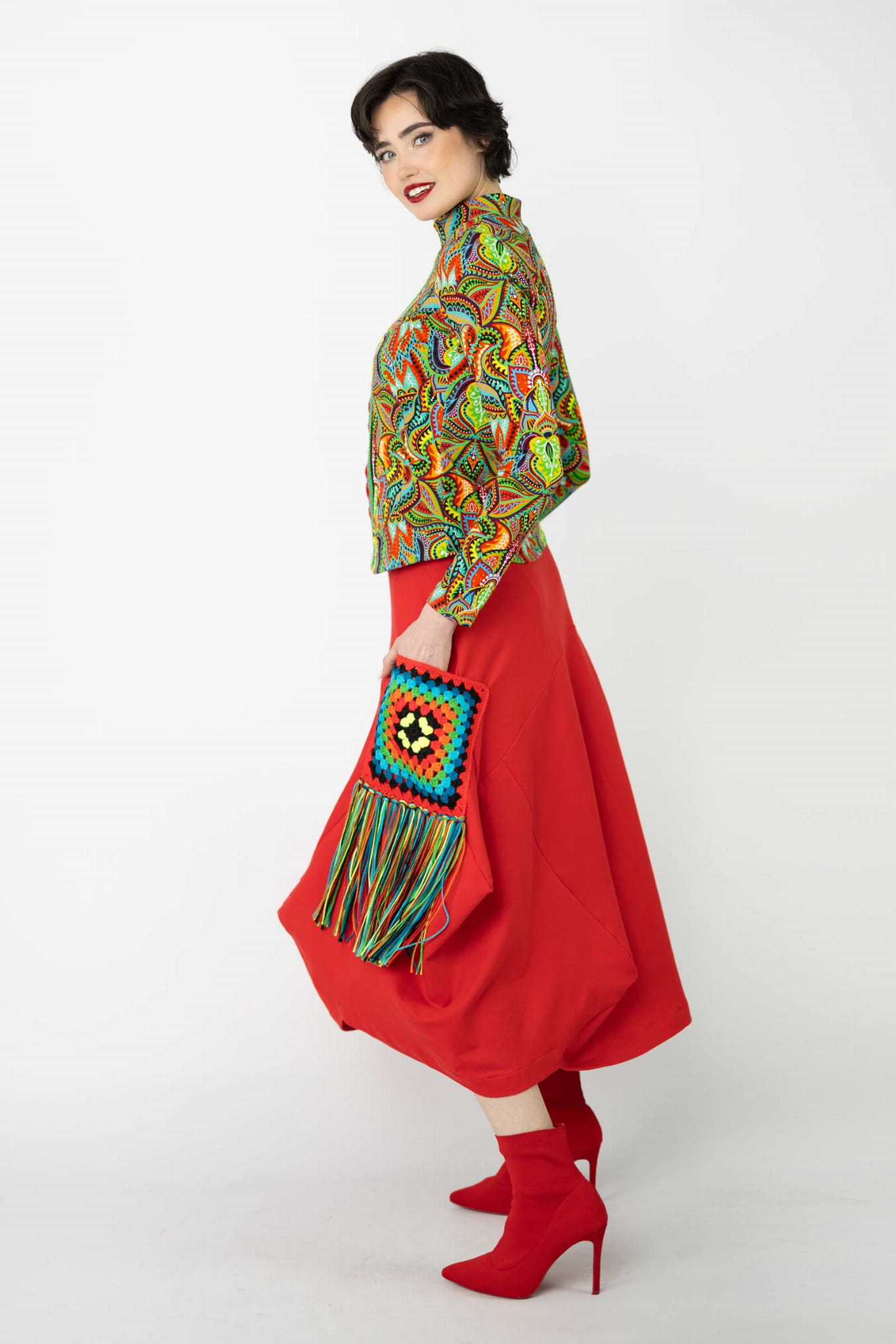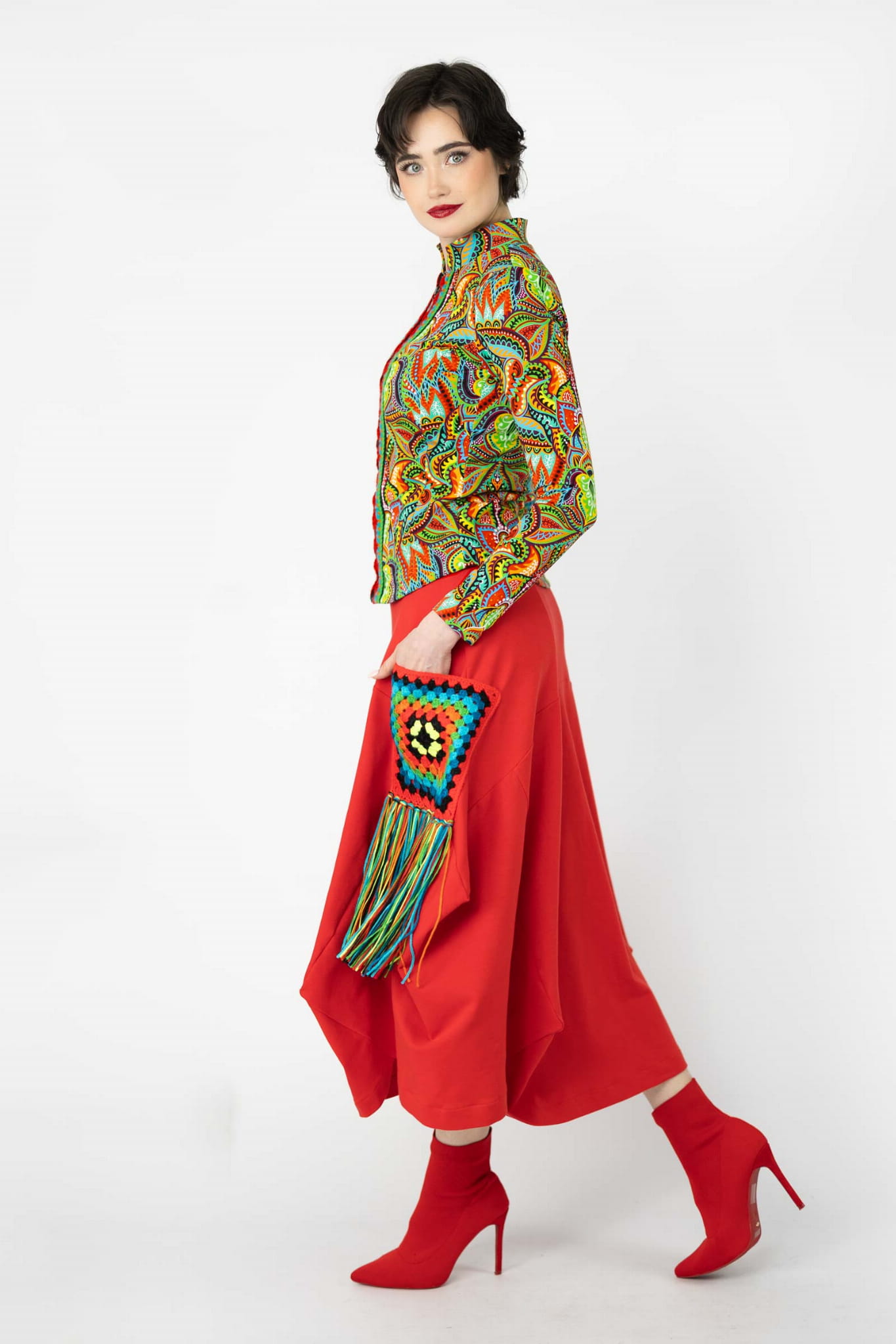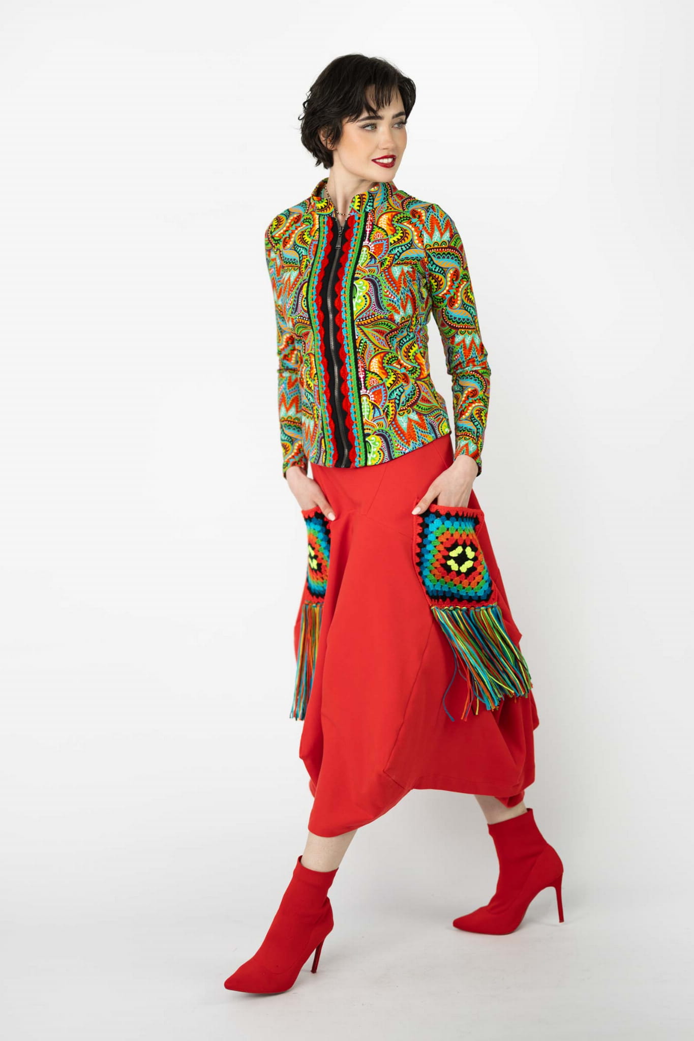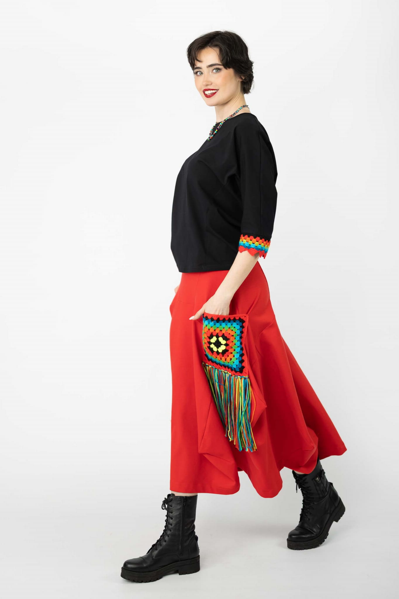 Spódnica czerwona, origami z szydełkowymi kieszeniami i frędzlami "KGart"