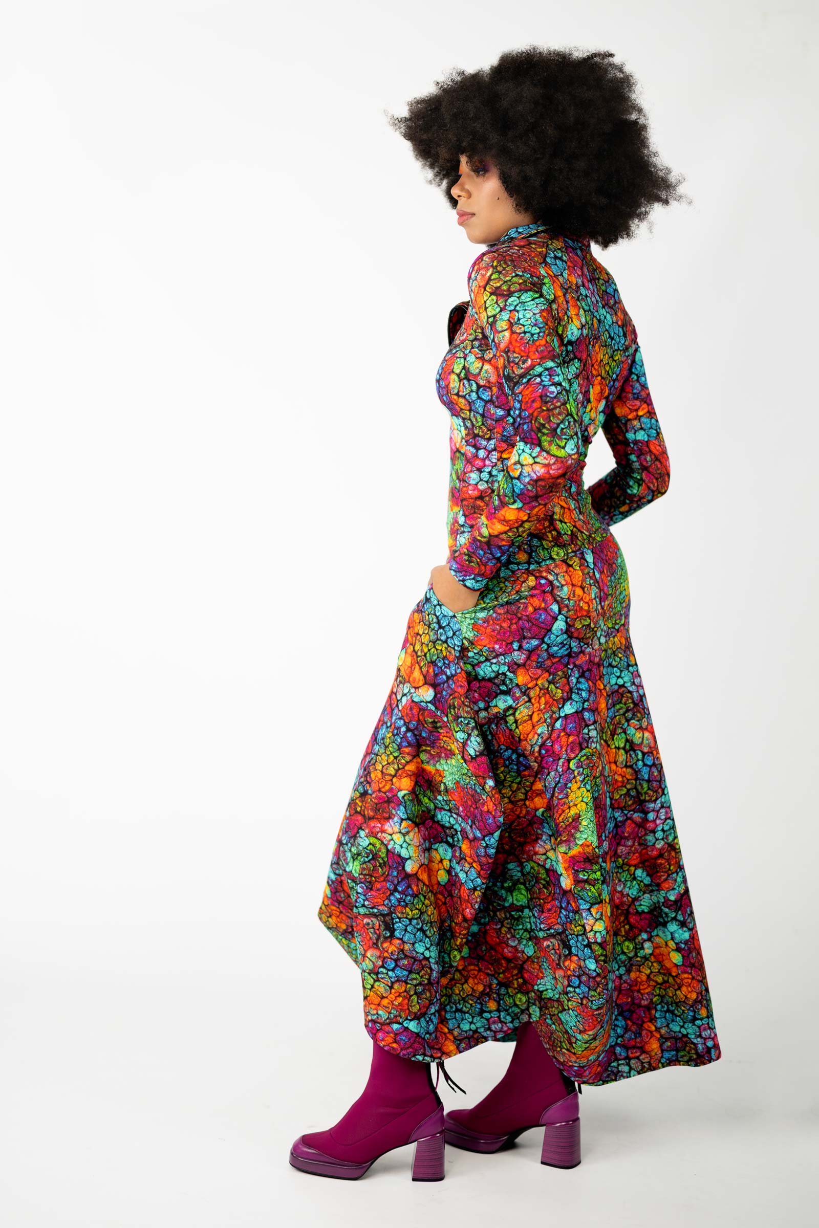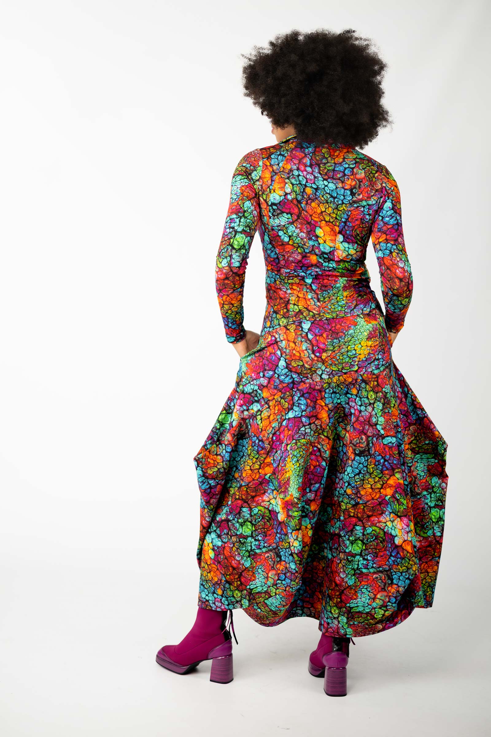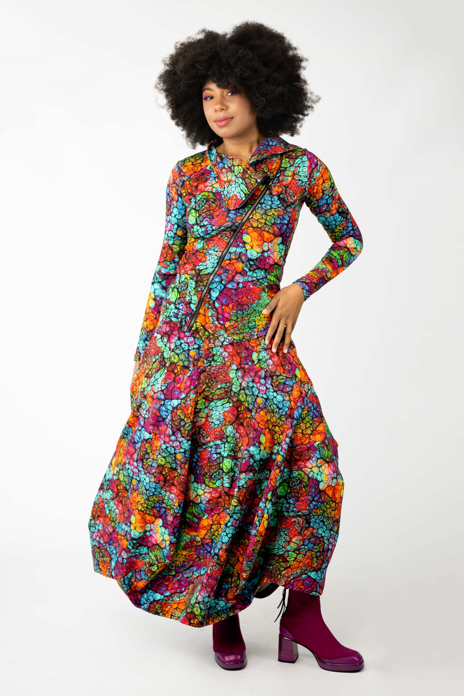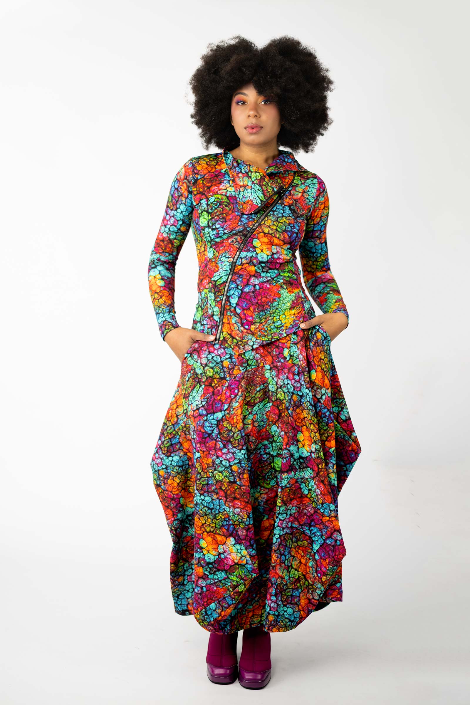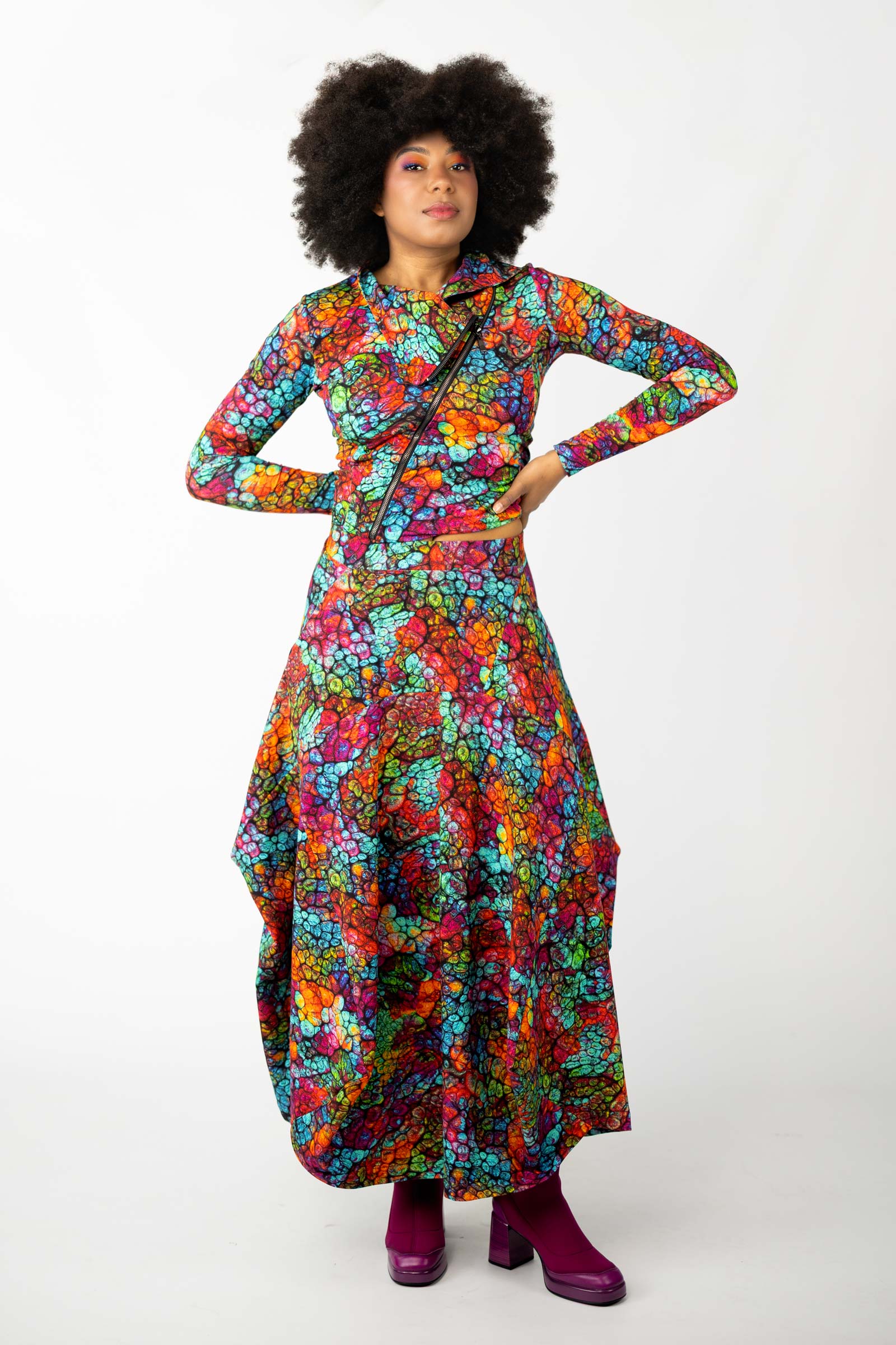 Całość dopełnia autorski wzór materiału, stworzony specjalnie przez właścicielkę marki. Ten unikalny projekt dostępny jest wyłącznie u nas, co sprawia, że każda spódnica jest jedyna w swoim rodzaju.