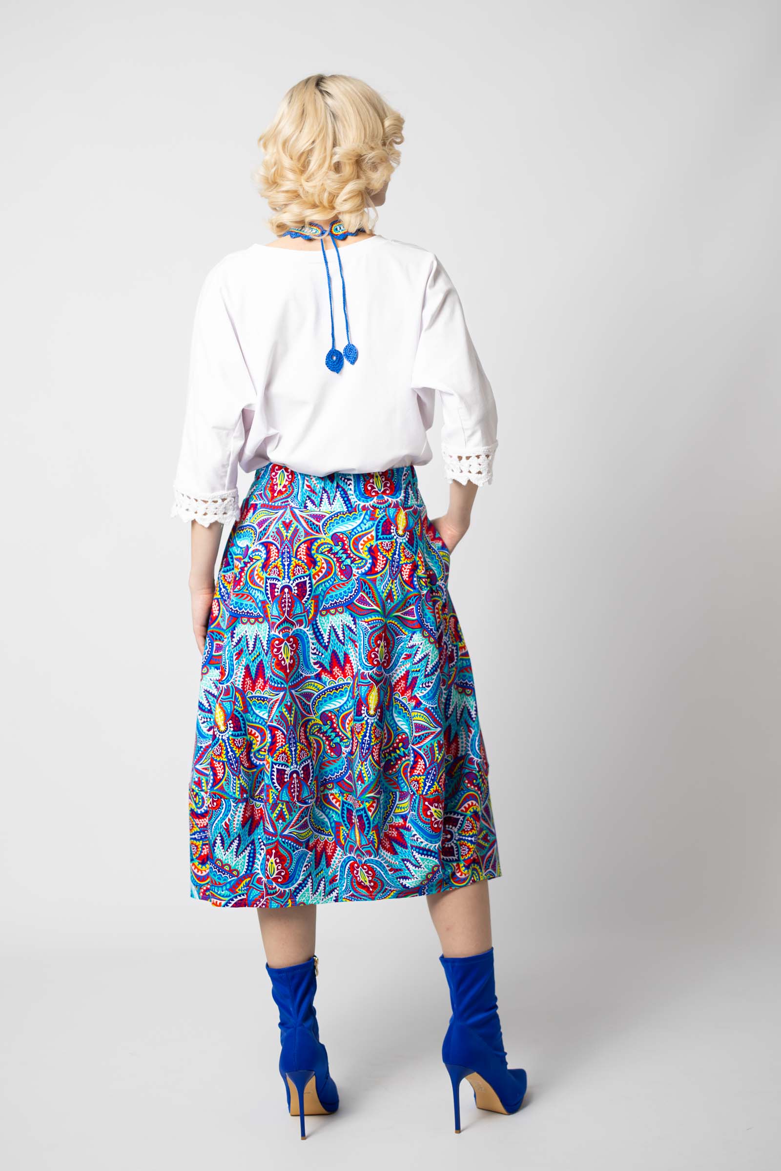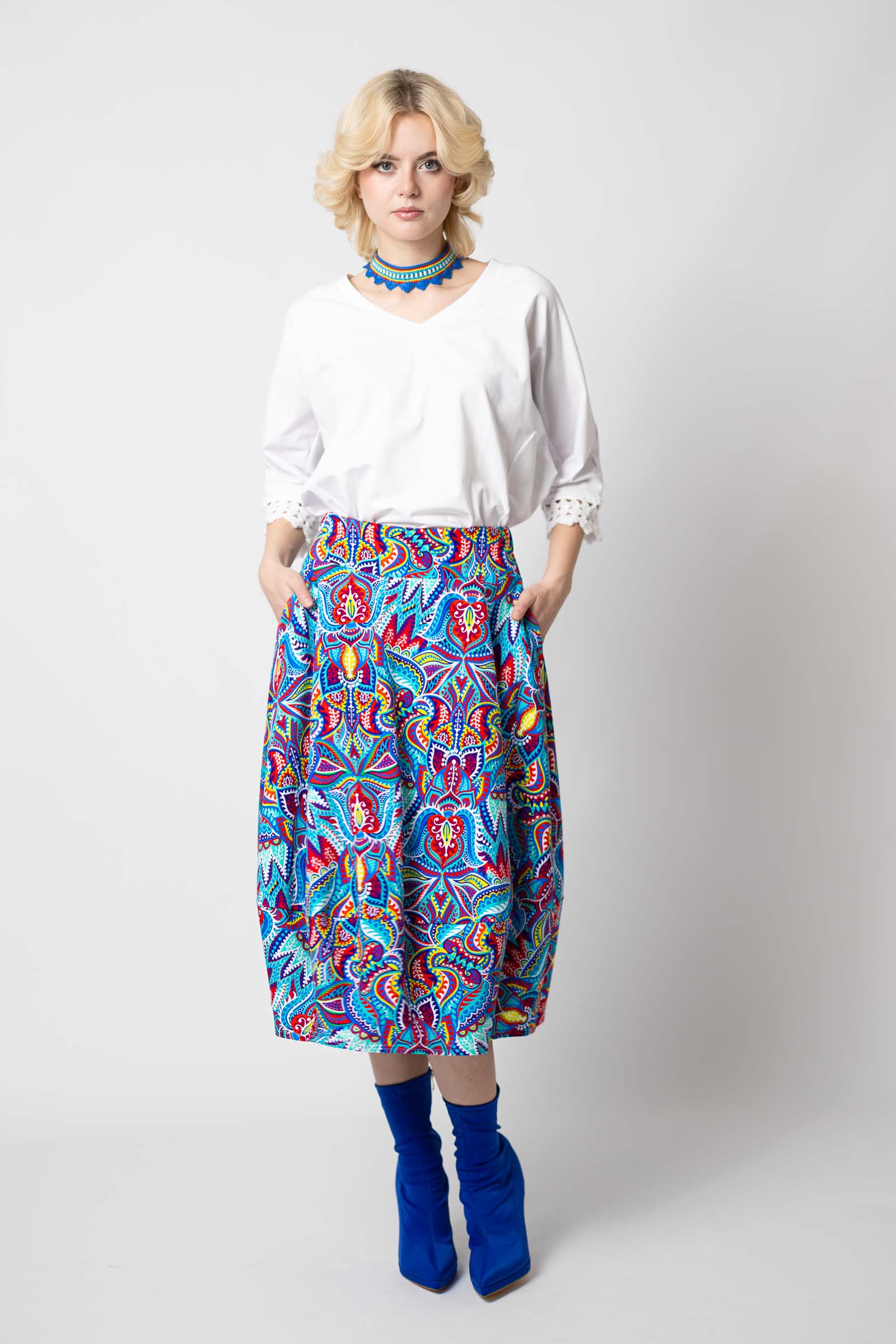Największym atutem jest jednak jej efektowny wygląd. Autorski wzór materiału zaprojektowany przez twórczynię marki Katarzynę Gałaj sprawia, że spódnica przyciąga uwagę i nadaje stylizacji wyjątkowego charakteru.