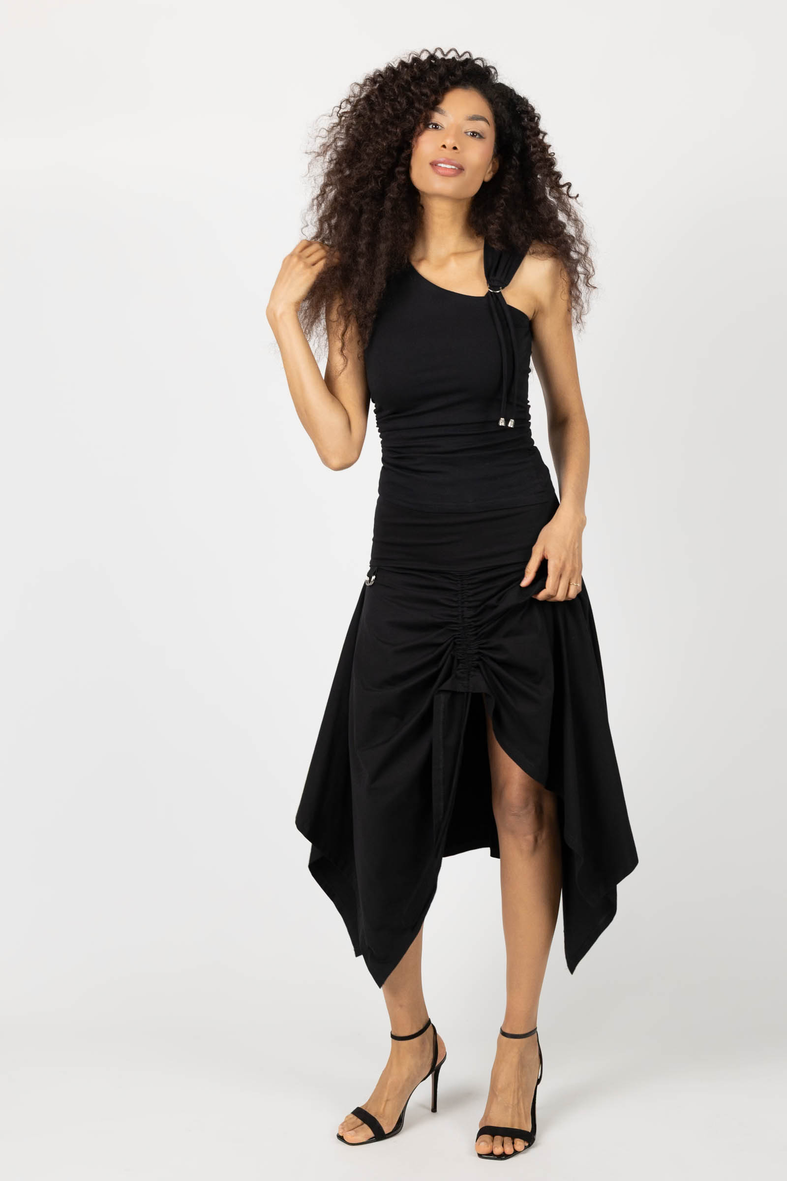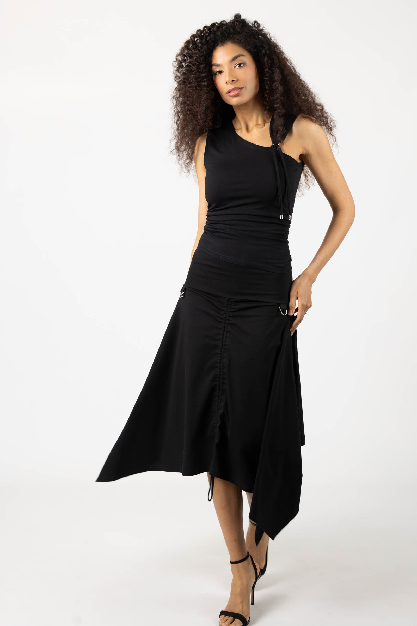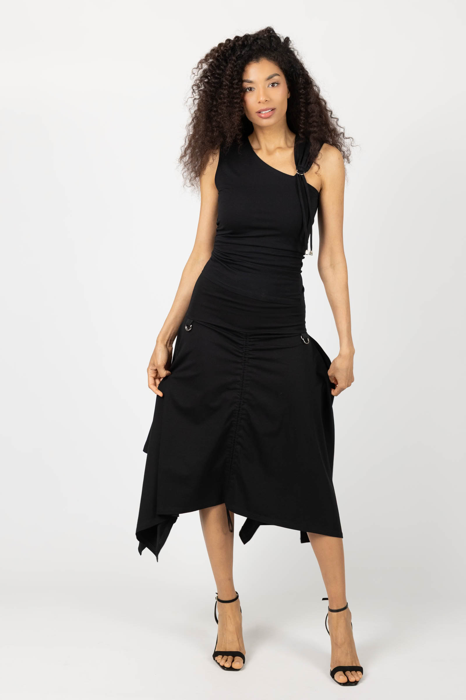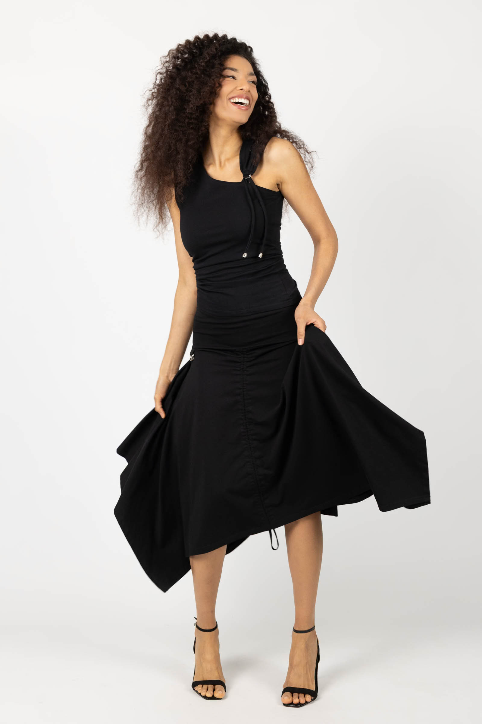 Spódnica o awangardowym kroju, z wydłużonymi bokami, które nadają sylwetce dynamiczną, nieoczywistą linię. Forma miękko układa się na ciele i pracuje w ruchu.