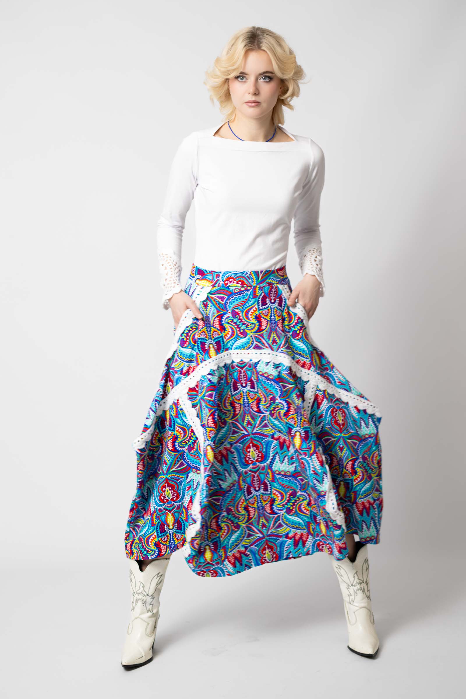 To połączenie przemyślanej formy i rękodzieła, w którym widać czas, pracę i uważność. Spódnica, która jest projektem samym w sobie. Autorska, niepowtarzalna.