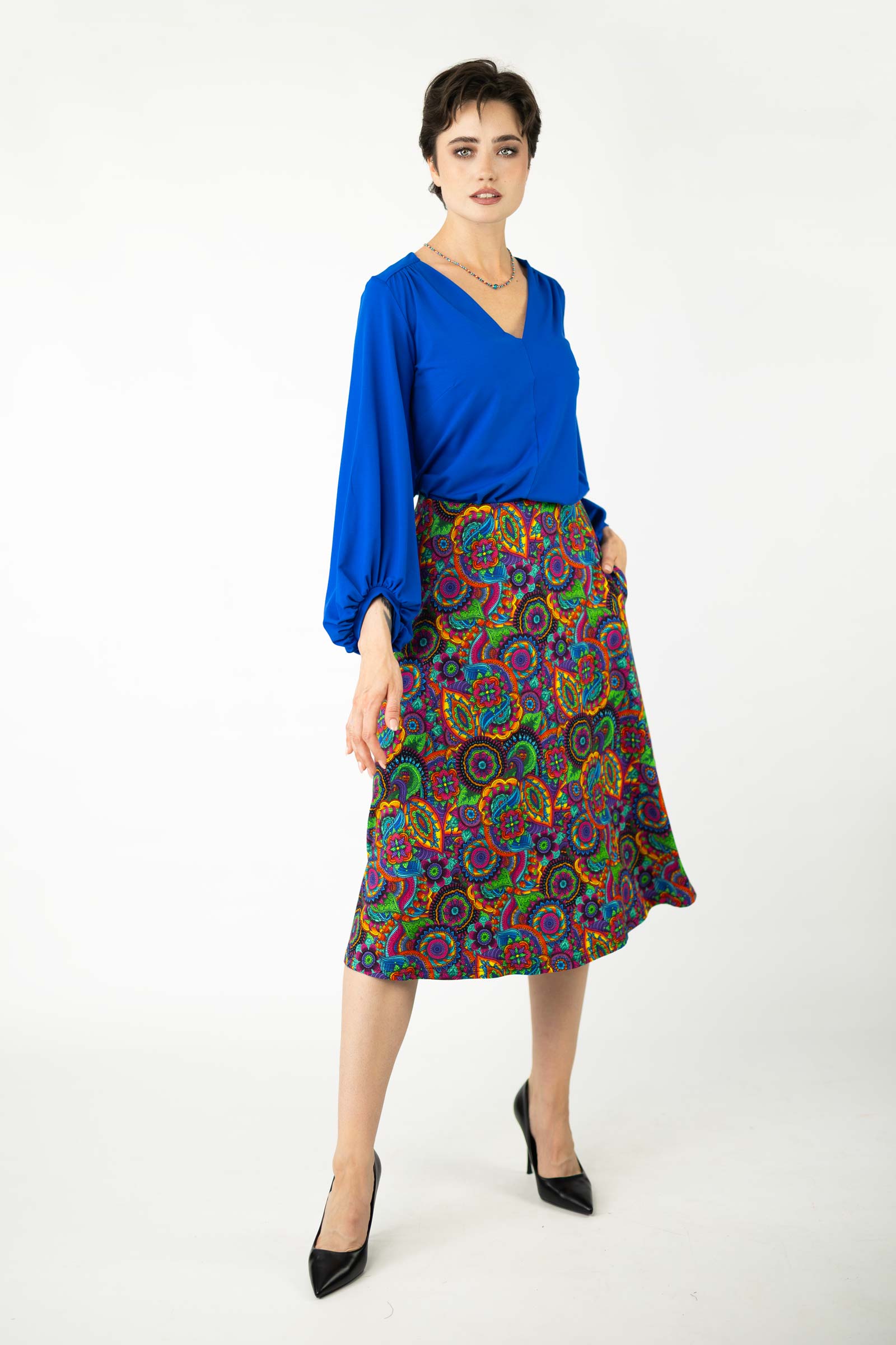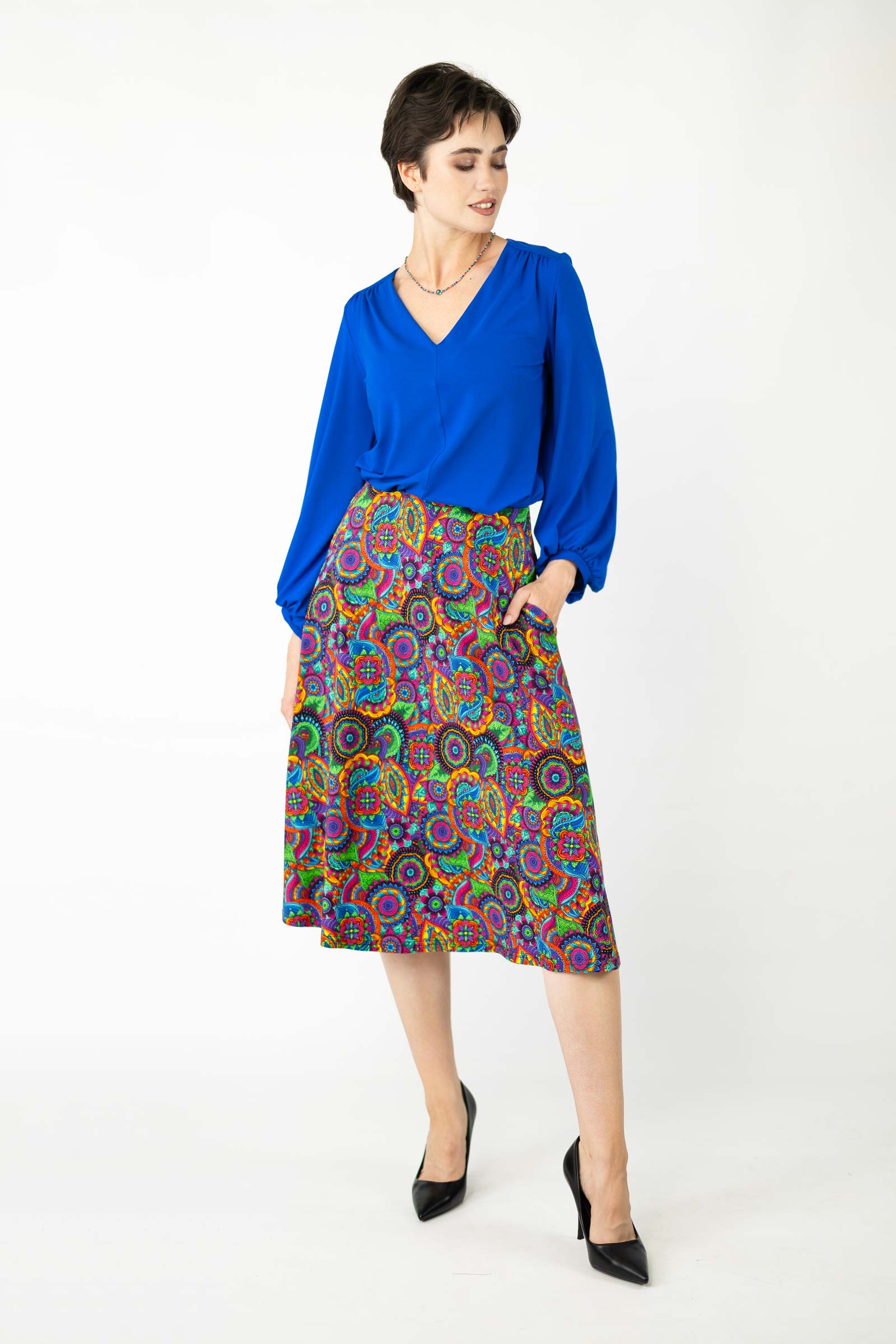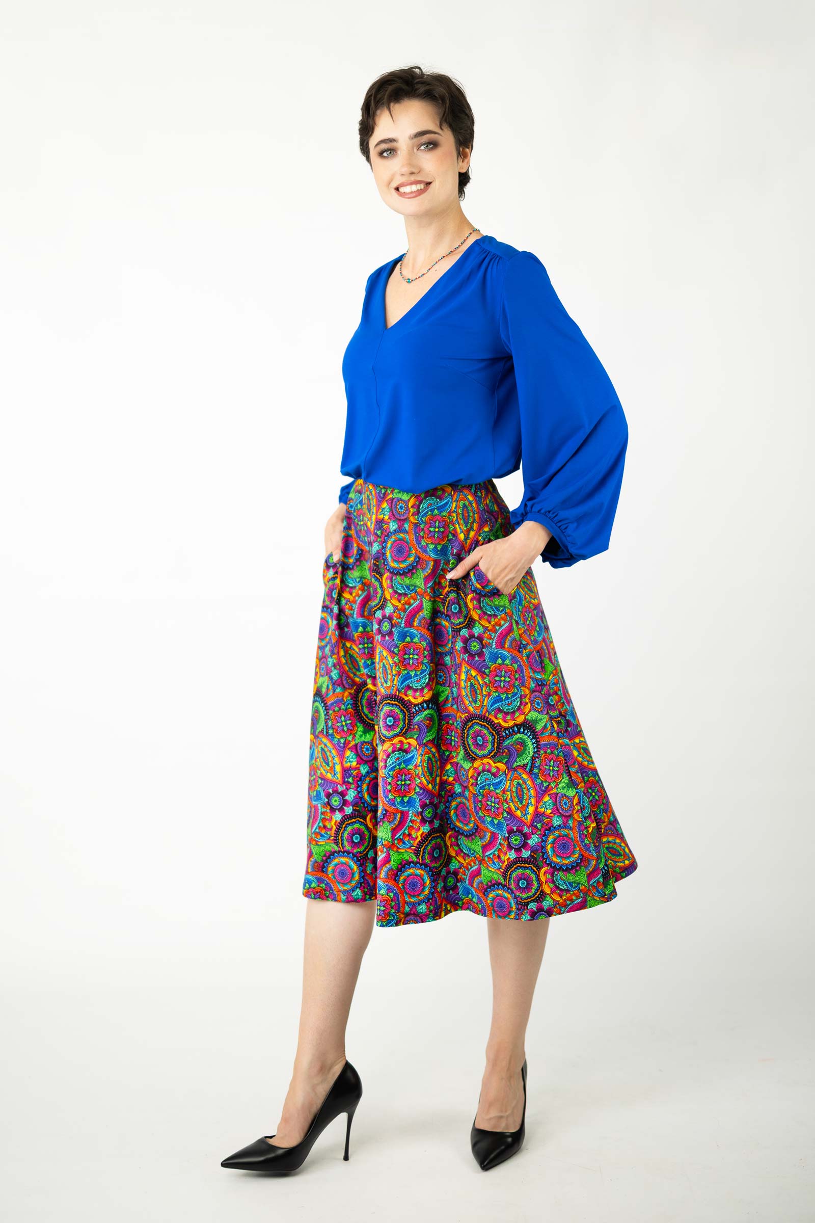 Największym atutem jest jednak jej efektowny wygląd. Autorski wzór materiału zaprojektowany przez twórczynię marki Katarzynę Gałaj sprawia, że spódnica przyciąga uwagę i nadaje stylizacji wyjątkowego charakteru.