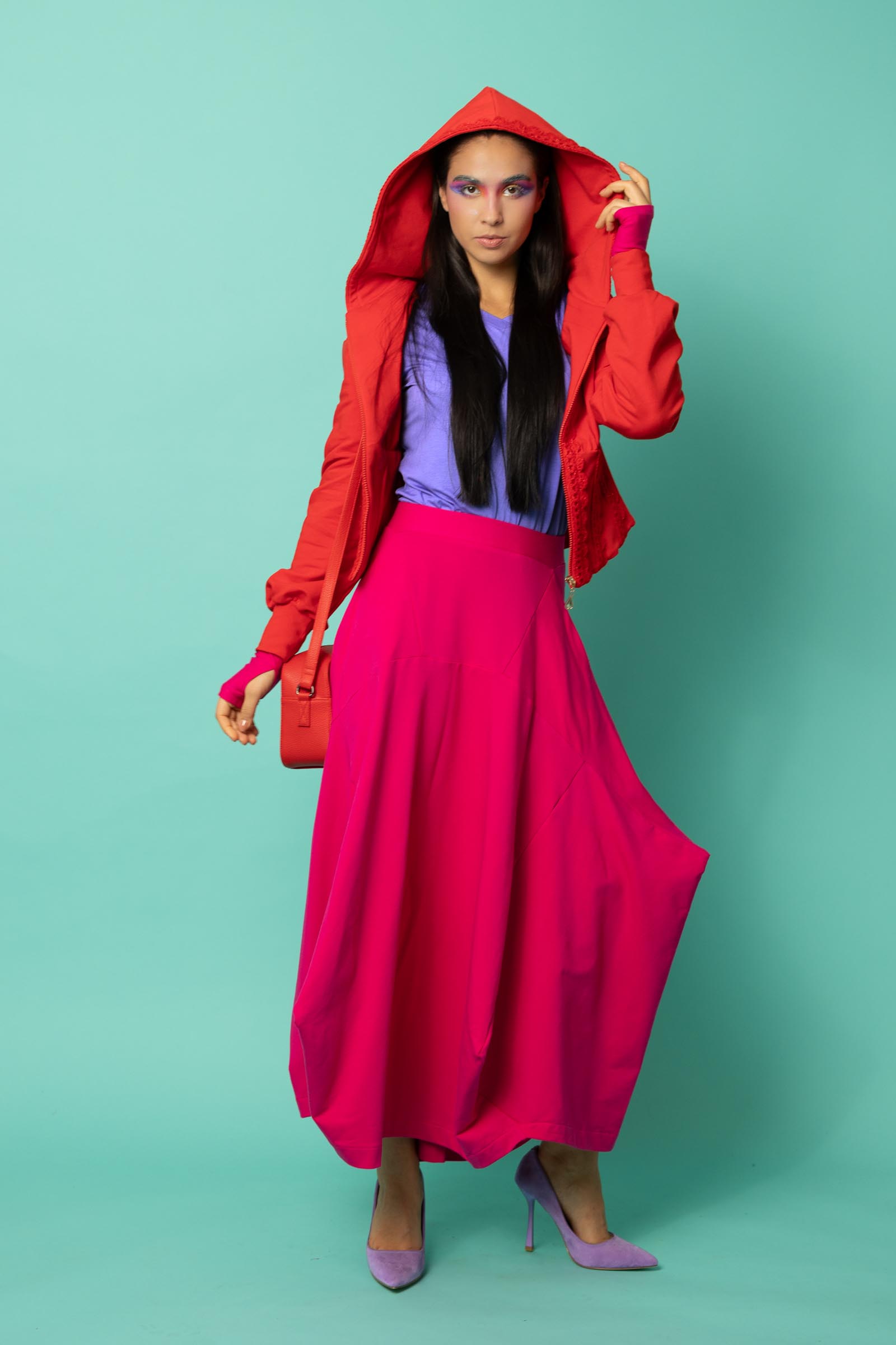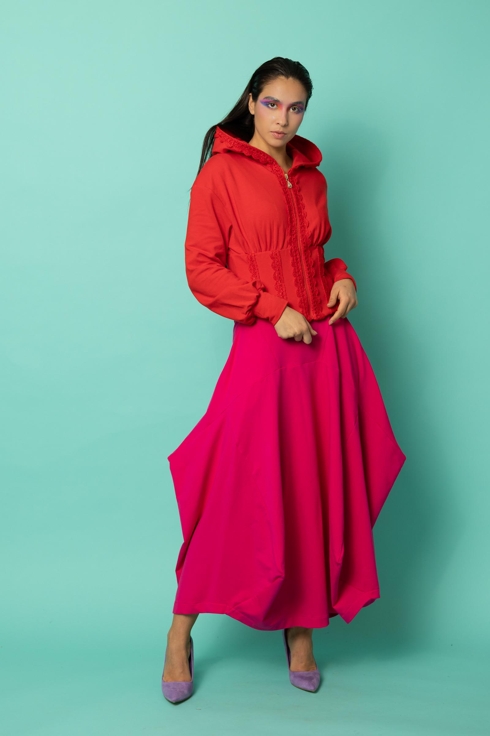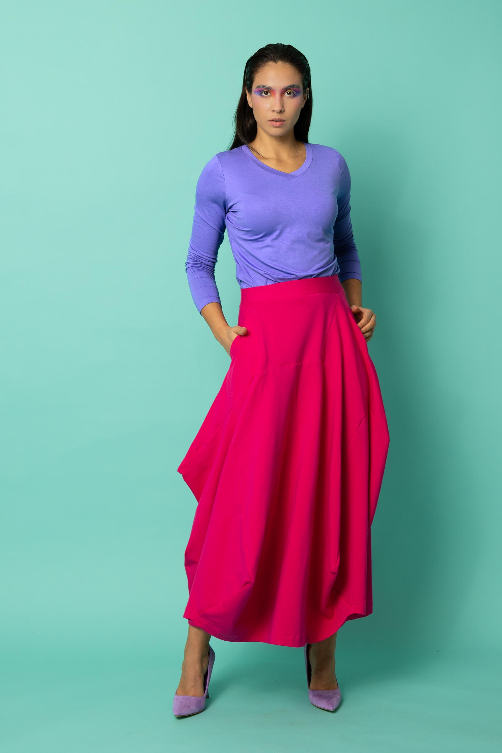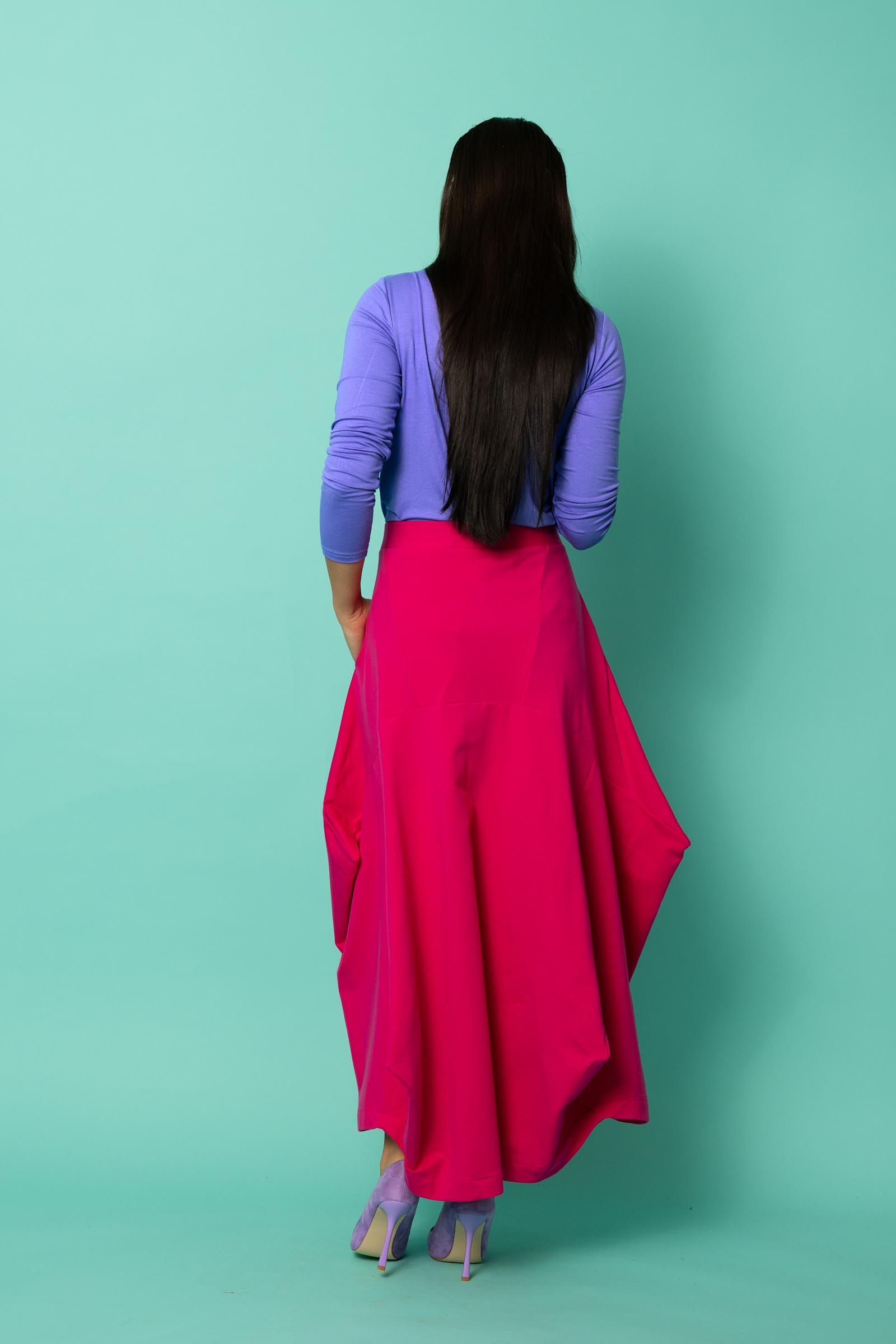 Ta spódnica to odważne połączenie oryginalnego designu i funkcjonalności. Jej awangardowy krój inspirowany sztuką origami przyciąga uwagę geometrycznymi załamaniami i nieregularnym dołem, który nadaje sylwetce dynamiki i lekkości. To propozycja dla kobiet, które lubią wychodzić poza schematy i eksperymentować z modą.