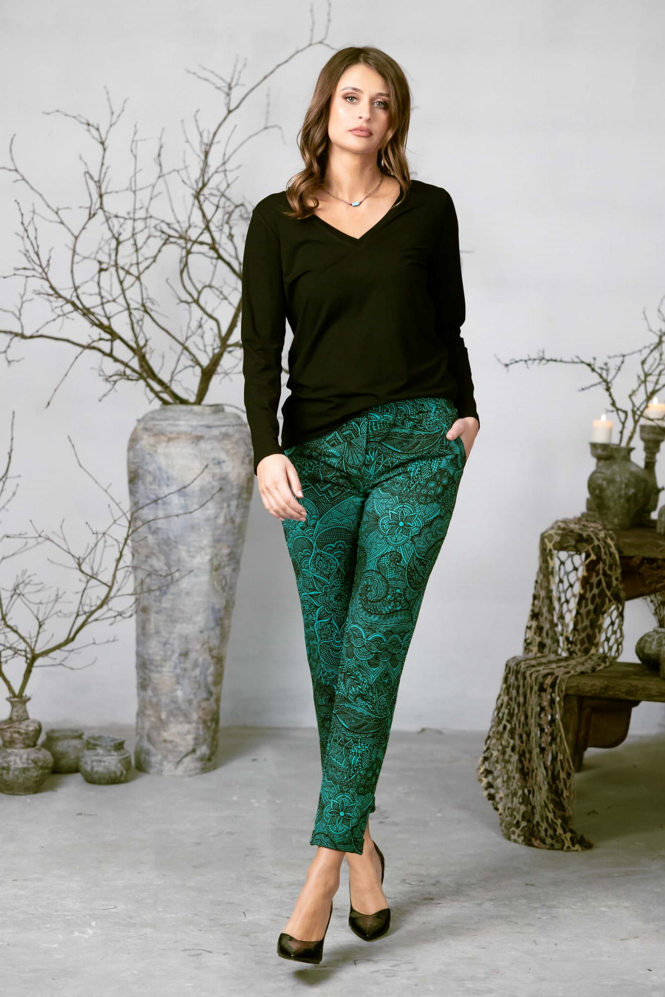 Te spodnie to idealna propozycja dla kobiet, które cenią sobie wygodę i modny styl. Ich klasyczny fason sprawia, że są idealne zarówno do pracy, jak i na bardziej formalne okazje. Wywinięte mankiety na dole dodają im oryginalności, a autorski wzór materiału sprawia, że są wyjątkowe i wyróżniają się spośród innych modeli na rynku.