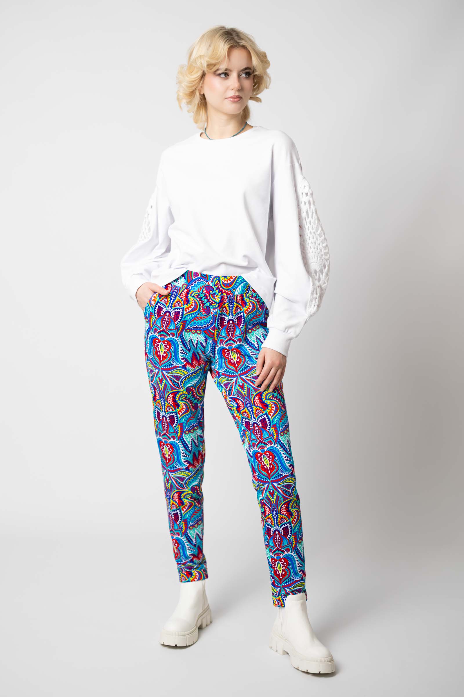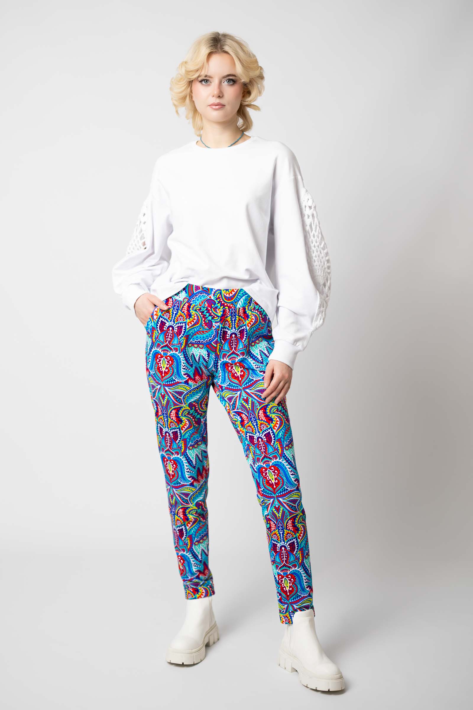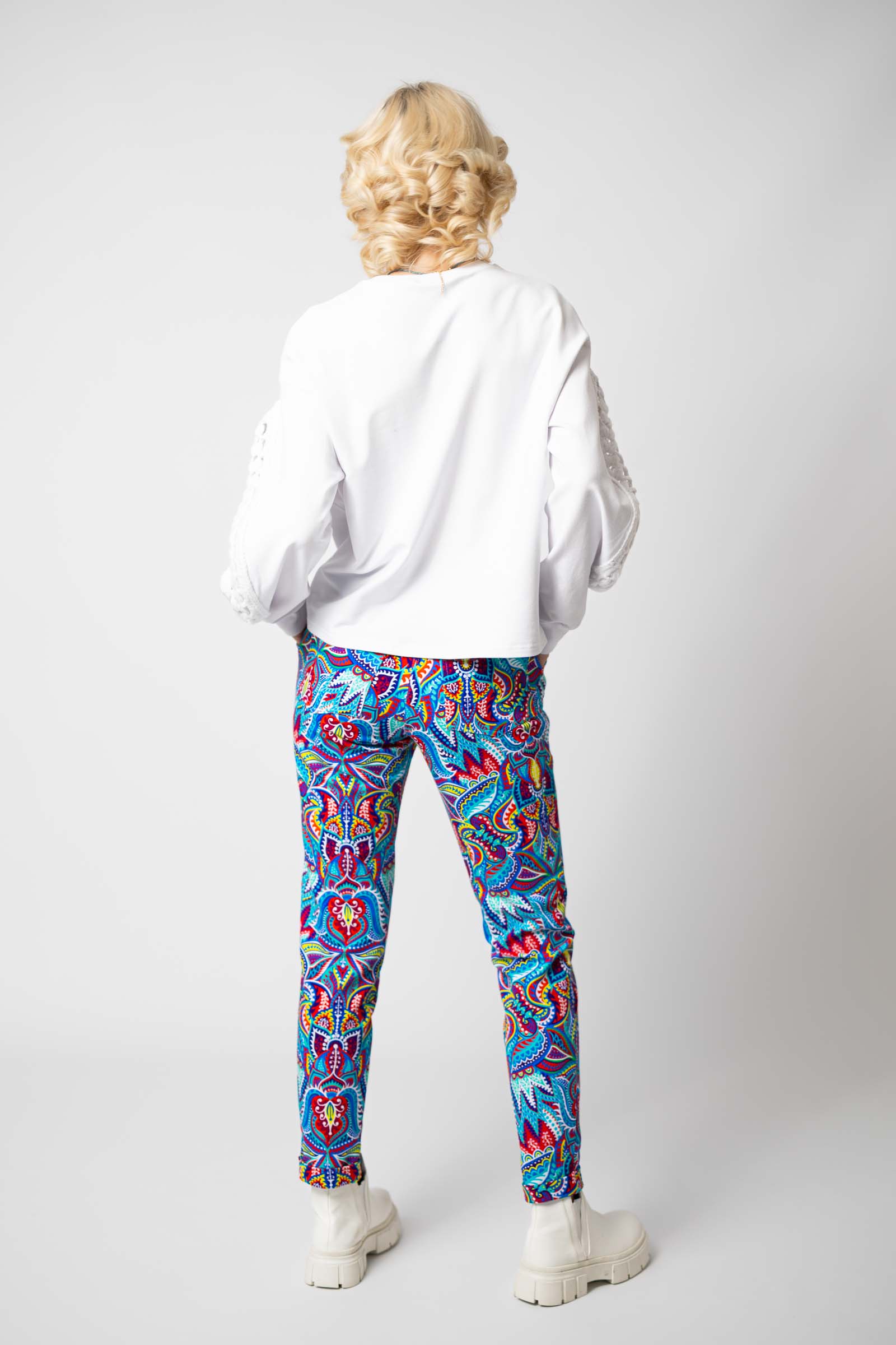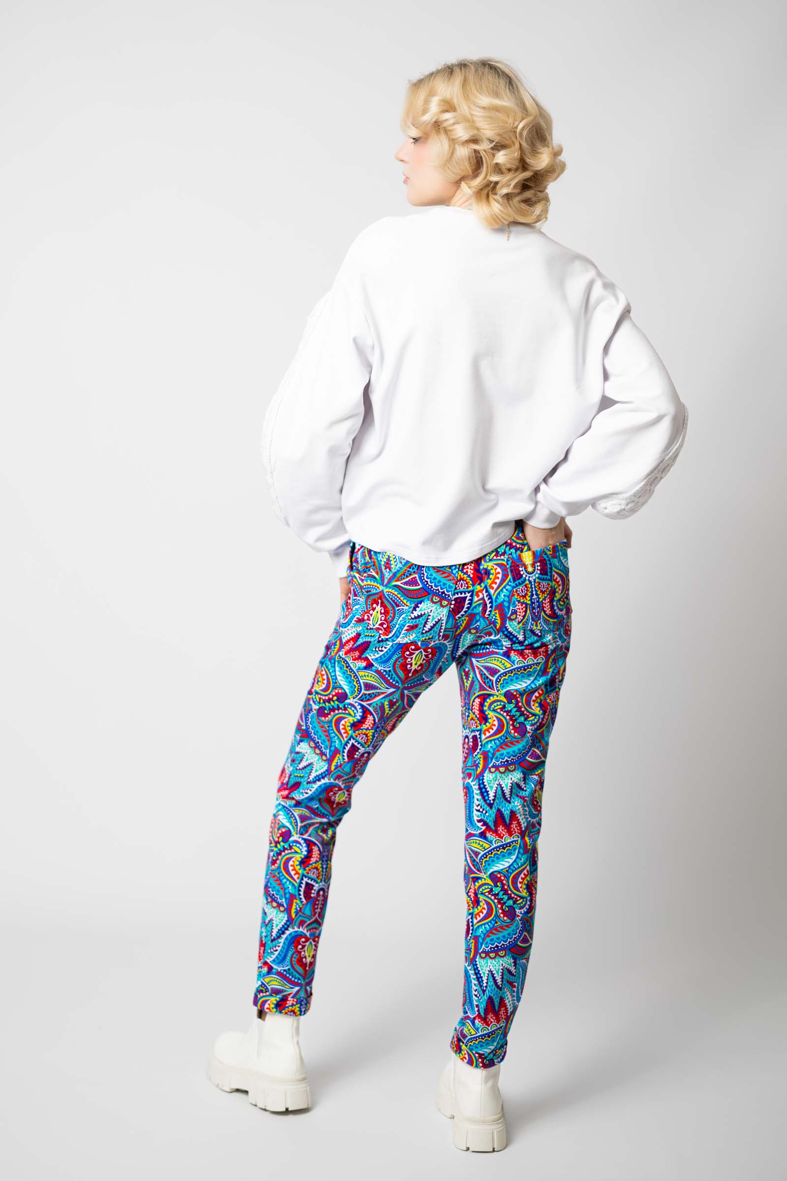 Spodnie zostały uszyte w Polsce, a konkretnie w naszej pracowni w Legionowie, co gwarantuje wysoką jakość wykonania. Autorski wzór materiału zaprojektowany przez właścicielkę i twórczynię marki Katarzynę Gałaj sprawia, że spodnie są unikalne i niepowtarzalne.