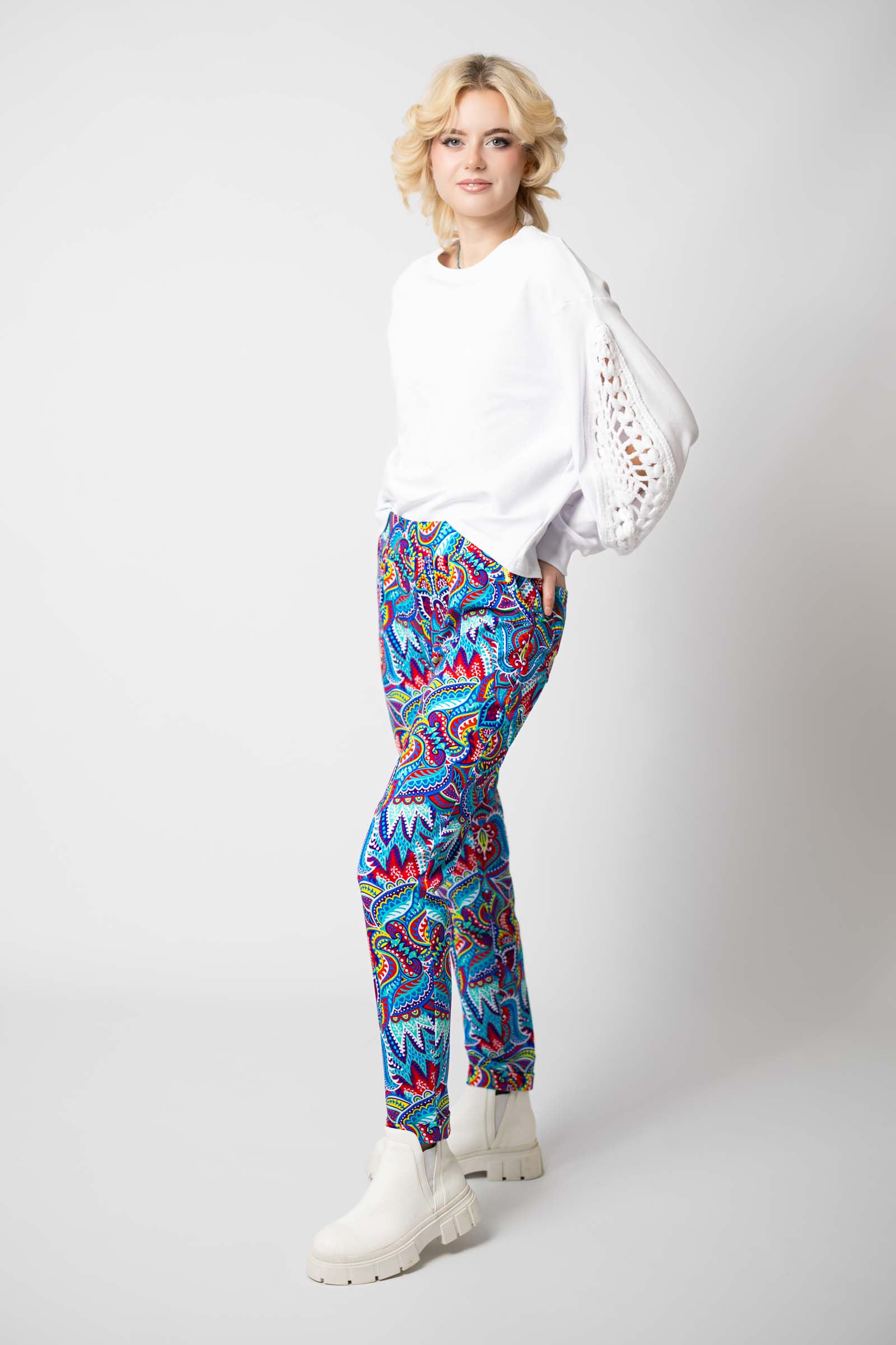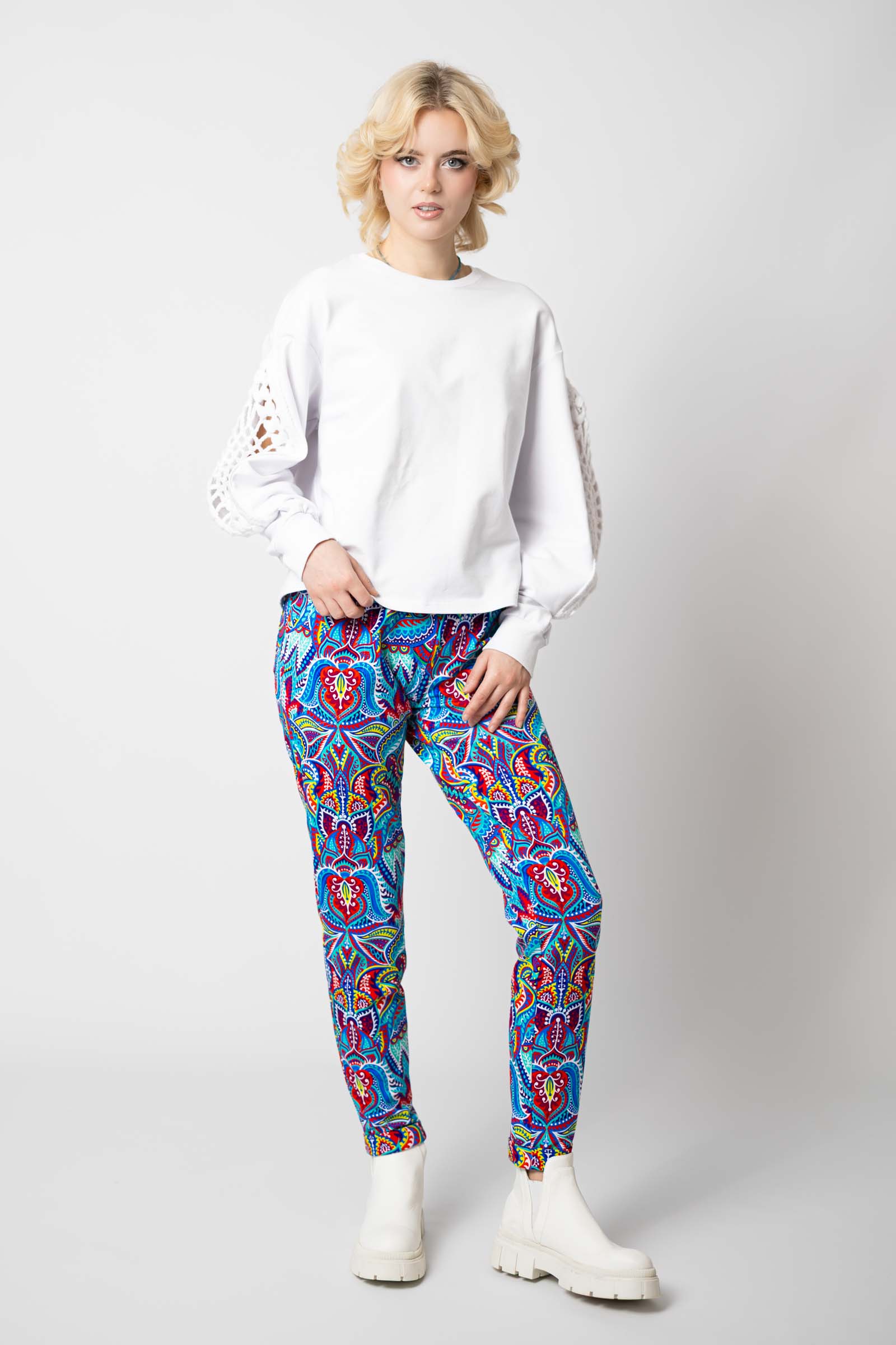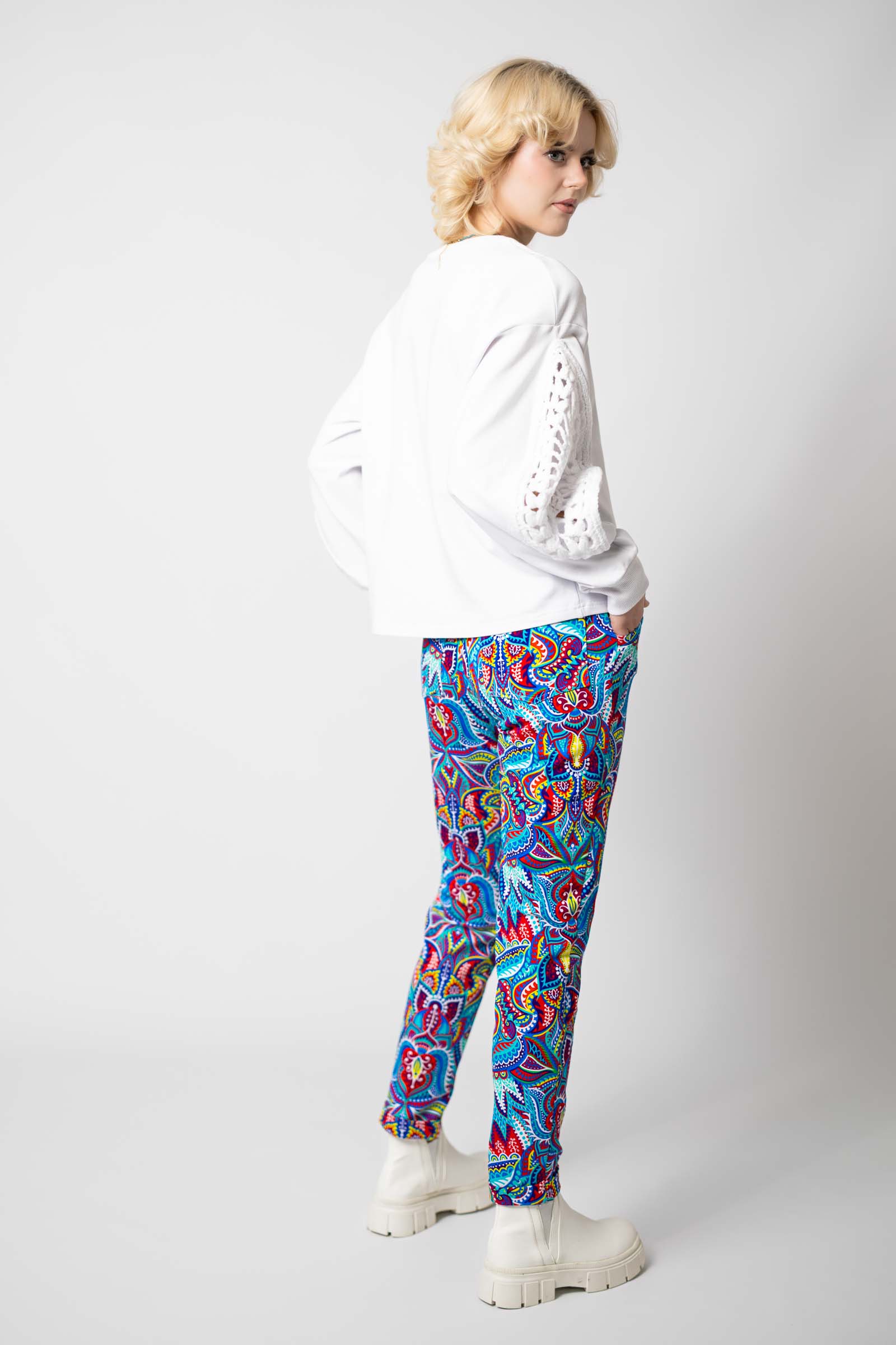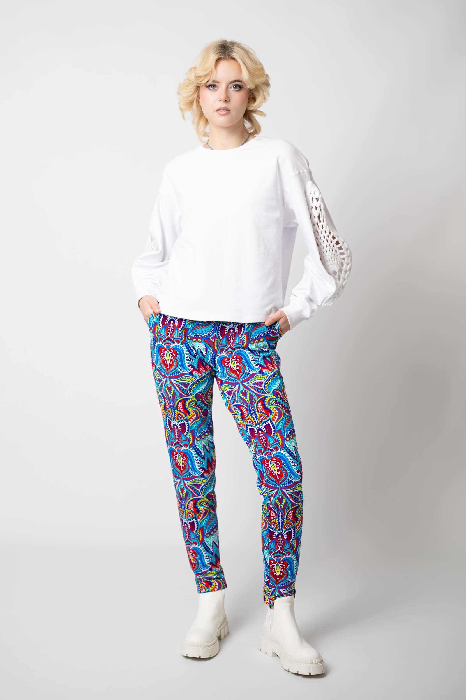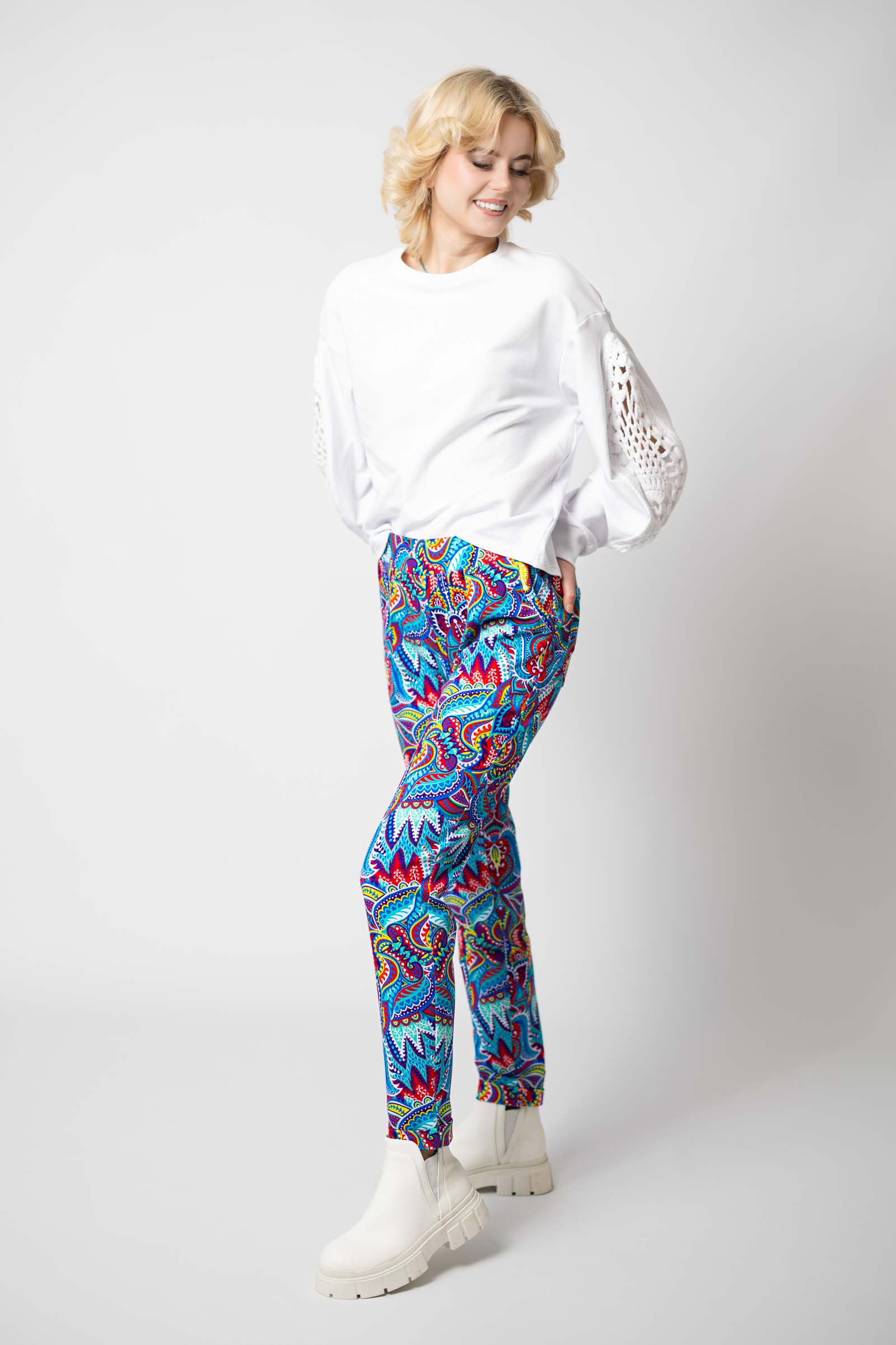 Spodnie zostały uszyte w Polsce, a konkretnie w naszej pracowni w Legionowie, co gwarantuje wysoką jakość wykonania. Autorski wzór materiału zaprojektowany przez właścicielkę i twórczynię marki Katarzynę Gałaj sprawia, że spodnie są unikalne i niepowtarzalne.