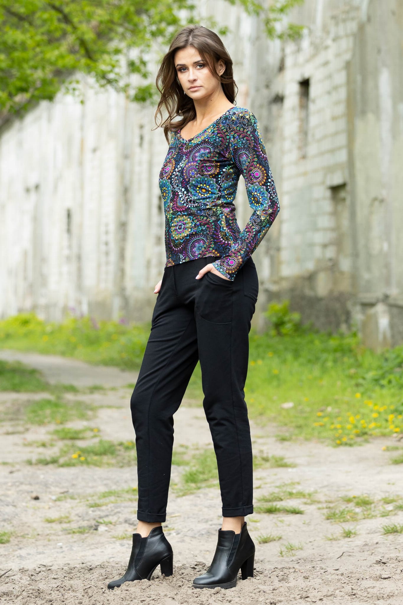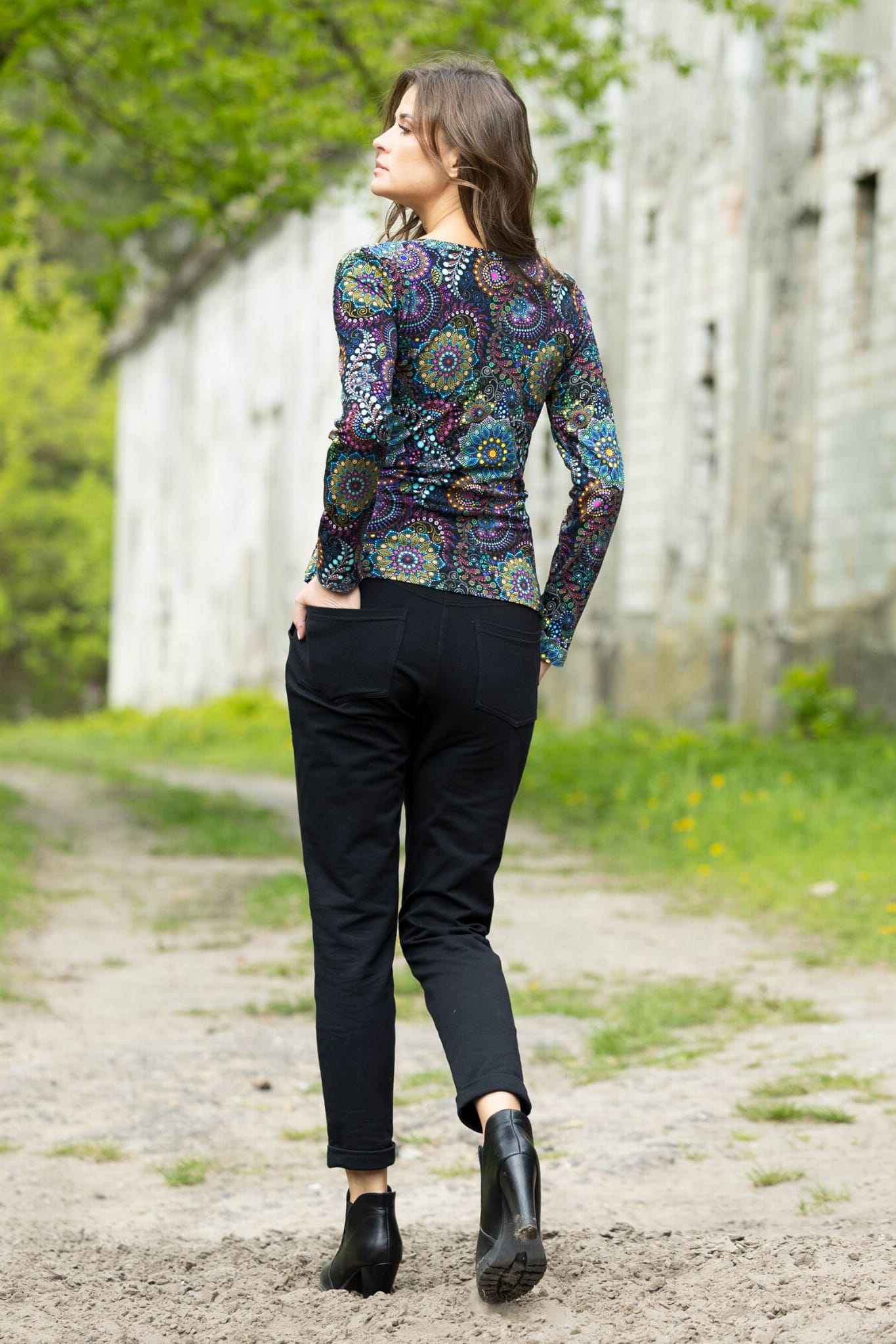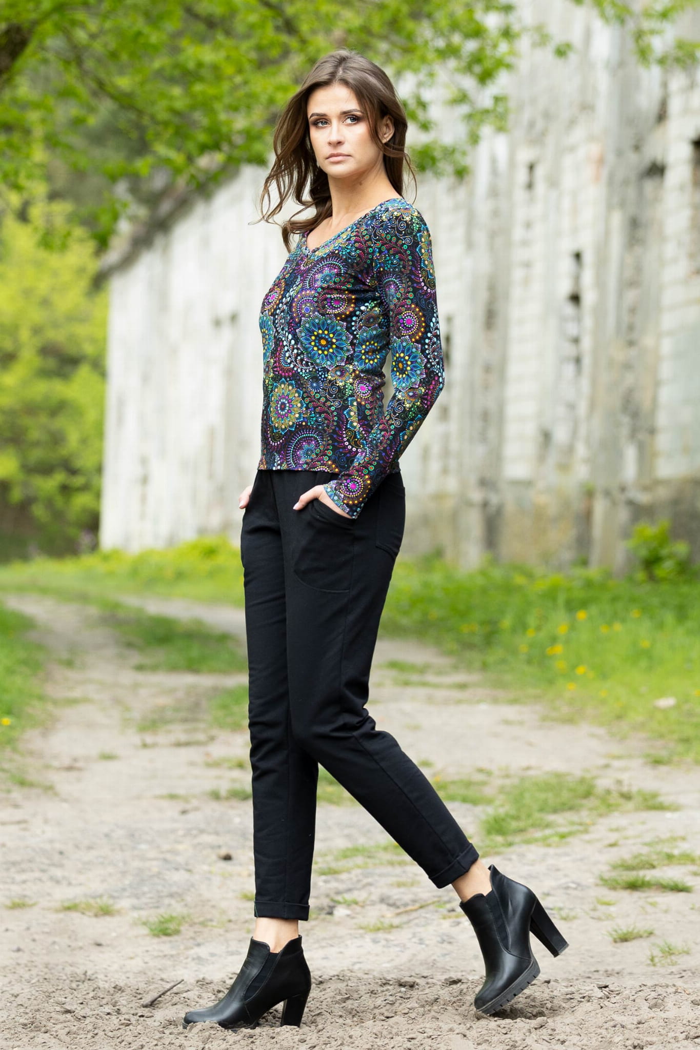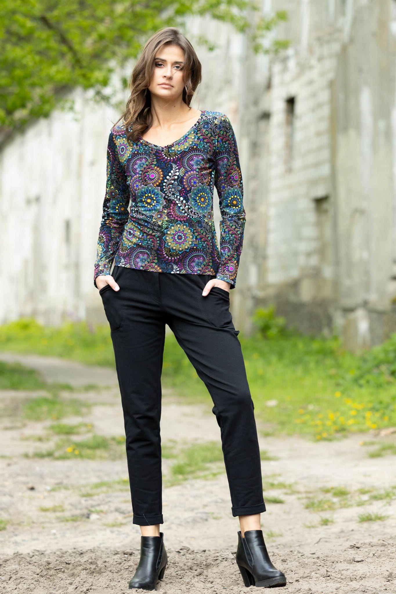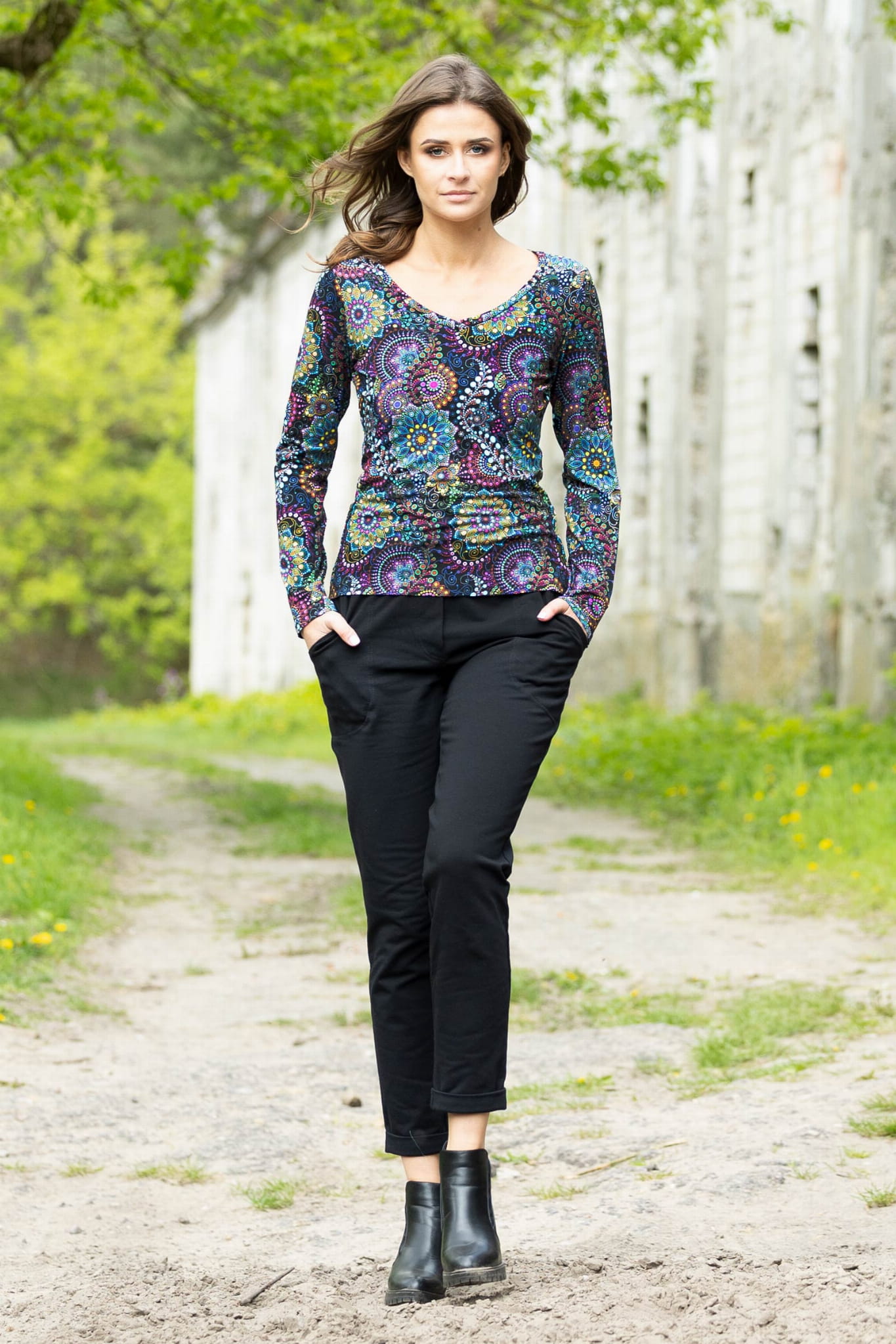 Spodnie zostały uszyte w Polsce, a konkretnie w naszej pracowni w Legionowie, co gwarantuje wysoką jakość wykonania. Autorski wzór materiału zaprojektowany przez właścicielkę i twórczynię marki Katarzynę Gałaj sprawia, że spodnie są unikalne i niepowtarzalne.