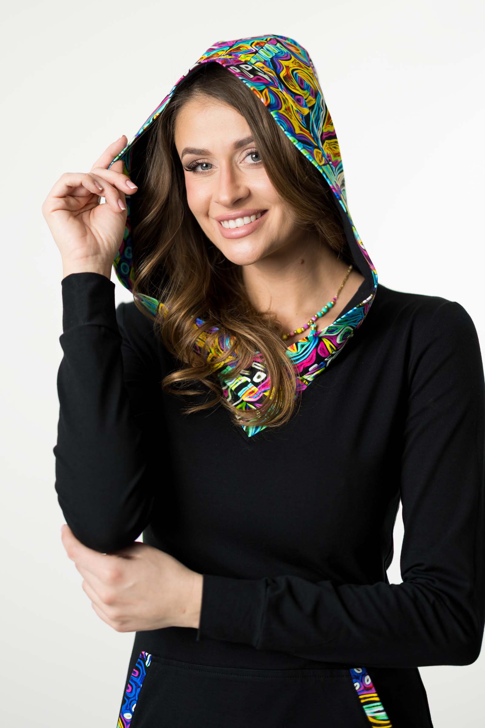 Z przodu znajduje się kieszeń typu kangurka, która nie tylko nadaje modnego wyglądu, ale także pozwala na przechowywanie drobnych przedmiotów, takich jak klucze czy telefon, zawsze pod ręką.