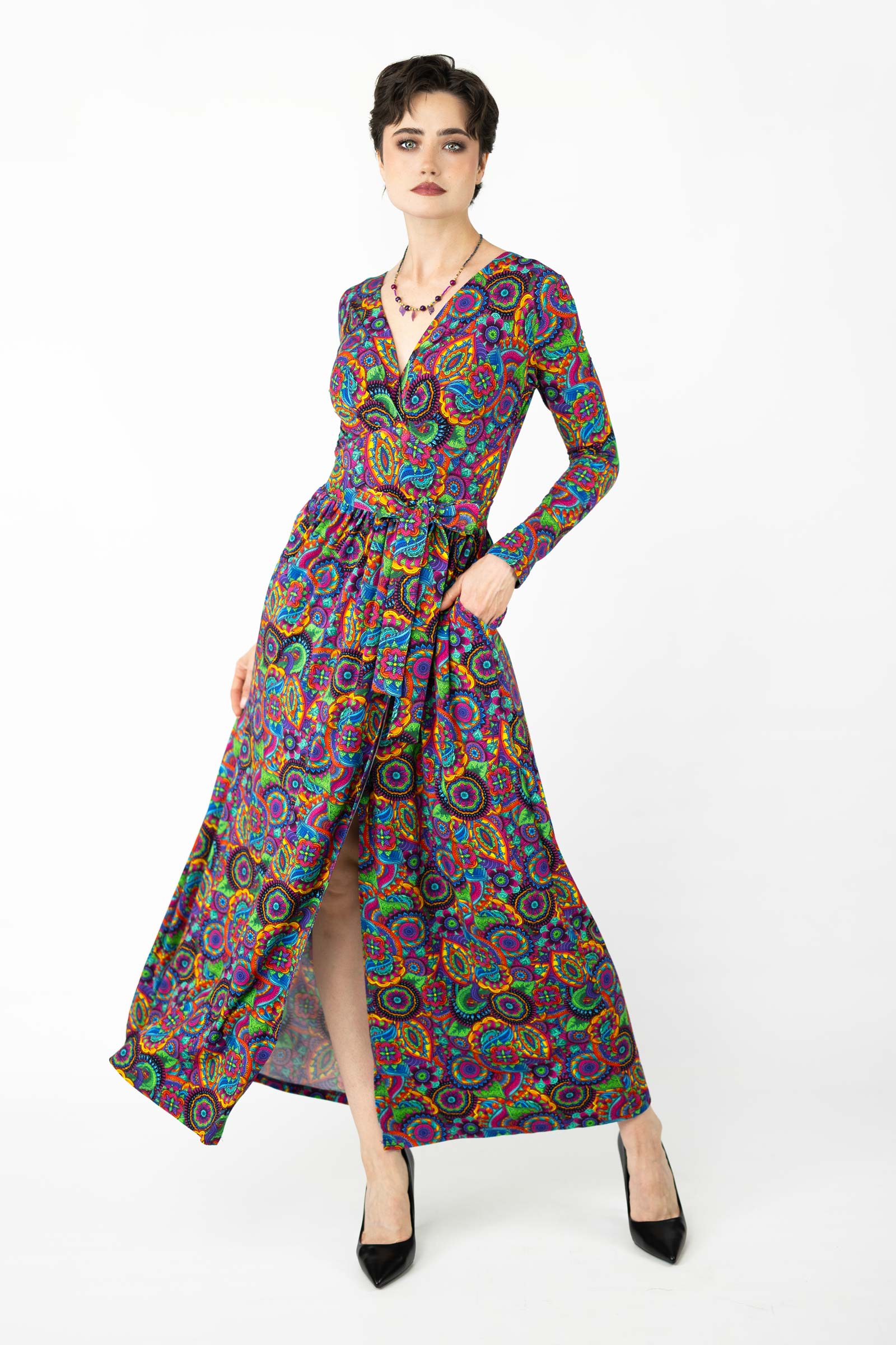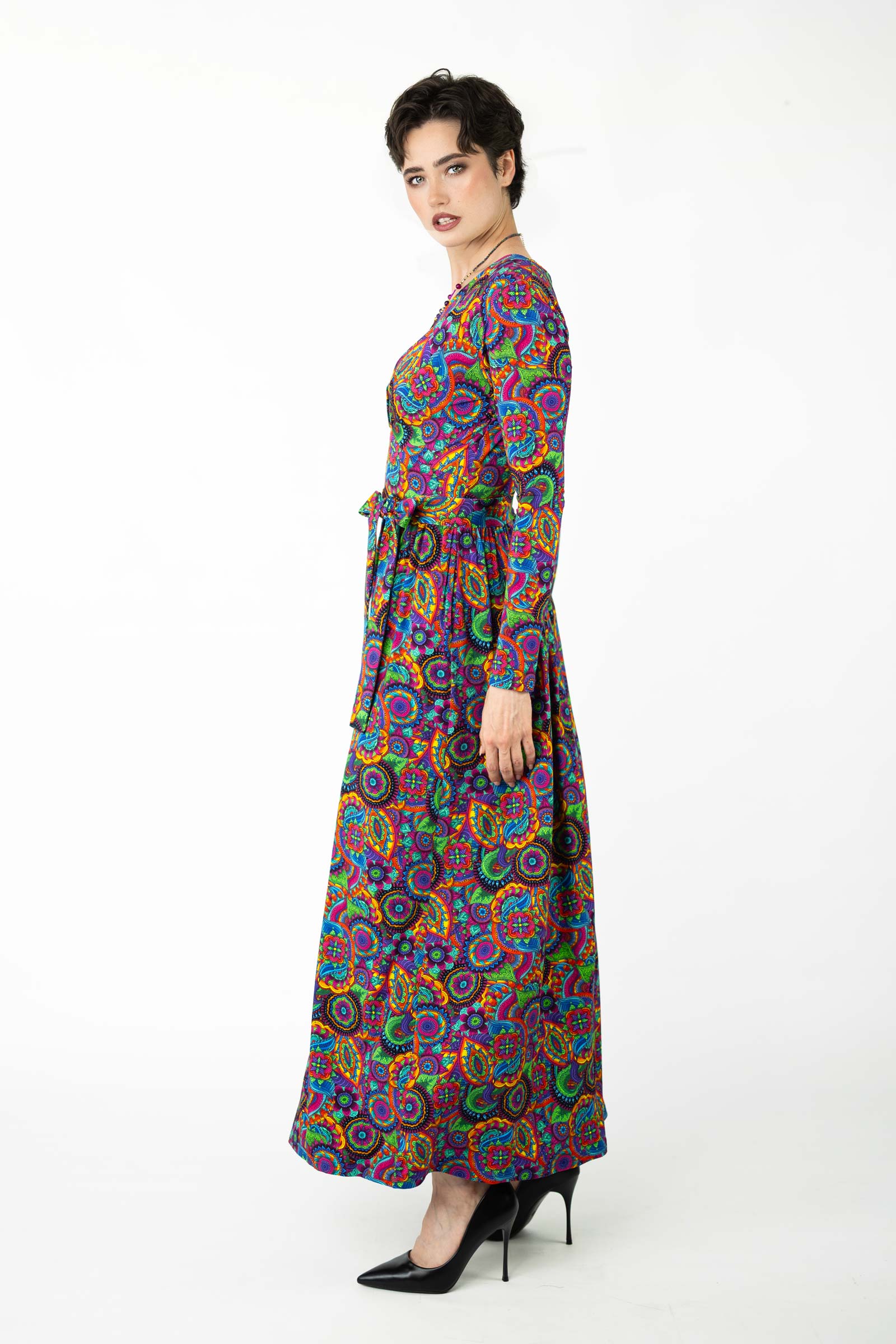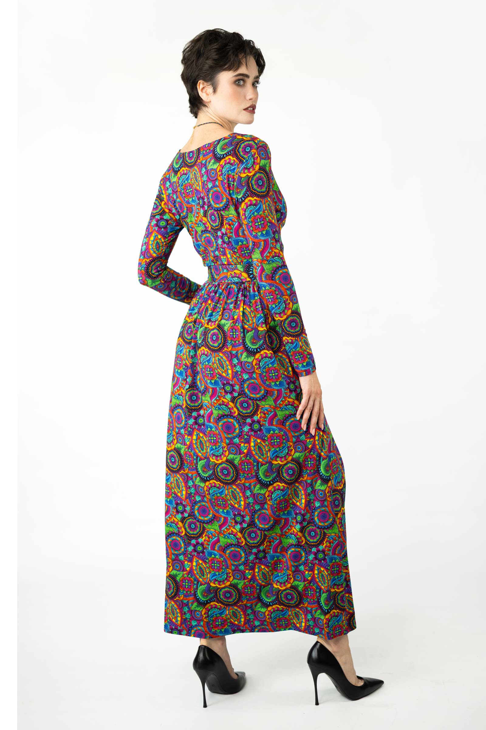 Zaprojektowana przez twórczynię marki Katarzynę Gałaj, autorski wzór materiału, który zdobi tę sukienkę, jest unikalny i dostępny tylko u nas.